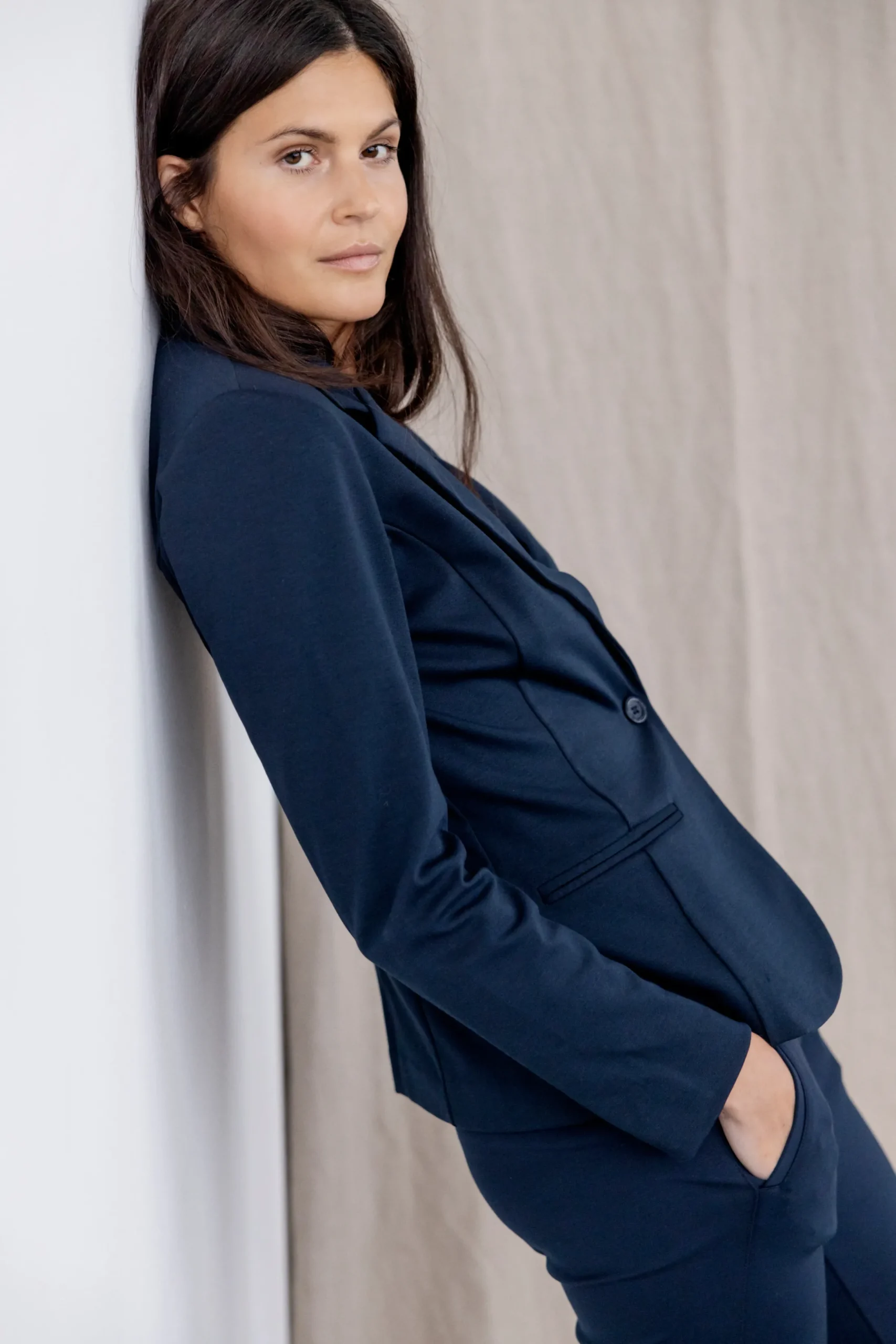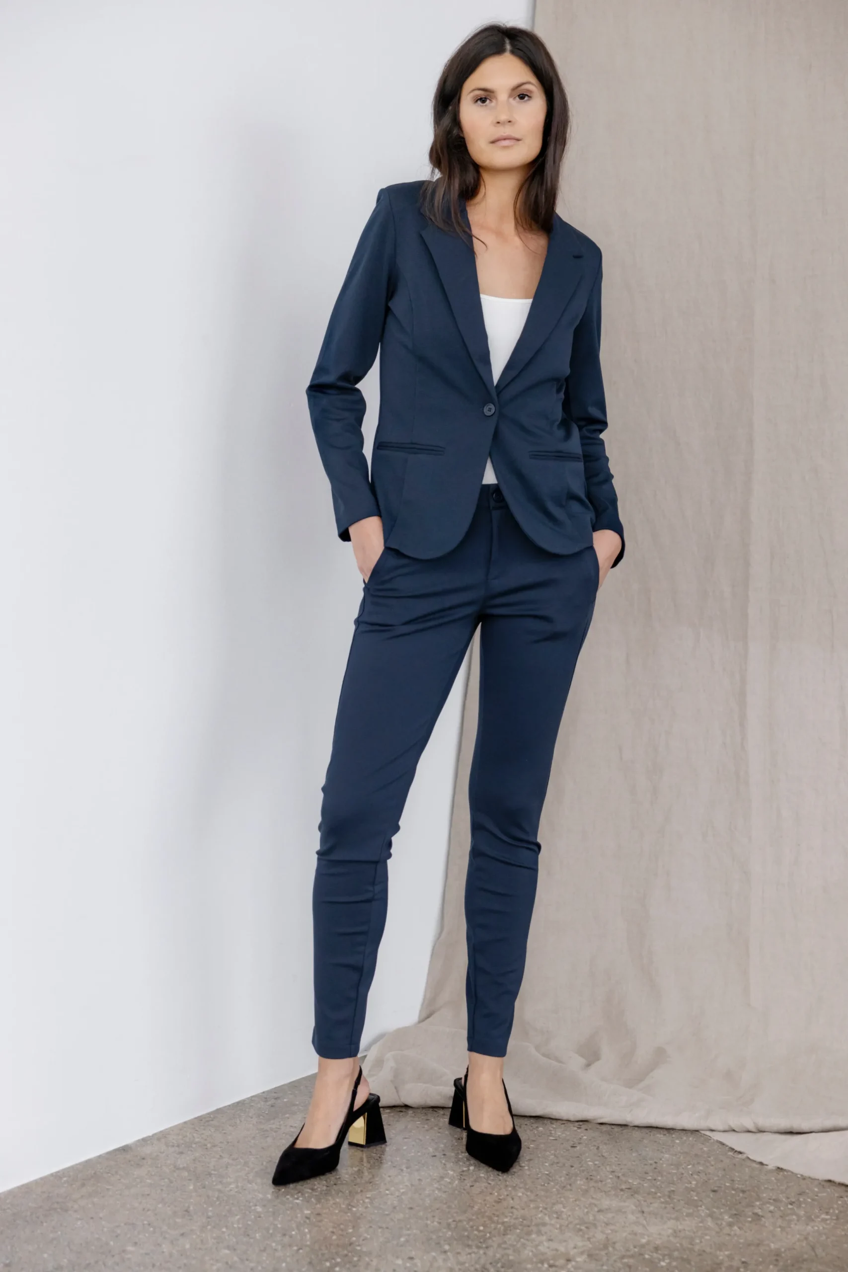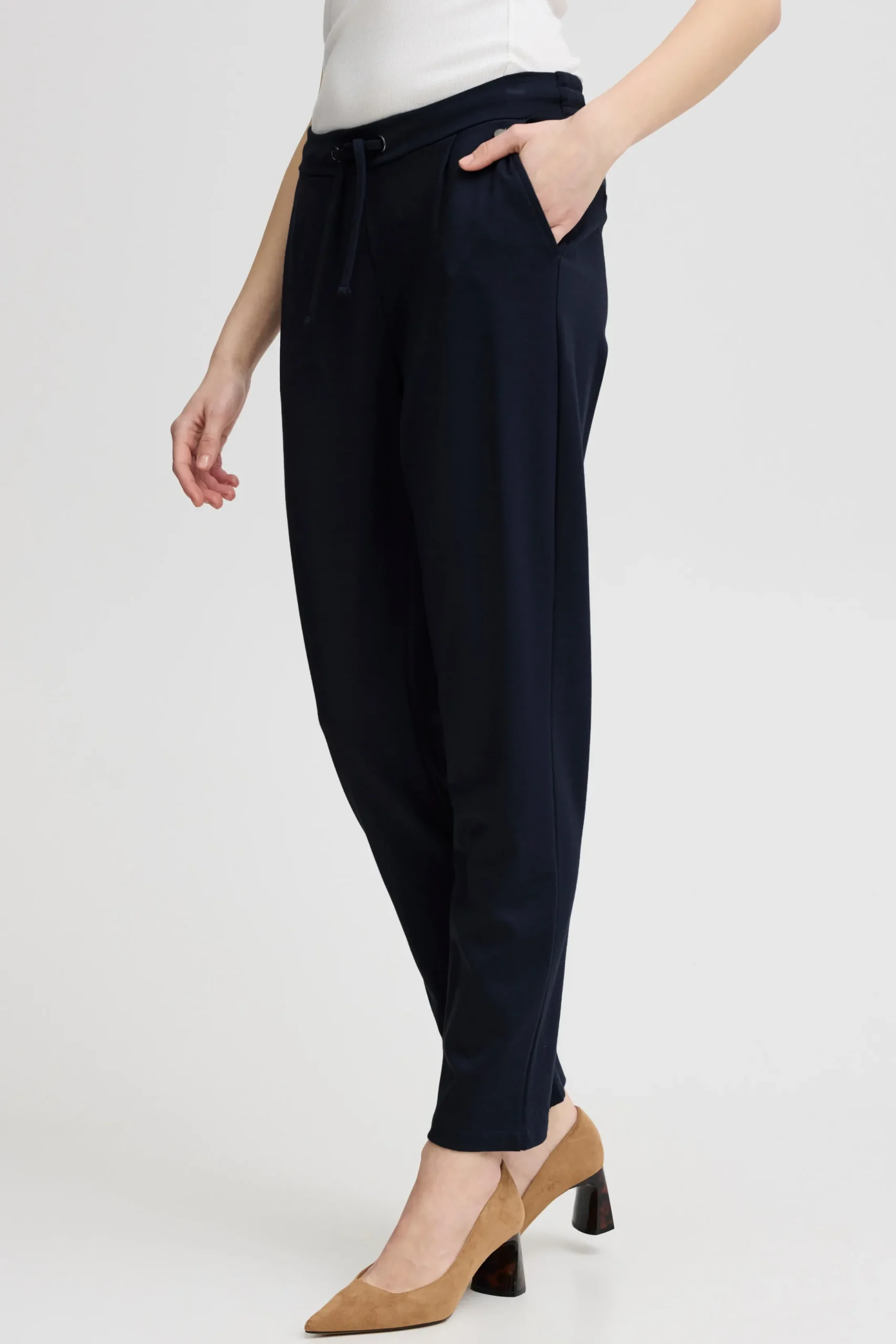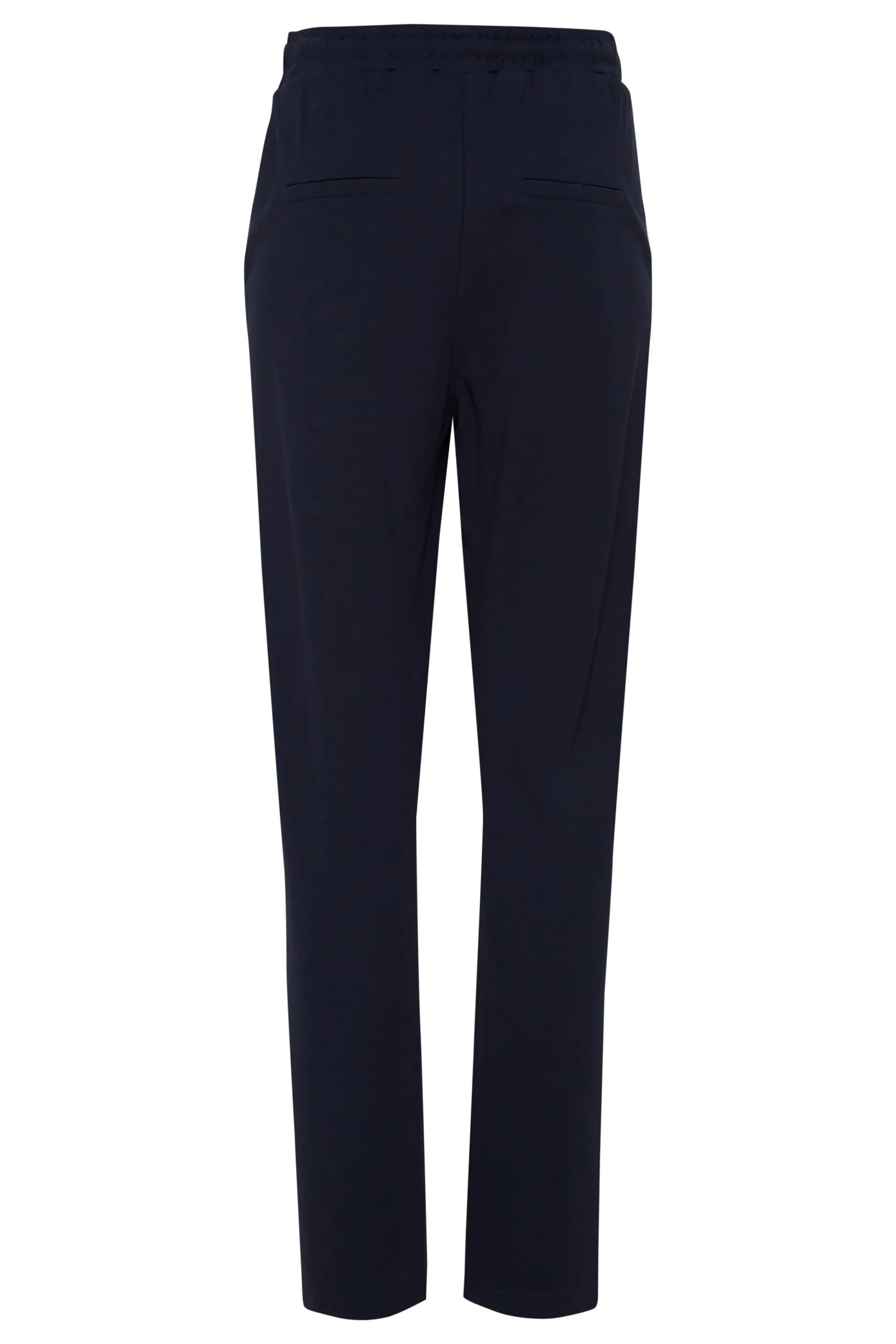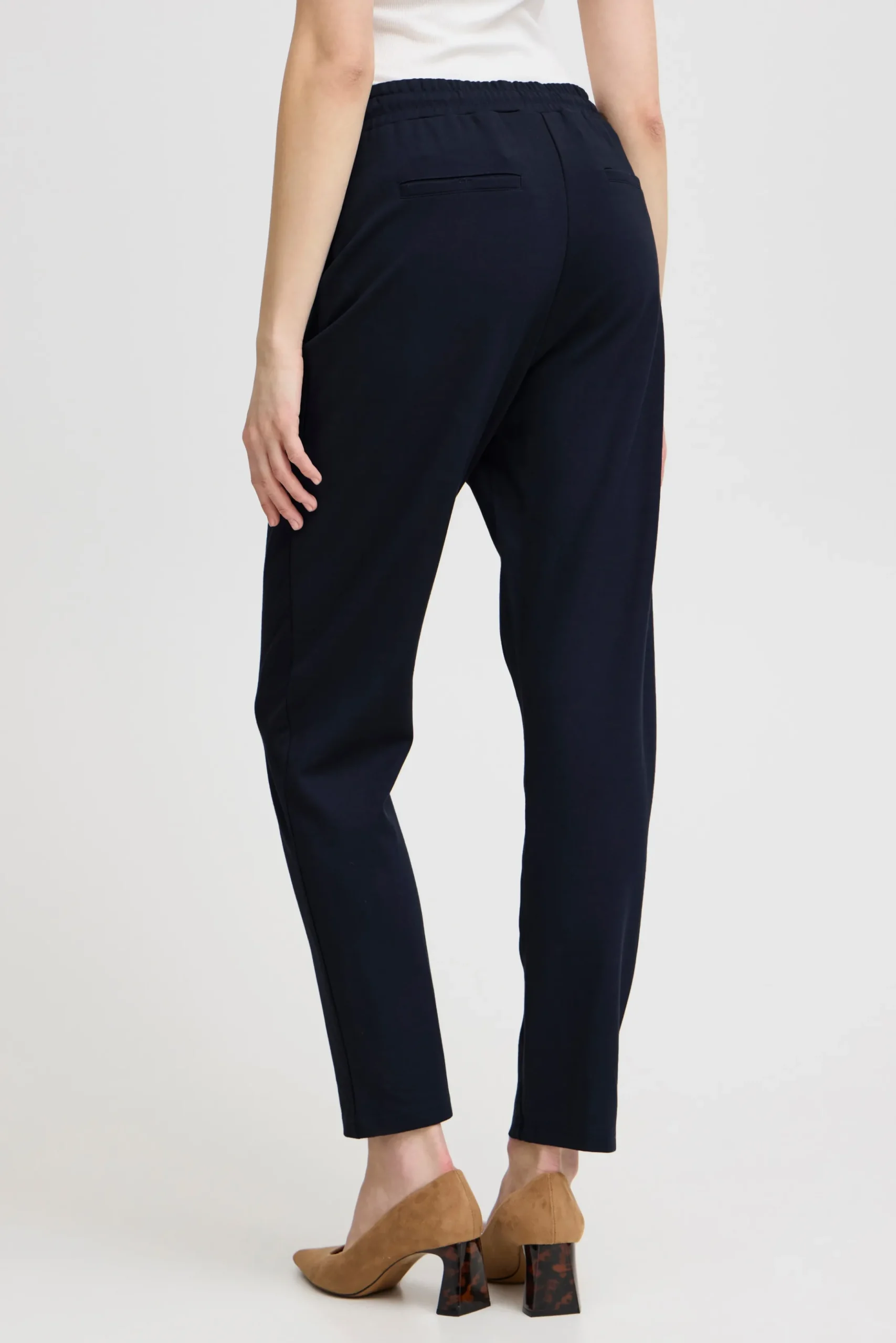 Strikket bukser med normal pasform og med elastik og snøre i taljen. Smalle ben. Stiklommer foran og paspolerede lommer bagpå.