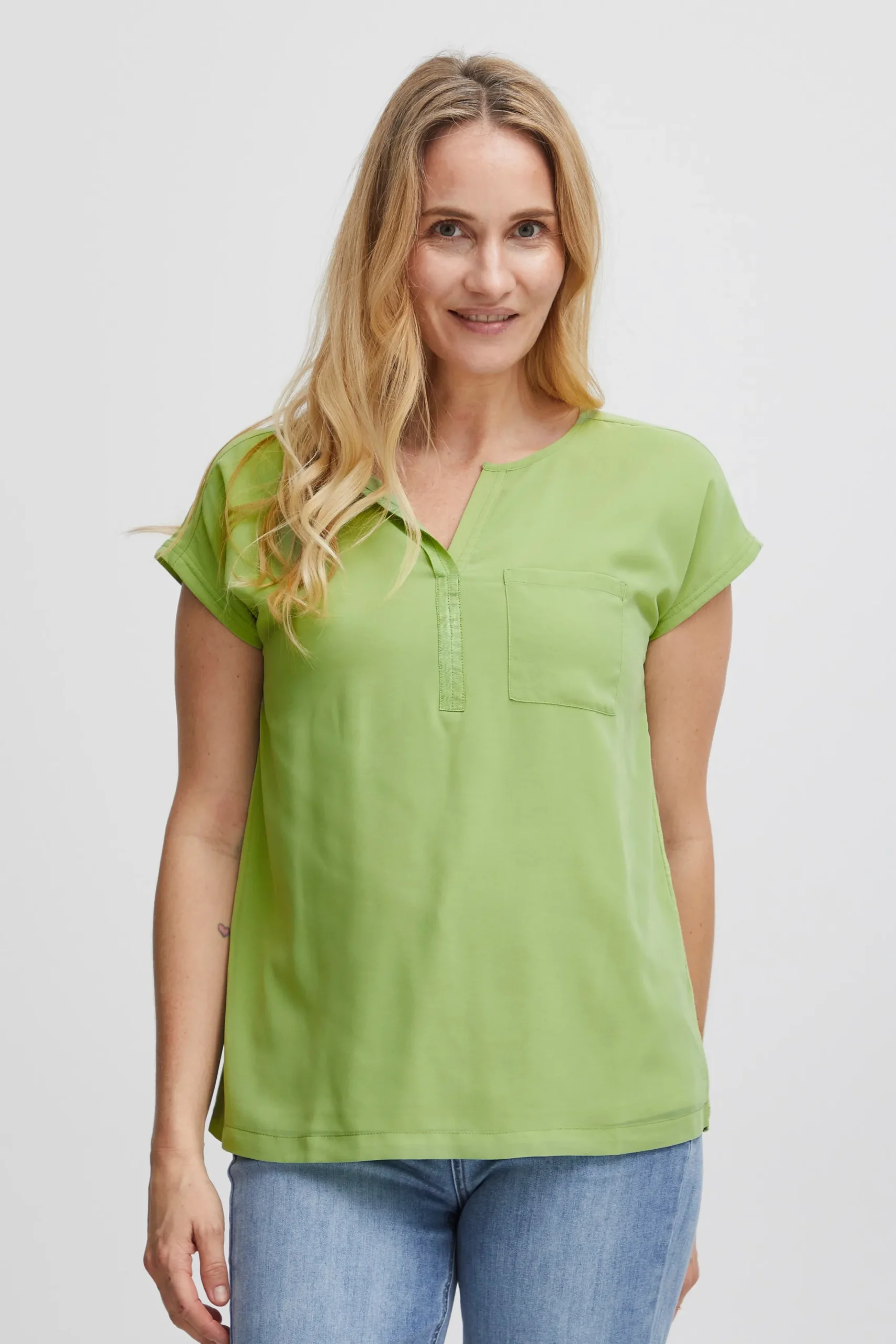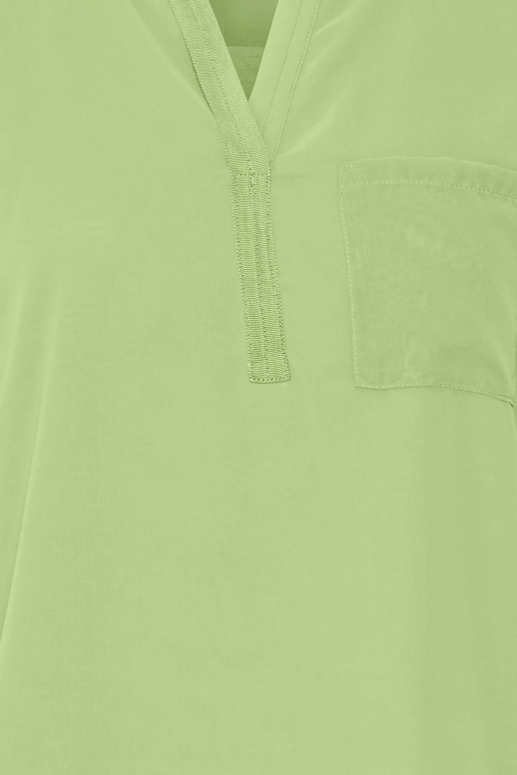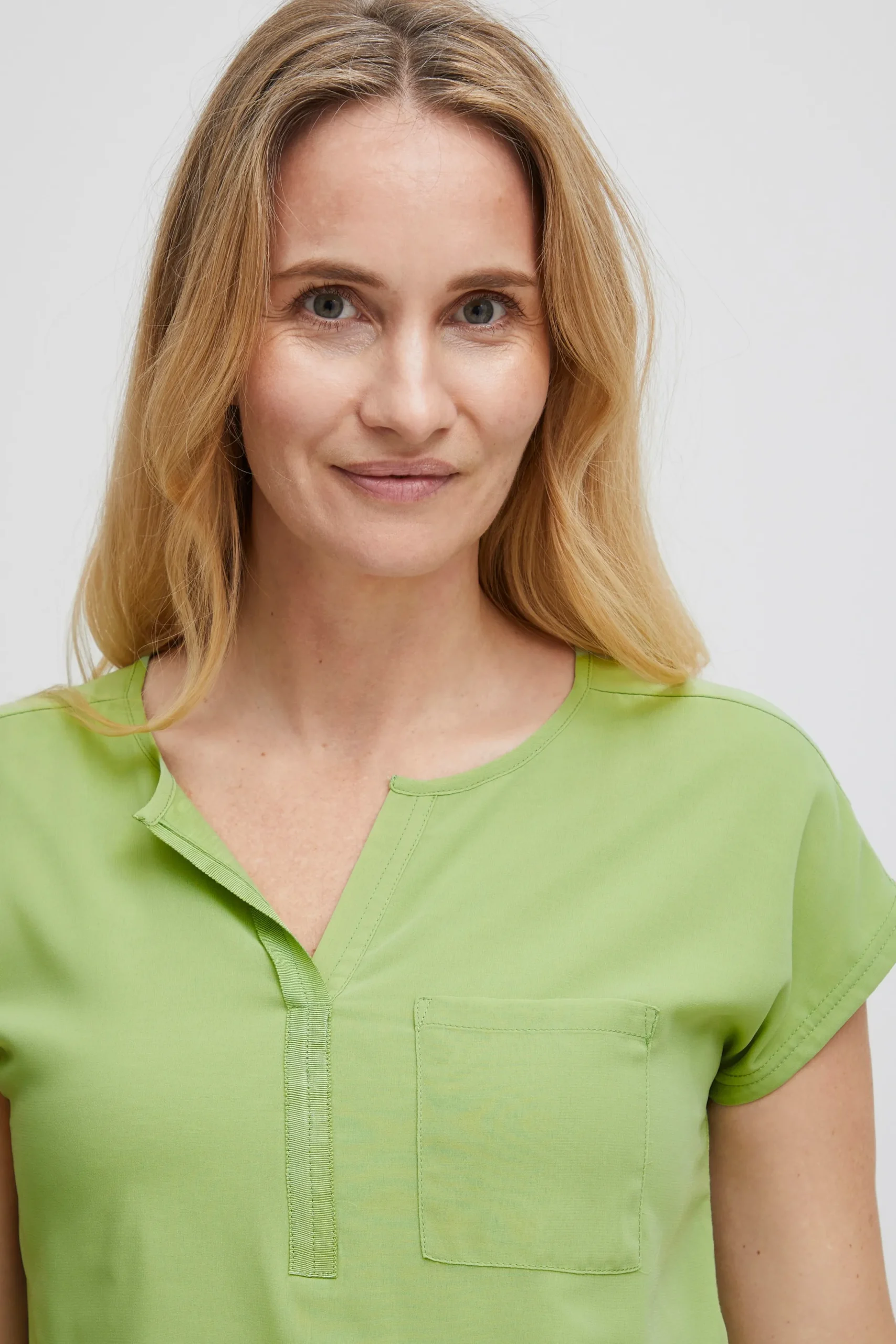 Fin Zawov bluse fra Fransa i 100% polyester. Med foer. Blusen har korte ærmer og V-hals med stolpelukning. Kantbånd ved V-hals og stolpelukning. Forstykket i let vævet kvalitet og bagstykket i skøn jerseykvalitet. Brug bluse til både hverdag og fest – med et par jeans eller en nederdel. Fuldend looket med et par klassiske flade støvler.