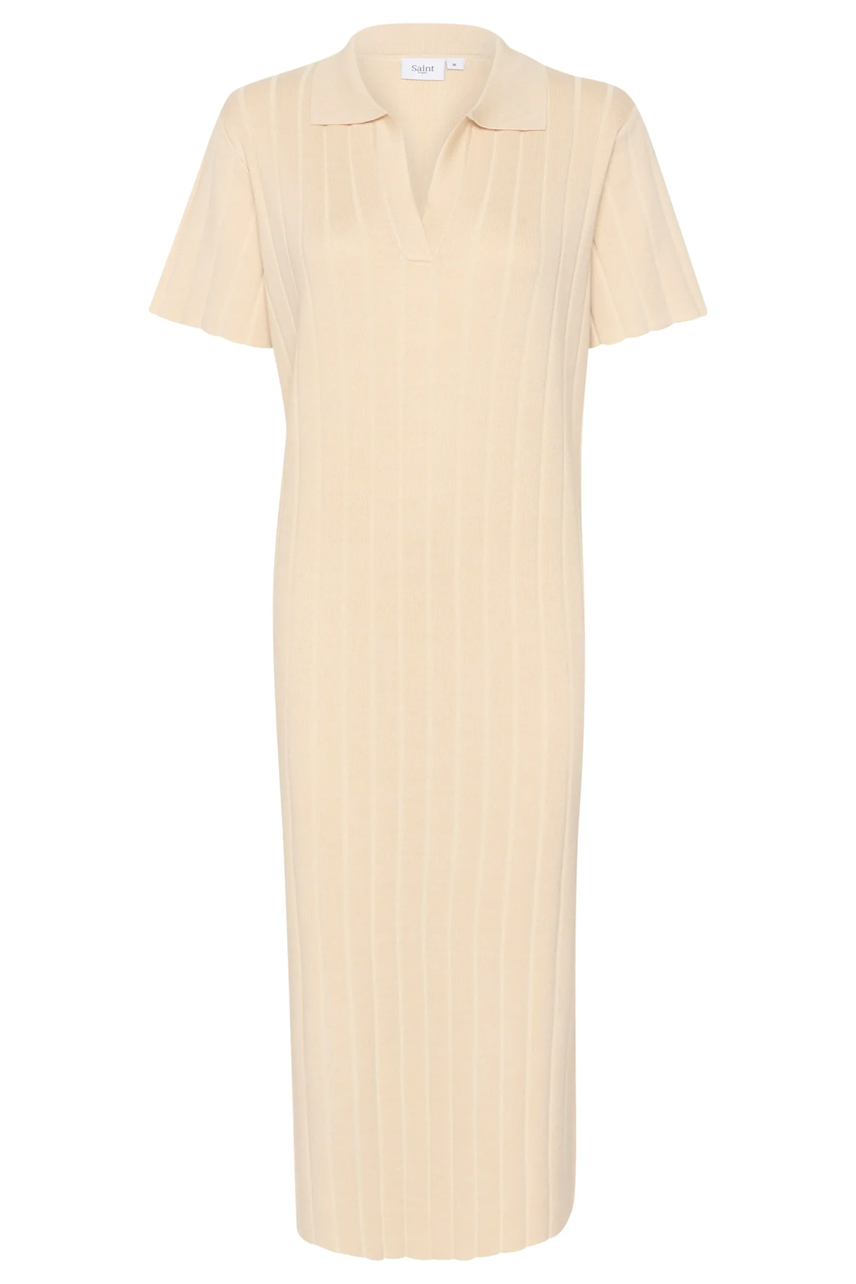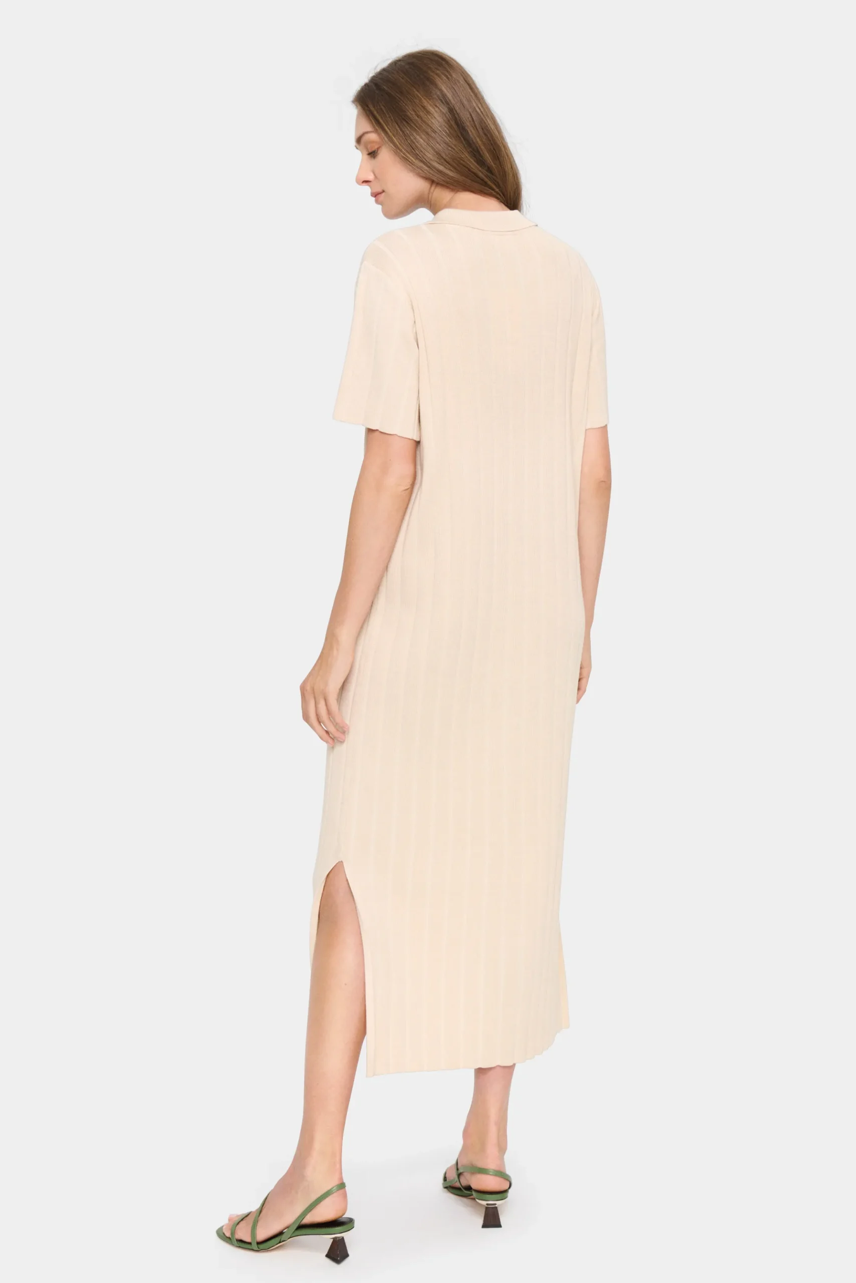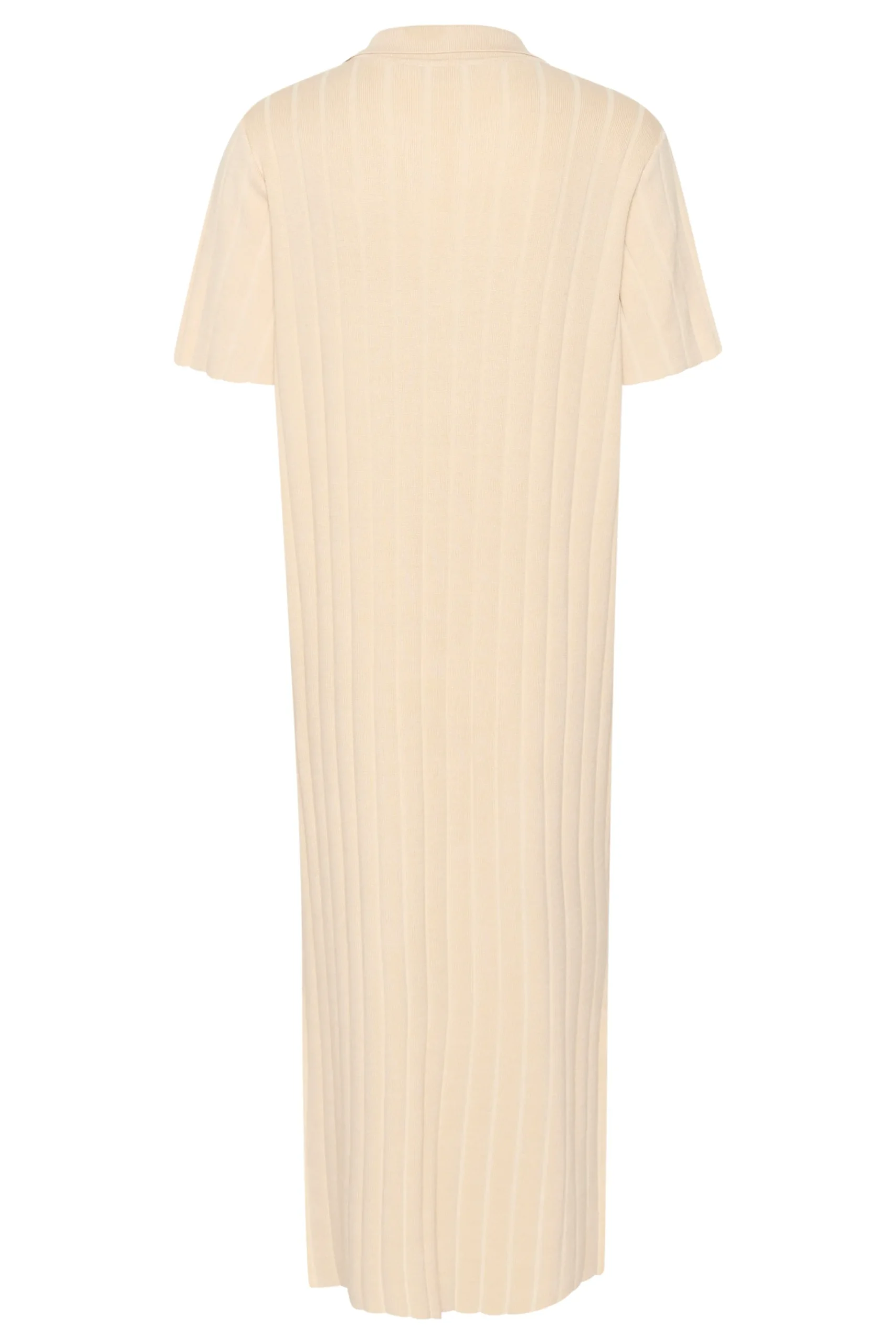 Lange beige kjole med polokrave, korte ærmer, samt sideslidser. \\n\\nModellen er 176 cm høj og iført størrelse M