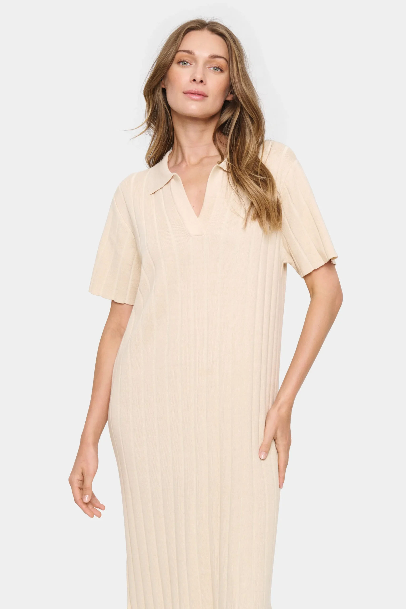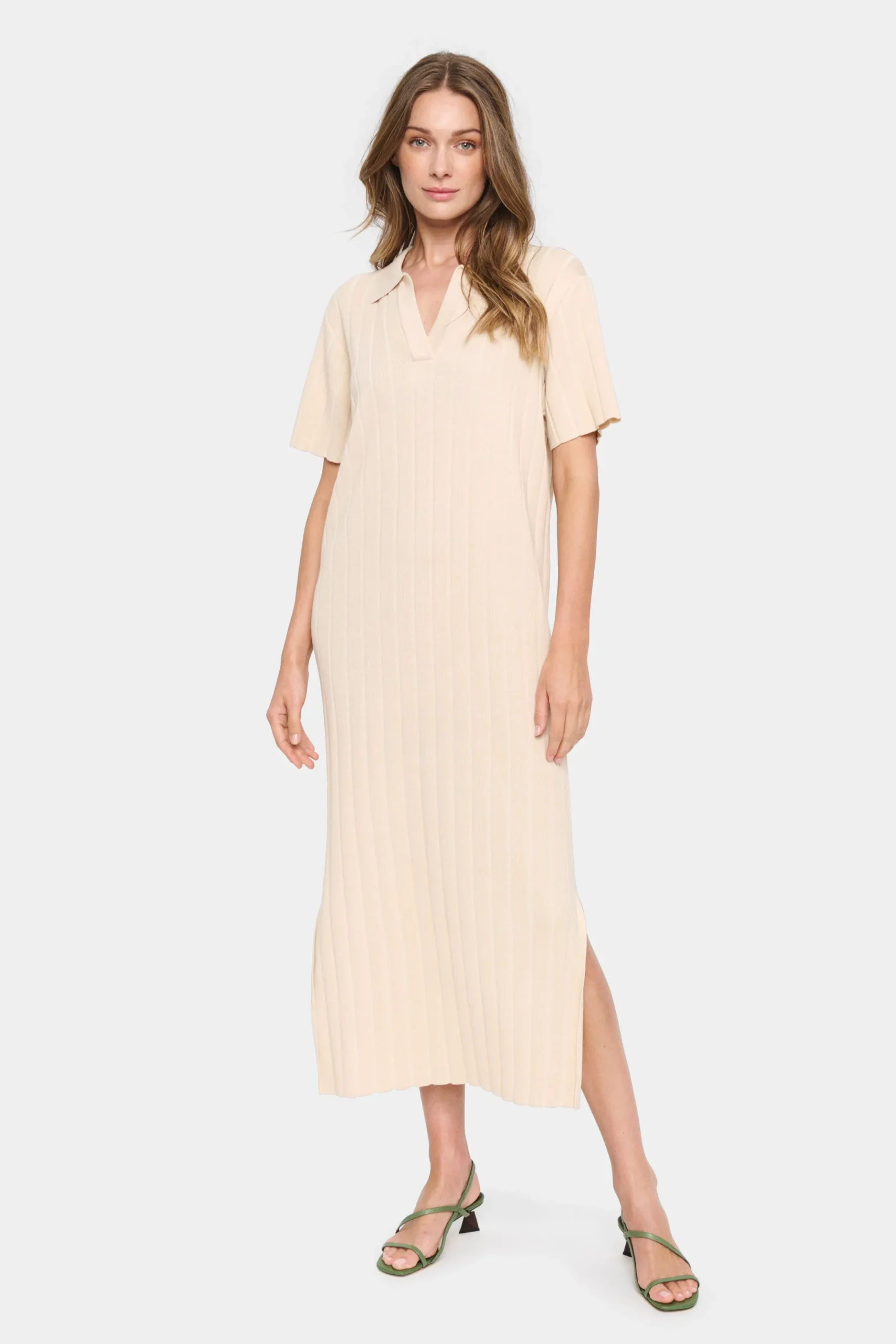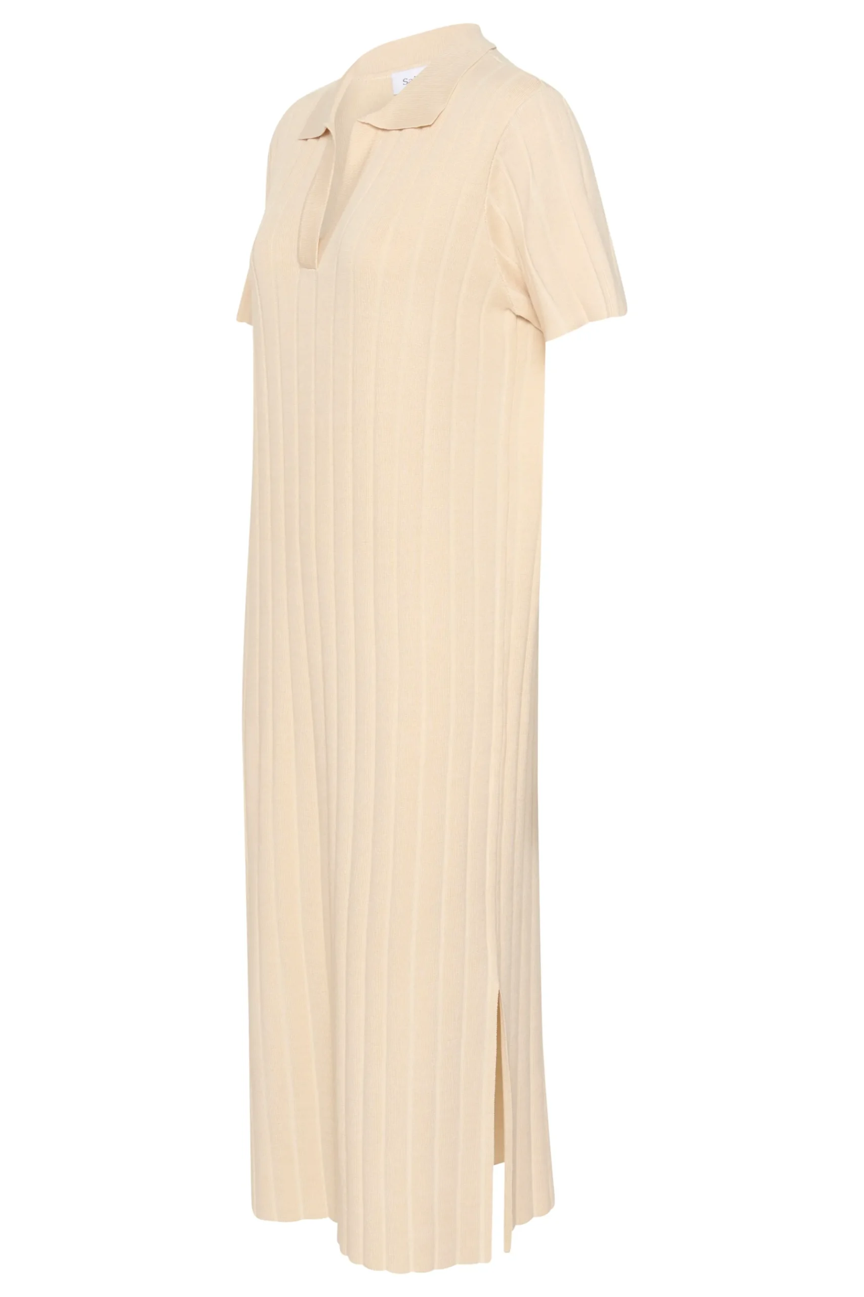 Lange beige kjole med polokrave, korte ærmer, samt sideslidser. \\n\\nModellen er 176 cm høj og iført størrelse M