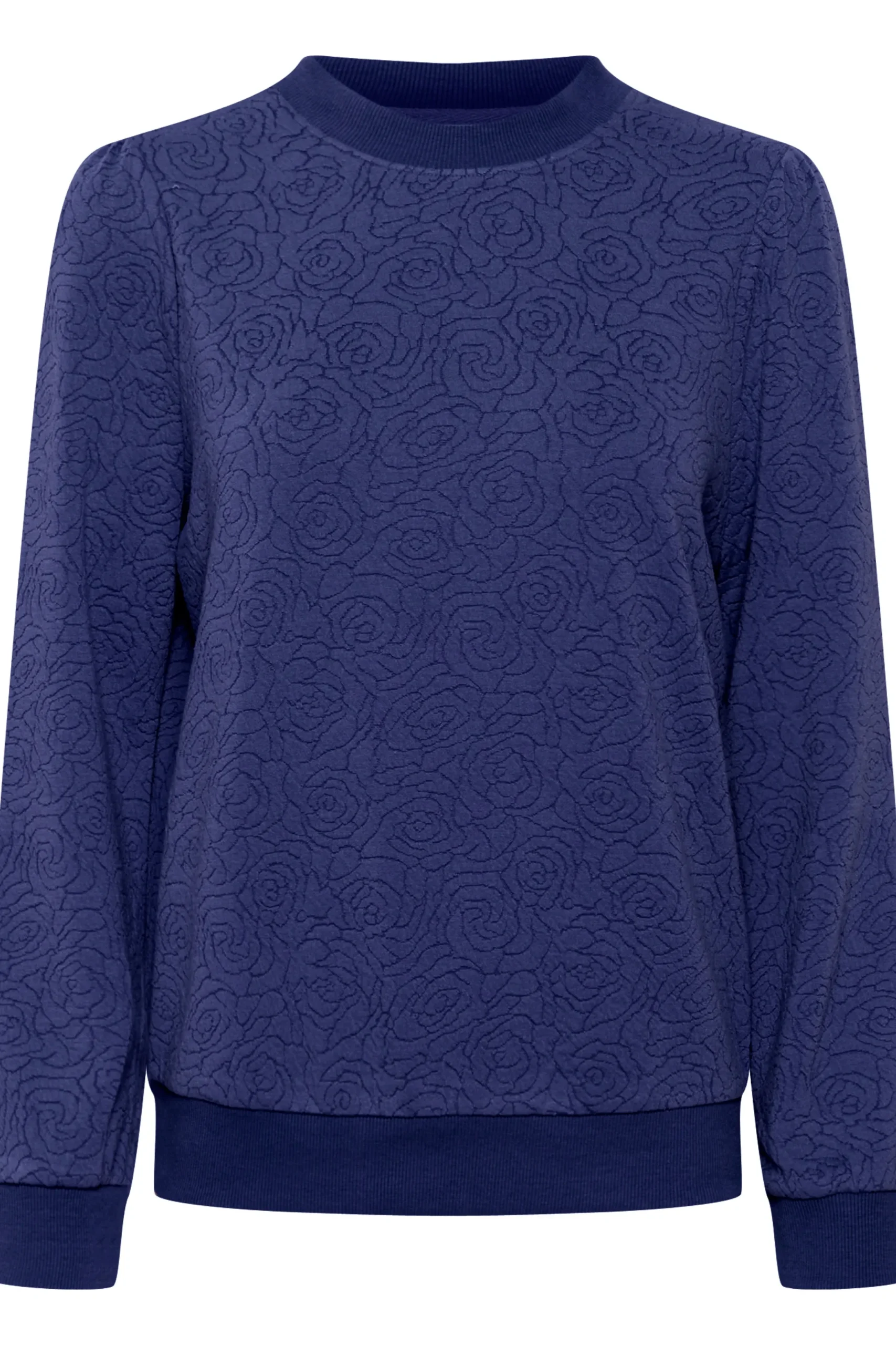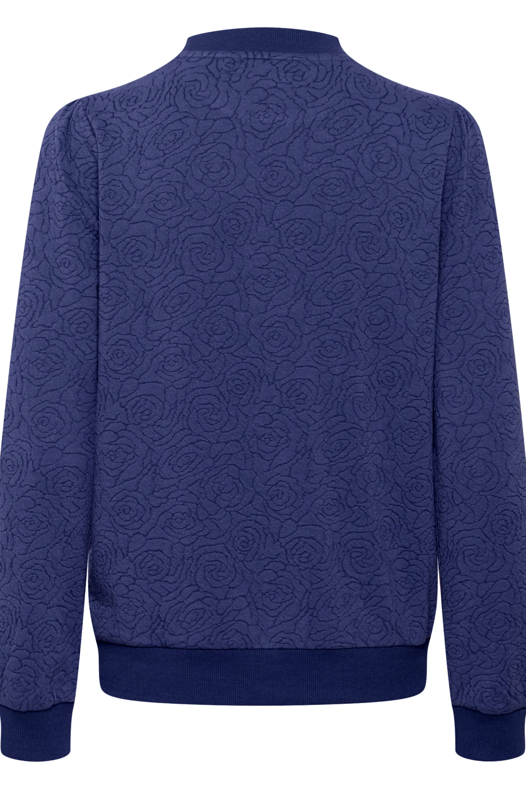 Denne sweatshirt i en dyb marineblå nuance har et diskret, præget rosemønster, der tilføjer en elegant tekstur. Med sin afslappede pasform, runde halsudskæring og ribkanter ved ærmer og bund, kombinerer den komfort med et stilfuldt udtryk.\\n\\nModellen er 178 cm høj og er iført en str. M.