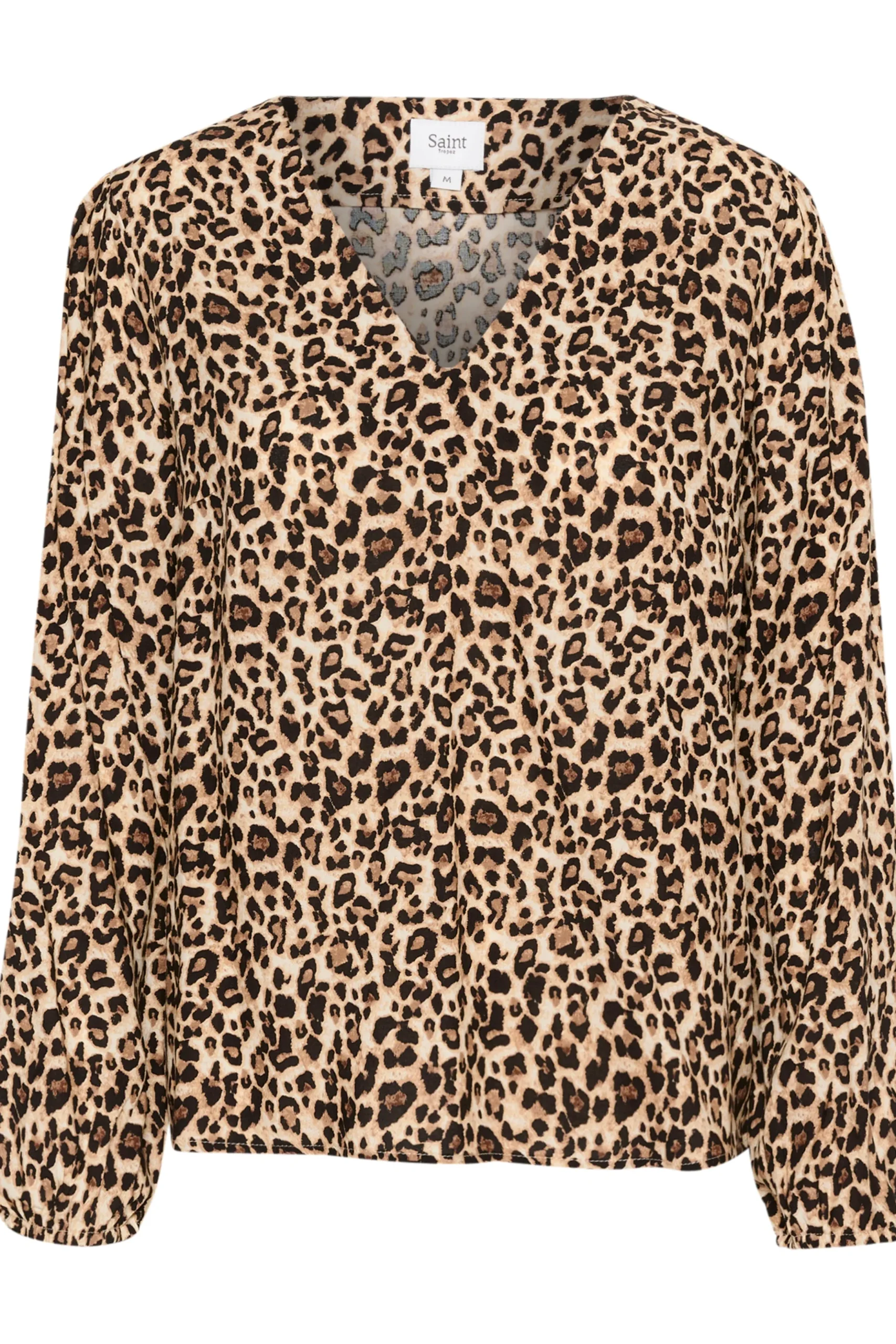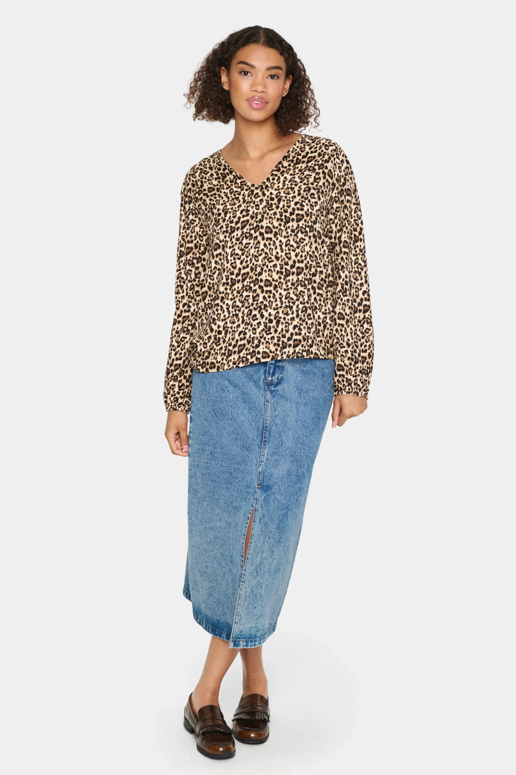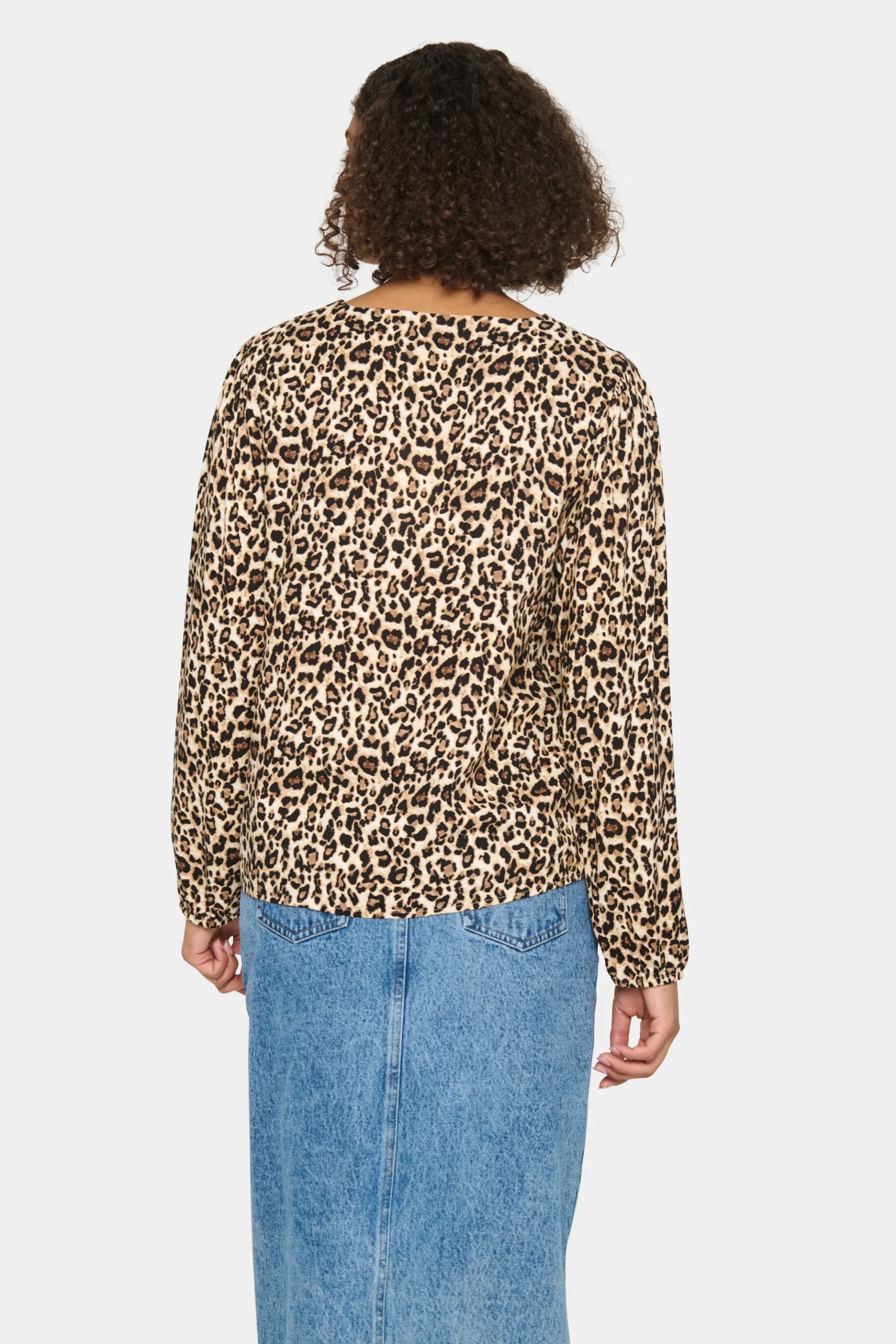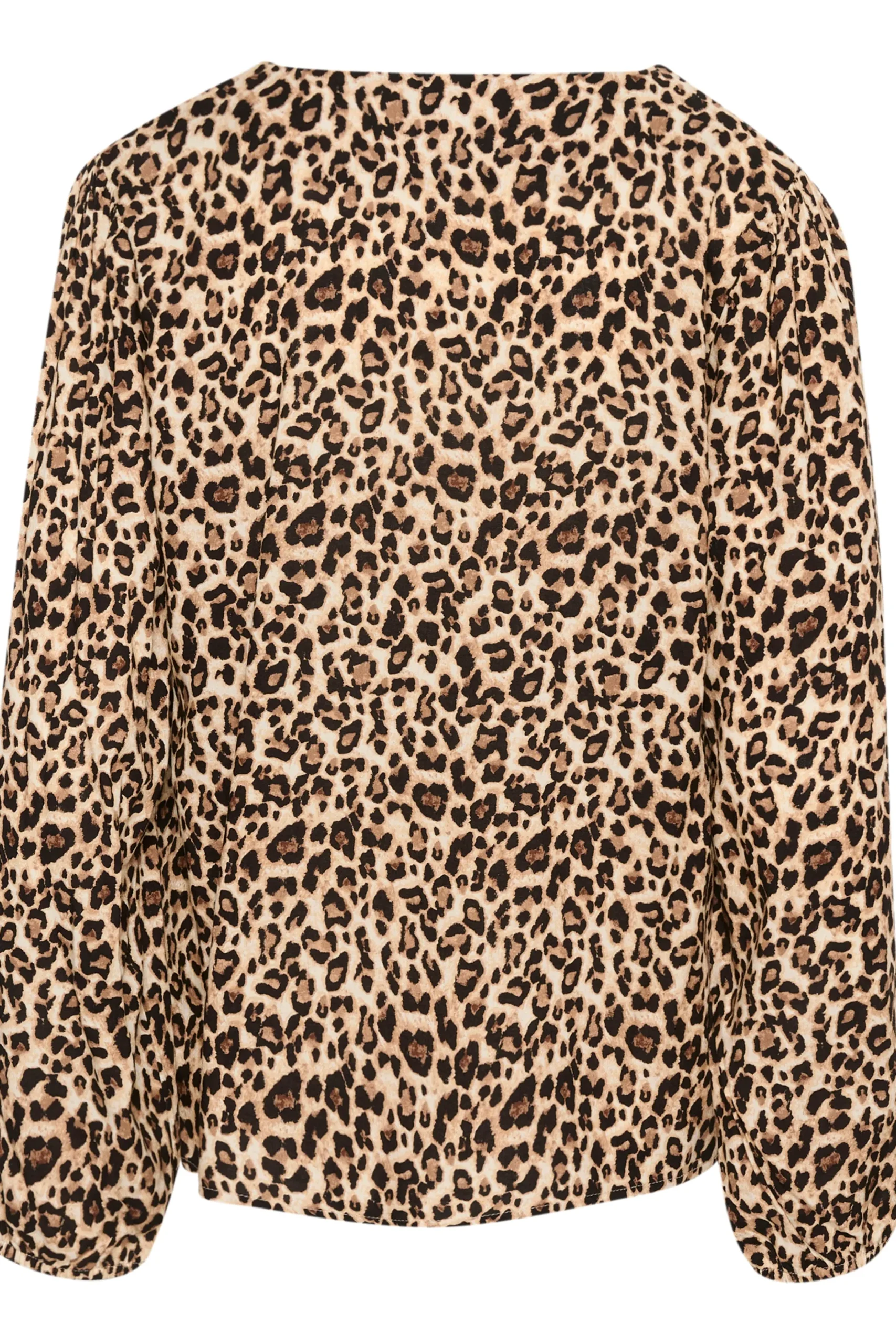 Denne bluse har et leopardprint og en flatterende V-udskæring. De lange ærmer har en let volumen samt elastik forneden.