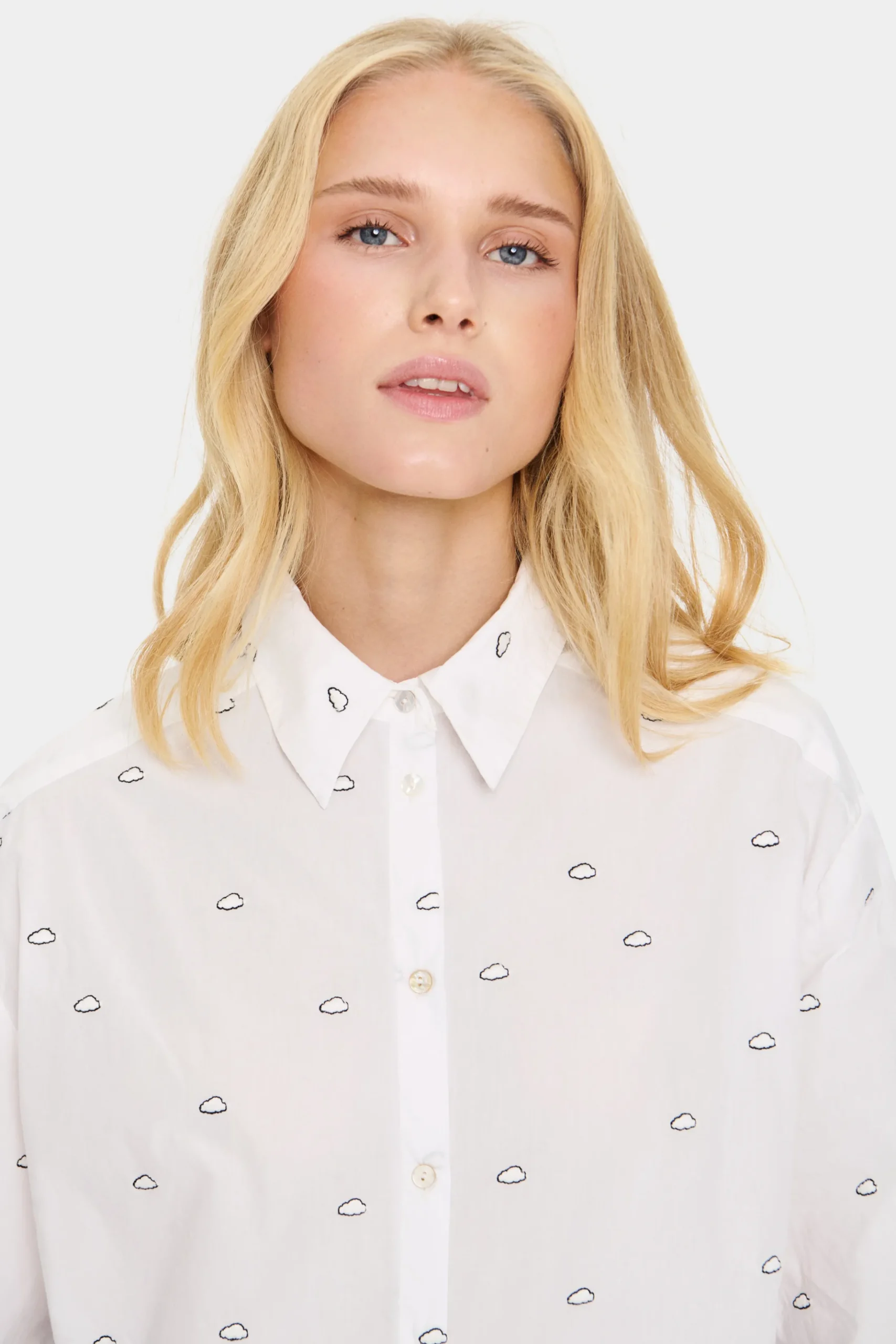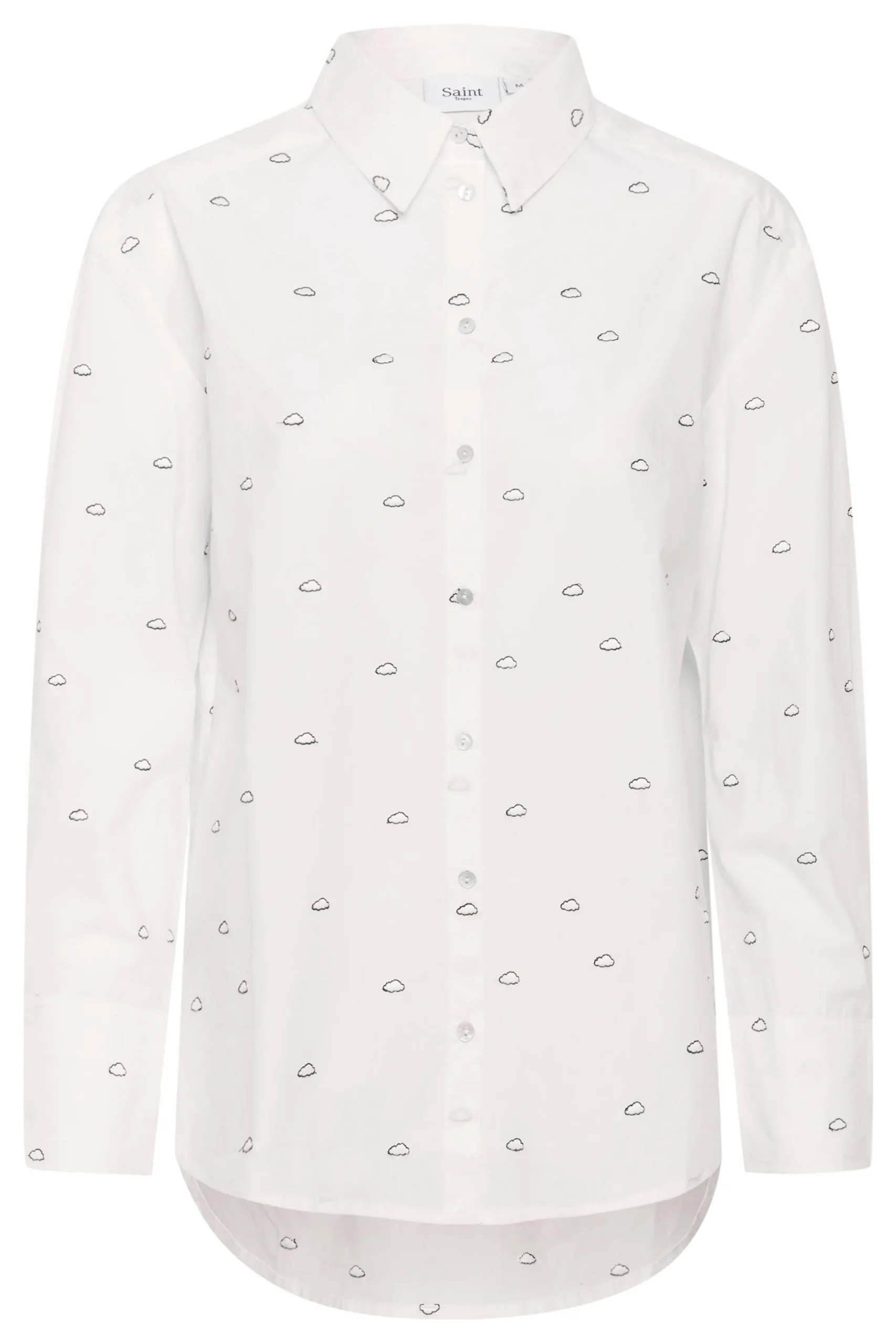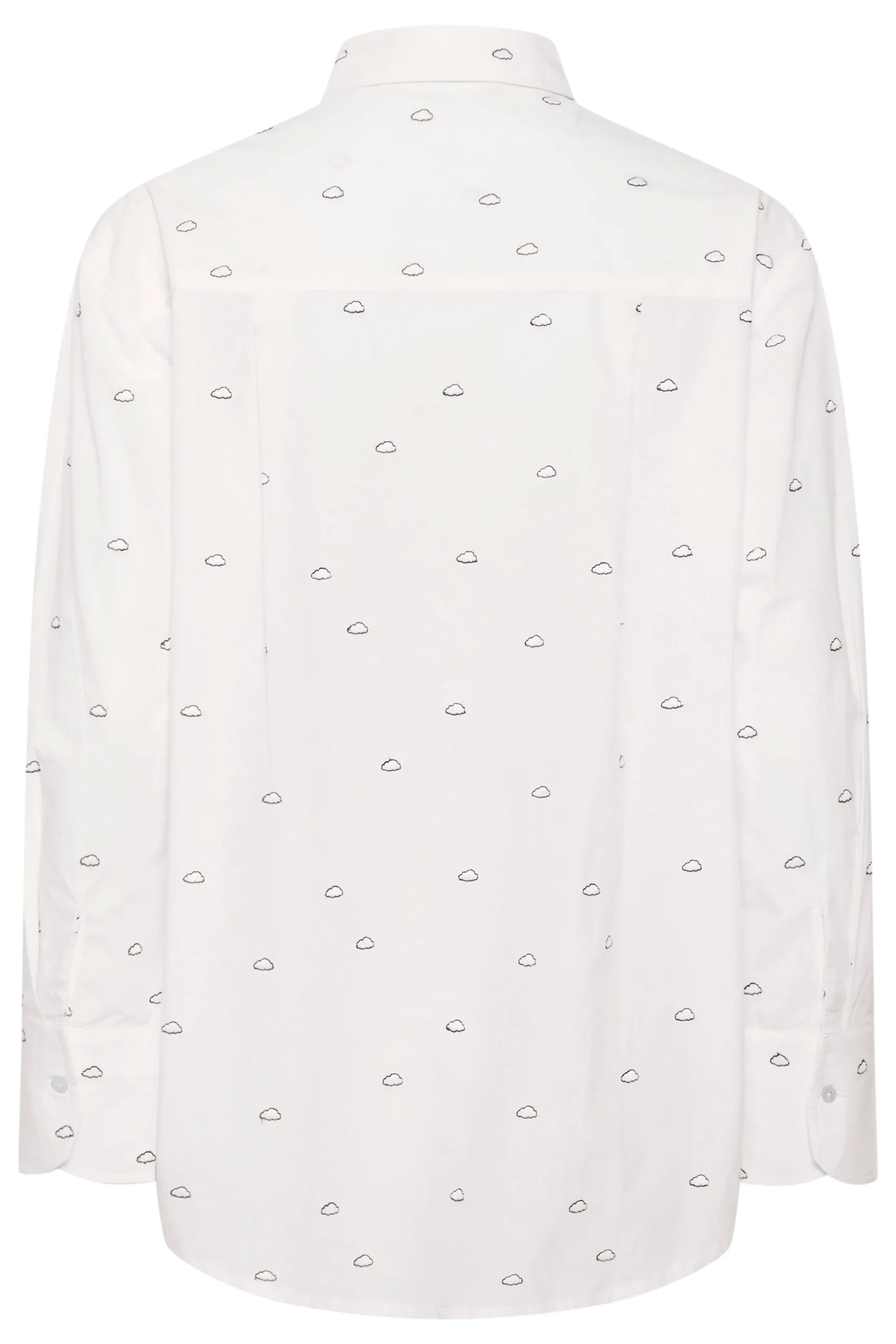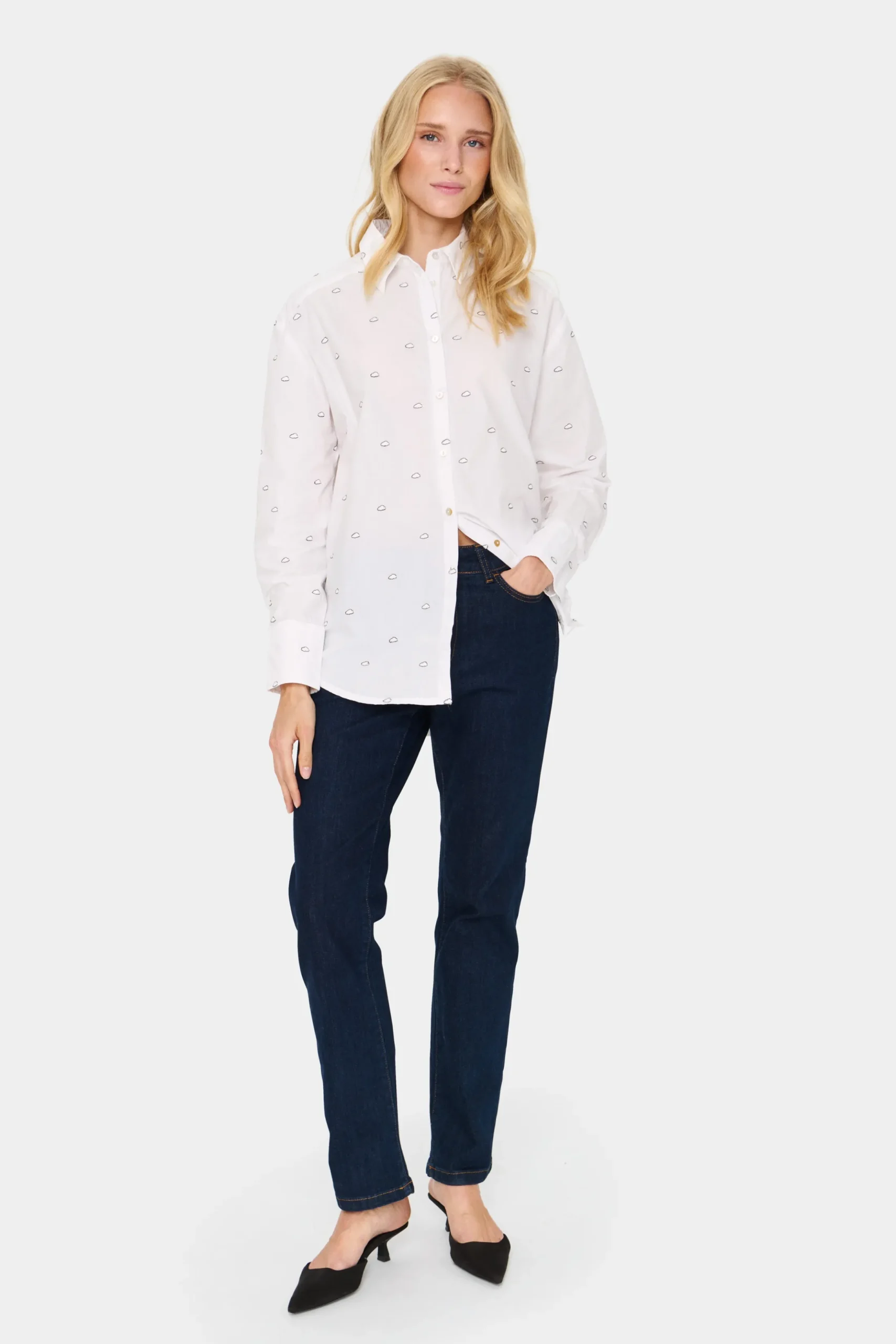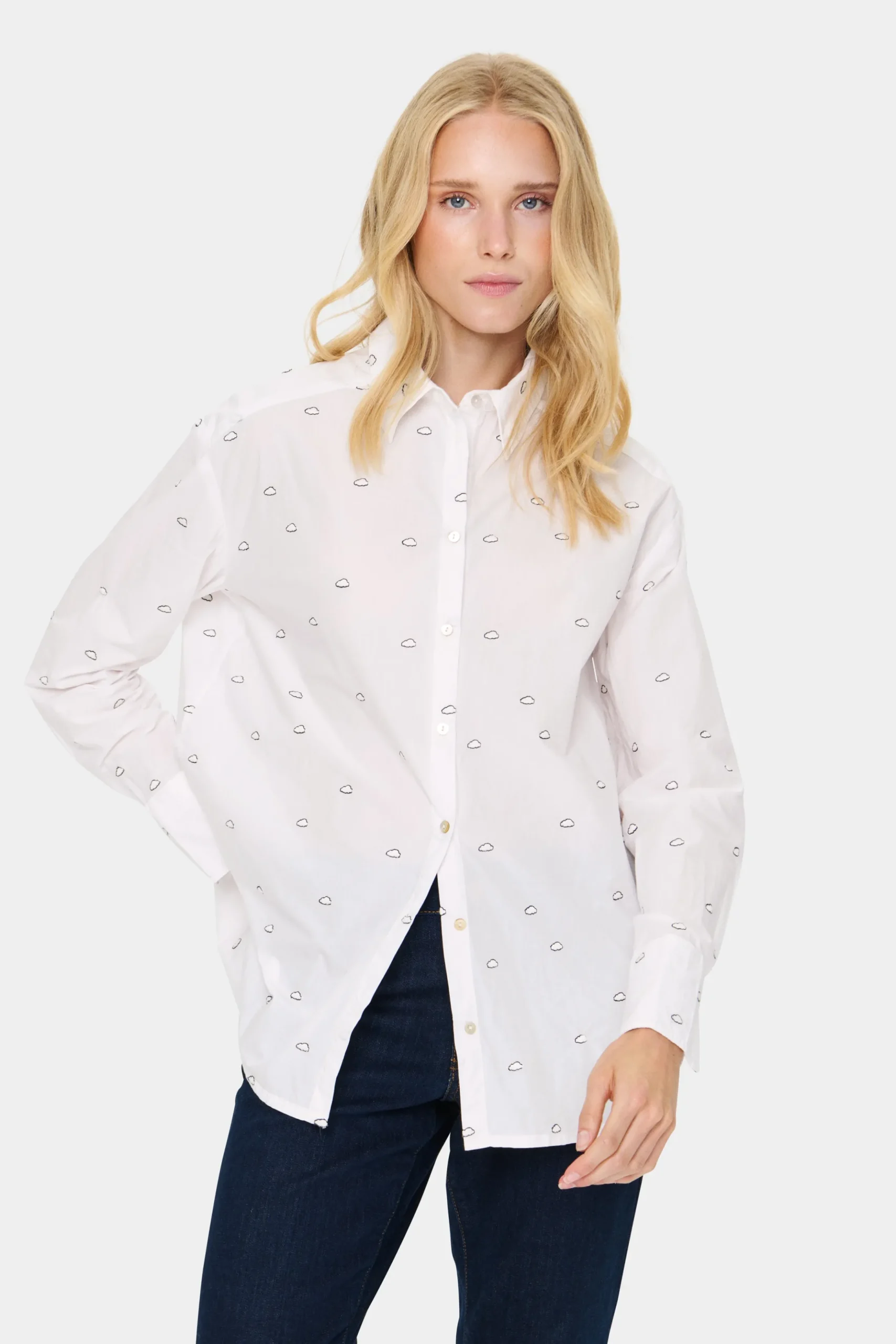 Denne klassiske hvide skjorte har et legende prikket mønster med små sorte skyer, der tilføjer et subtilt, unikt twist. Skjorten har en afslappet pasform, knaplukning foran, klassisk krave og afrundet kant, hvilket gør den både alsidig og stilfuld.