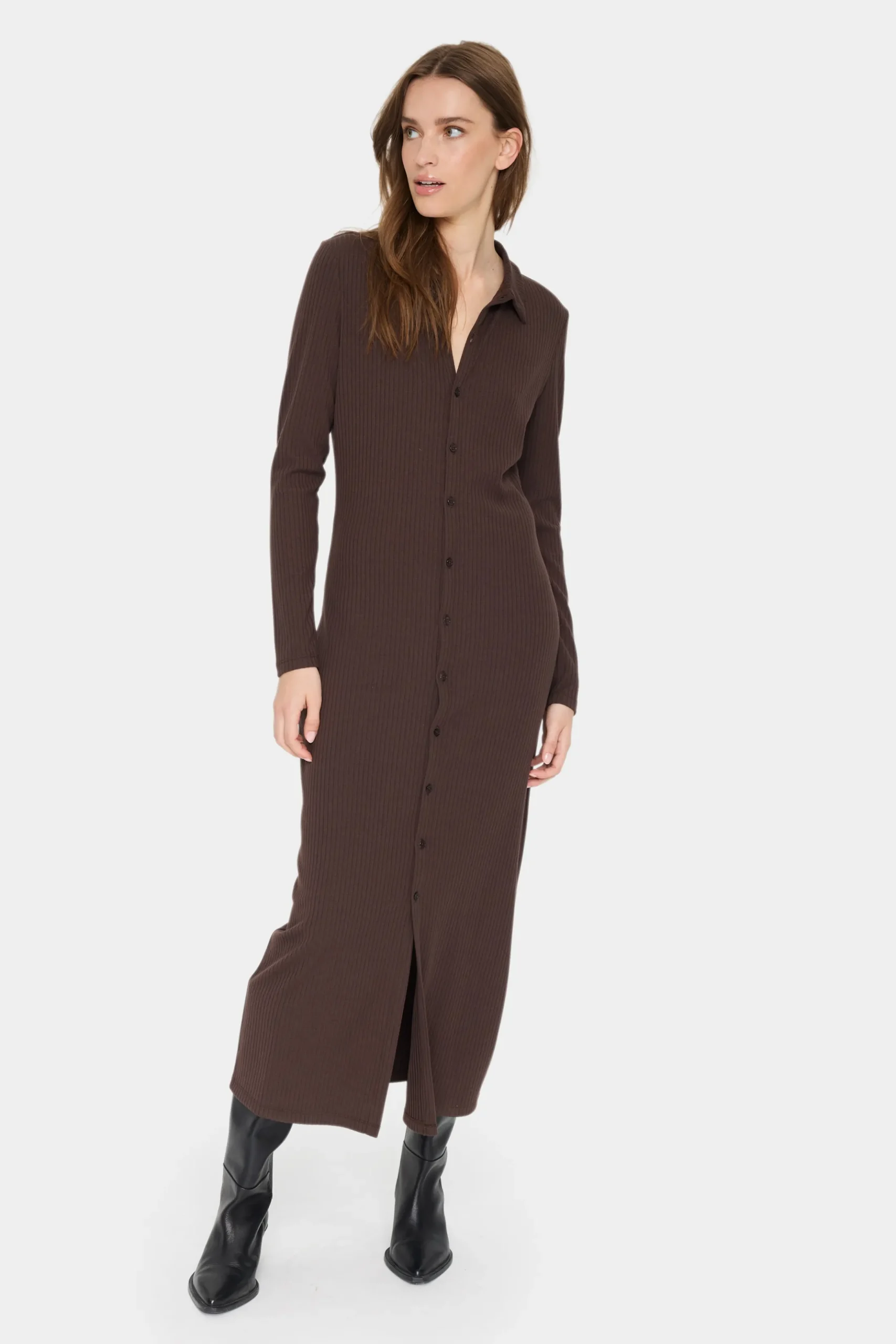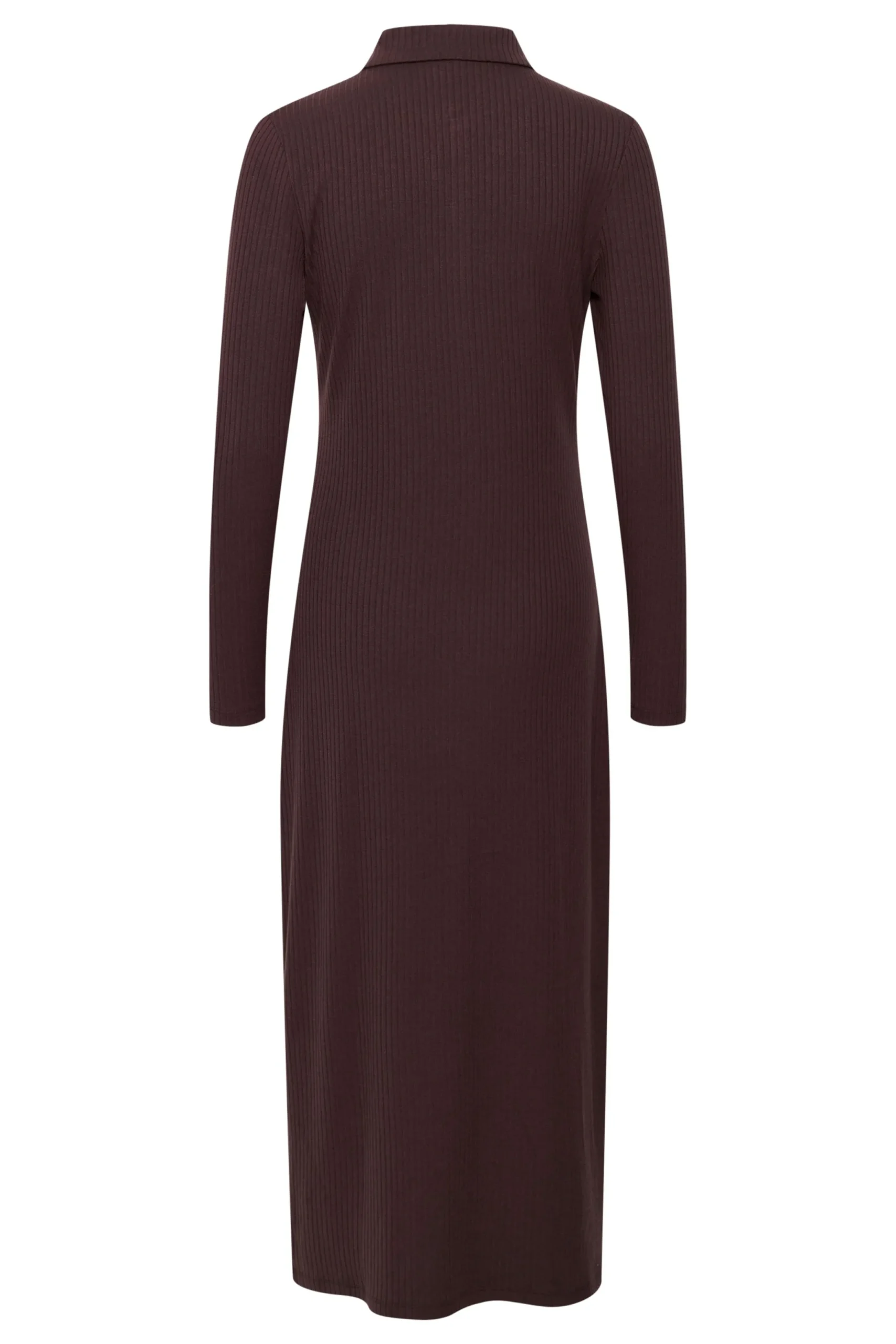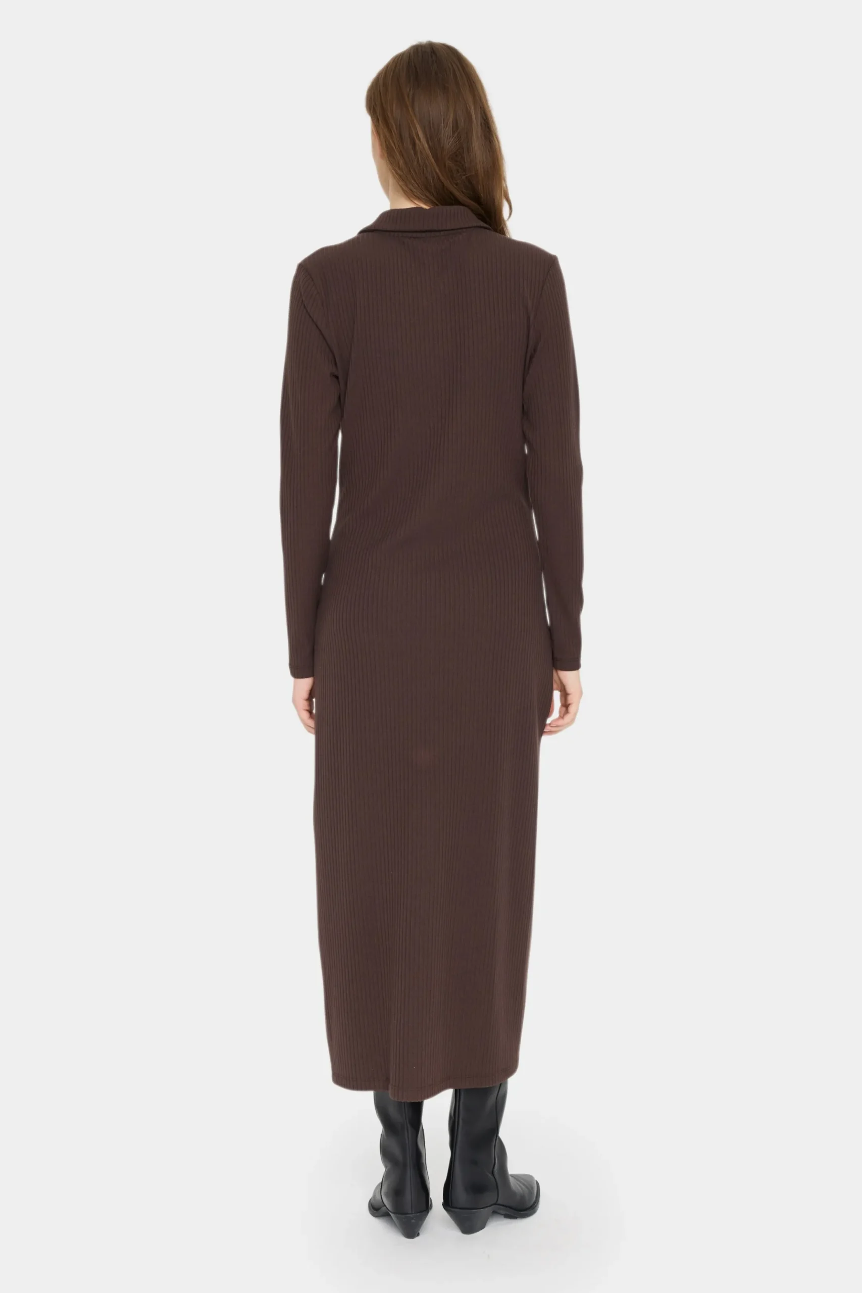 Denne mørkebrune, ribstrikkede maxikjole har en tidløs skjortekrave og knaplukning hele vejen ned. Med sin tætsiddende pasform og lange ærmer er den perfekt til både hverdagsbrug og mere formelle anledninger. \\n\\nModellen er 176 cm høj og er iført en str. M.
