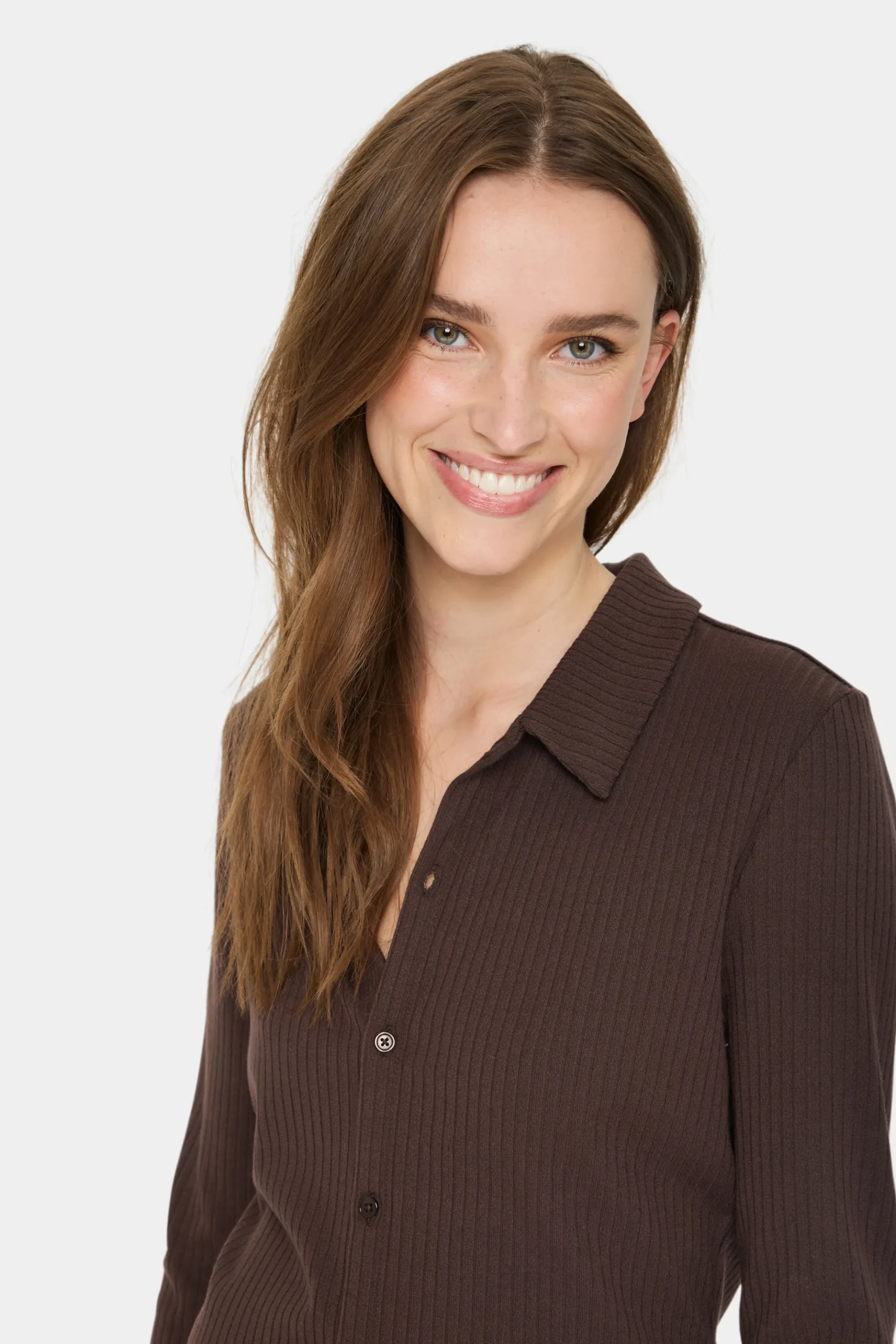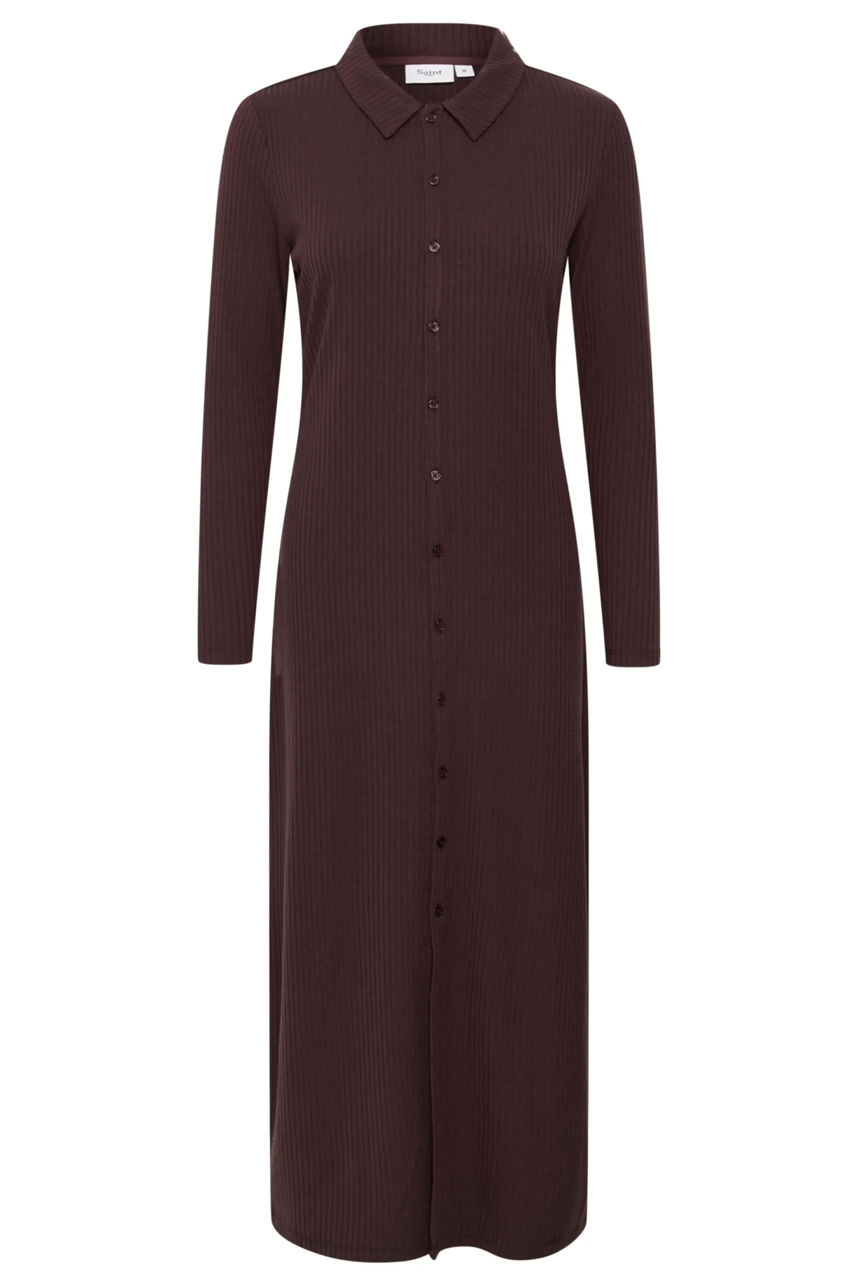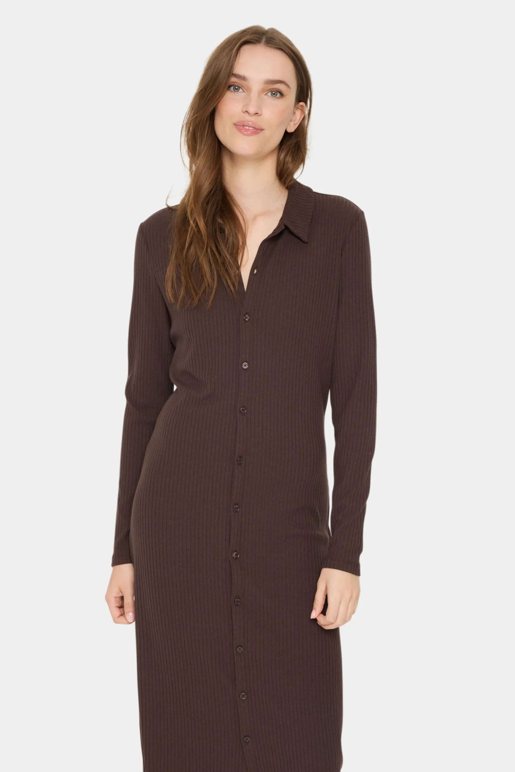 Denne mørkebrune, ribstrikkede maxikjole har en tidløs skjortekrave og knaplukning hele vejen ned. Med sin tætsiddende pasform og lange ærmer er den perfekt til både hverdagsbrug og mere formelle anledninger. \\n\\nModellen er 176 cm høj og er iført en str. M.