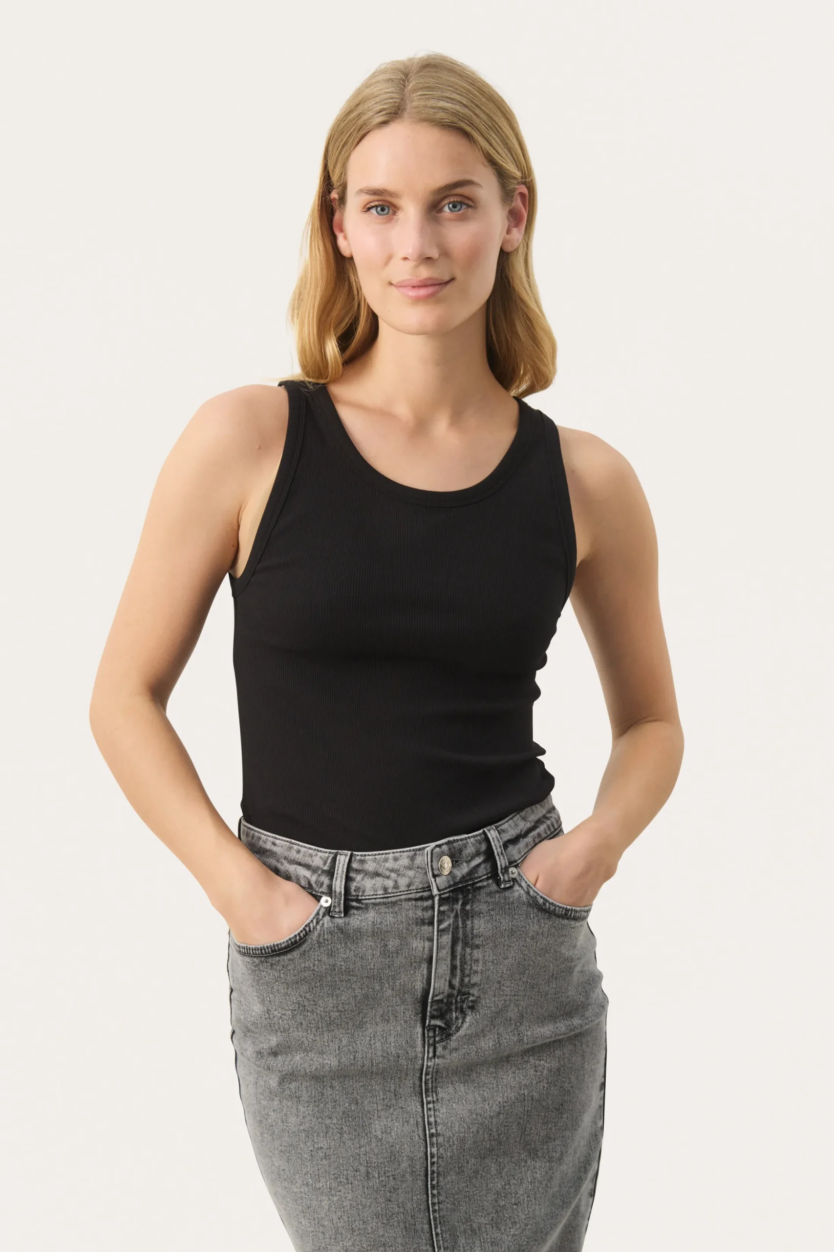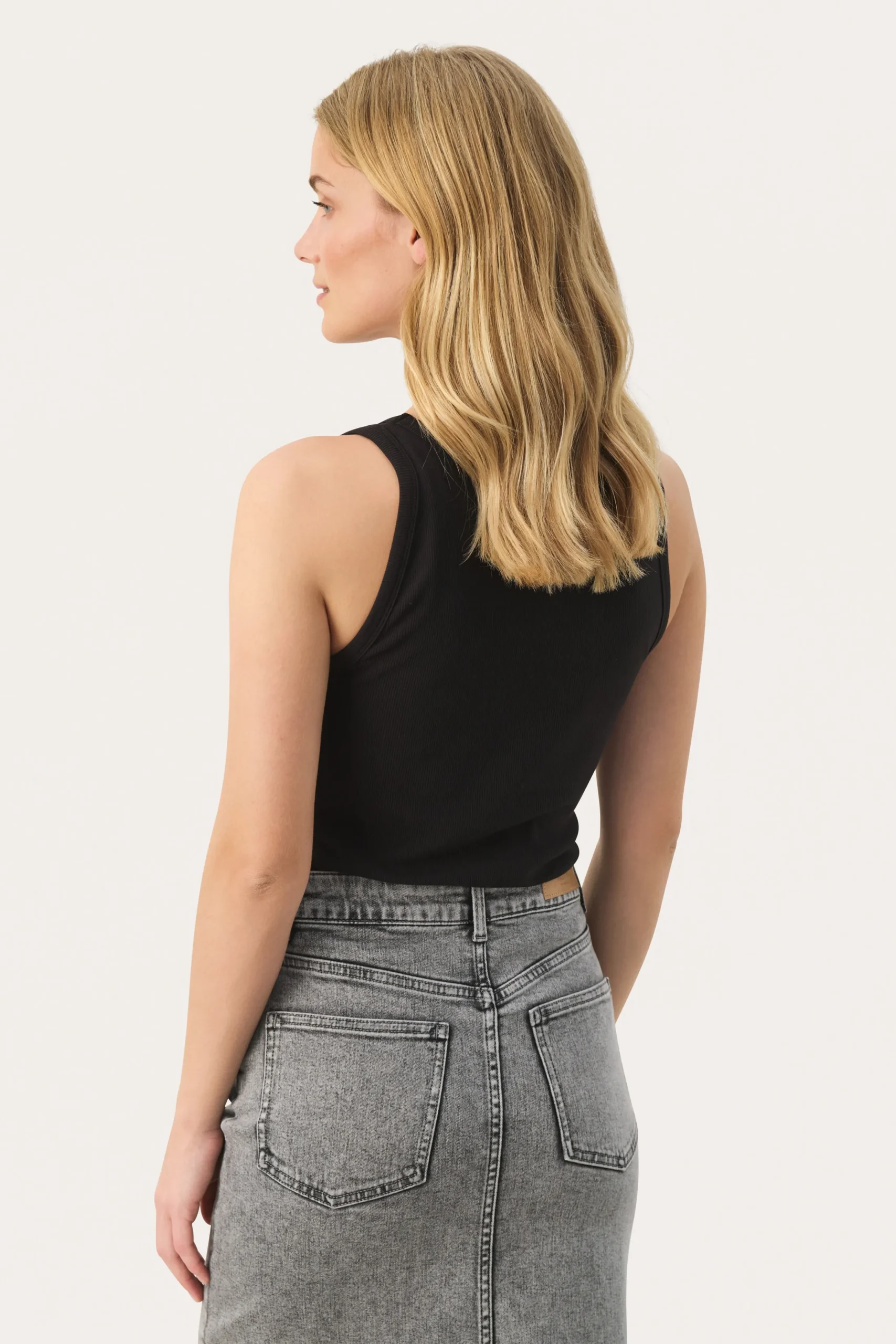 Modellen er 181 cm høj og er iført en størrelse M.\\n\\nOpdag denne alsidige, ærmeløse top, der giver et ubesværet og stilfuldt look. Toppen er perfekt til at blande og matche med forskellige outfits, fra afslappede shorts og en cap til en mere opsigtsvækkende frynsenederdel og elegante sko. Et must-have til din sommergarderobe, der tilbyder både komfort og stil.