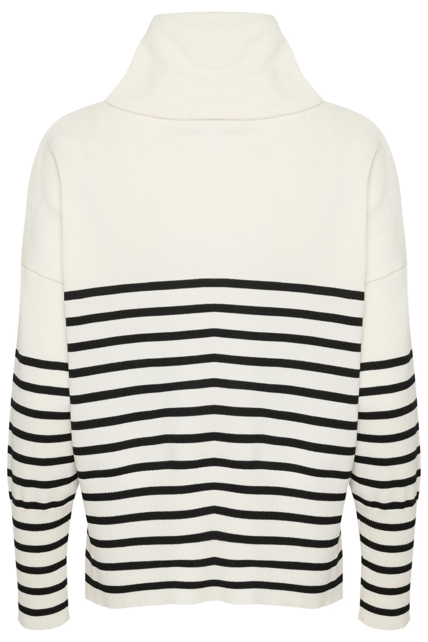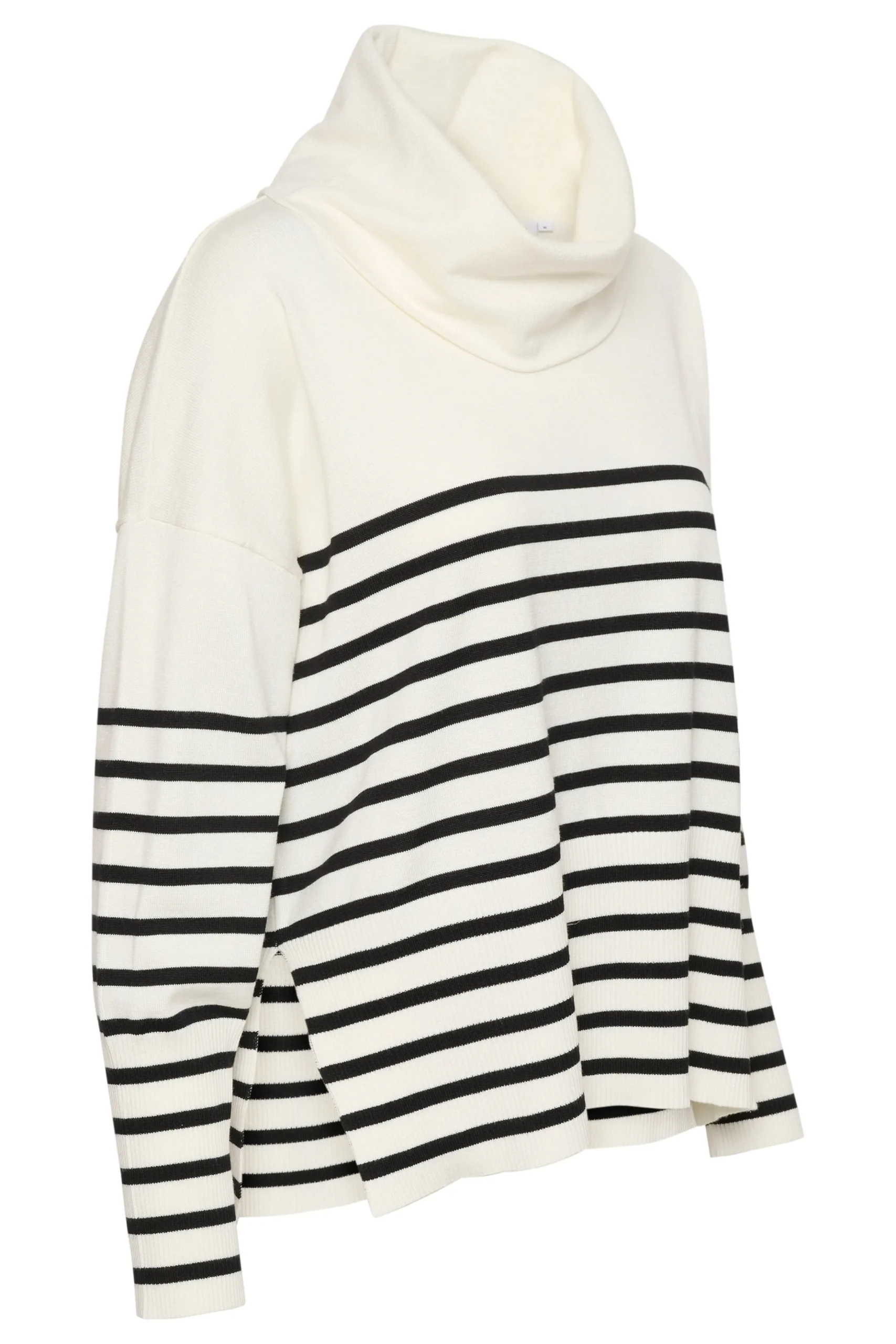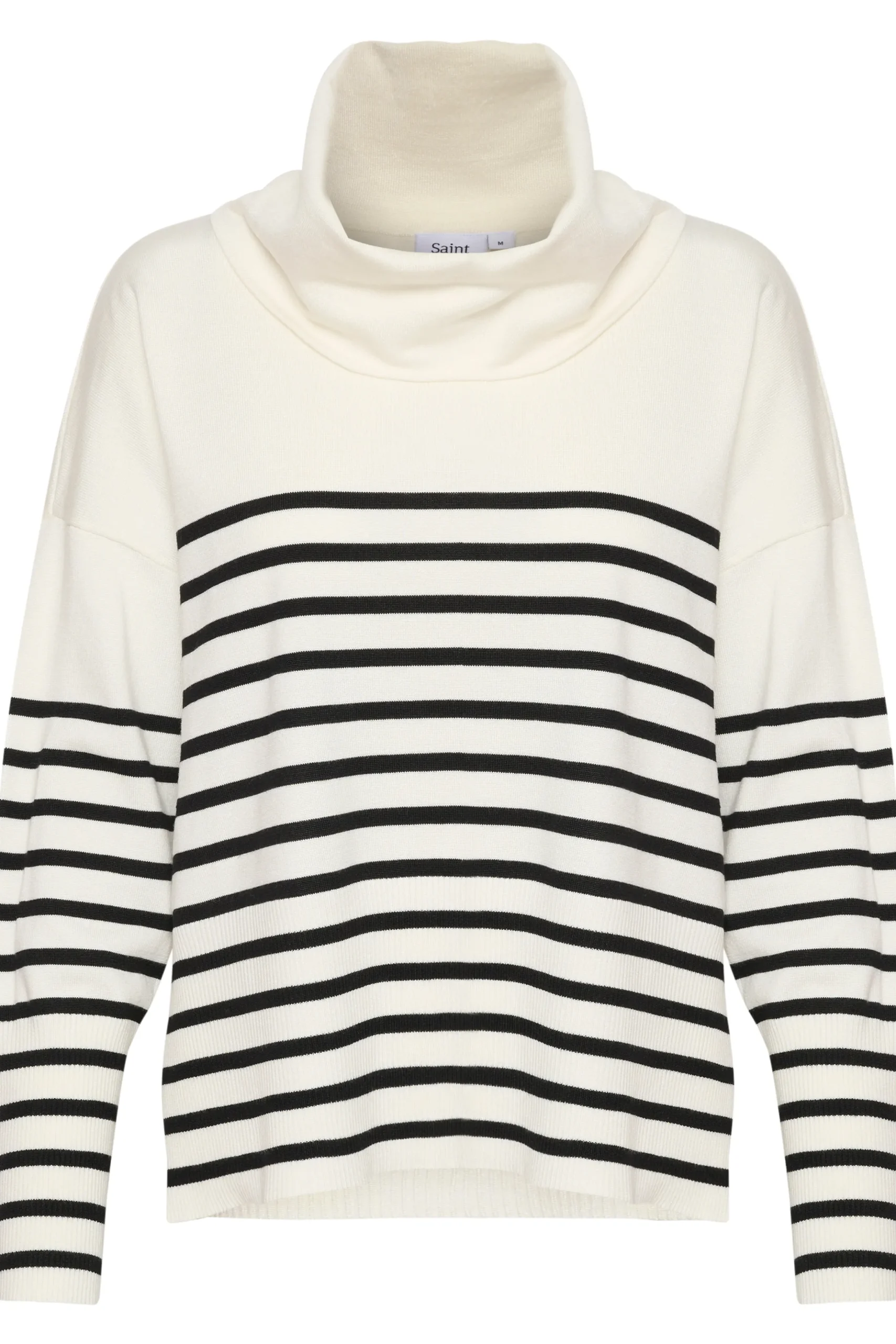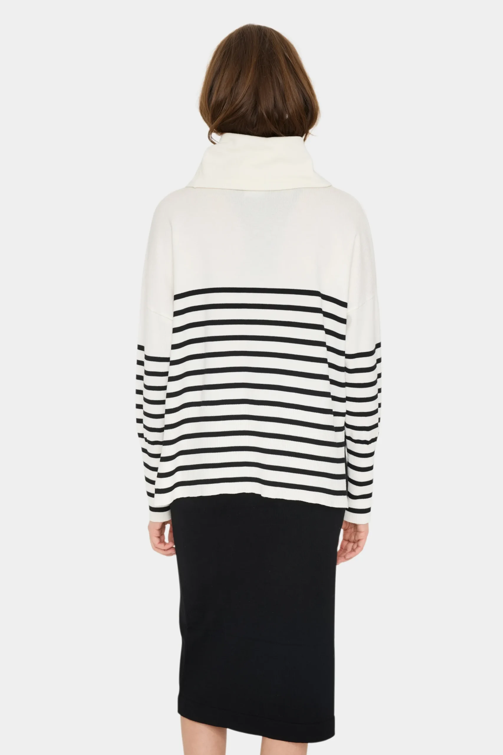 Denne stribede trøje i sort og hvid har en afslappet pasform og en elegant rullekrave, der tilføjer et moderne touch. De brede, vandrette striber giver et klassisk look. \\n\\nModellen er 179 cm høj og er iført en str. M.