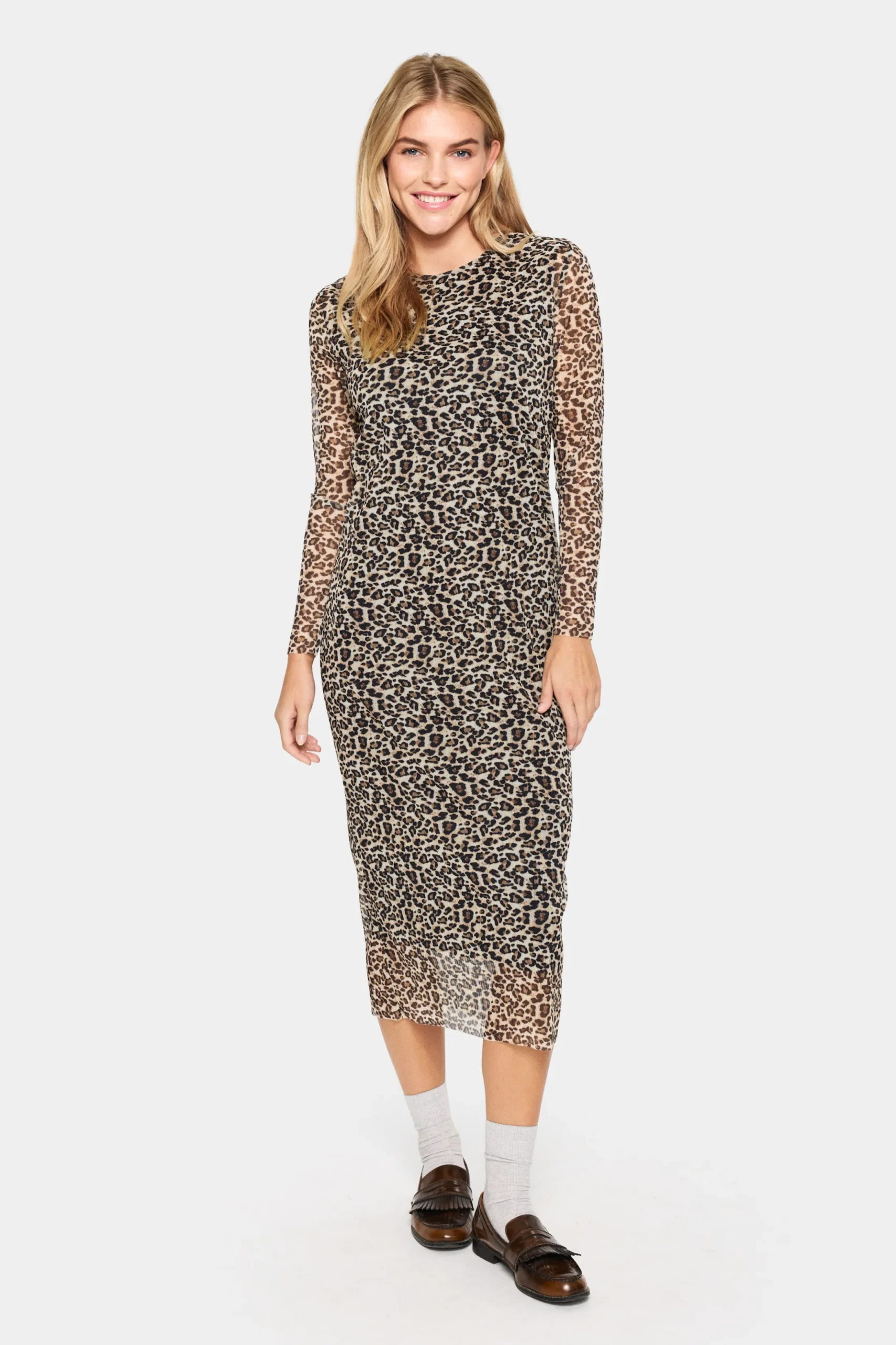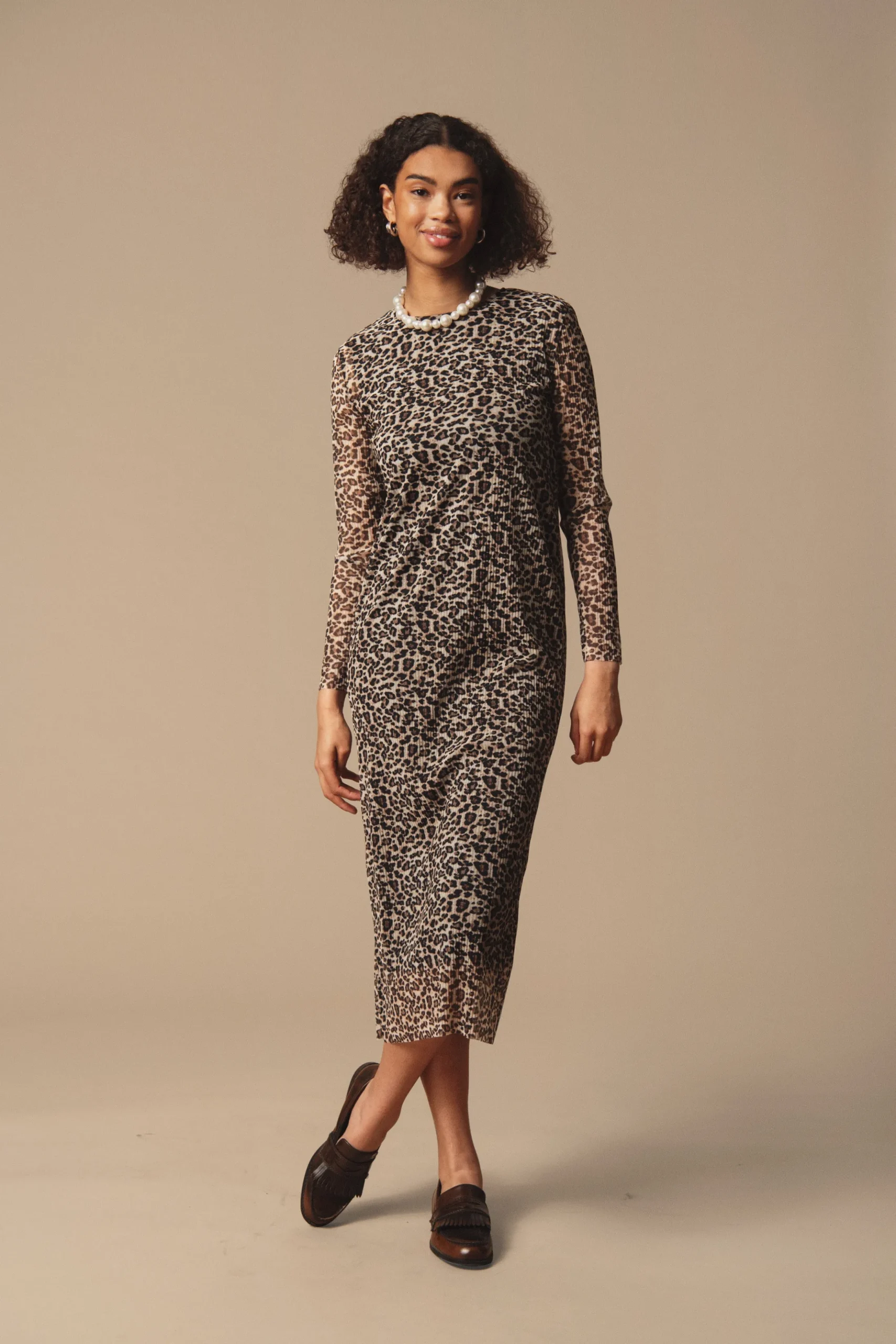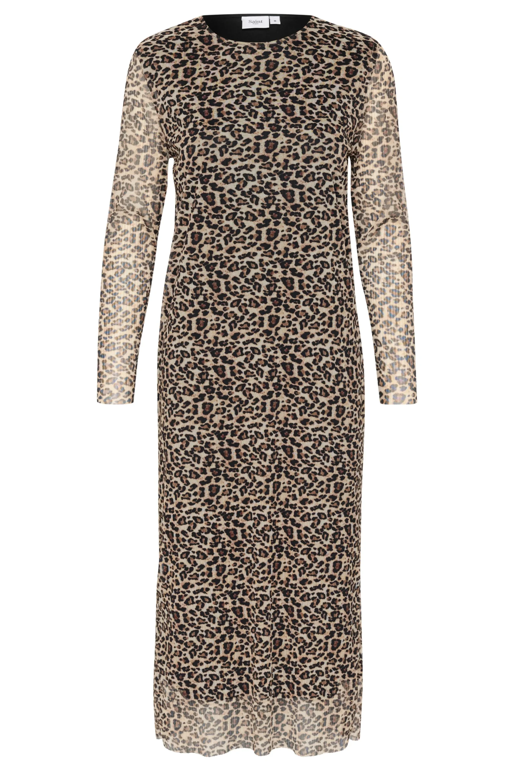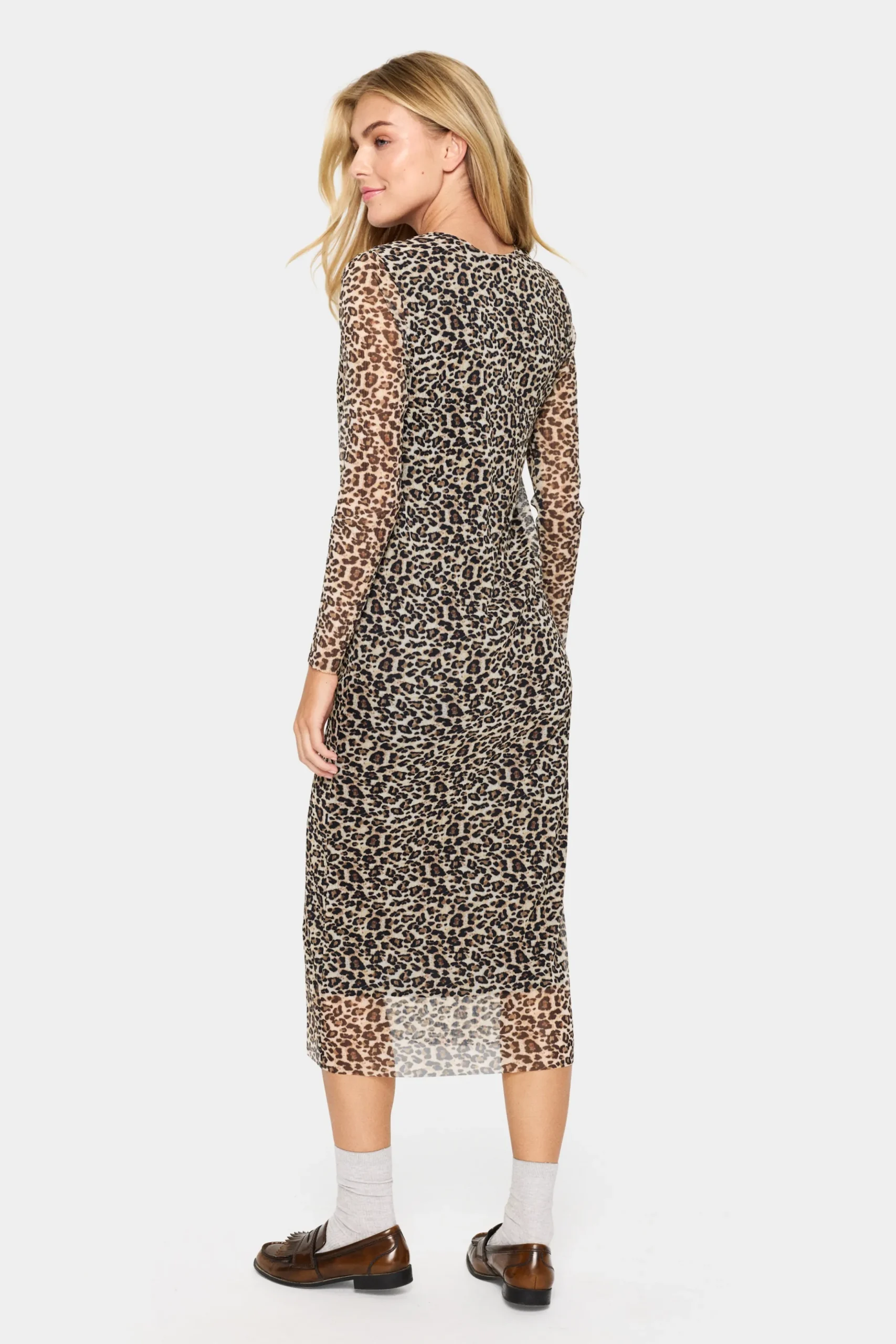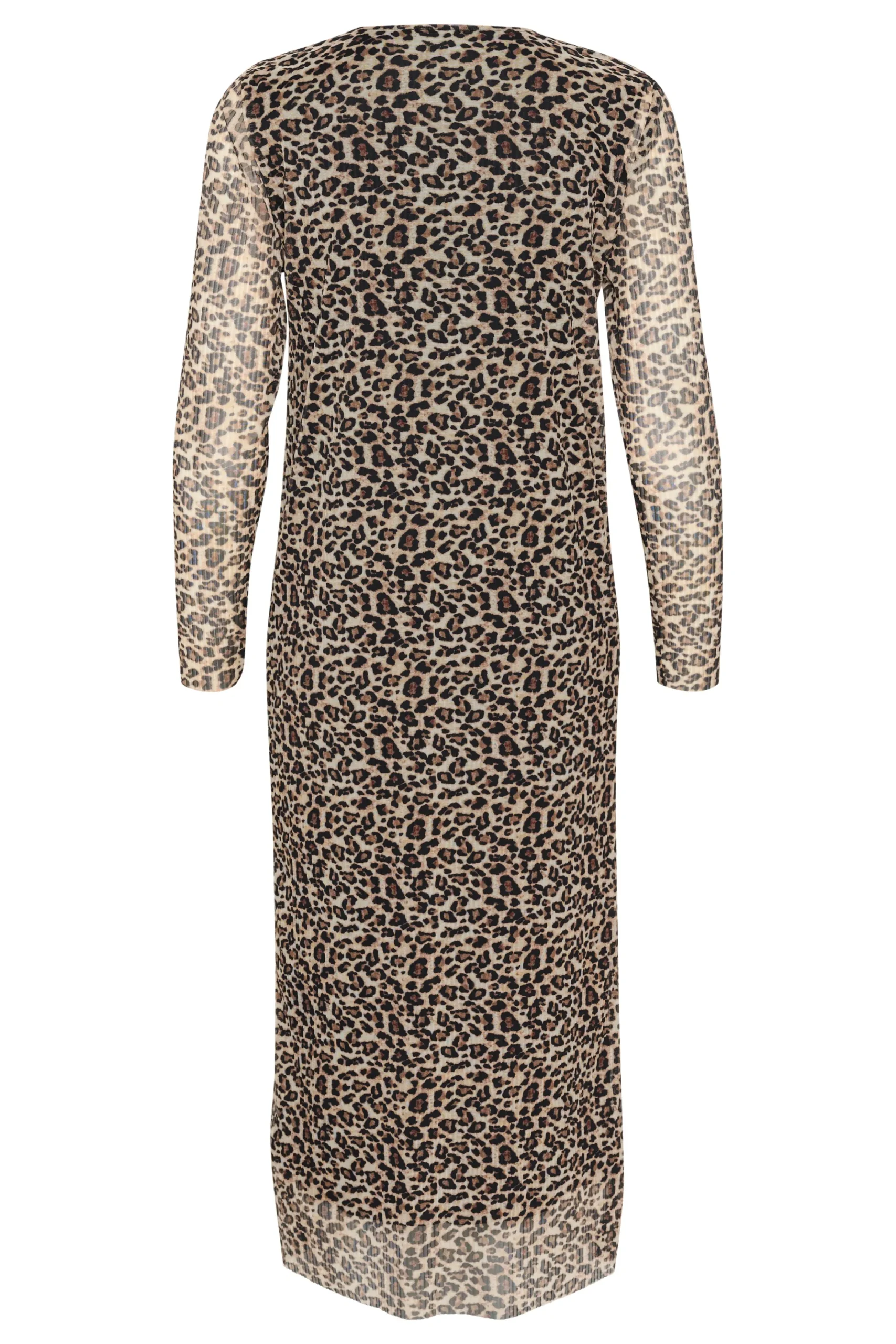 Denne leopardkjole har en figursyet pasform med lange ærmer og et semitransparent yderlag. Den er perfekt til både afslappede og festlige lejligheder. \\n\\nModellen er 177 cm høj og bærer en størrelse M.