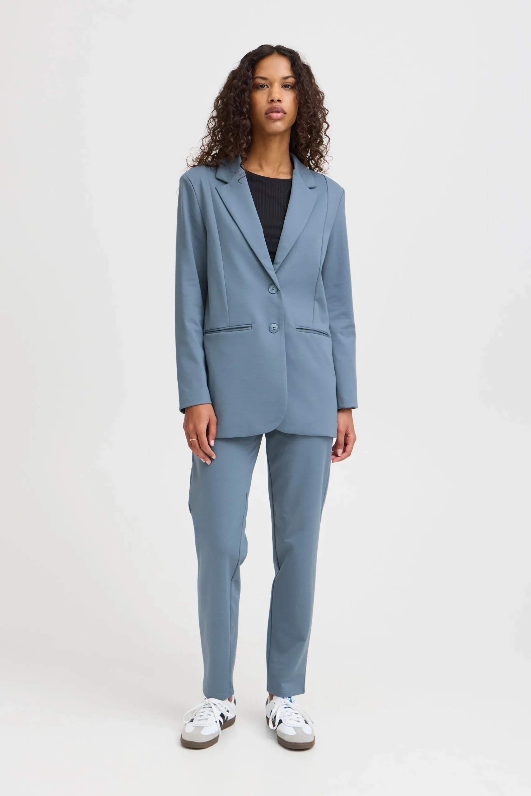 Denne blazer er designet til at kombinere elegance og komfort på bedste vis. Med sin populære IHKATE-silhuet og løse pasform får du et moderne og sofistikeret look, der samtidig giver masser af bevægelsesfrihed. Den fulde længde og de lange ærmer gør den ideel til både hverdags- og festbrug.\\n\\nStyle den med en klassisk skjorte og matchende bukser for et professionelt udtryk, eller style den sammen med en afslappet top og jeans for et mere casual look.\\n