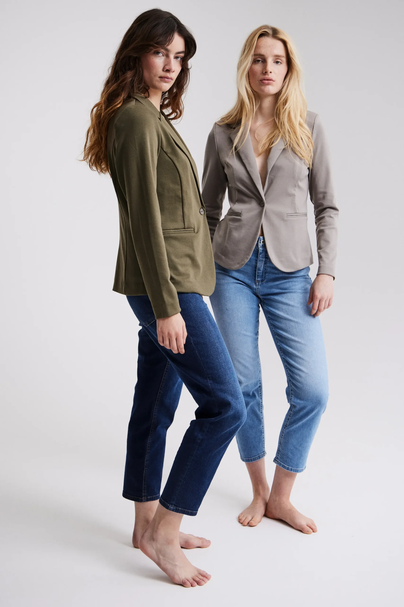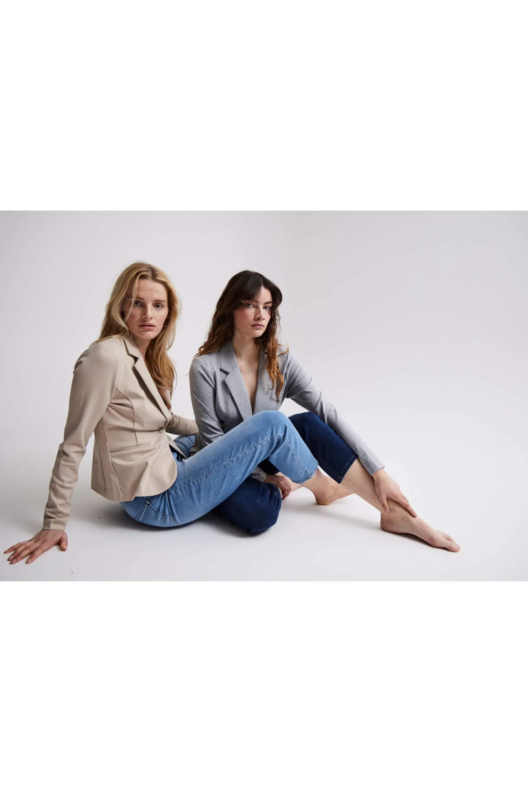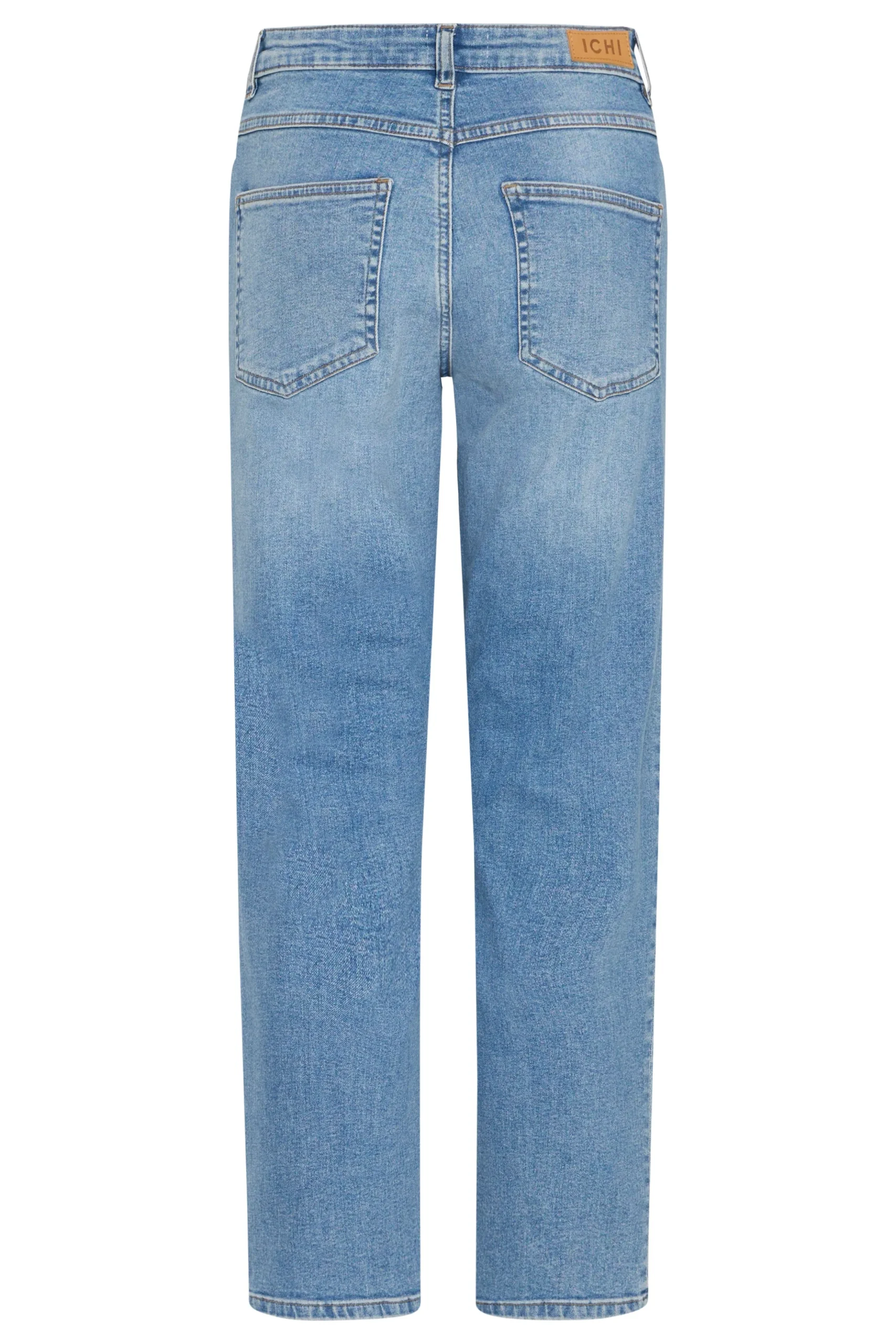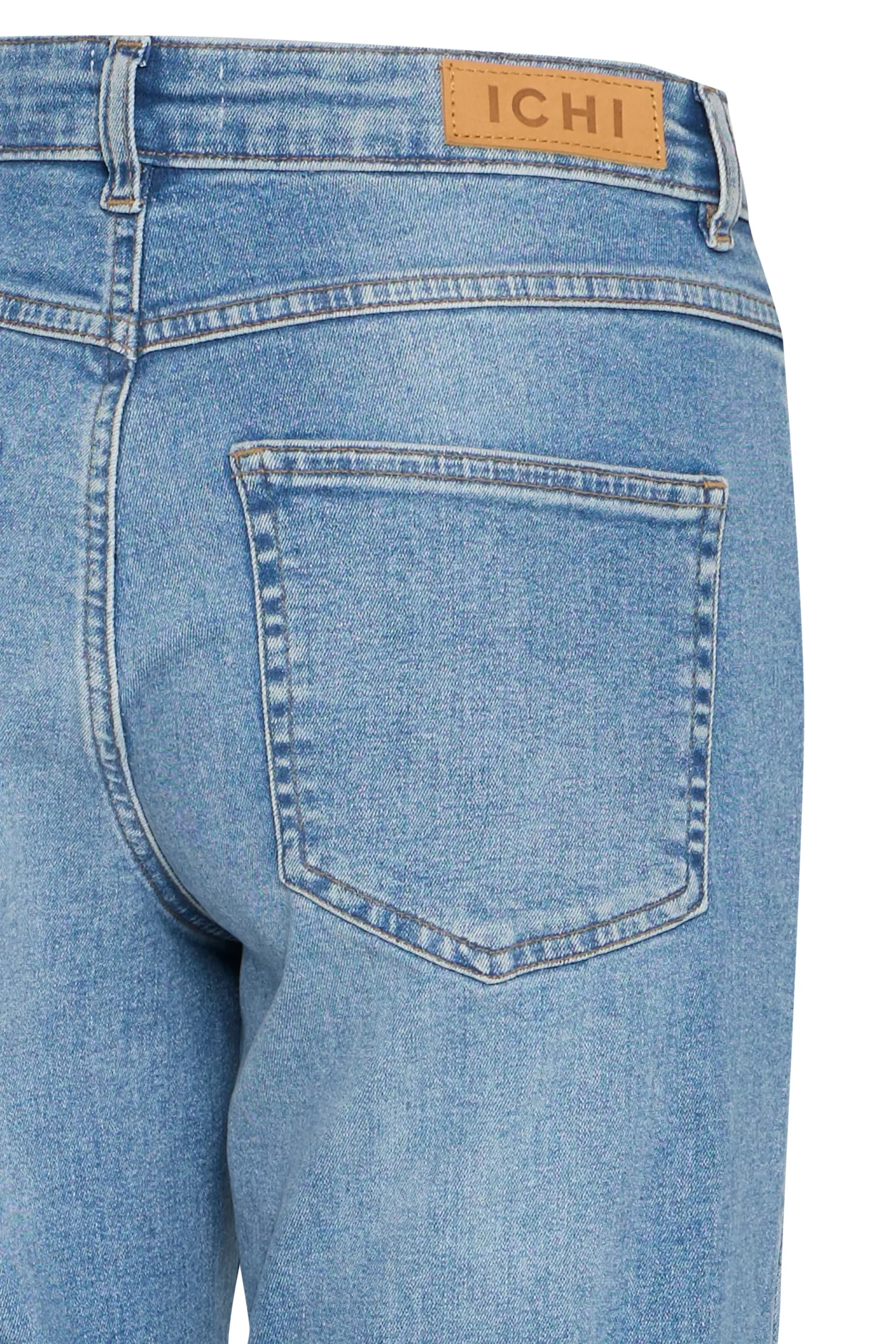Denim-ankelbuks fra ICHI med fast linning, bæltestropper samt knap og lynlåslukning. 5 lommer. Normal talje. Lige ben.