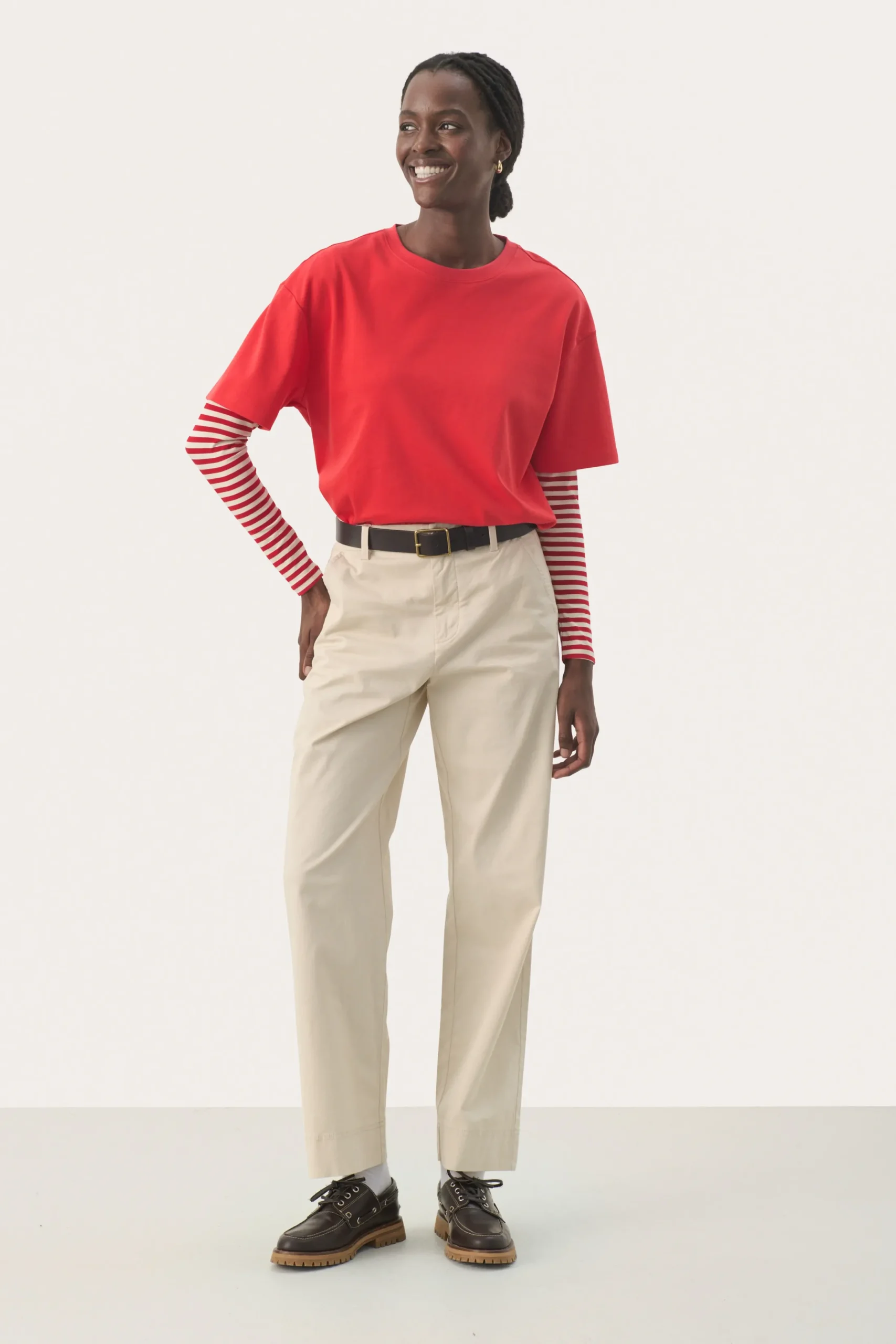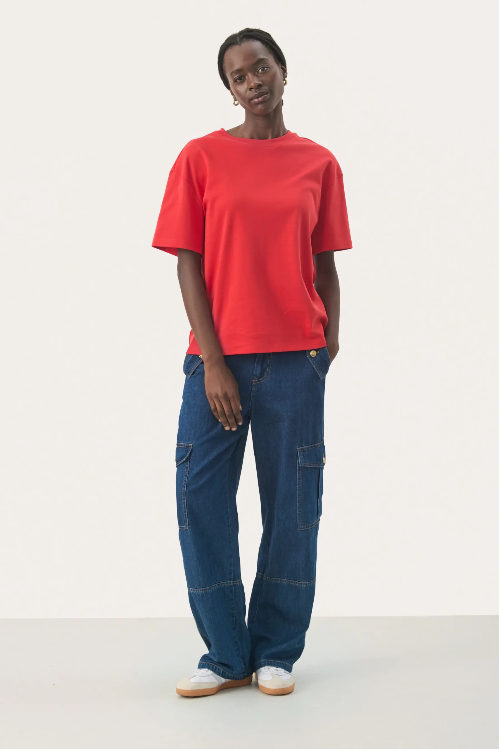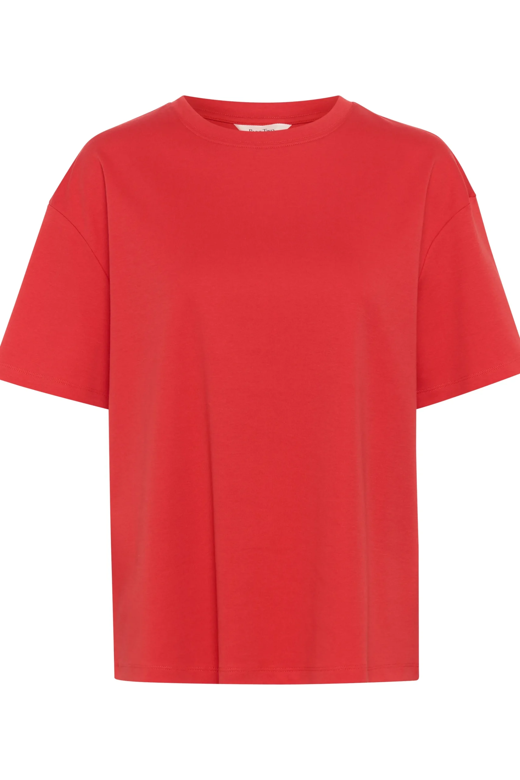 Modellen er 180 cm høj og er iført en størrelse M.\\n\\nDenne T-shirt er lavet af blødt og behageligt materiale, der giver en afslappet pasform. Med sin enkle rund hals og løse snit er den ideel til både afslappede dage og lag-på-lag styling. En moderne klassiker til garderoben.\\n\\n