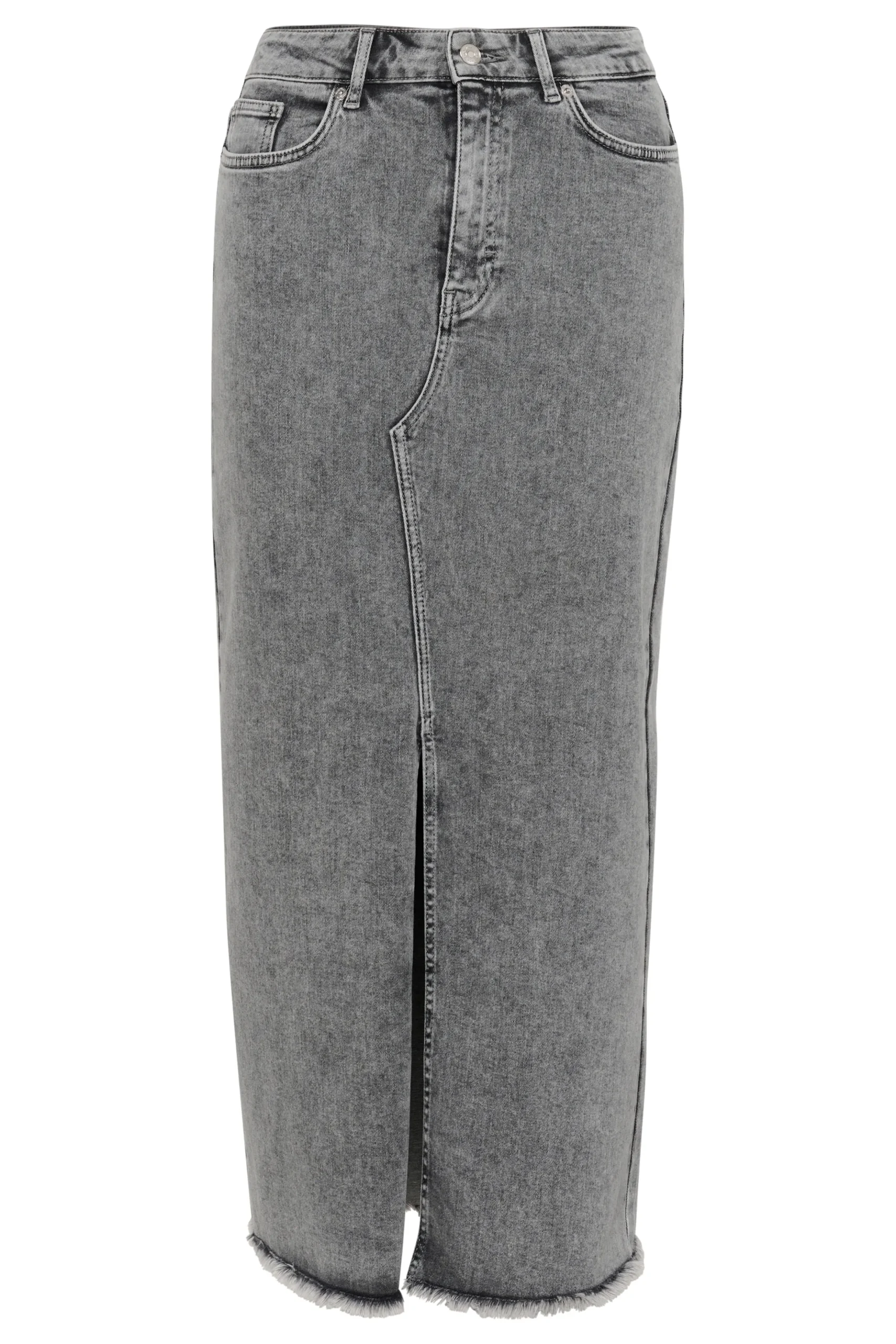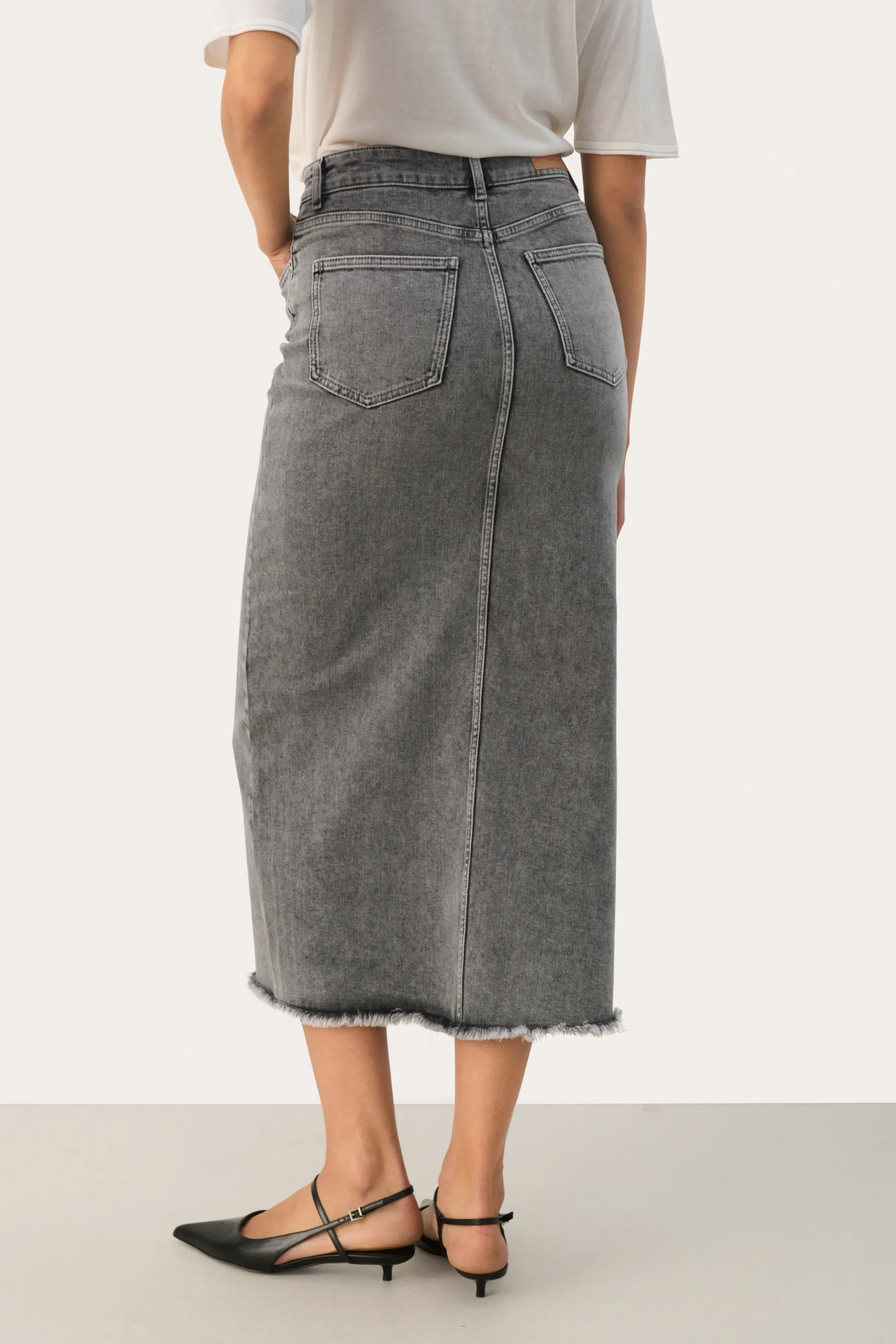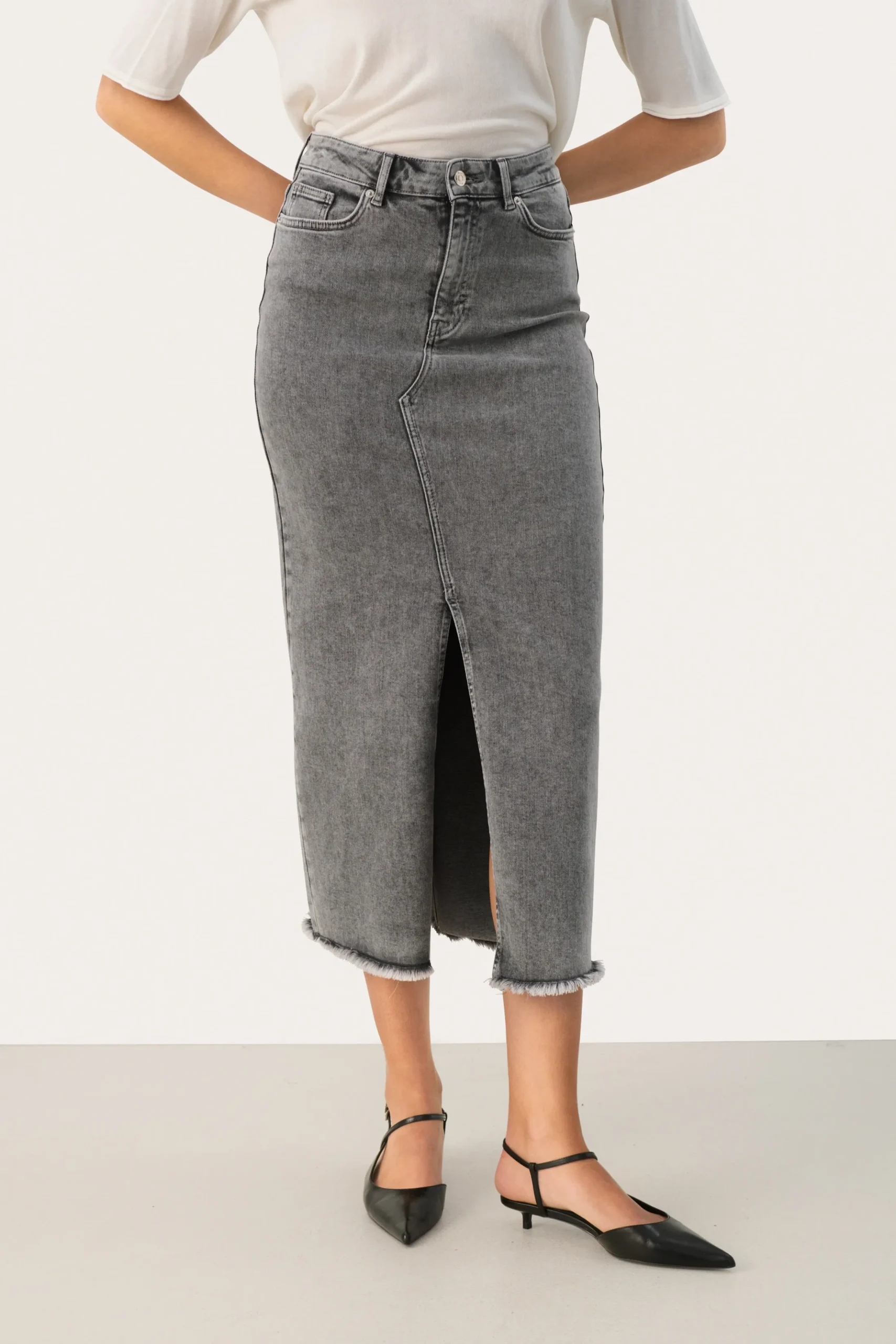 Modellen er 181 cm høj og er iført en størrelse 36.\\n\\nOpgrader dit look med vores midi-denim nederdel, et moderne twist på et klassisk design. Fremstillet med slids foran og frynset kant balancerer den stil med et moderne strejf. Det høje taljesnit sikrer en flatterende pasform, perfekt til alsidig styling. Uanset om den er parret med en skarp hvid skjorte for et raffineret look eller en afslappet t-shirt til afslappede dage, lover denne denimnederdel at blive en favorit i din garderobe og tilbyder uendelige stylingmuligheder.