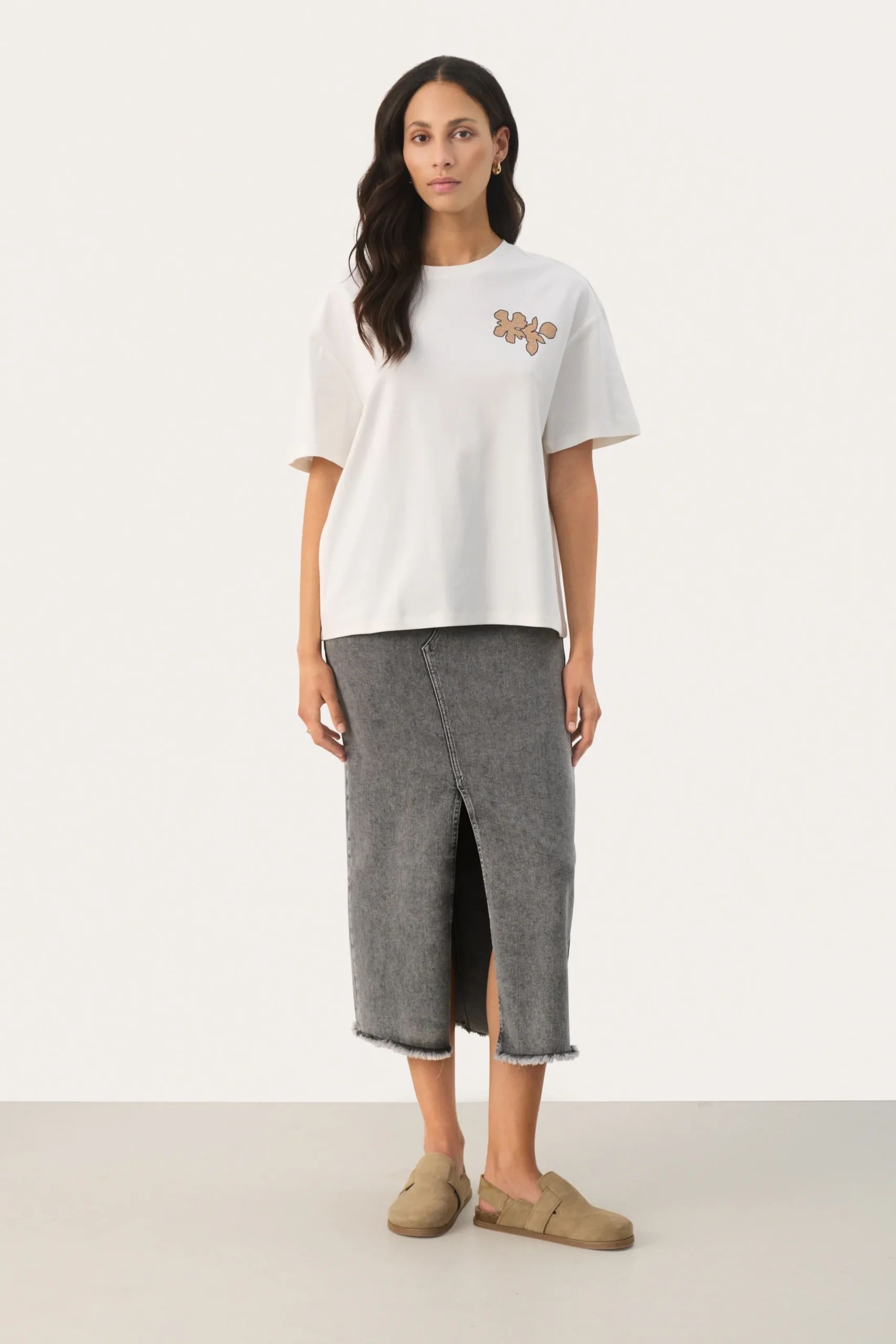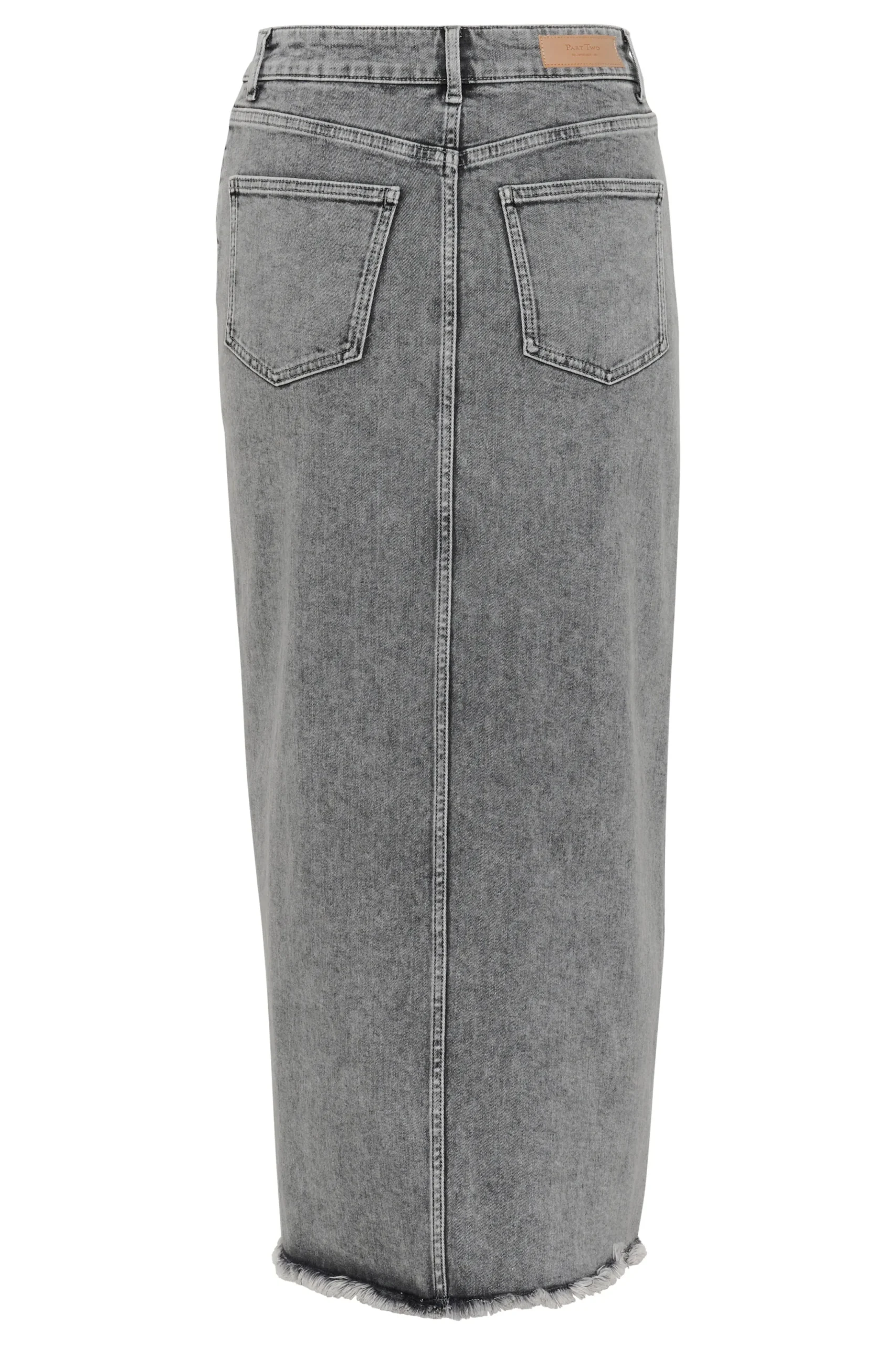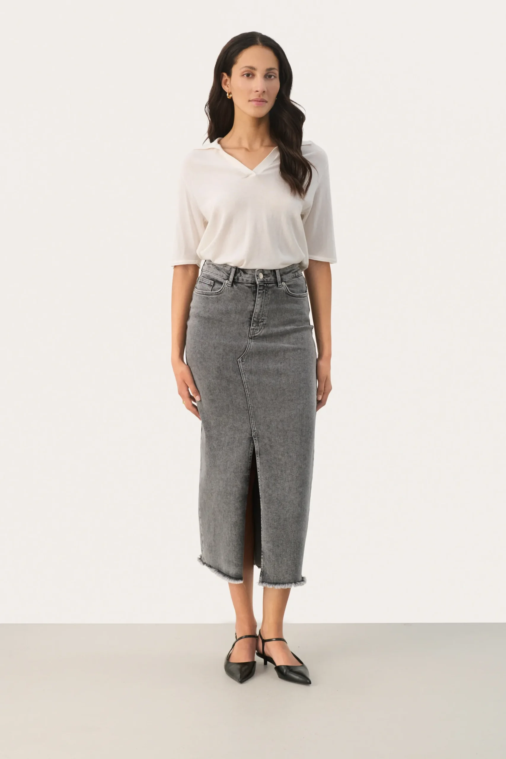 Modellen er 181 cm høj og er iført en størrelse 36.\\n\\nOpgrader dit look med vores midi-denim nederdel, et moderne twist på et klassisk design. Fremstillet med slids foran og frynset kant balancerer den stil med et moderne strejf. Det høje taljesnit sikrer en flatterende pasform, perfekt til alsidig styling. Uanset om den er parret med en skarp hvid skjorte for et raffineret look eller en afslappet t-shirt til afslappede dage, lover denne denimnederdel at blive en favorit i din garderobe og tilbyder uendelige stylingmuligheder.