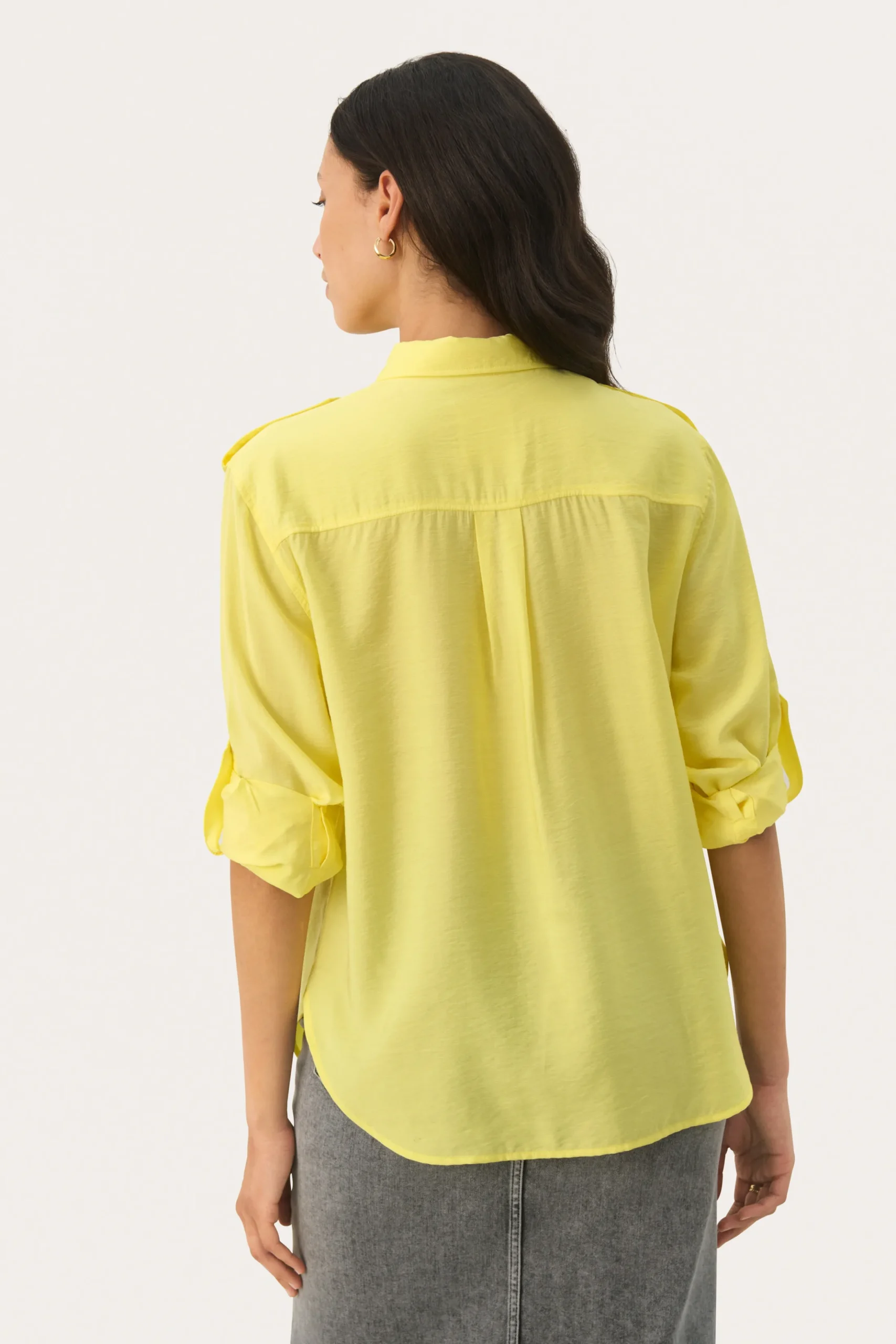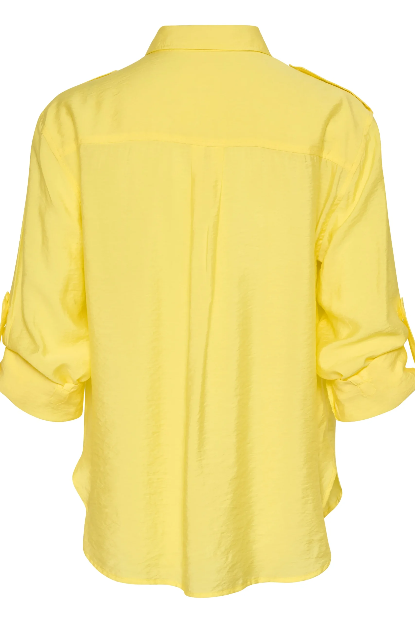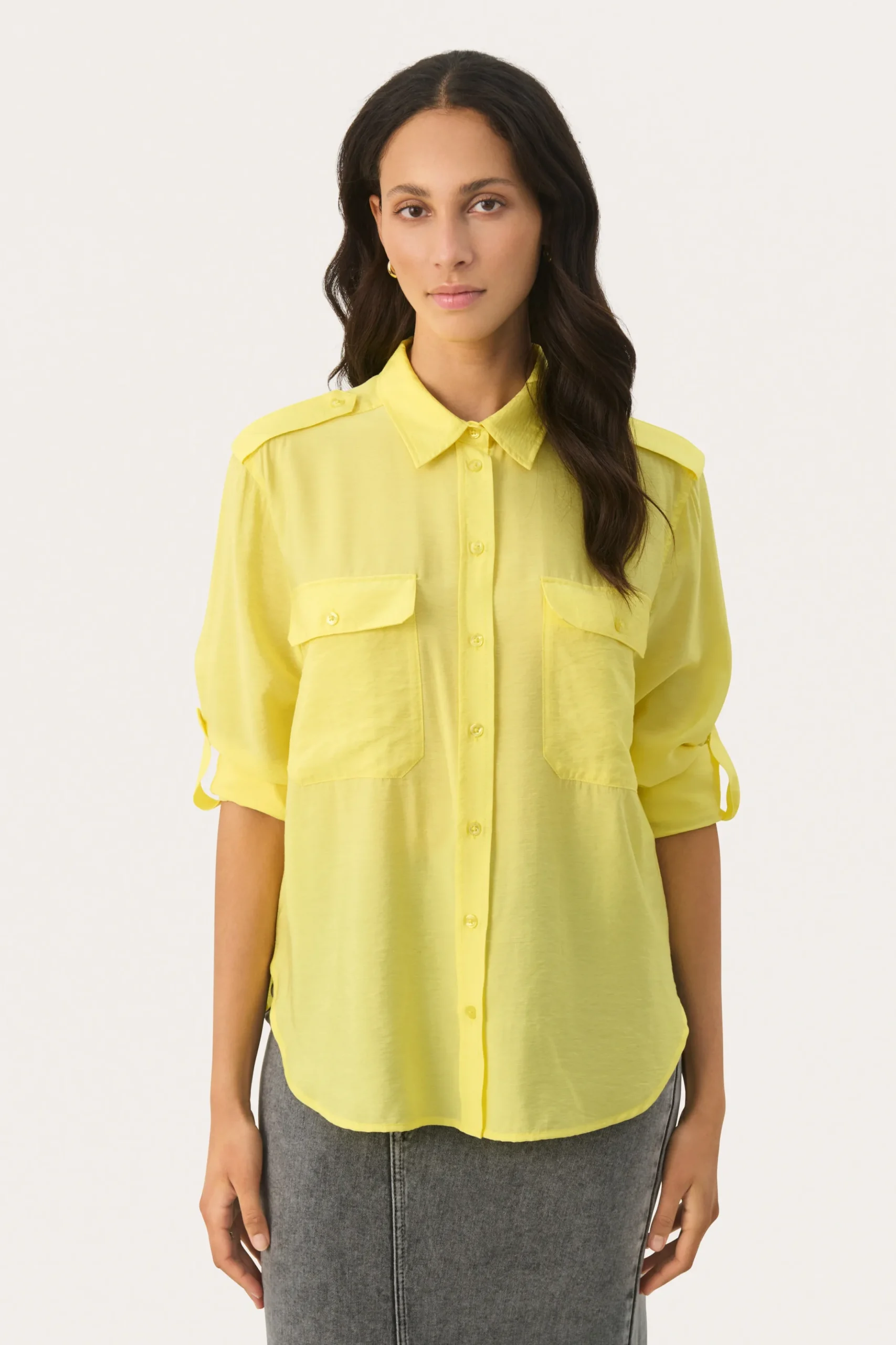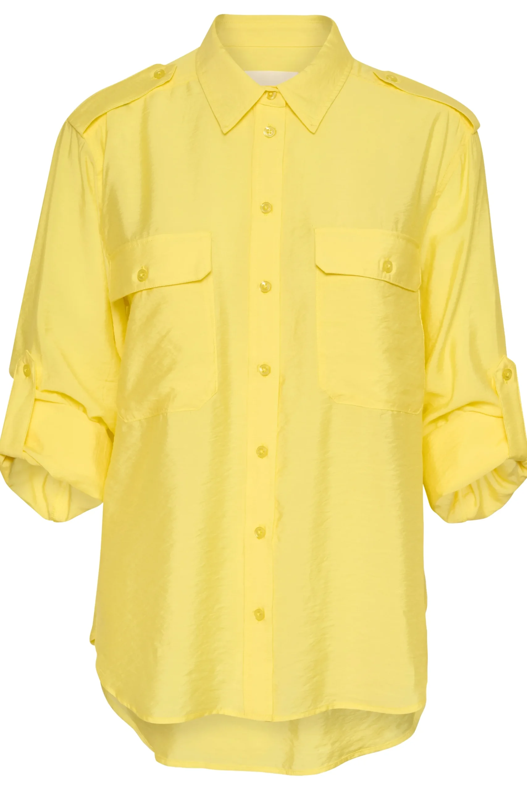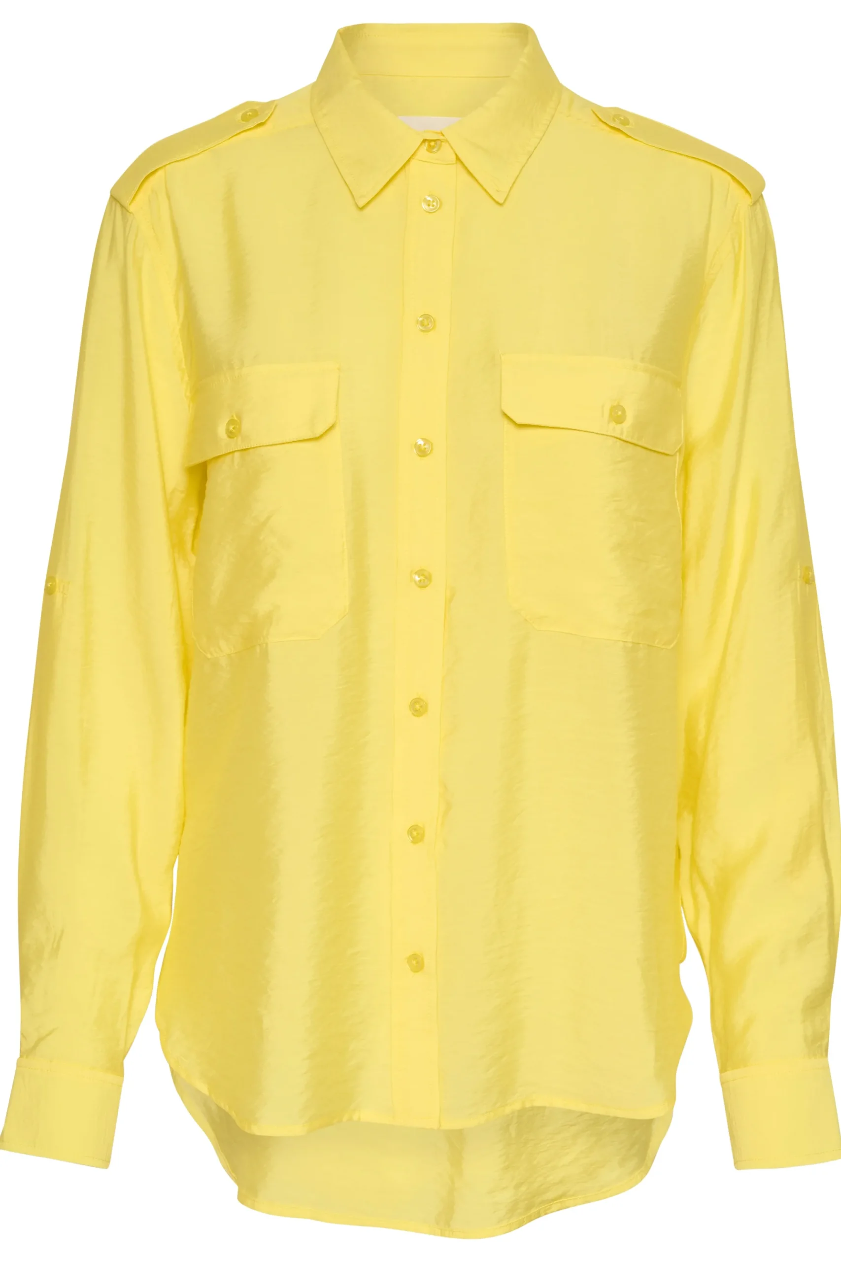 Modellen er 181 cm høj og er iført en størrelse 36.\\n\\nImødekom den solrige sæson med denne livlige gule bluse. Fremstillet af et blødt, åndbart stof, som tilbyder både komfort og et strejf af elegance til dit ensemble. Med en klassisk krave, dobbelte brystlommer og ærmer med opsmøg, er dette stykke alsidigt nok til både afslappede udflugter og kontoret. Perfekt til at kombinere med skræddersyede bukser eller denim for et chikt, ubesværet look.