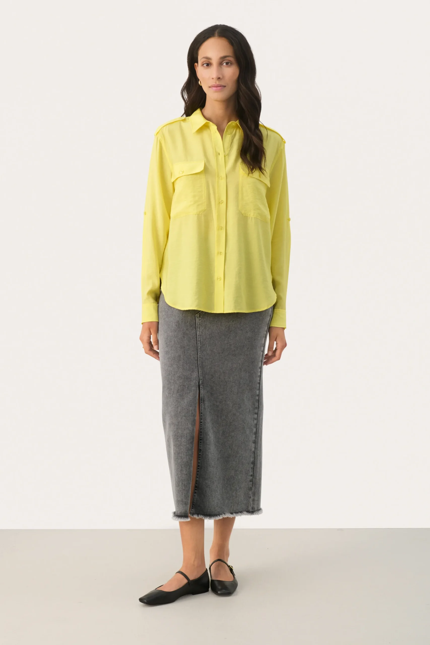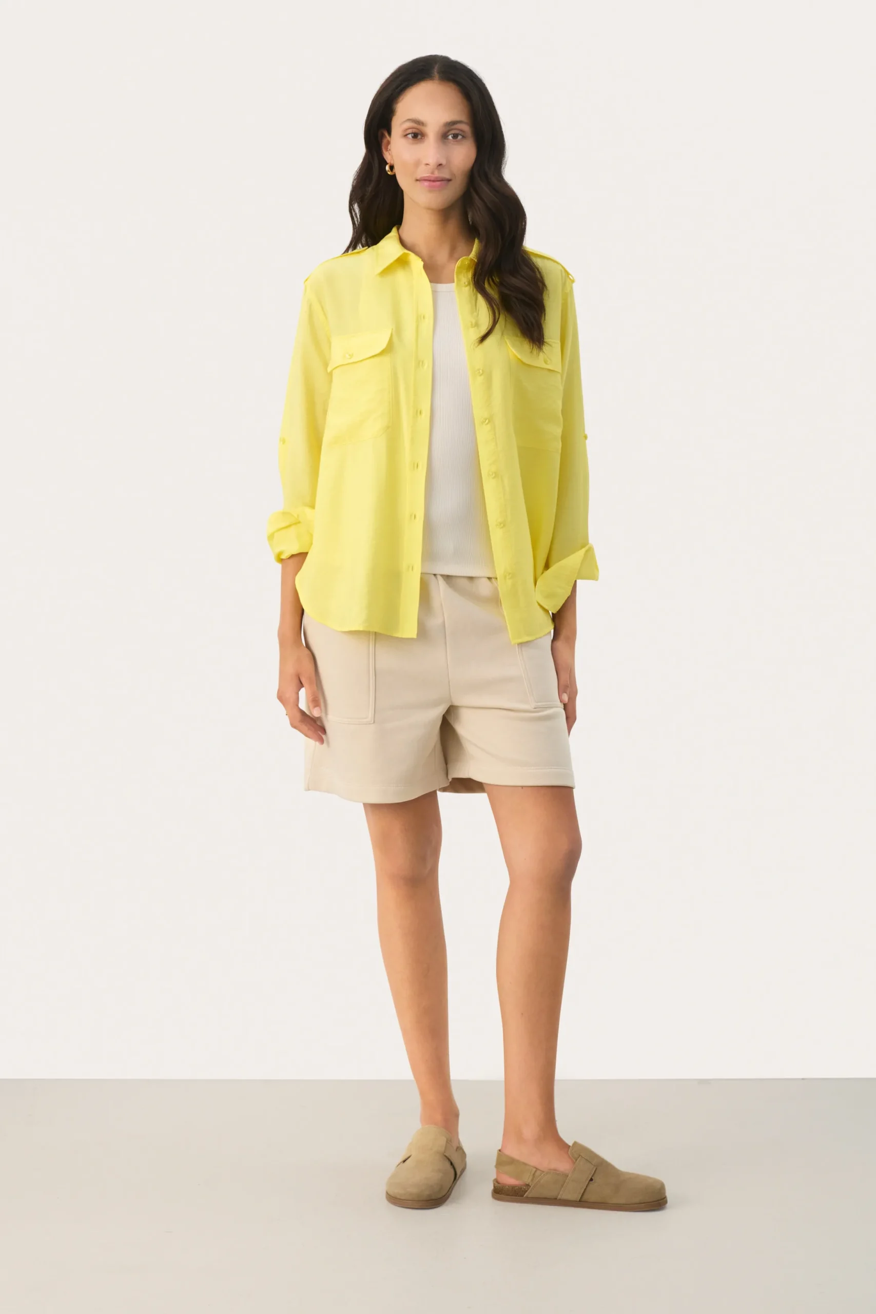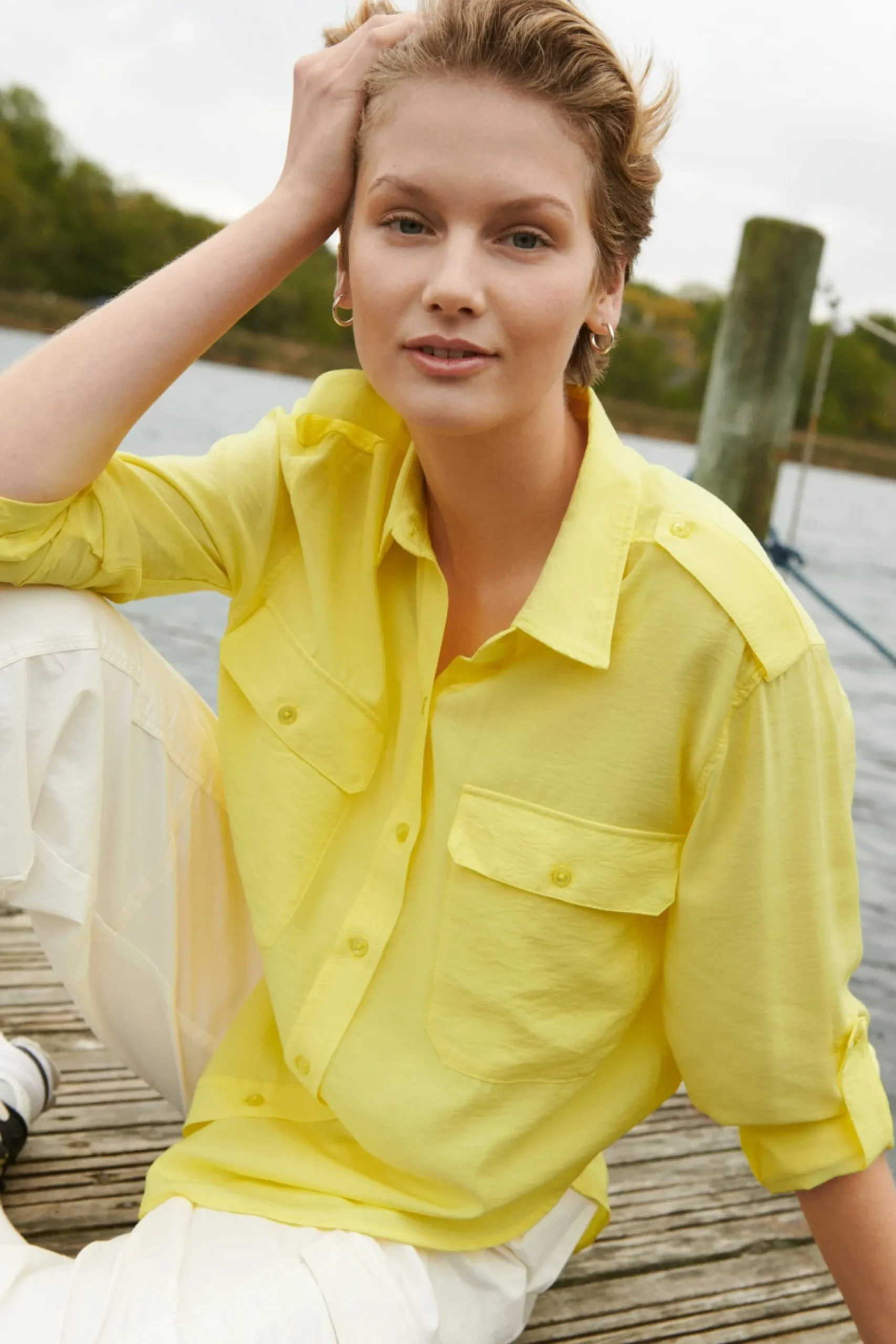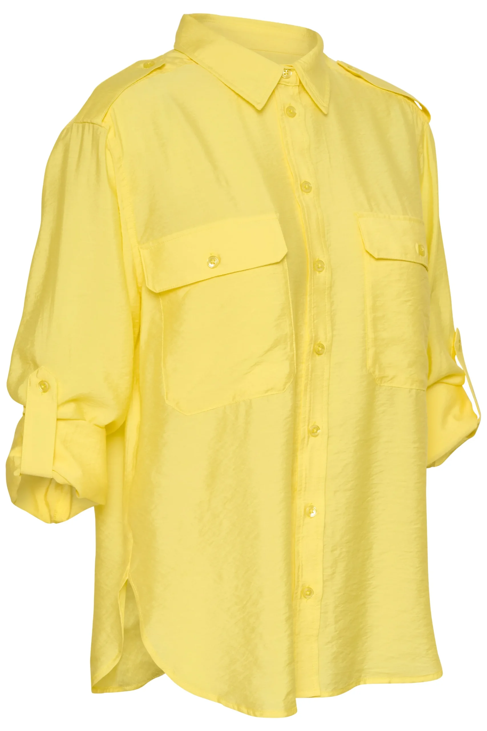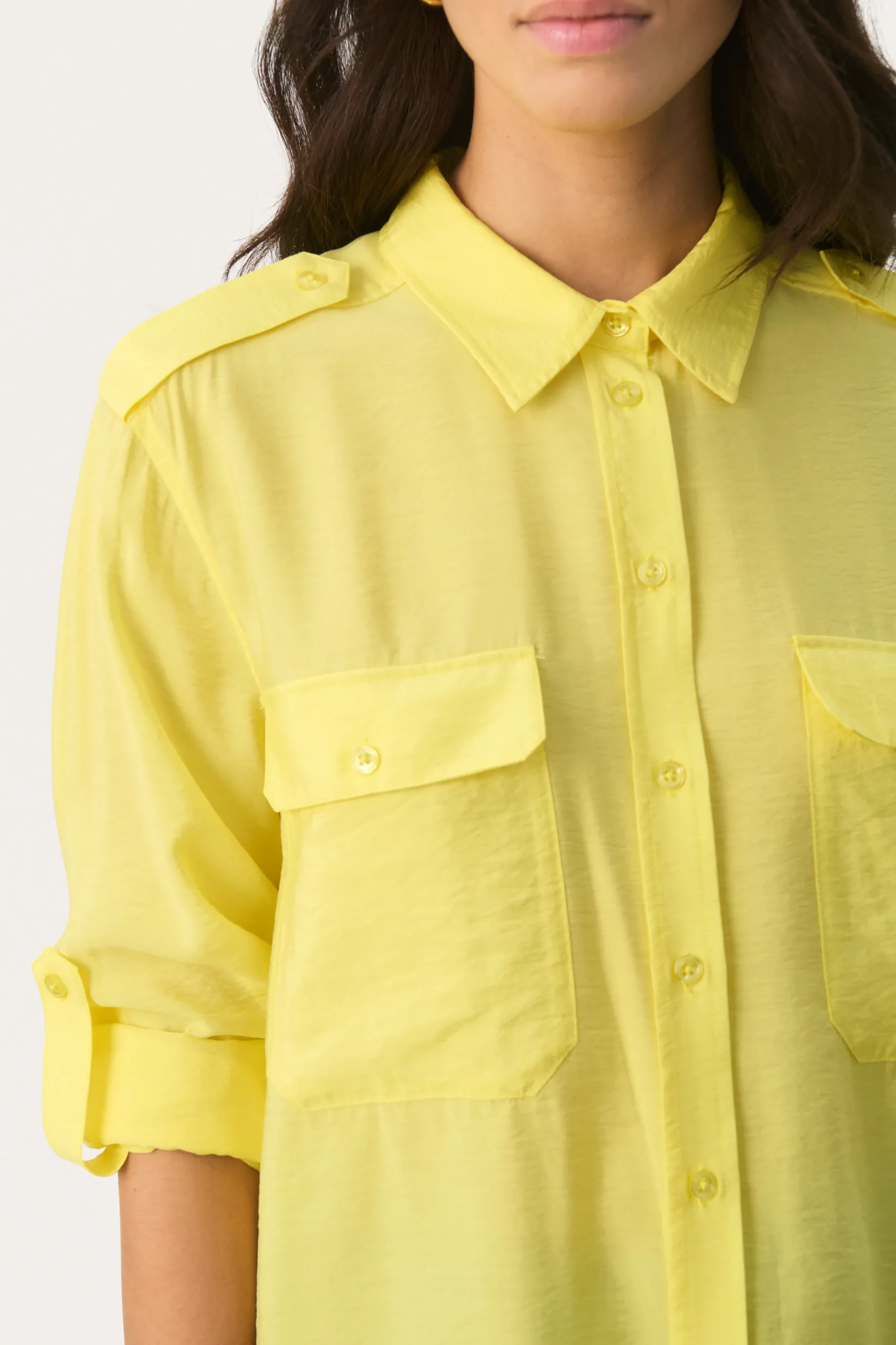 Modellen er 181 cm høj og er iført en størrelse 36.\\n\\nImødekom den solrige sæson med denne livlige gule bluse. Fremstillet af et blødt, åndbart stof, som tilbyder både komfort og et strejf af elegance til dit ensemble. Med en klassisk krave, dobbelte brystlommer og ærmer med opsmøg, er dette stykke alsidigt nok til både afslappede udflugter og kontoret. Perfekt til at kombinere med skræddersyede bukser eller denim for et chikt, ubesværet look.
