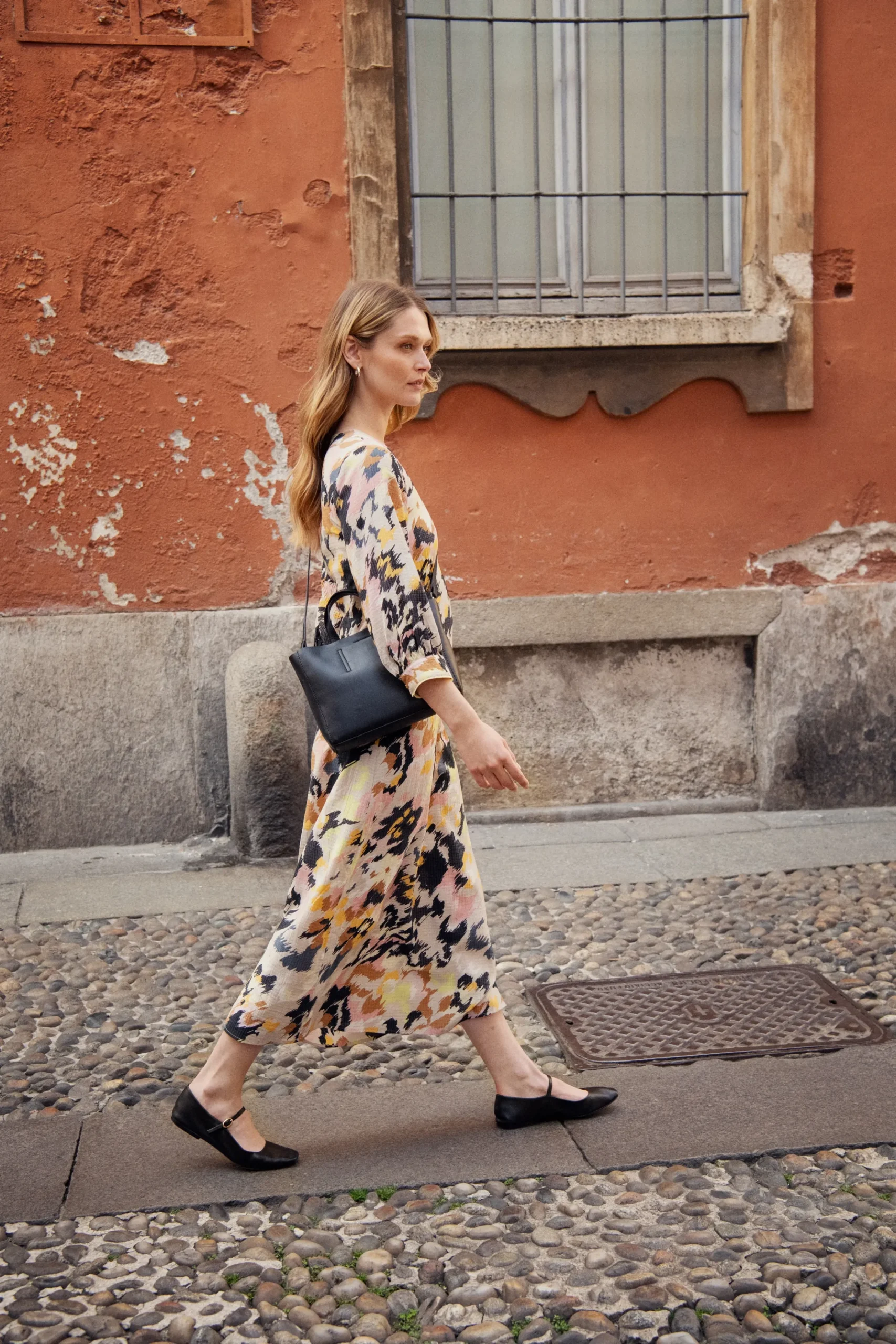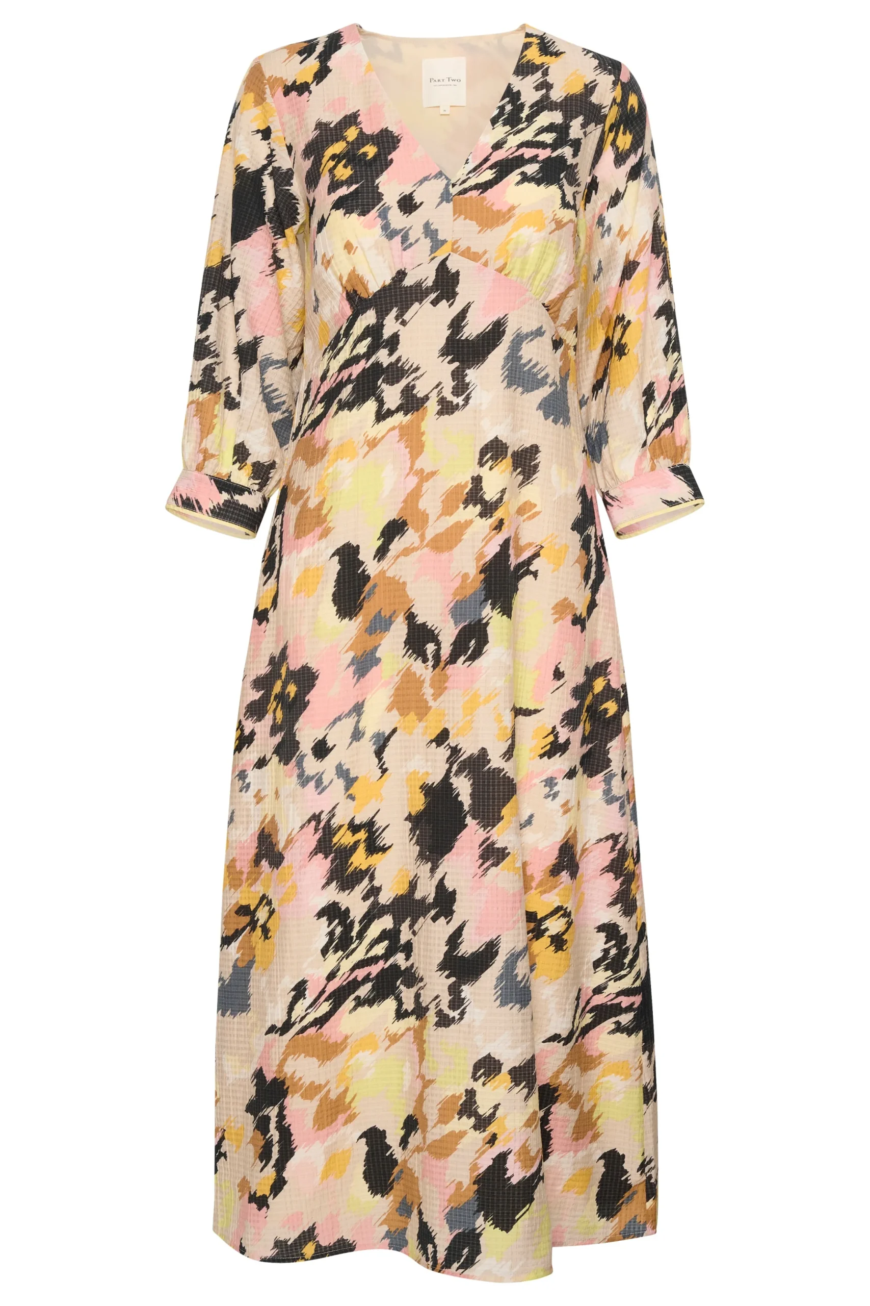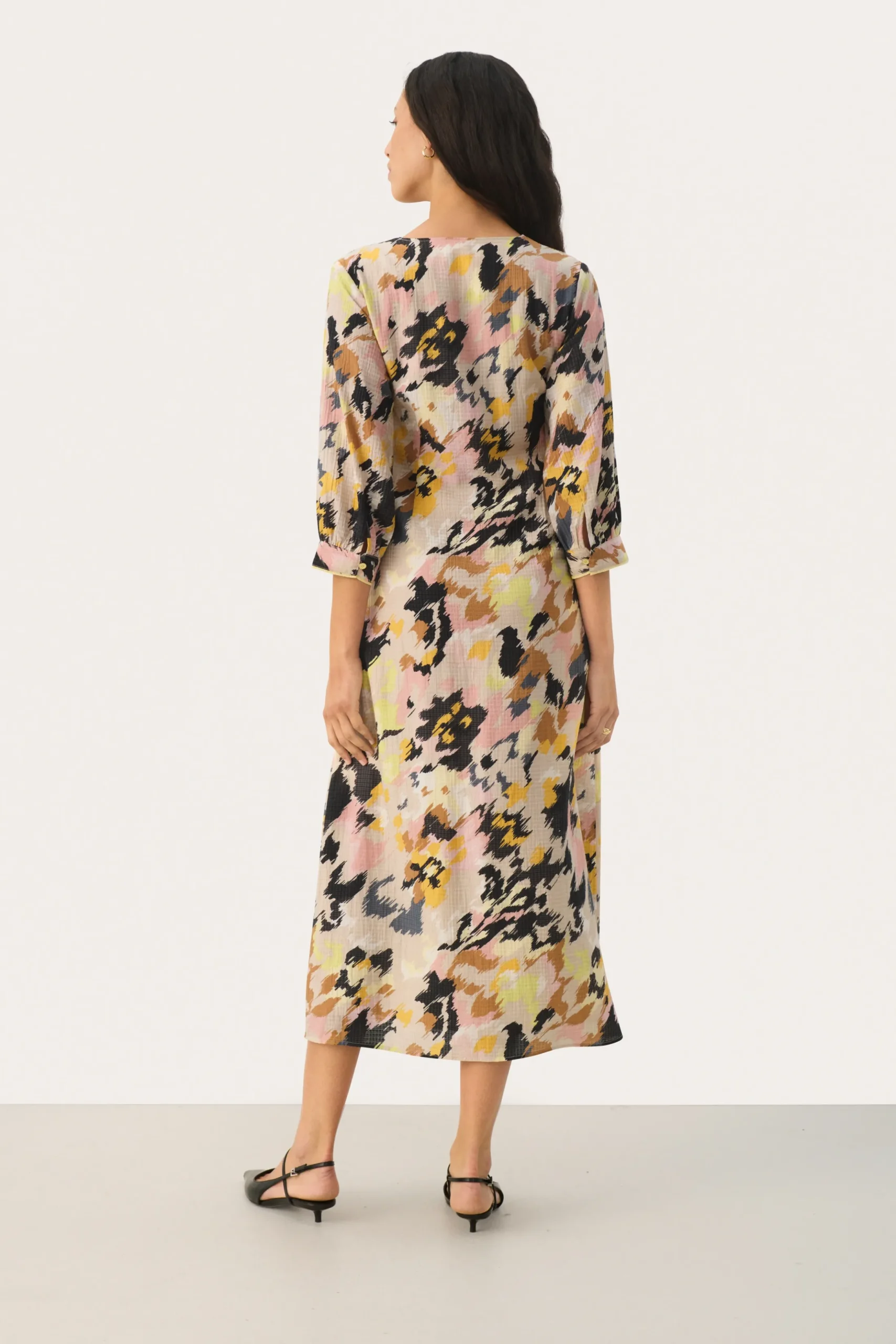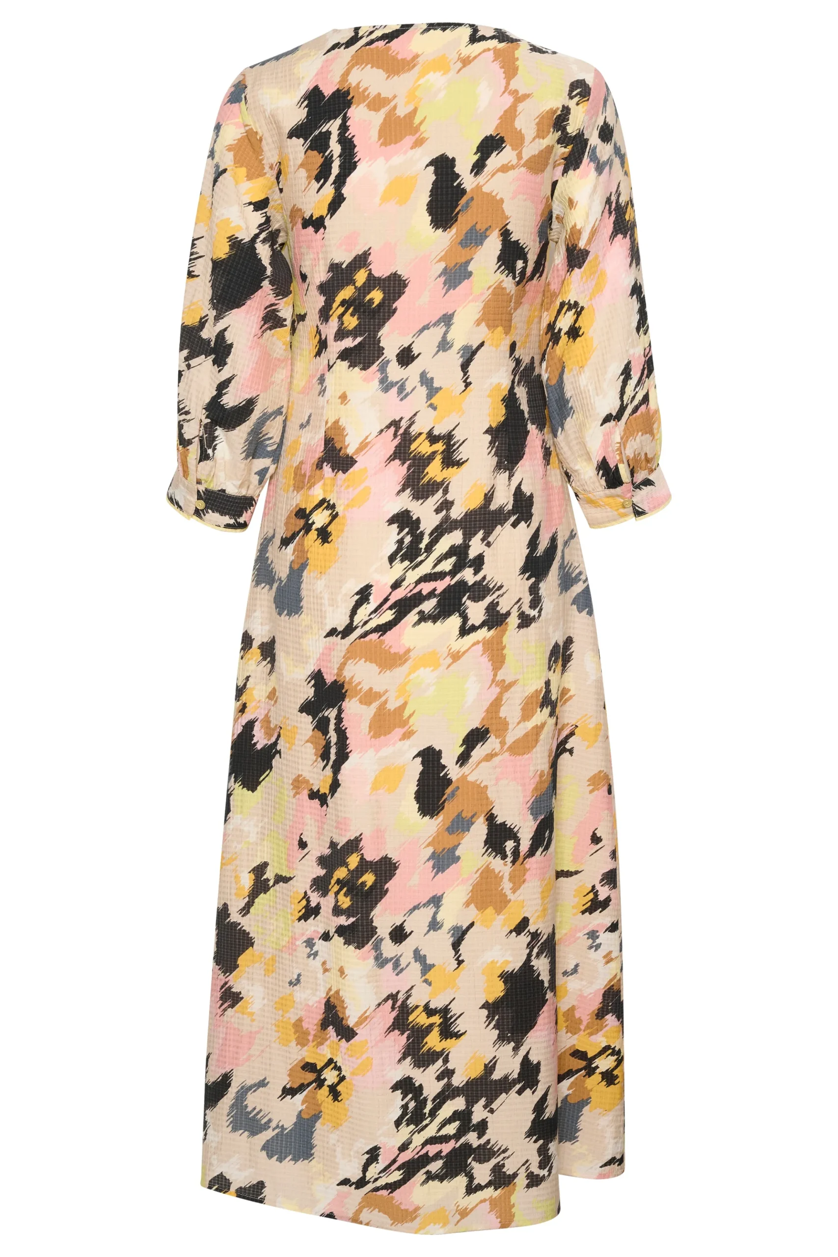 Modellen er 181 cm høj og er iført en størrelse 36.\\n\\nDenne blomstrede kjole kombinerer komfort og stil med sit smukke print og elegante midi-længde. Den perfekte kjole til både daglige gøremål og særlige anledninger. Det bløde stof og den afslappede pasform sikrer komfort hele dagen, mens det levende mønster tilføjer et strejf af glamour.