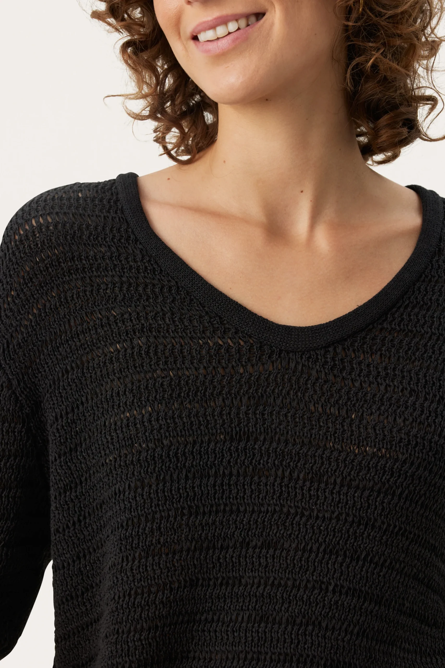 Modellen er 179 cm høj og er iført en størrelse M.\\n\\nDenne strikkede sweater er et must-have til din garderobe. Med sin løse pasform og bløde materiale er den perfekt til både afslappede dage og hyggelige aftener. Style den med løse bukser for et komfortabelt og stilfuldt look.