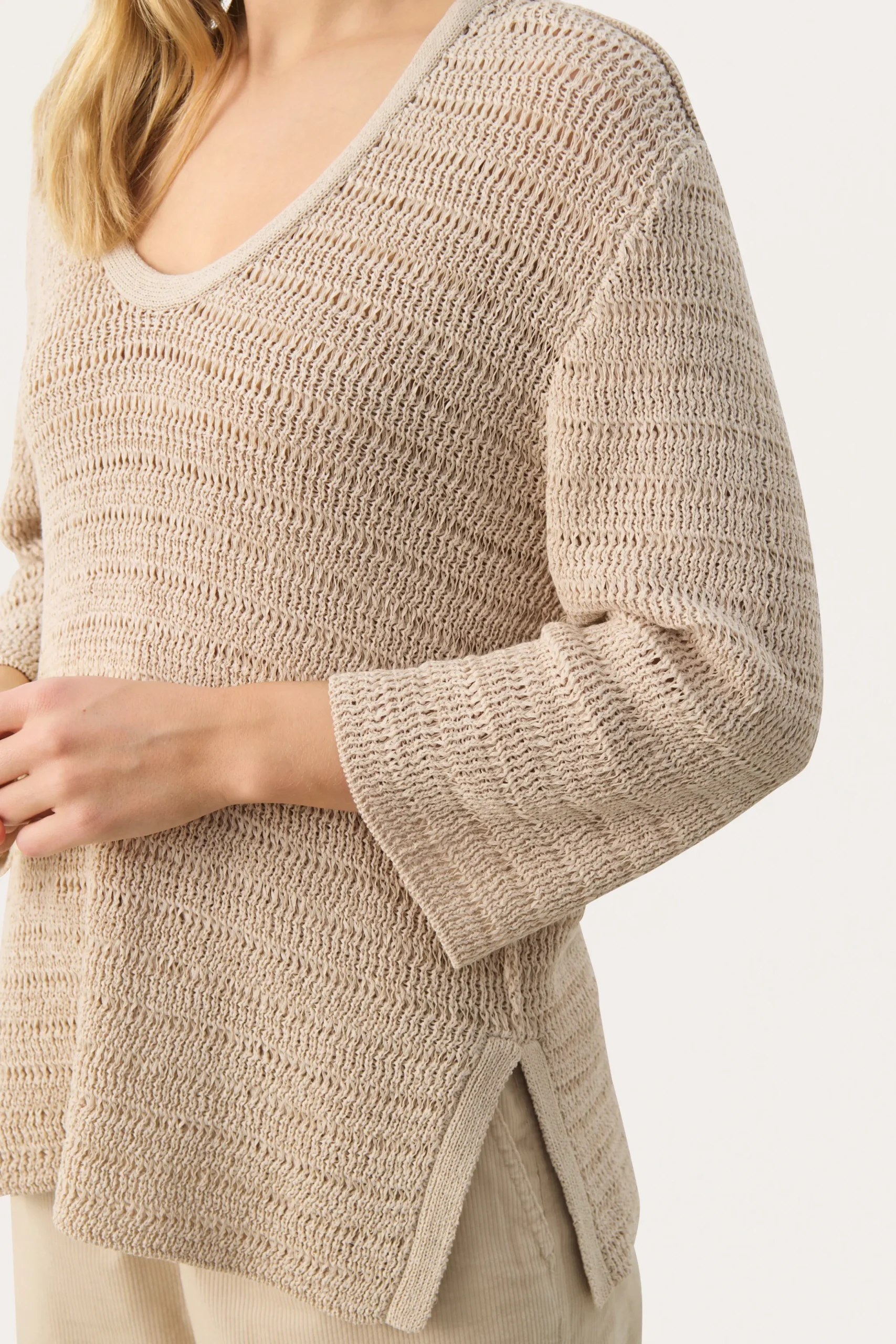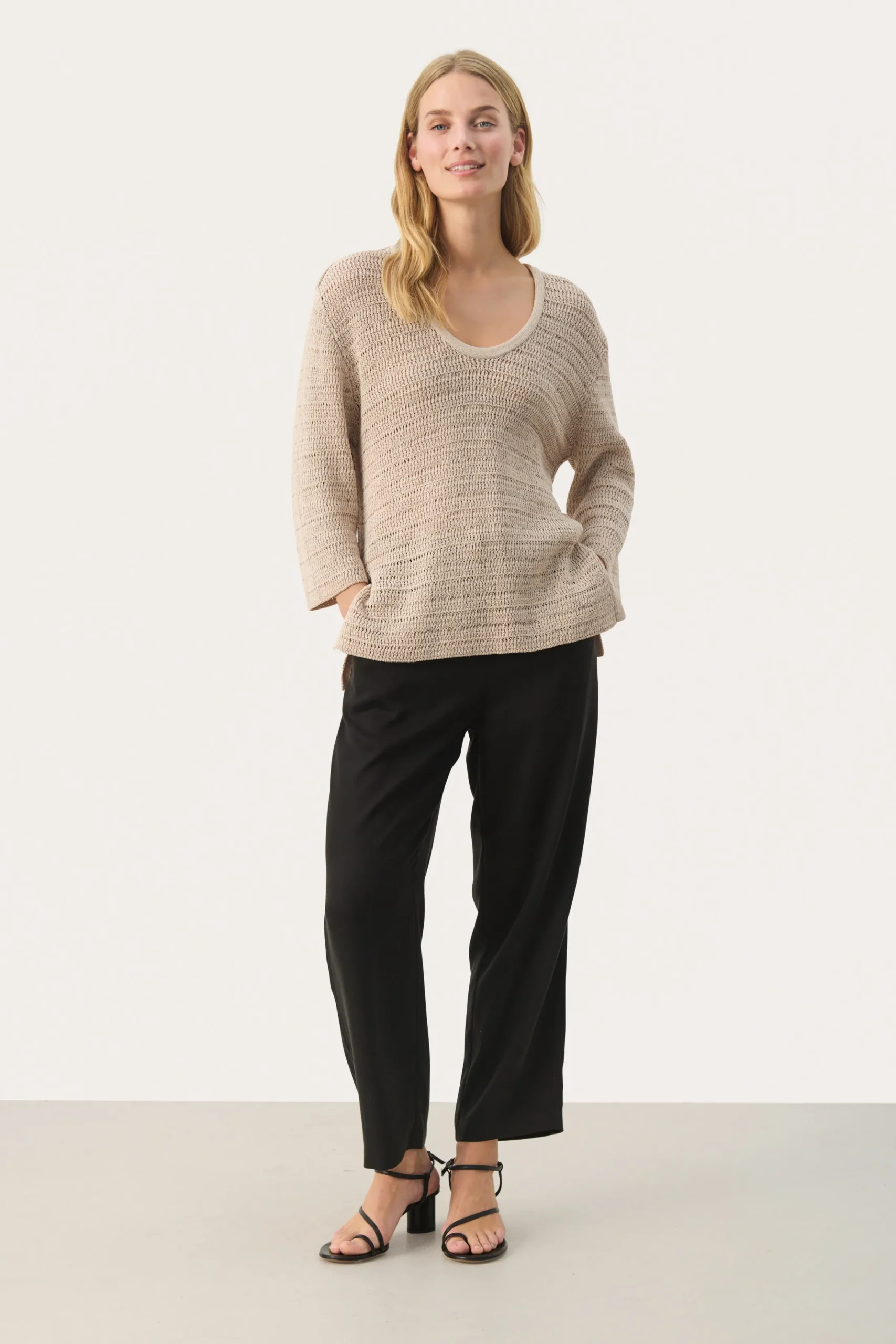 Modellen er 179 cm høj og er iført en størrelse M.\\n\\nDenne strikkede sweater er et must-have til din garderobe. Med sin løse pasform og bløde materiale er den perfekt til både afslappede dage og hyggelige aftener. Style den med løse bukser for et komfortabelt og stilfuldt look.