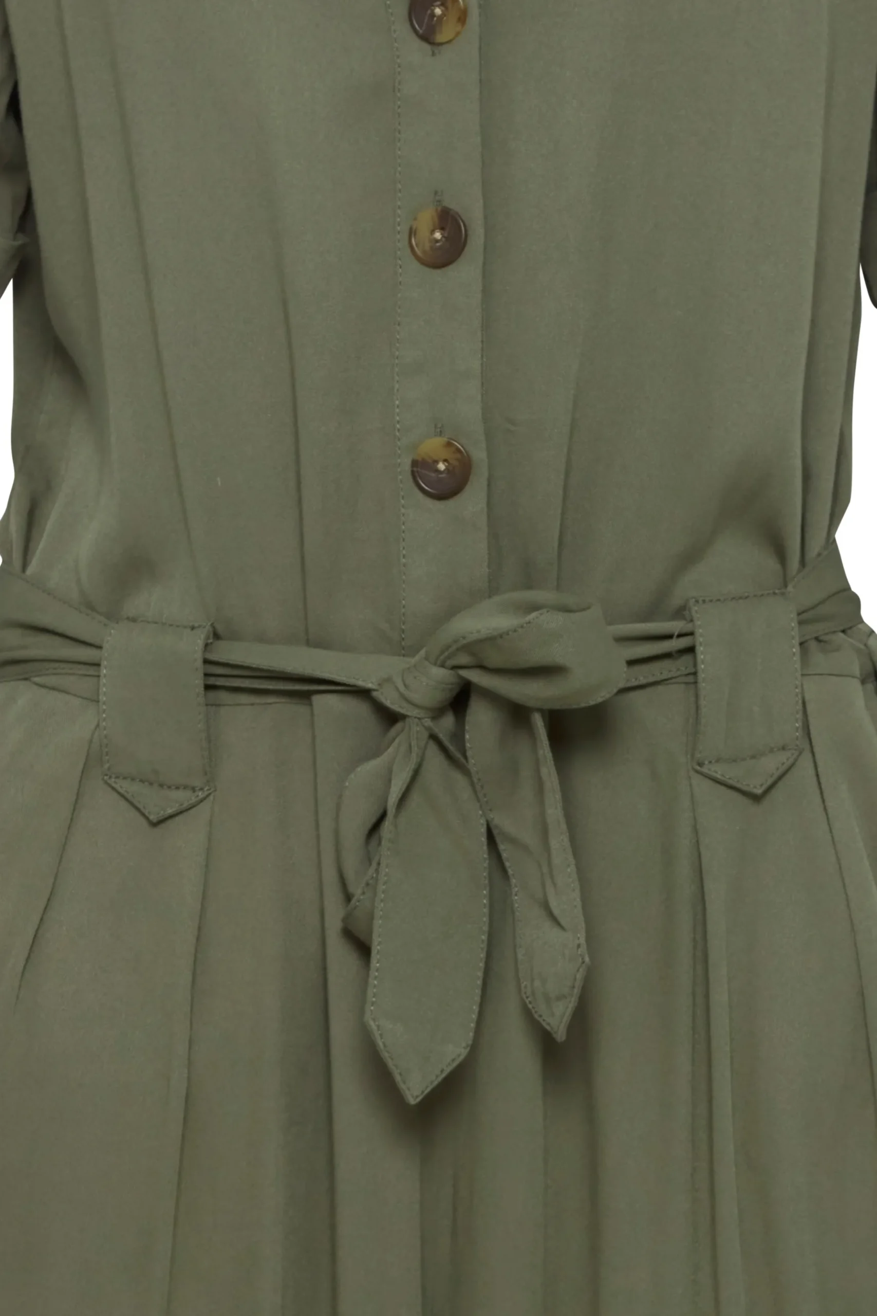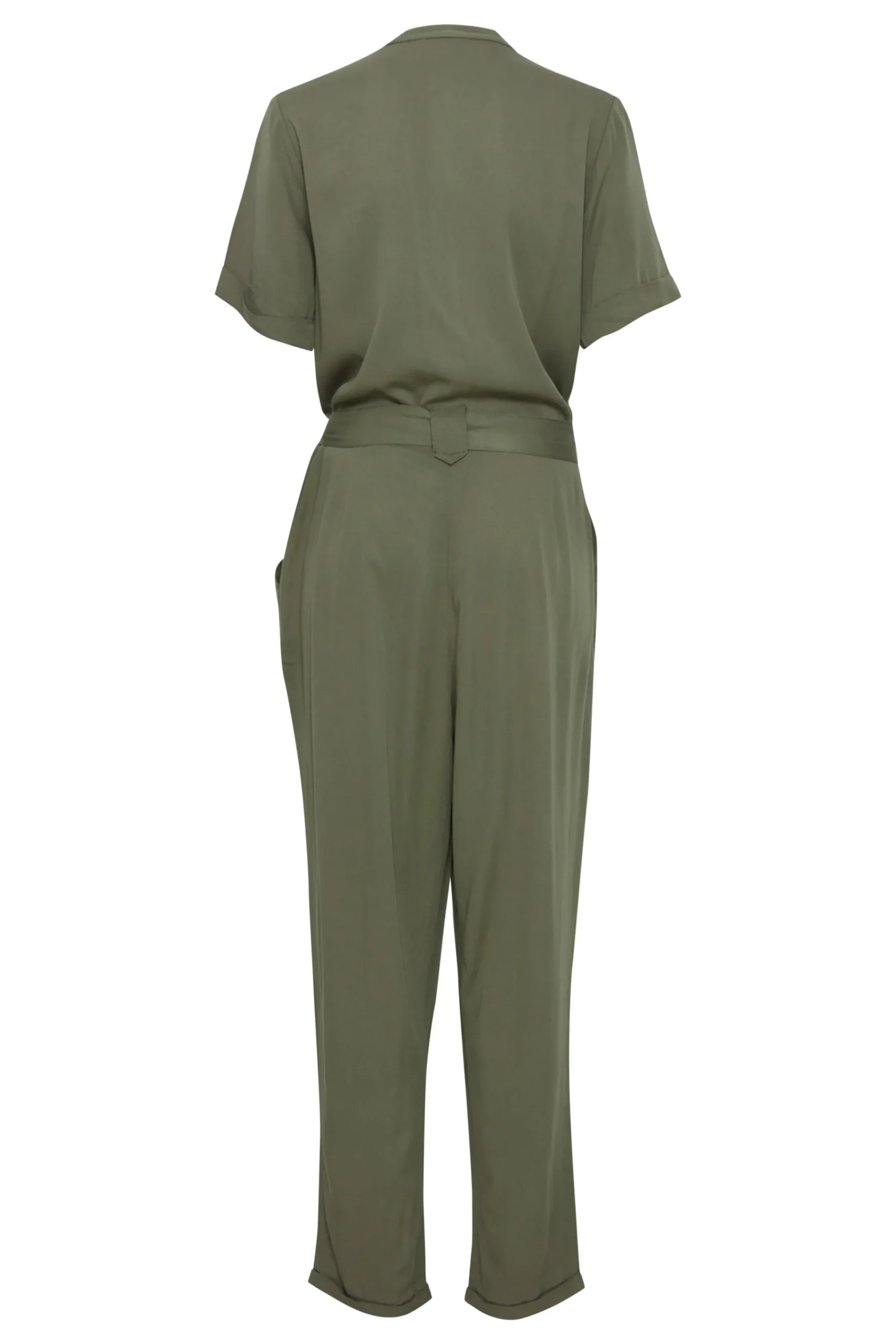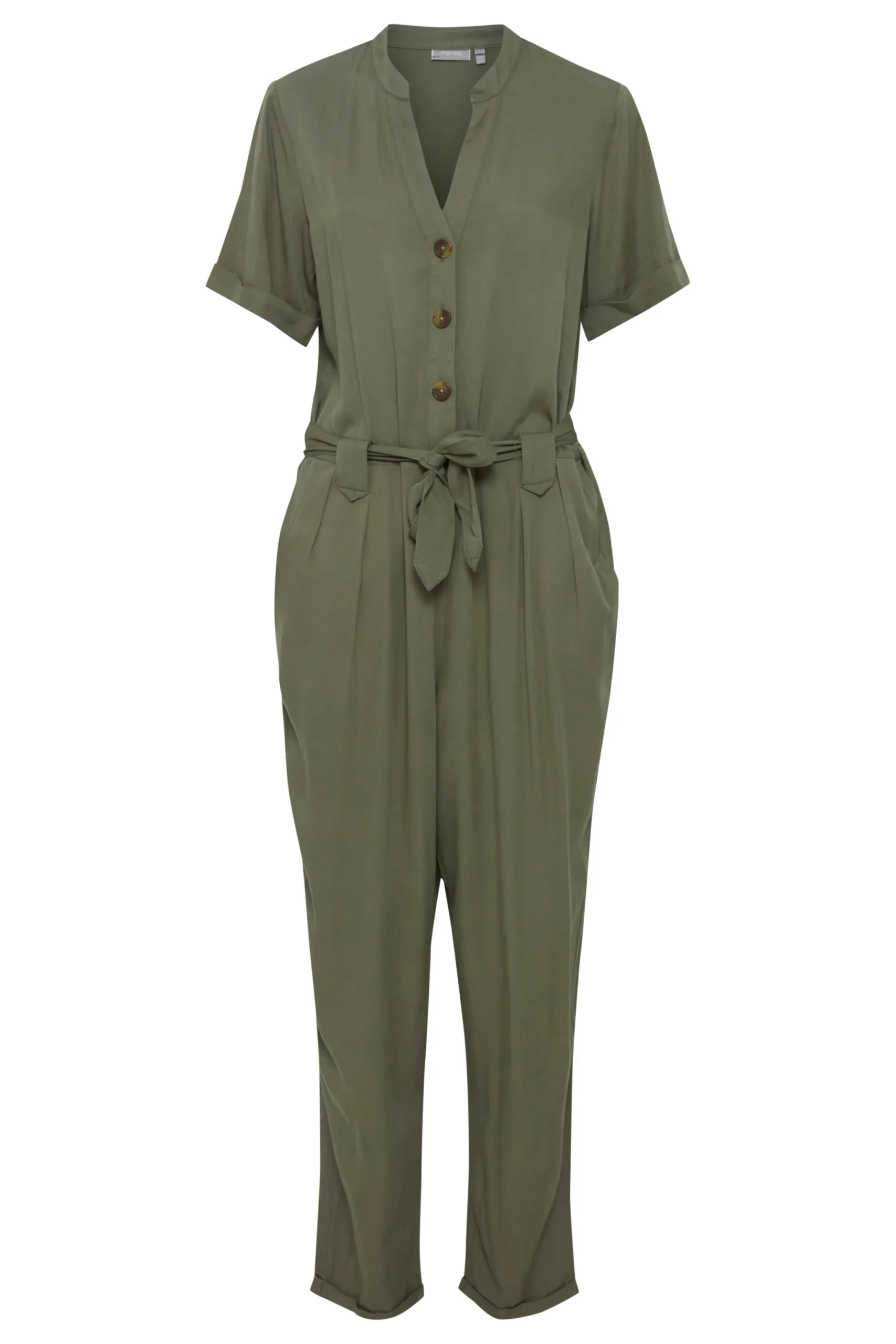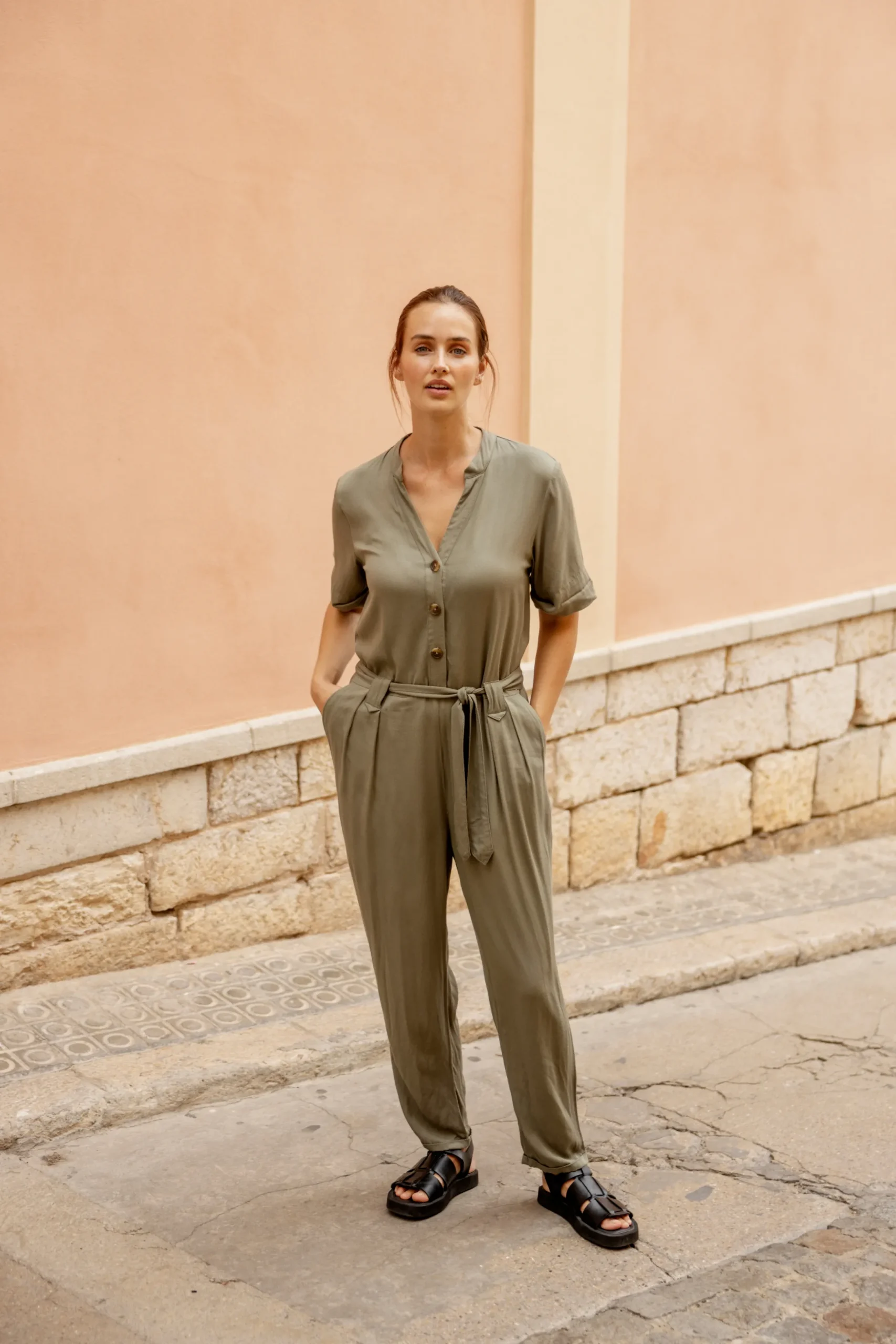 Jumpsuit fra Fransa med rund hals og V-udskæring. Korte ærmer. Synlig knaplukning. Stropper samt bindebælte i taljen. Lommer i siden. Ankellængde. Vævet kvalitet. Normal pasform. \\n