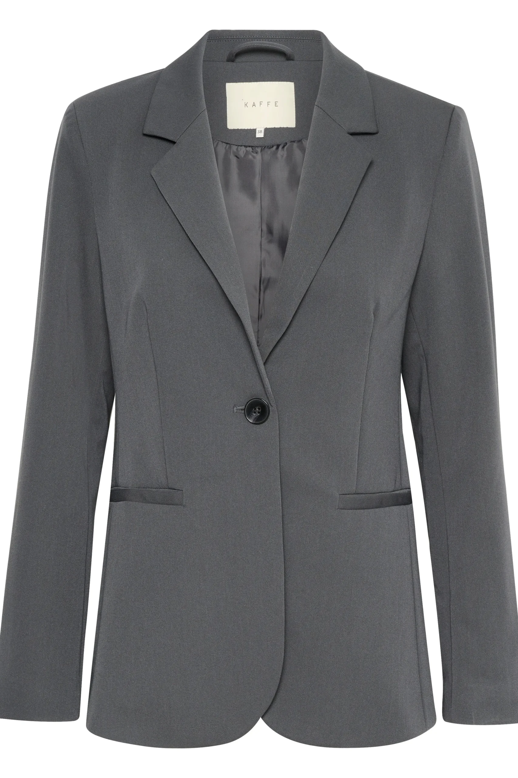 Blazer fra KAFFE med krave og revers. Lange ærmer. Synlig knaplukning. Lommer foran. Vævet twillkvalitet. Tætsiddende pasform.