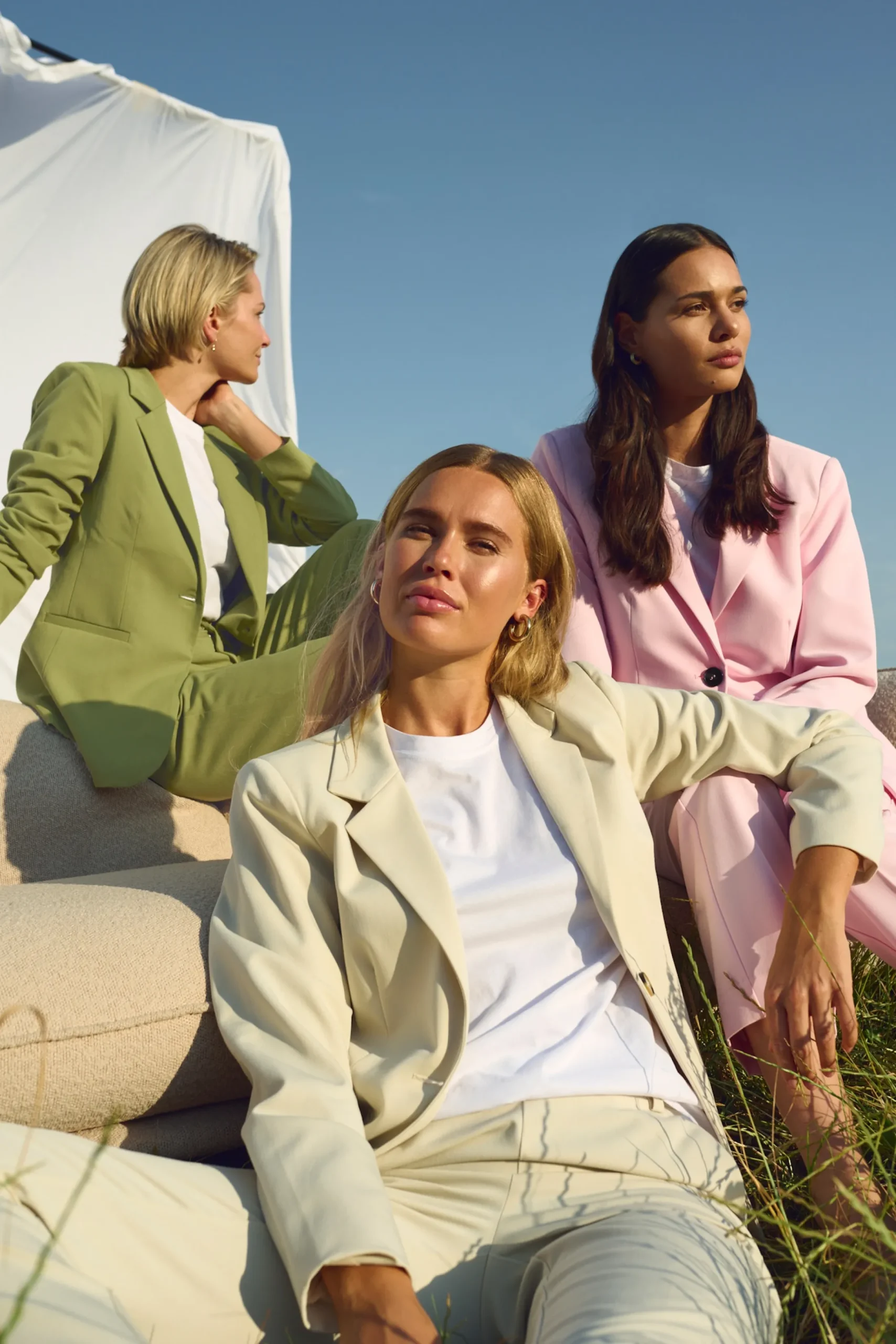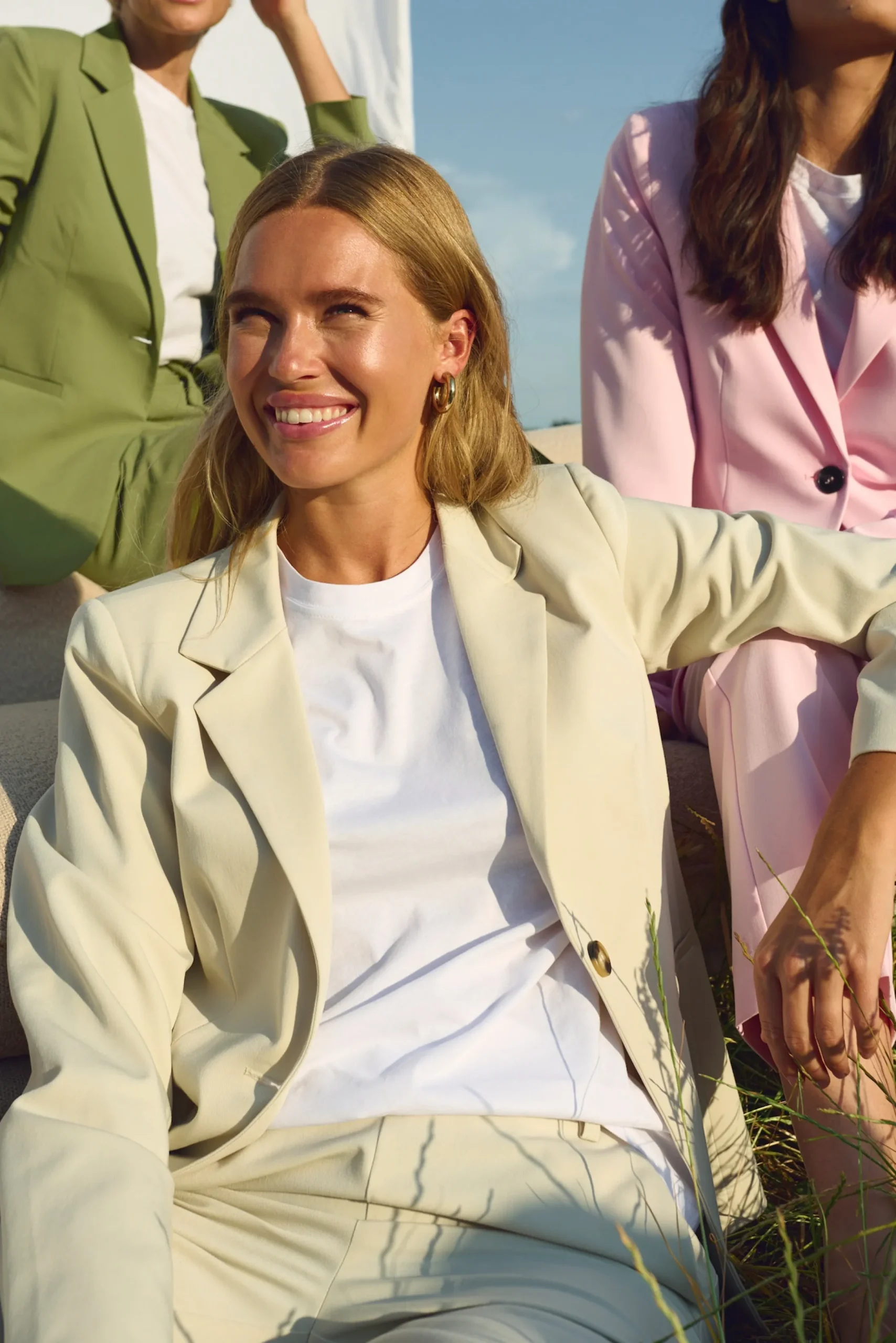Blazer fra KAFFE med krave og revers. Lange ærmer. Synlig knaplukning. Lommer foran. Vævet twillkvalitet. Tætsiddende pasform.