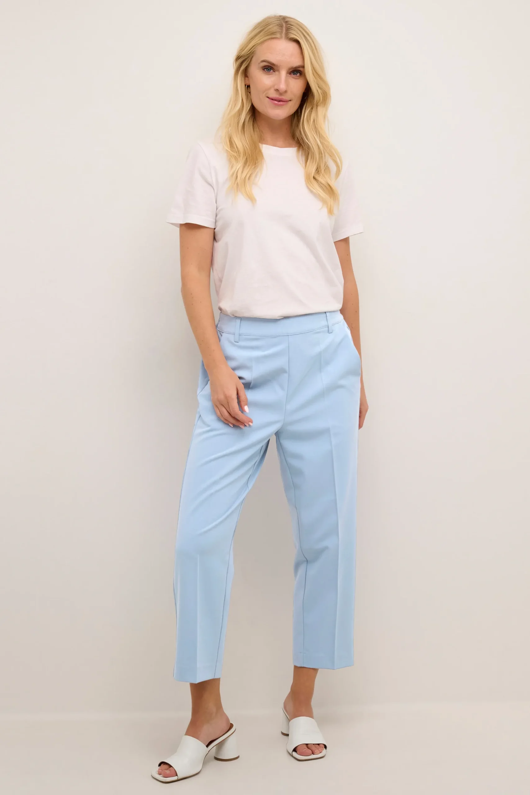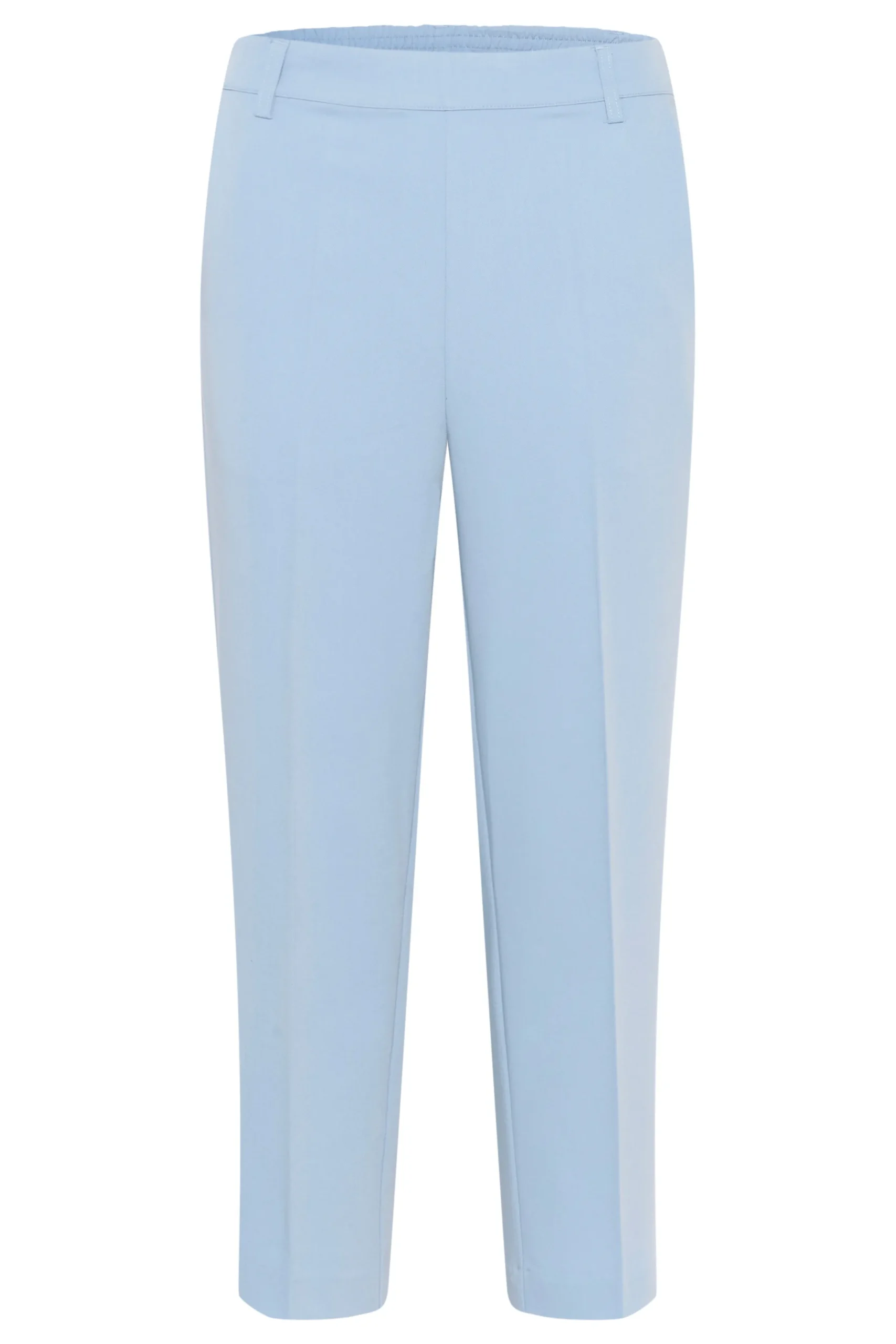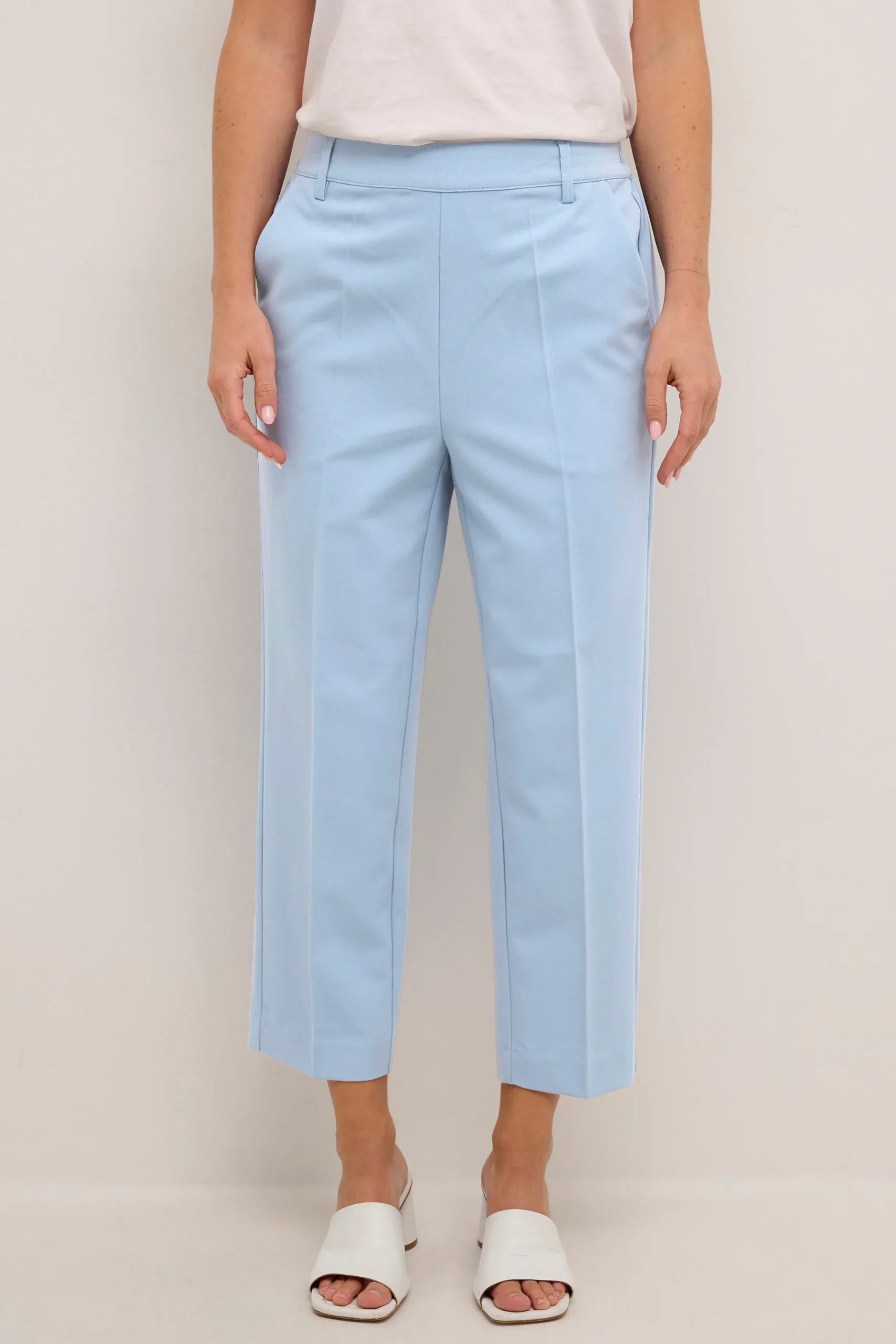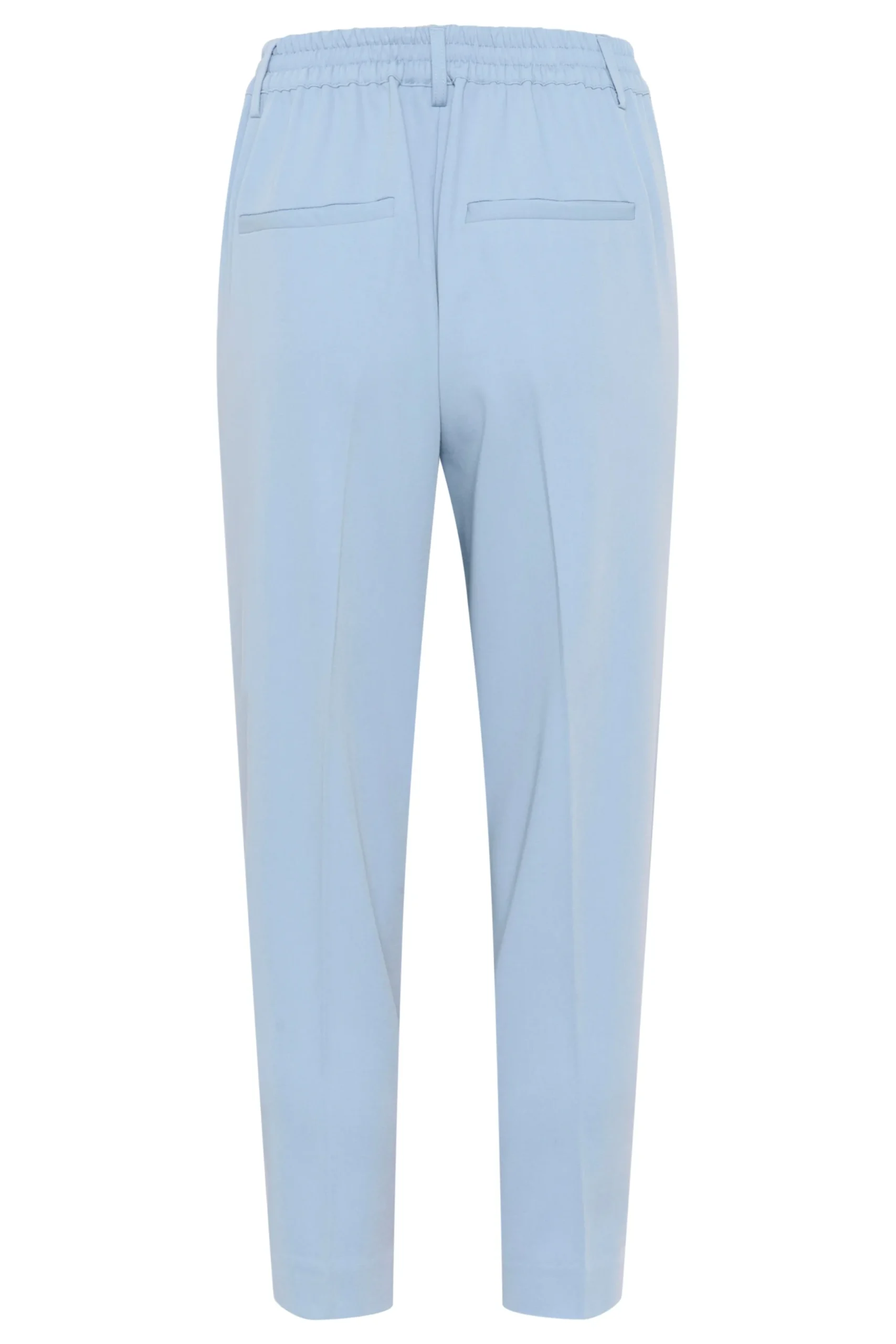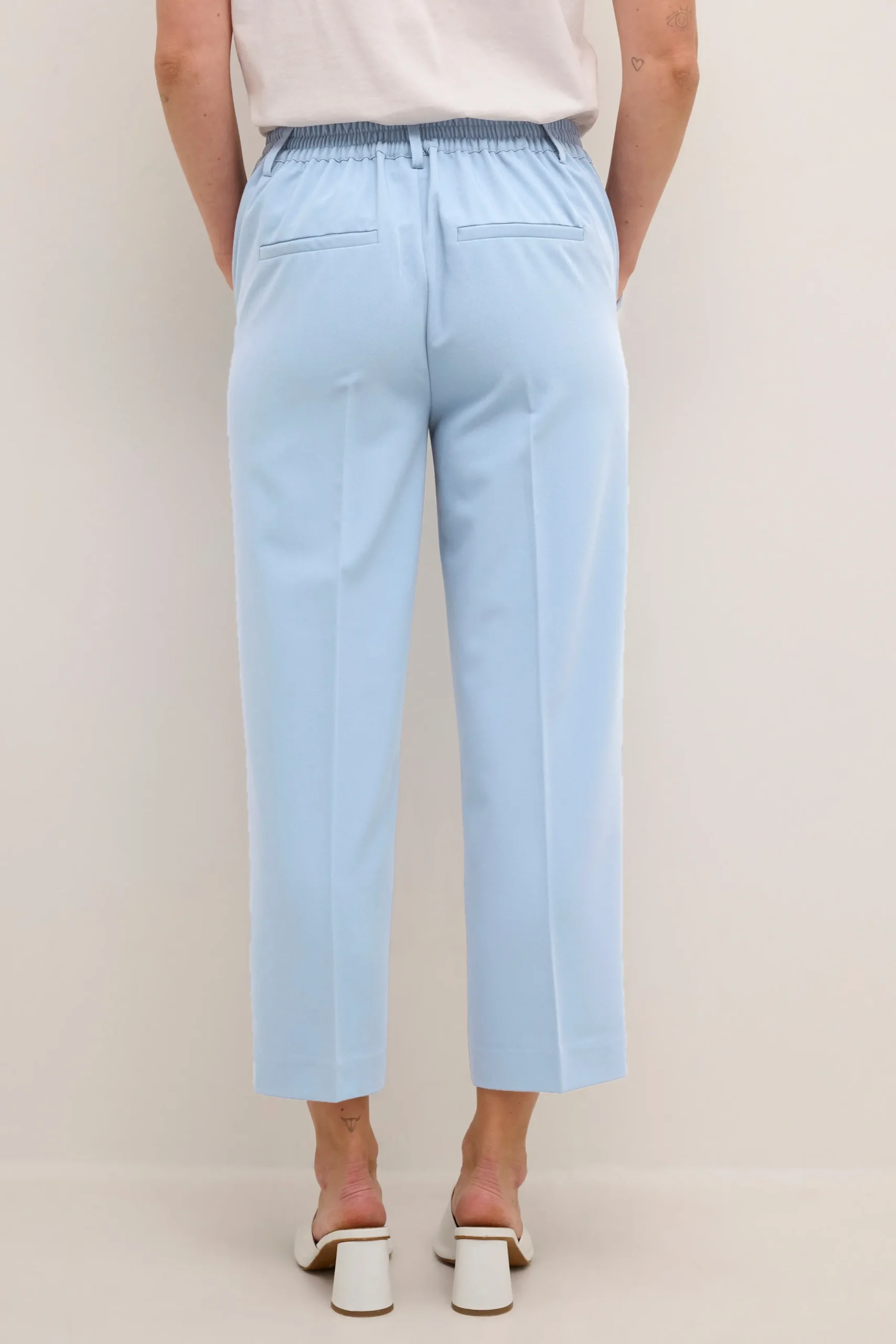 Ankelbuks fra KAFFE med fast linning foran – elastik bagtil. Sidelommer samt paspolerede baglommer. Vævet twillkvalitet. Løstsiddende pasform. Høj talje. Normale ben.