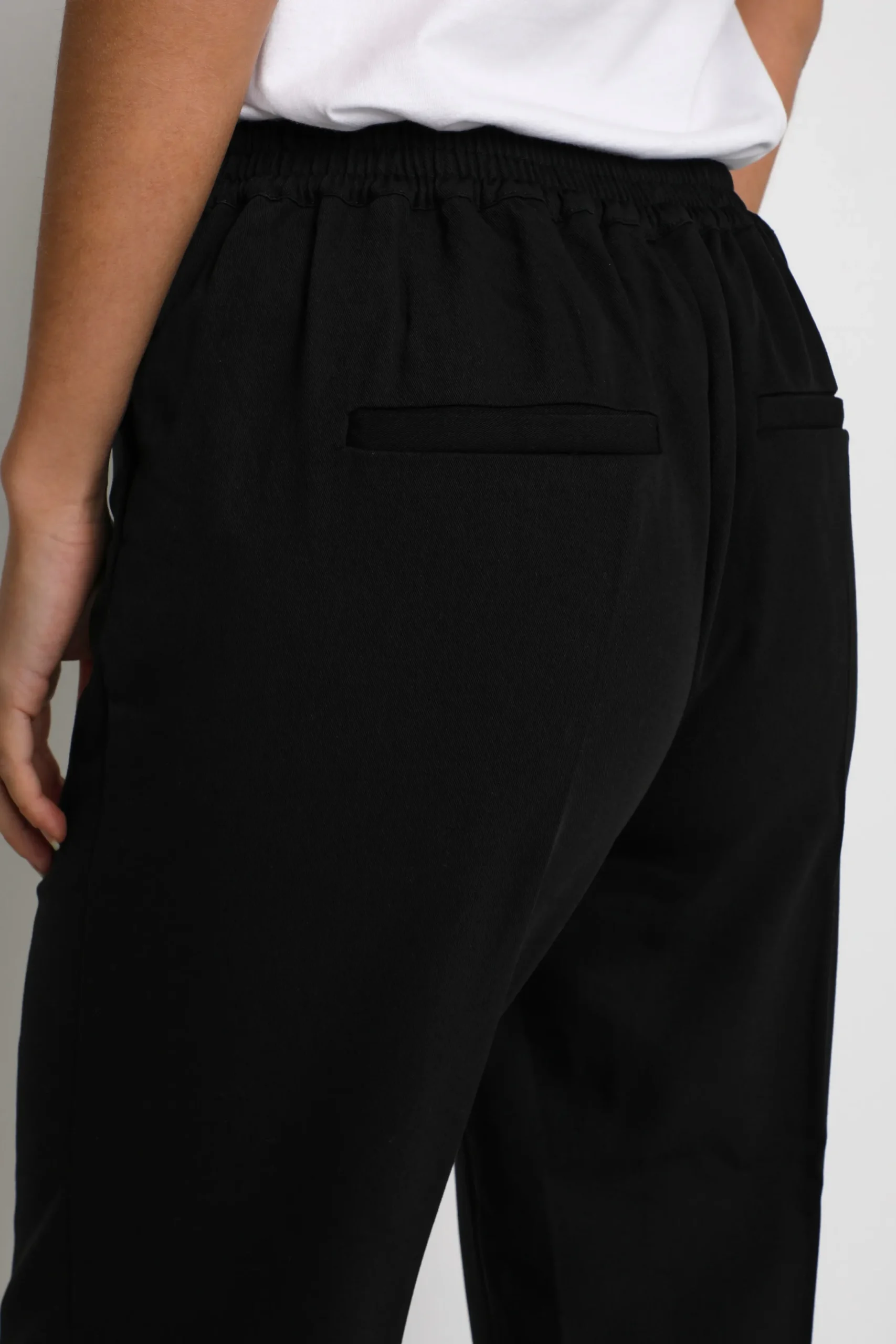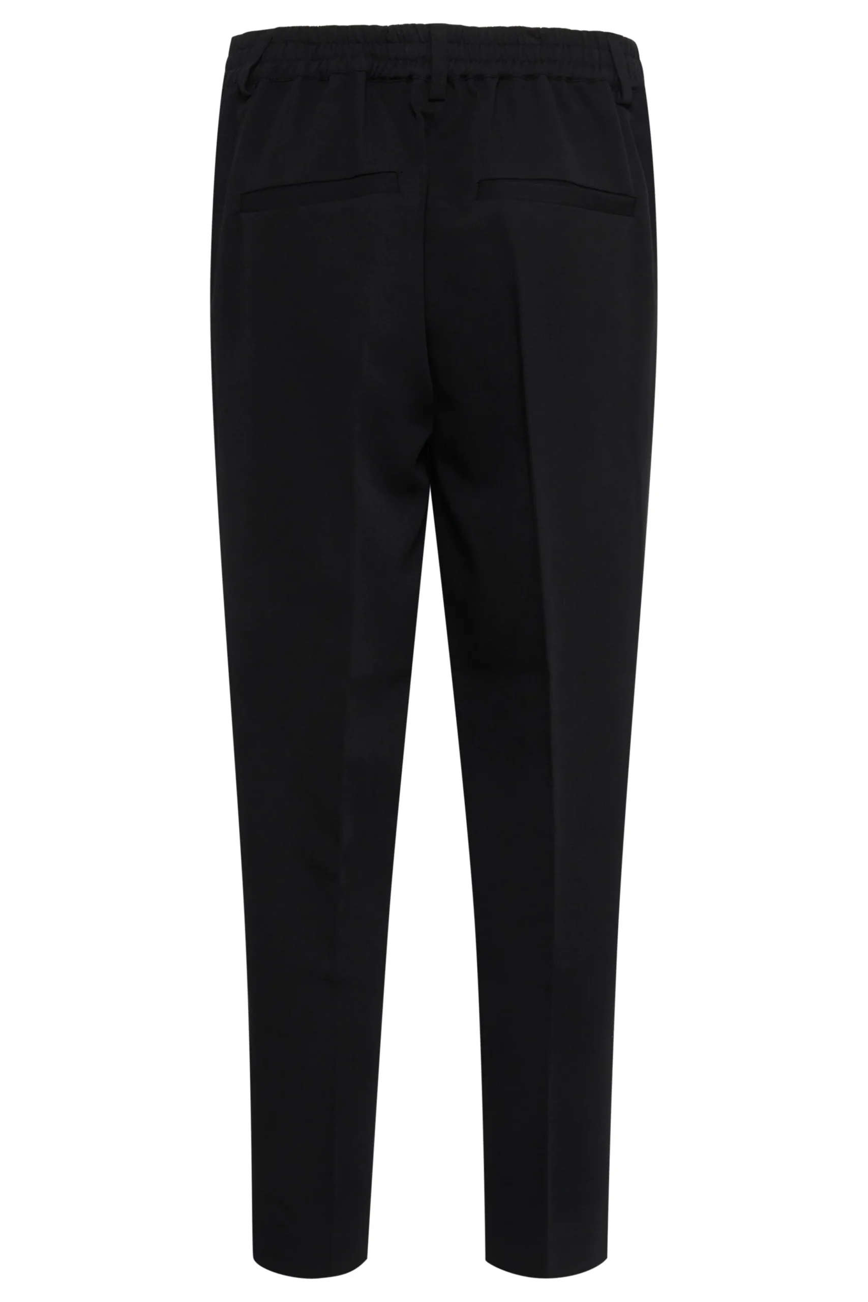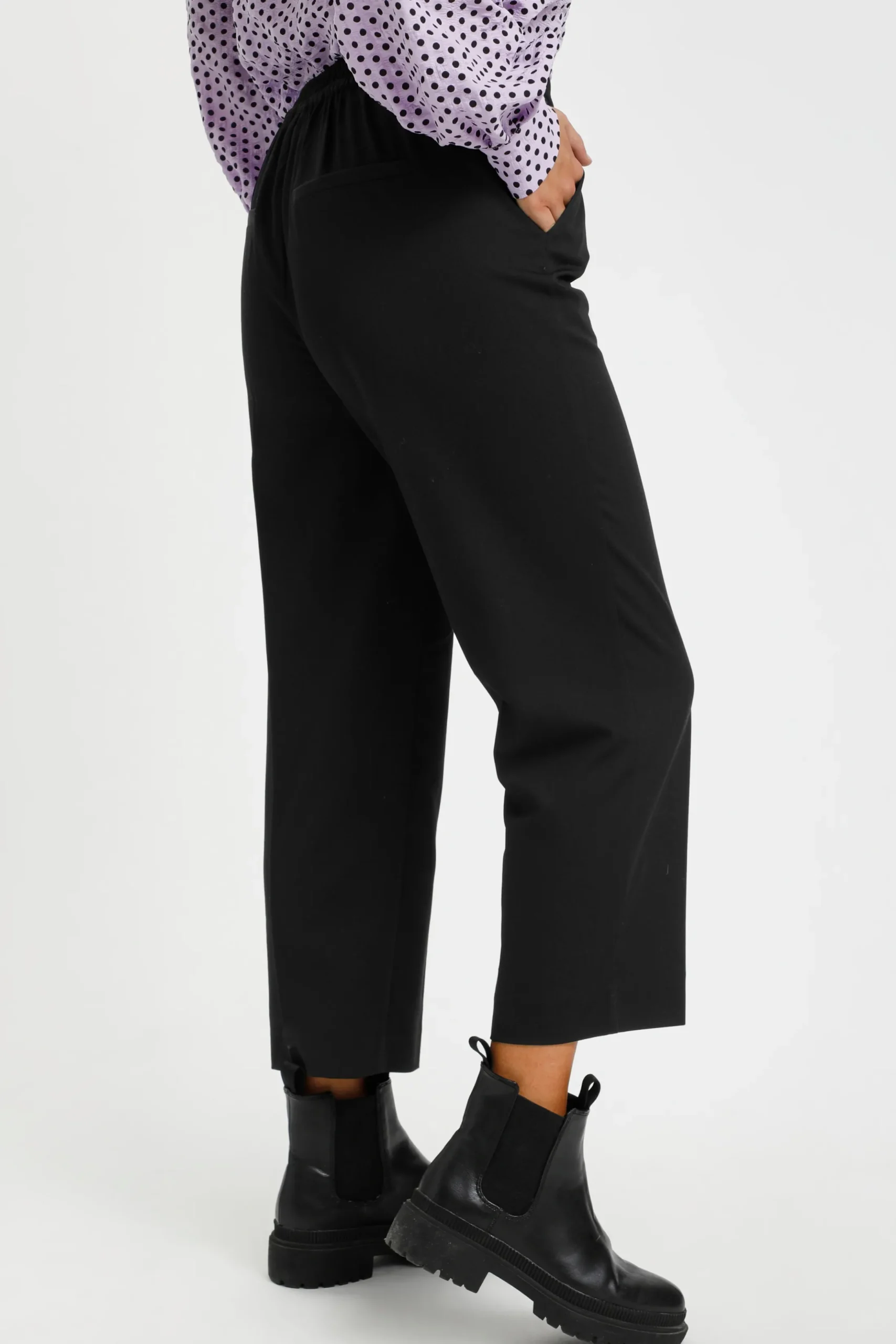 Ankelbuks fra KAFFE med fast linning foran – elastik bagtil. Sidelommer samt paspolerede baglommer. Vævet twillkvalitet. Løstsiddende pasform. Høj talje. Normale ben.