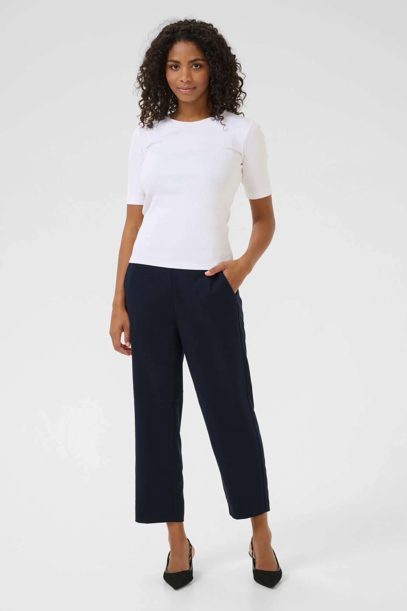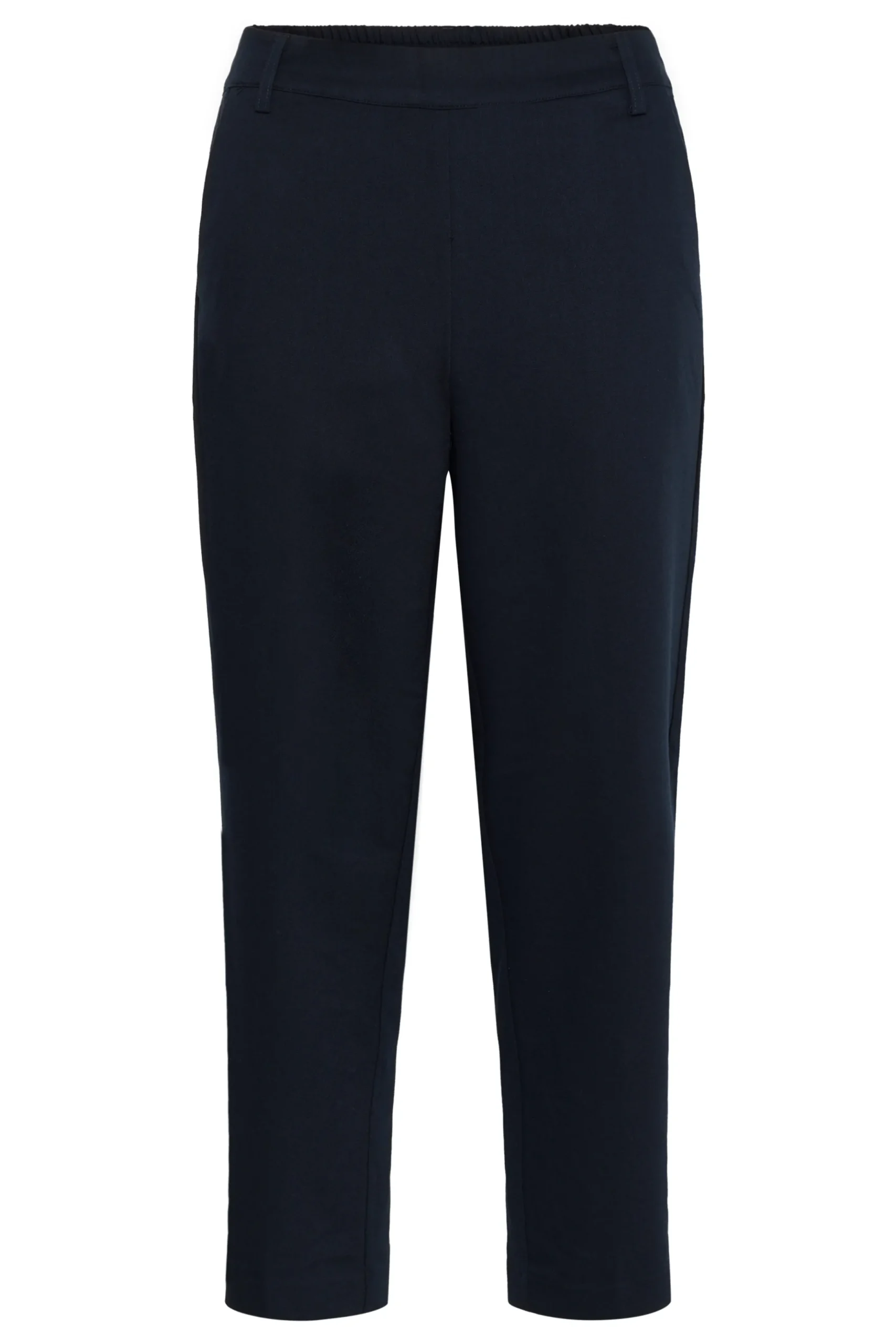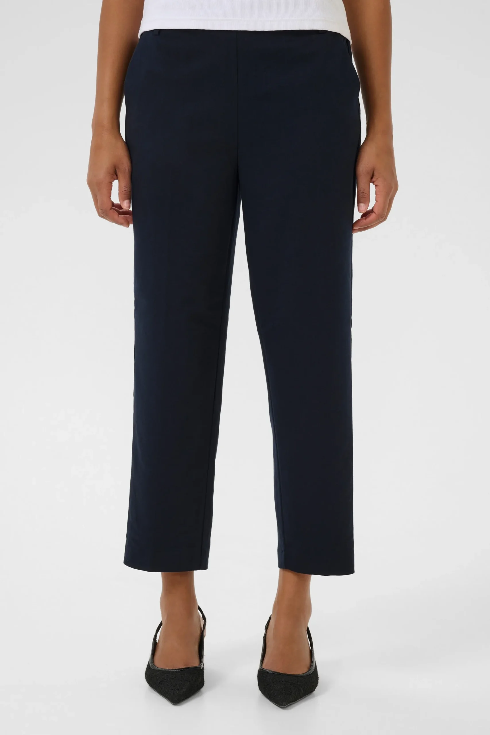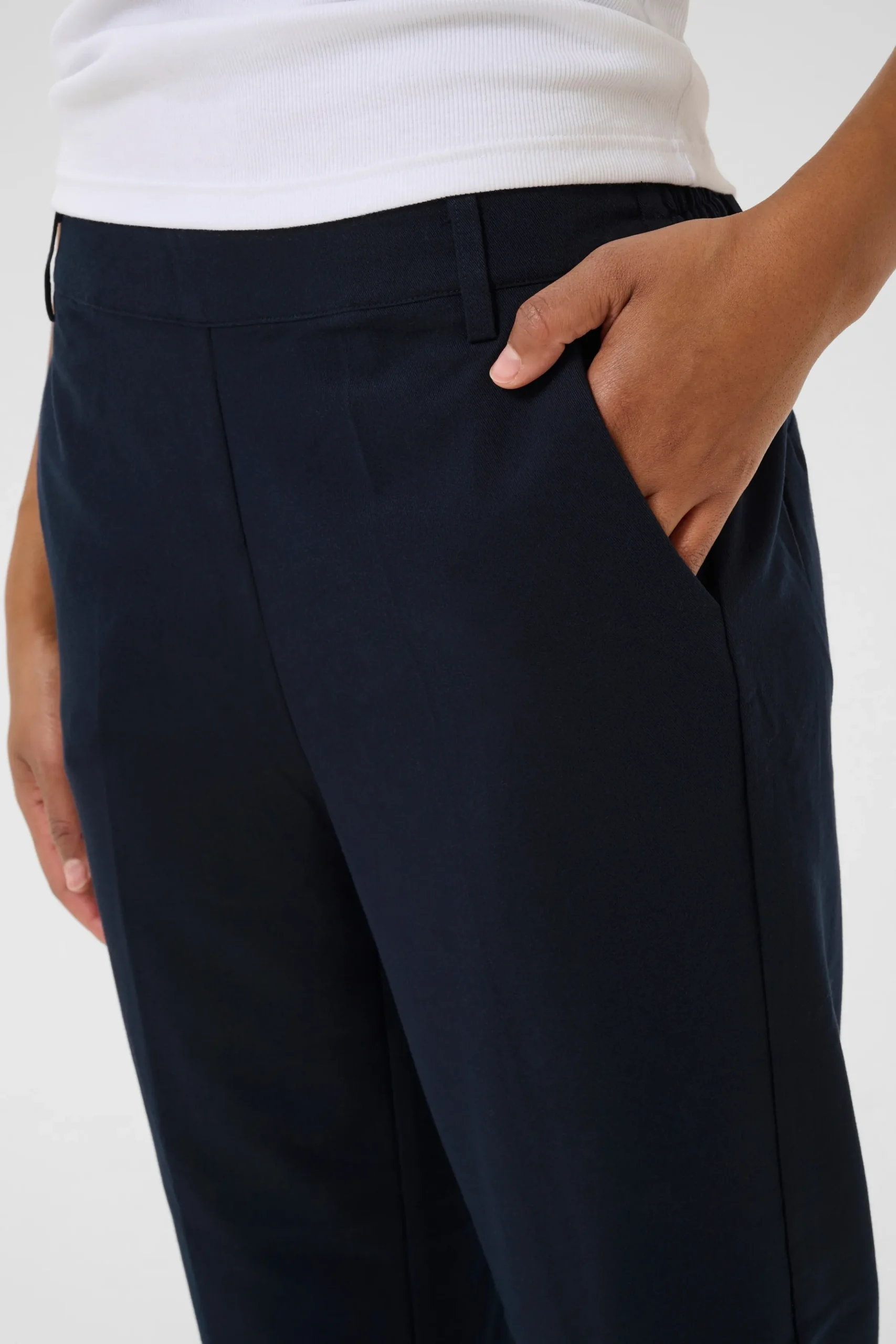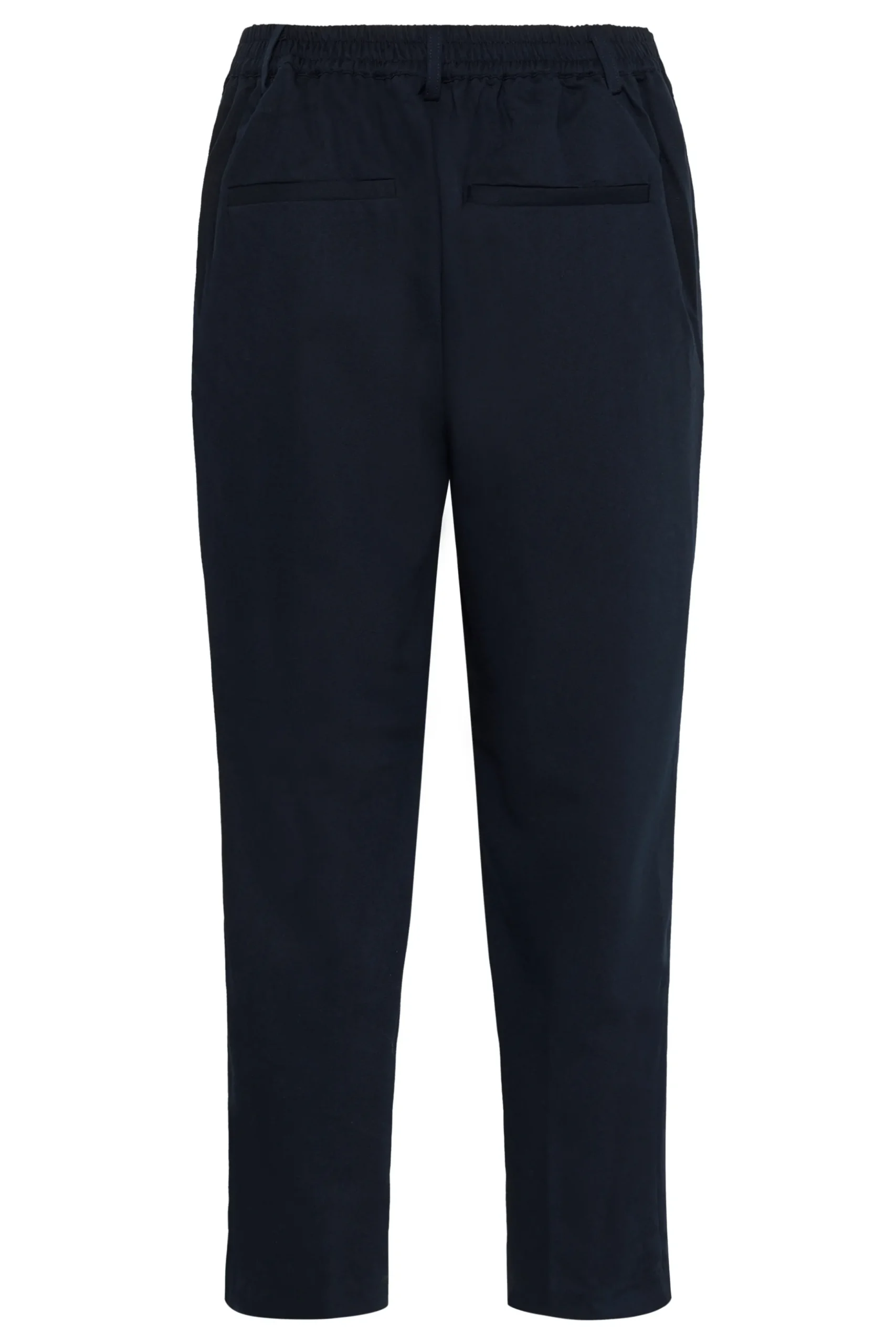 Ankelbuks fra KAFFE med fast linning foran – elastik bagtil. Sidelommer samt paspolerede baglommer. Vævet twillkvalitet. Løstsiddende pasform. Høj talje. Normale ben.