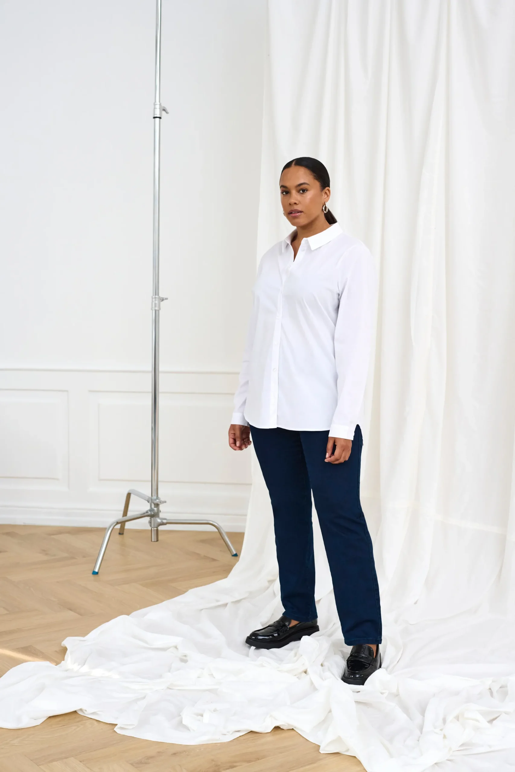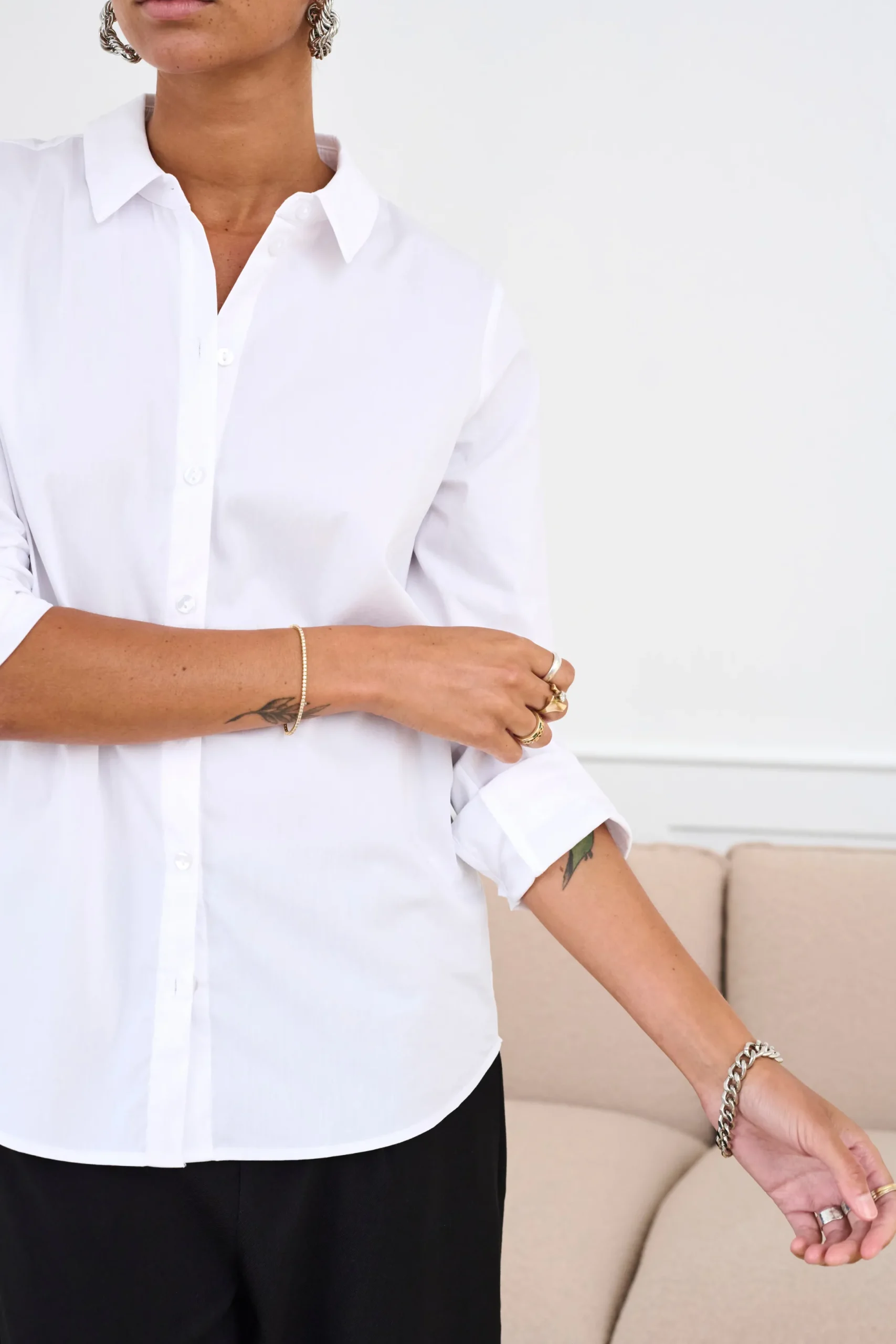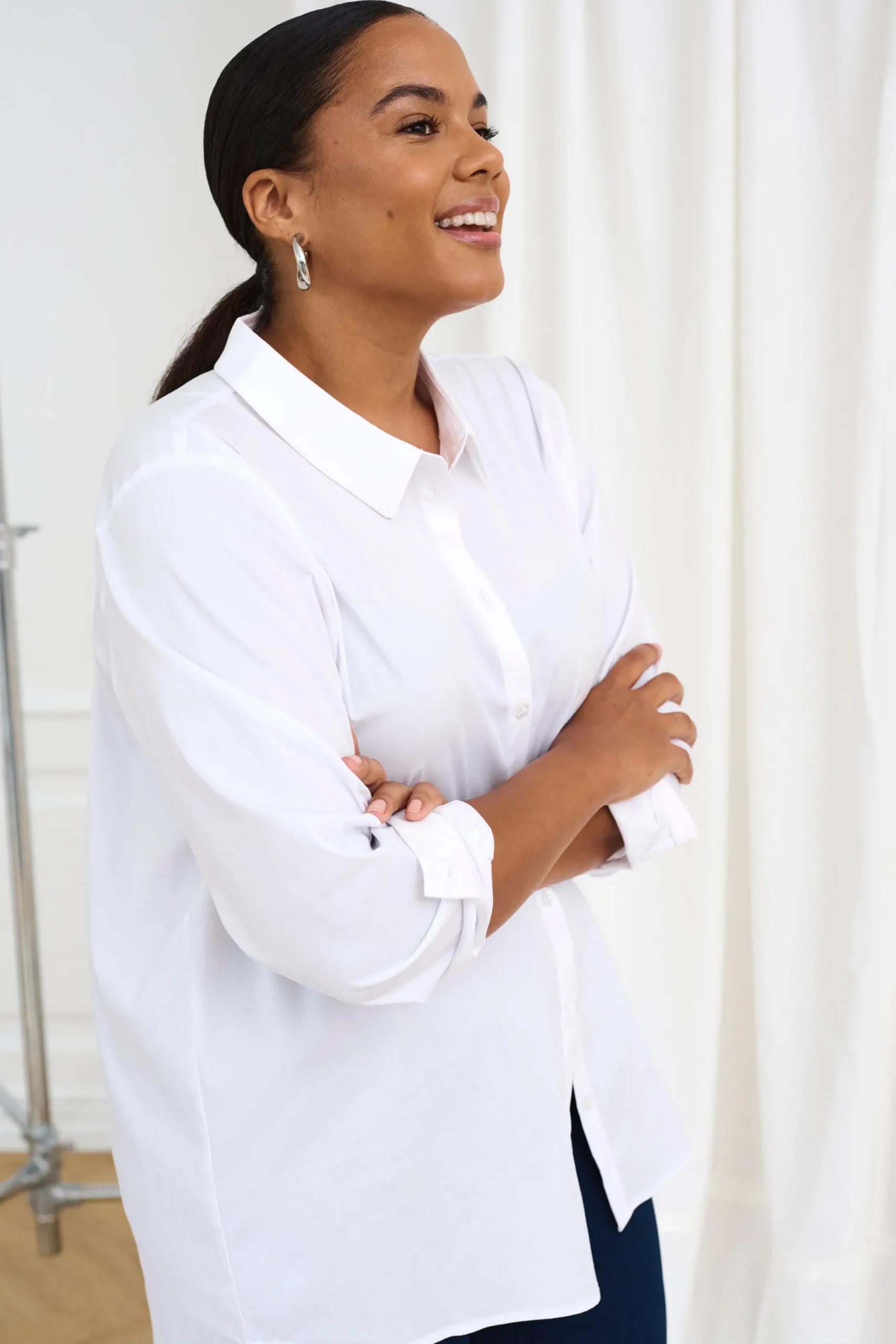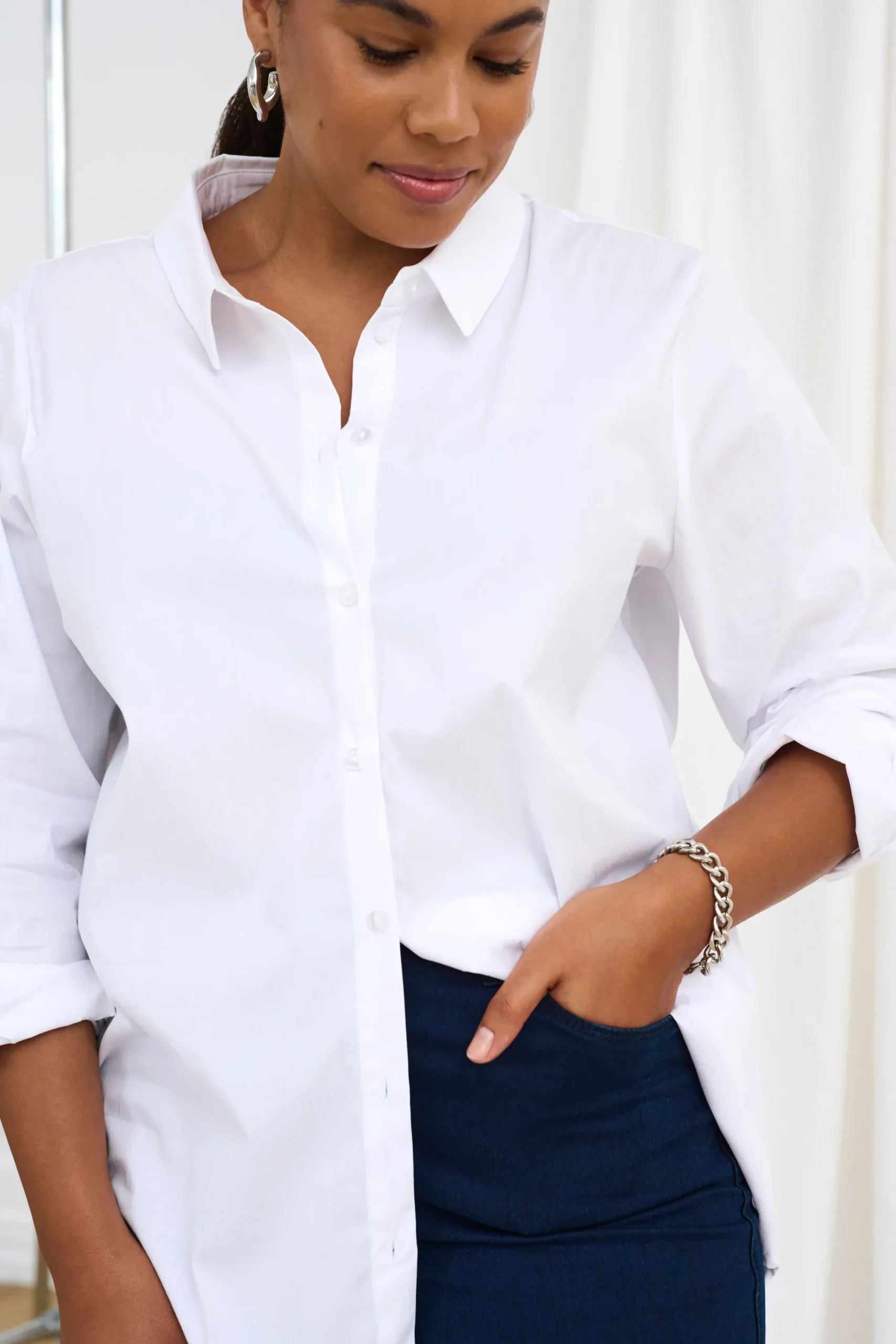Skjorte fra KAFFE med krave. Lange ærmer med slids, manchet og knap. Synlig knaplukning. Afrundet forneden. Længere bagtil end foran. Vævet kvalitet. Skjorten fra KAFFE har normal pasform.