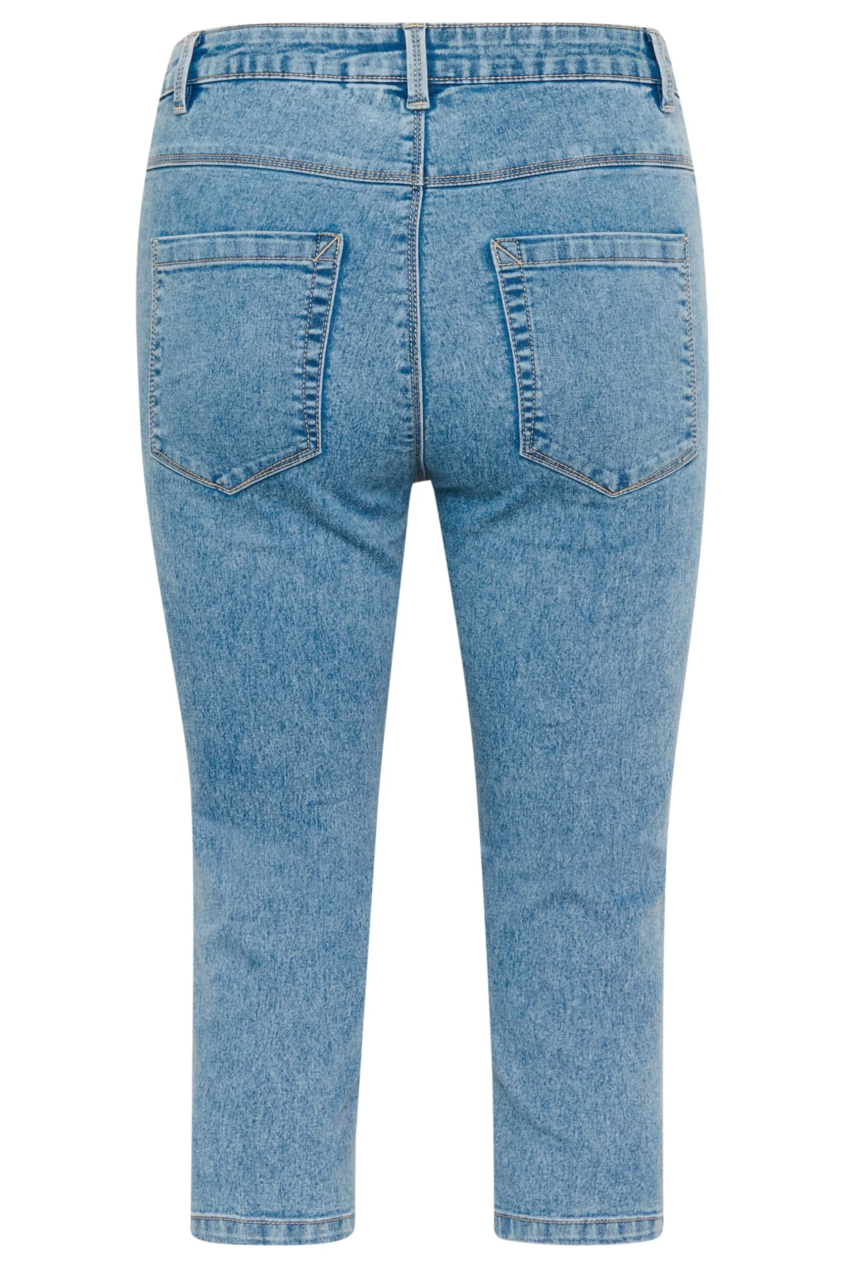 Denim-capribuks fra KAFFE med fast linning, bæltestropper samt knap og lynlåslukning. 5 lommer. Slids forneden. Normal pasform.