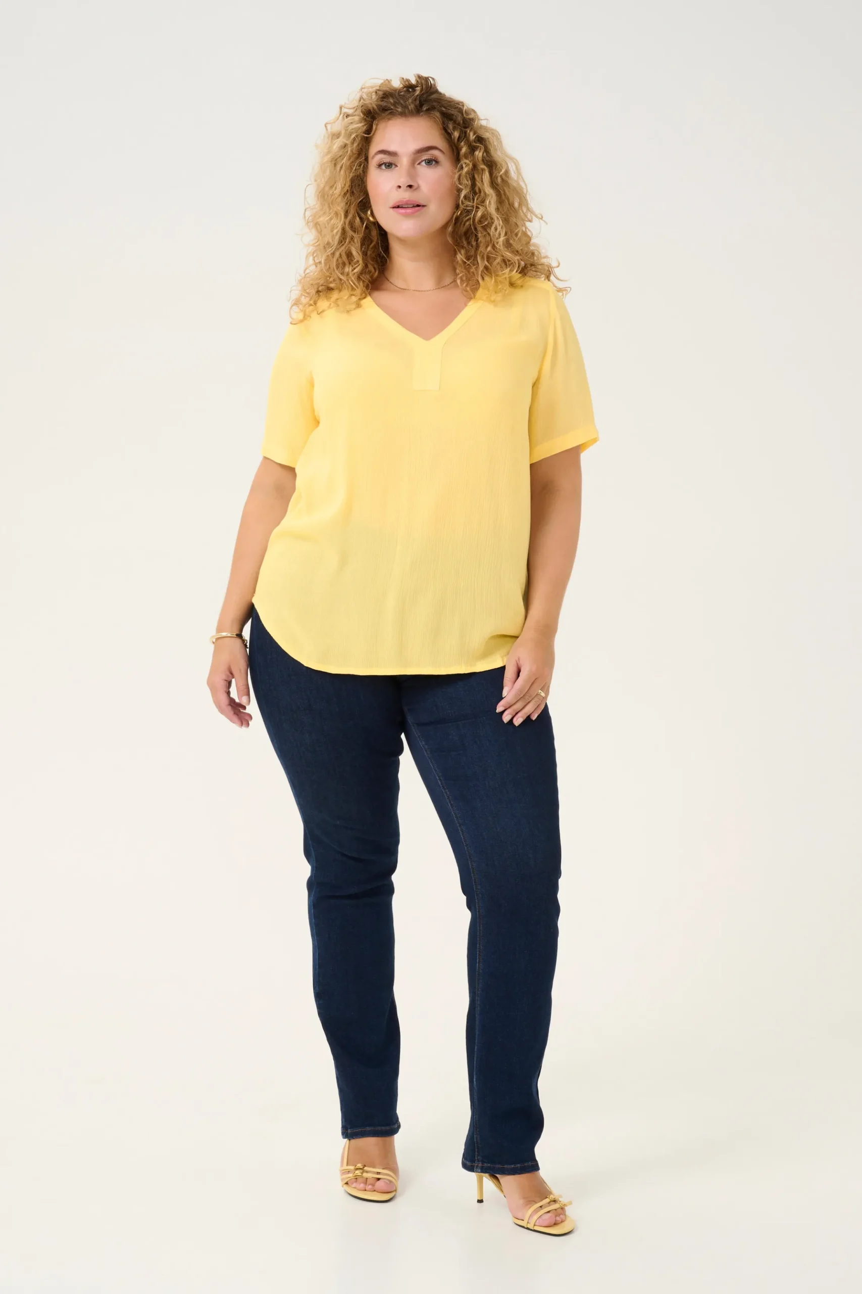 Bluse fra KAFFE CURVE med V-hals. Stolpe foran. Korte ærmer. Afrundet forneden. Vævet crepekvalitet. Blusen fra KAFFE CURVE har normal pasform.
