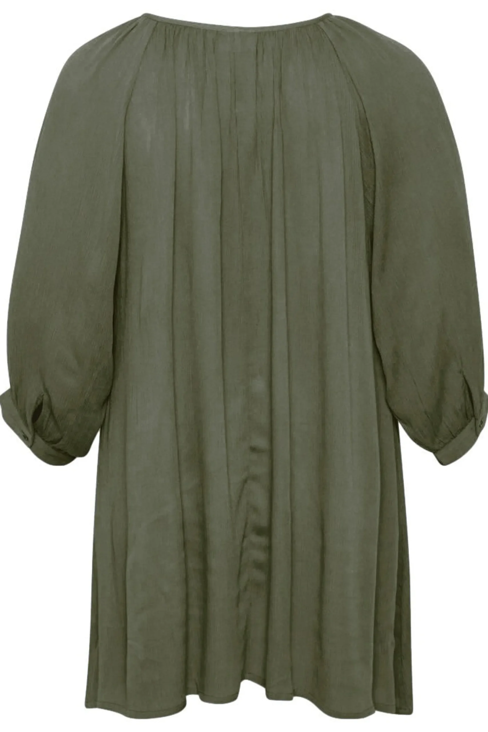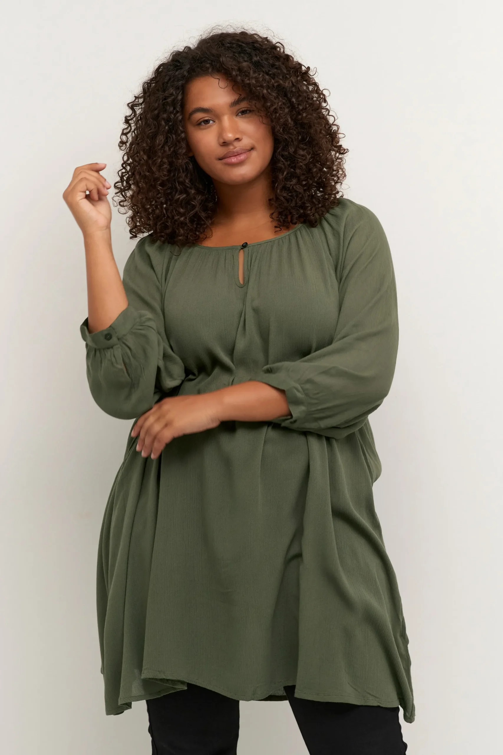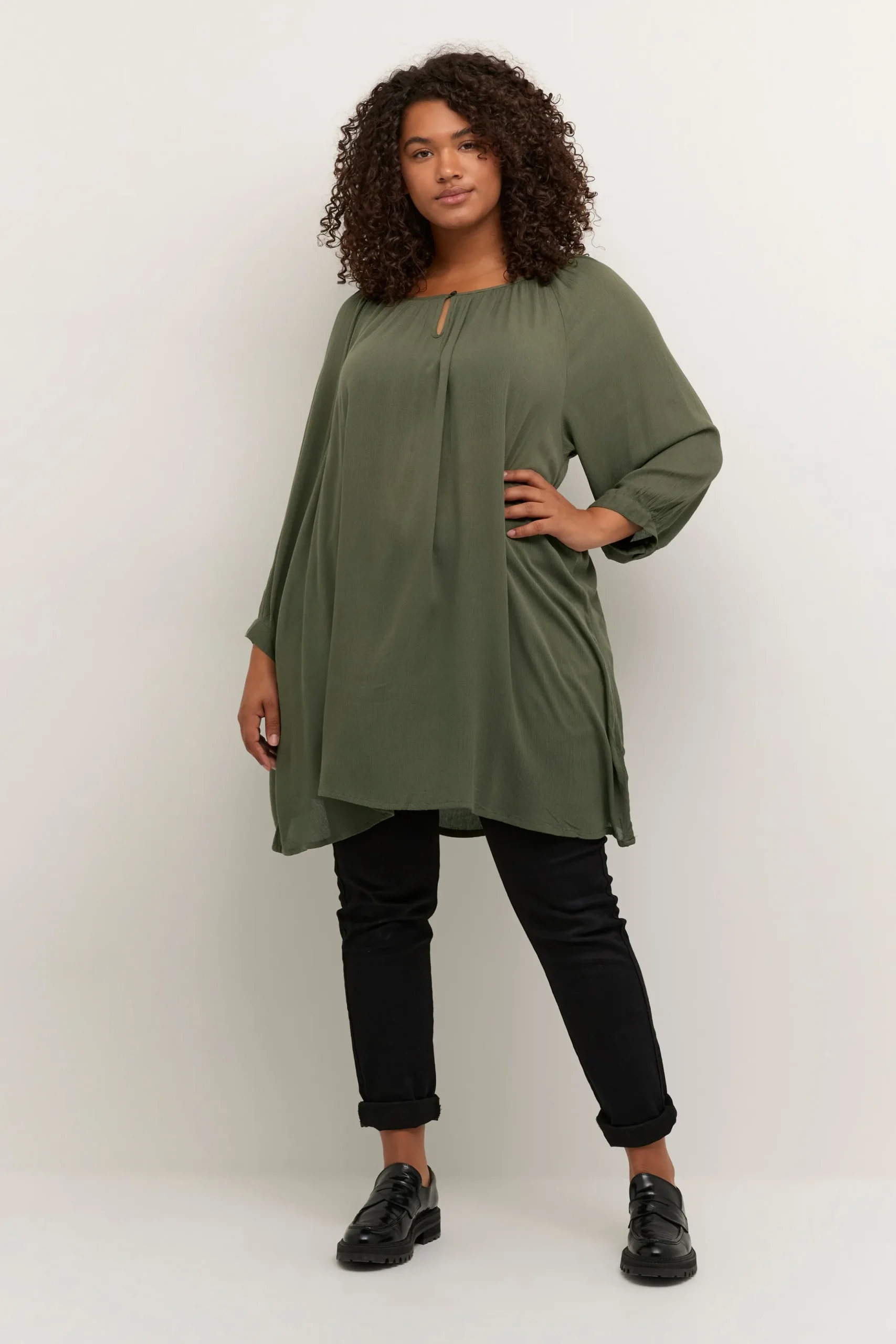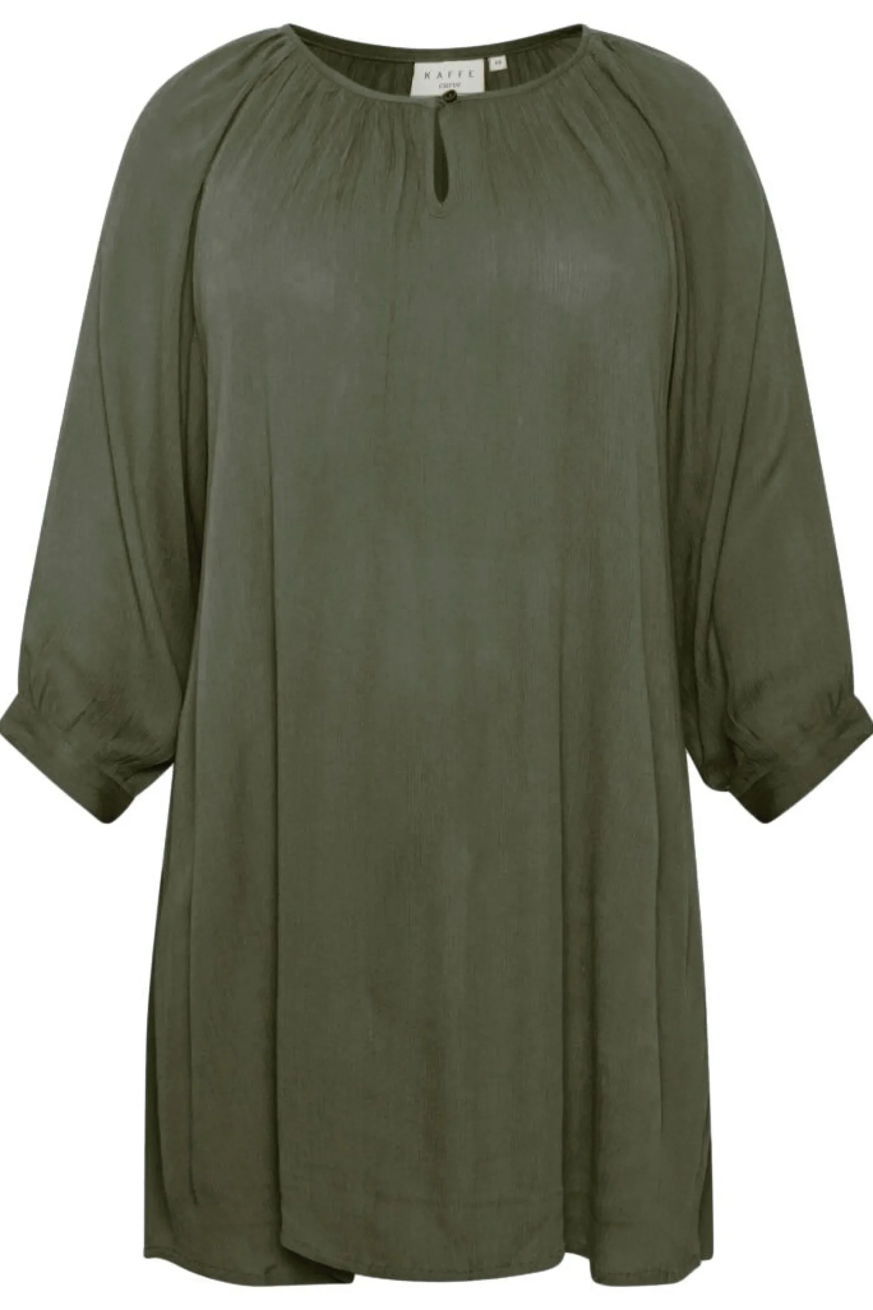 Tunika fra KAFFE med rund hals. 3/4-ærmer. Slids og knap i hals samt ærmer. Vævet kvalitet. Tunikaen fra KAFFE har normal pasform.