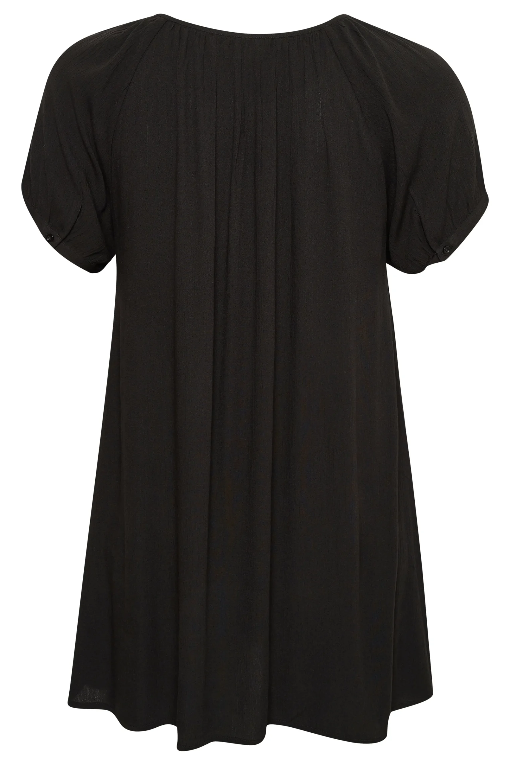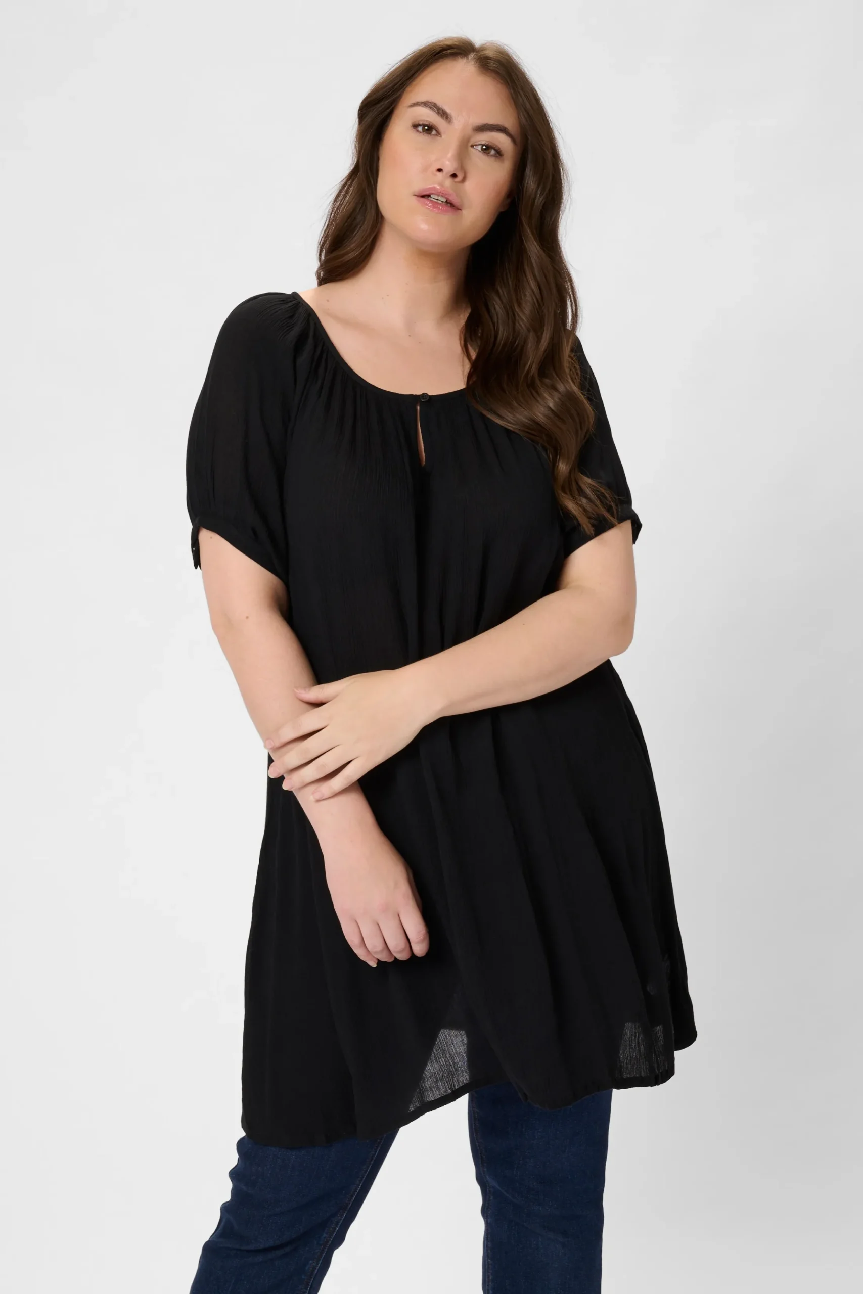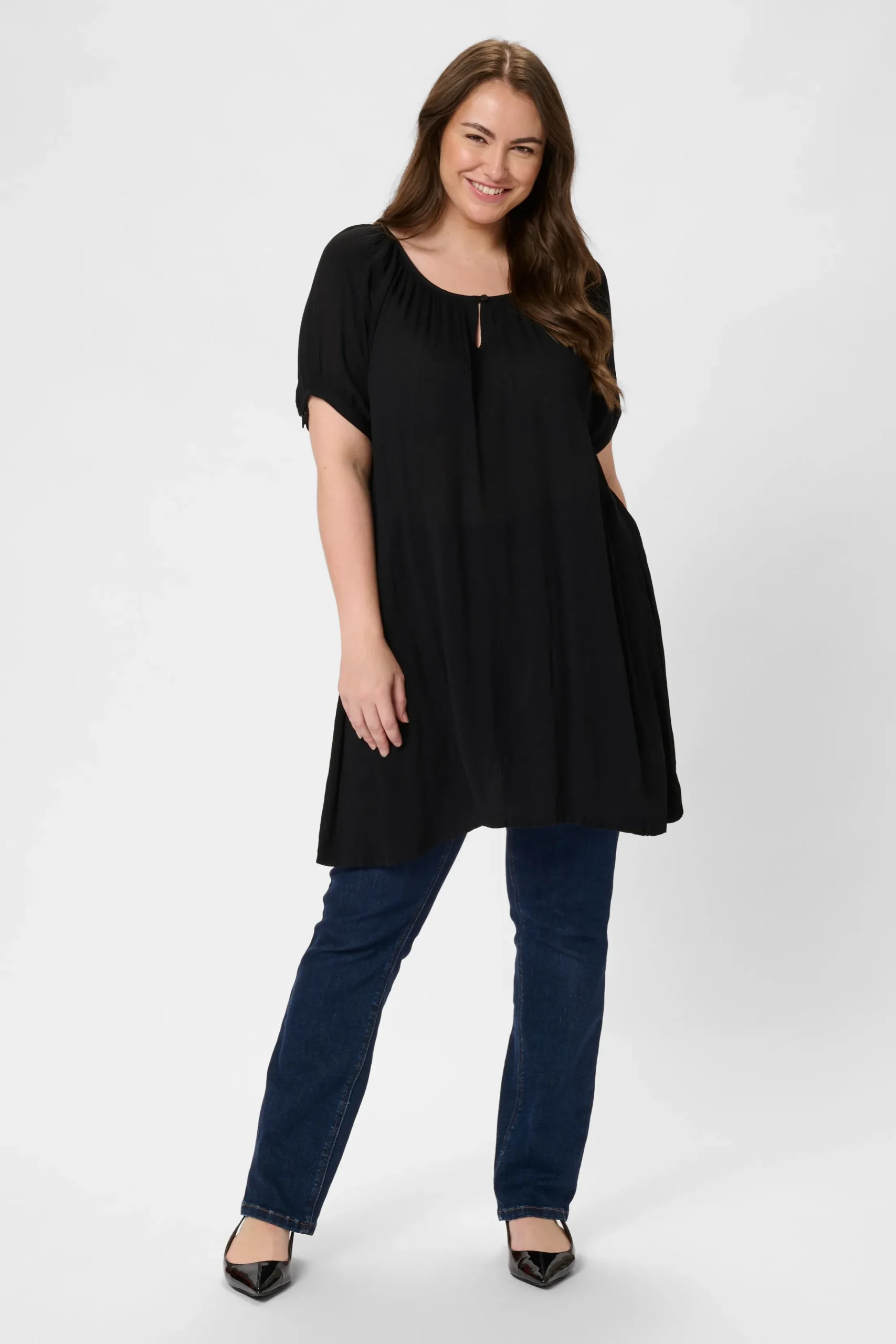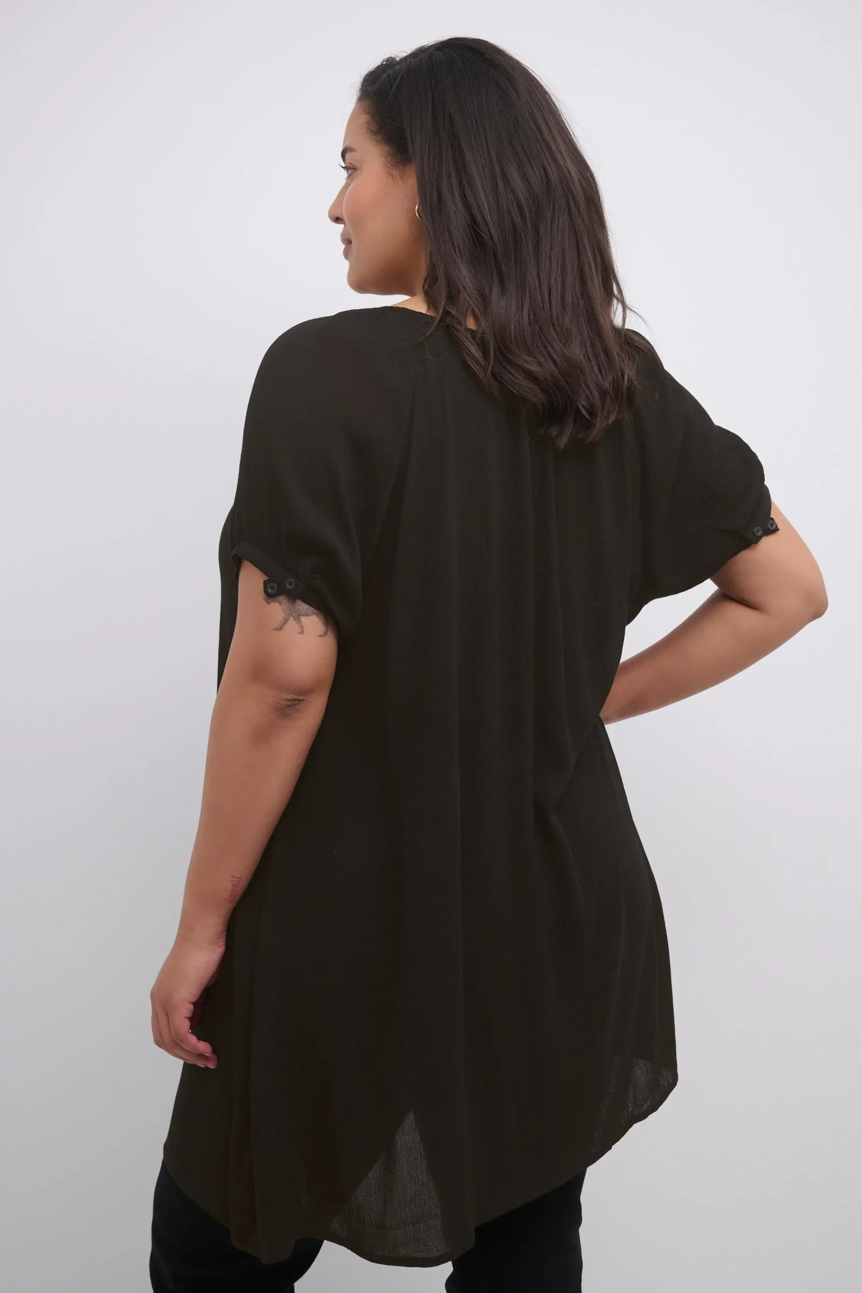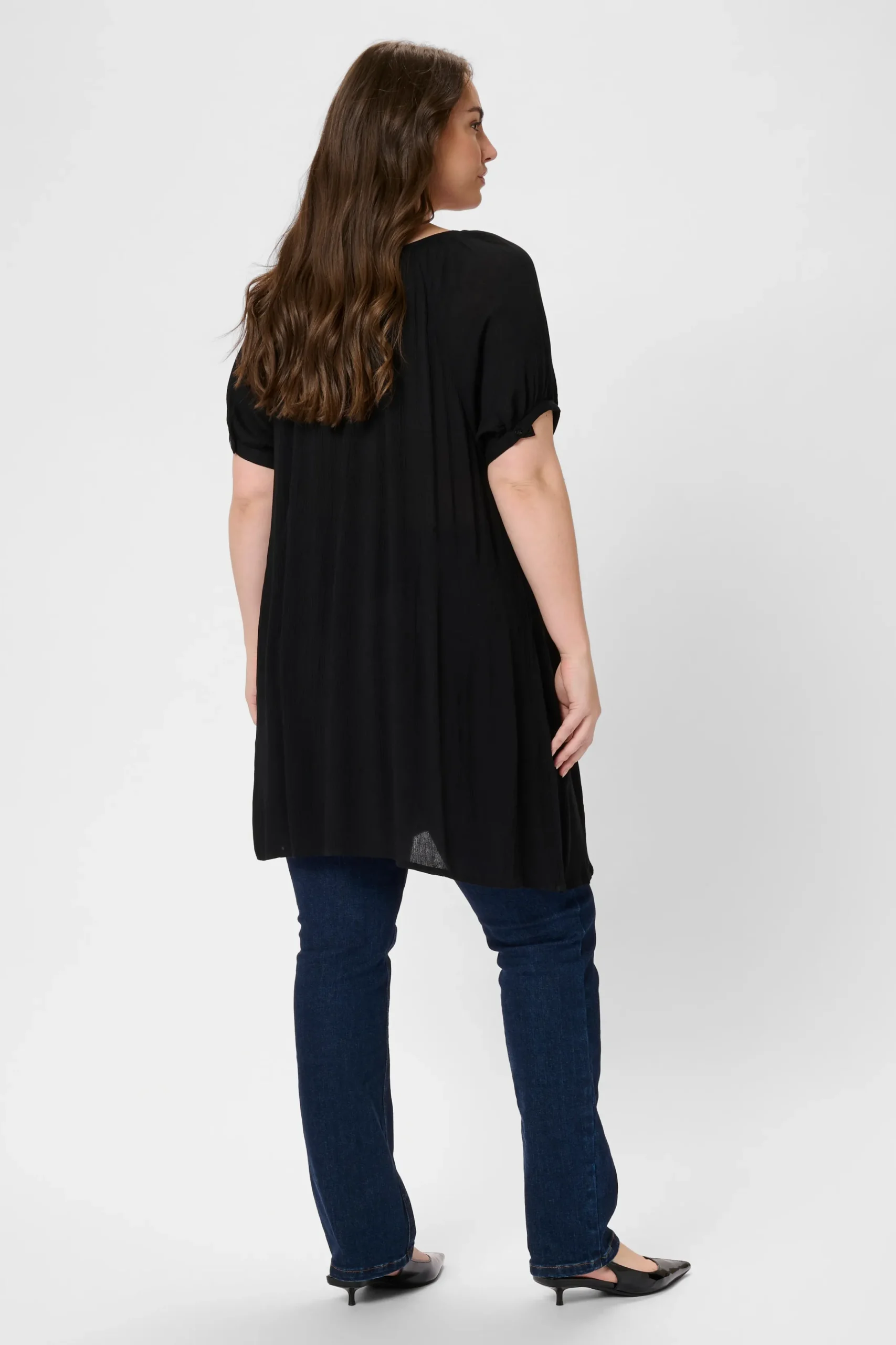 Tunika fra KAFFE CURVE med rund hals. Korte ærmer med slids og knap. Slids i hals med knap. Vævet crepekvalitet. Tunikaen fra KAFFE CURVE har normal pasform.