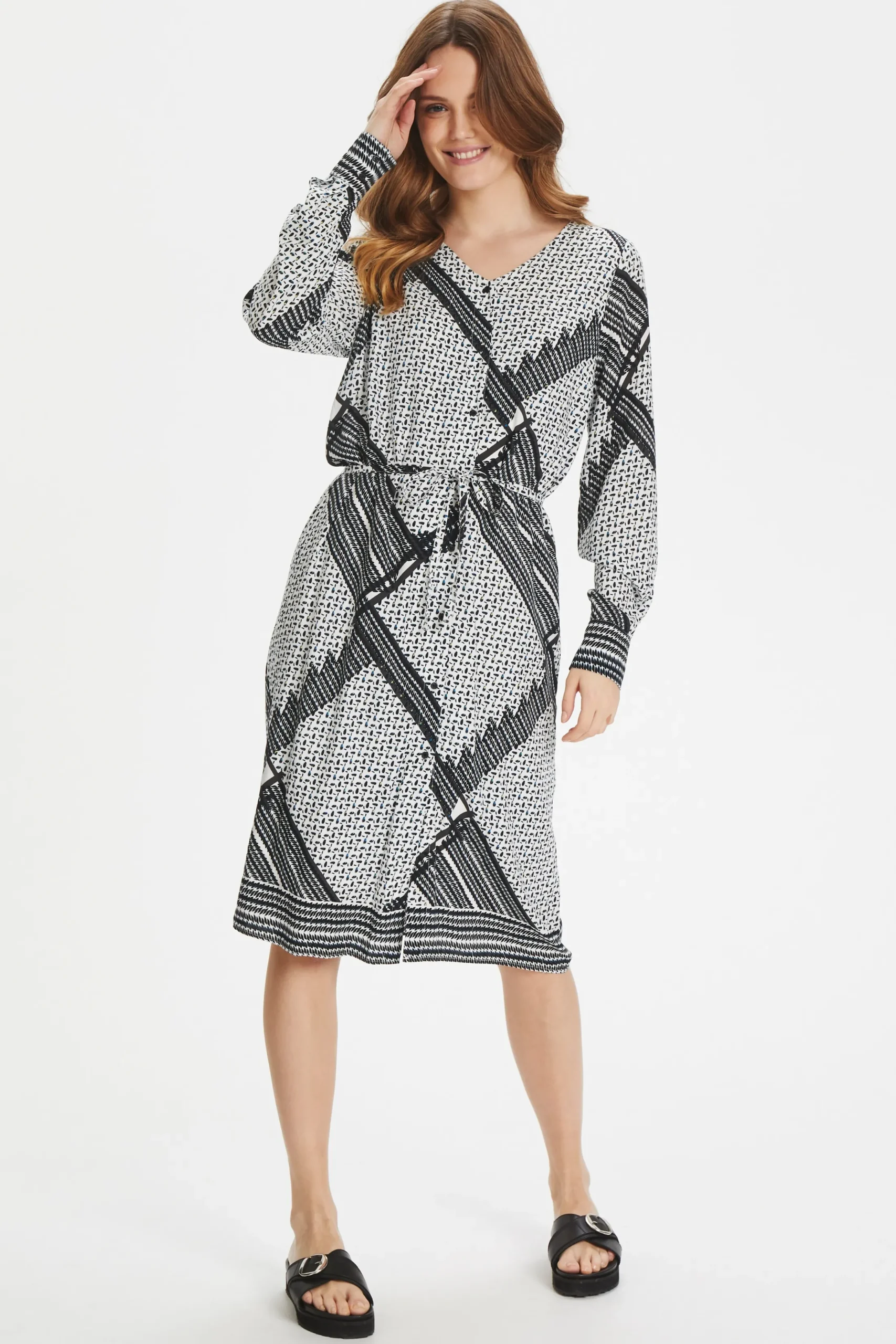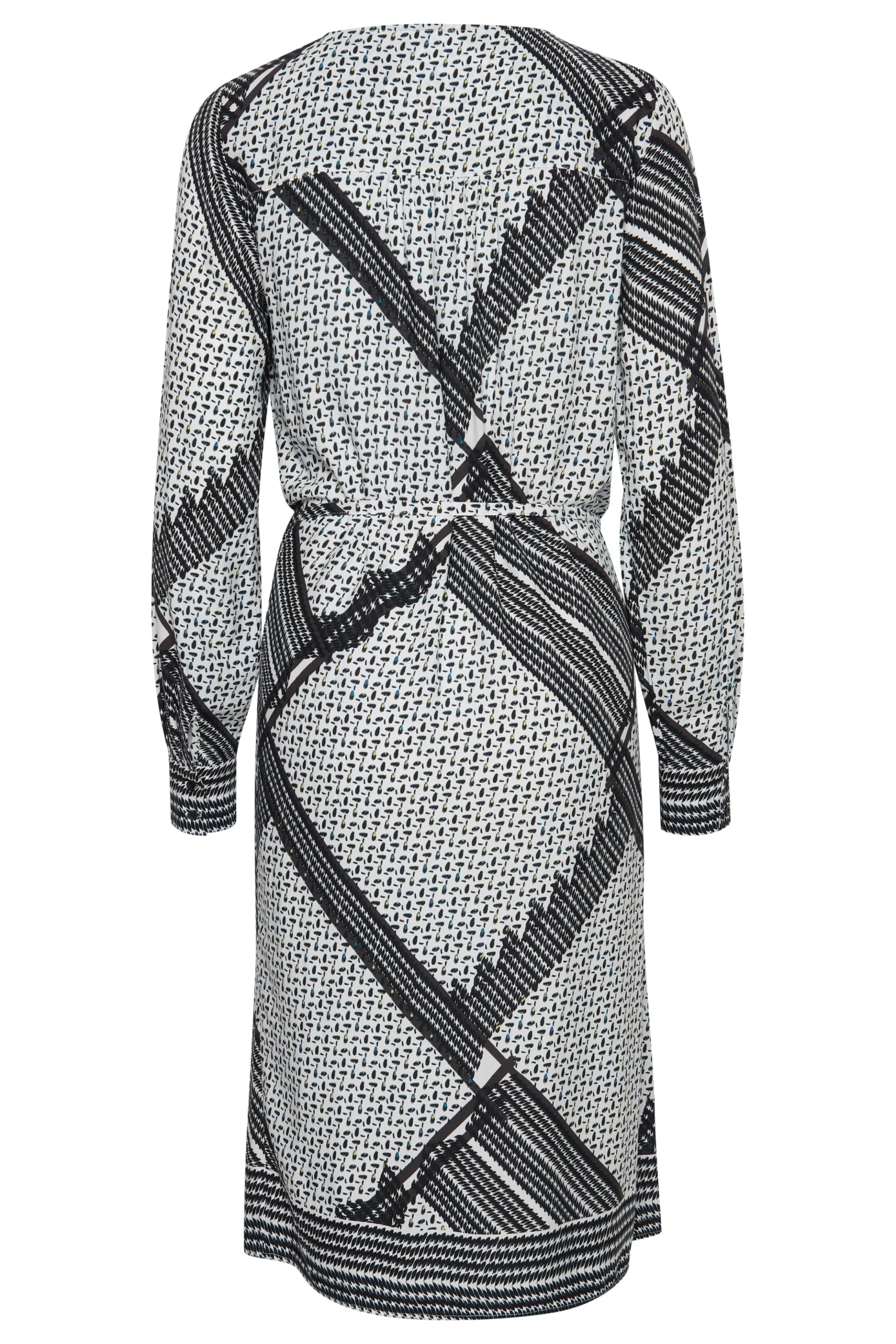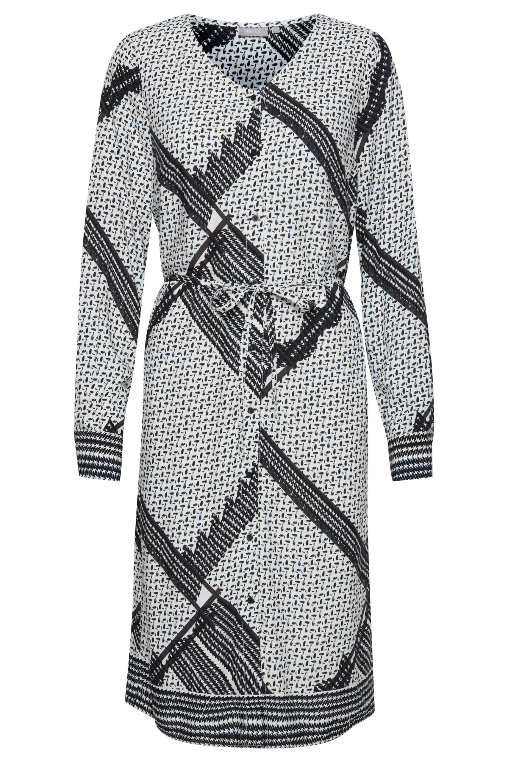 Kjole fra Fransa med V-hals. Lange ærmer med slids og knapper. Synlig knaplukning. Bindebånd i taljen. All-over print. Foer. Kjolen fra Fransa er i let vævet kvalitet. Normal pasform.