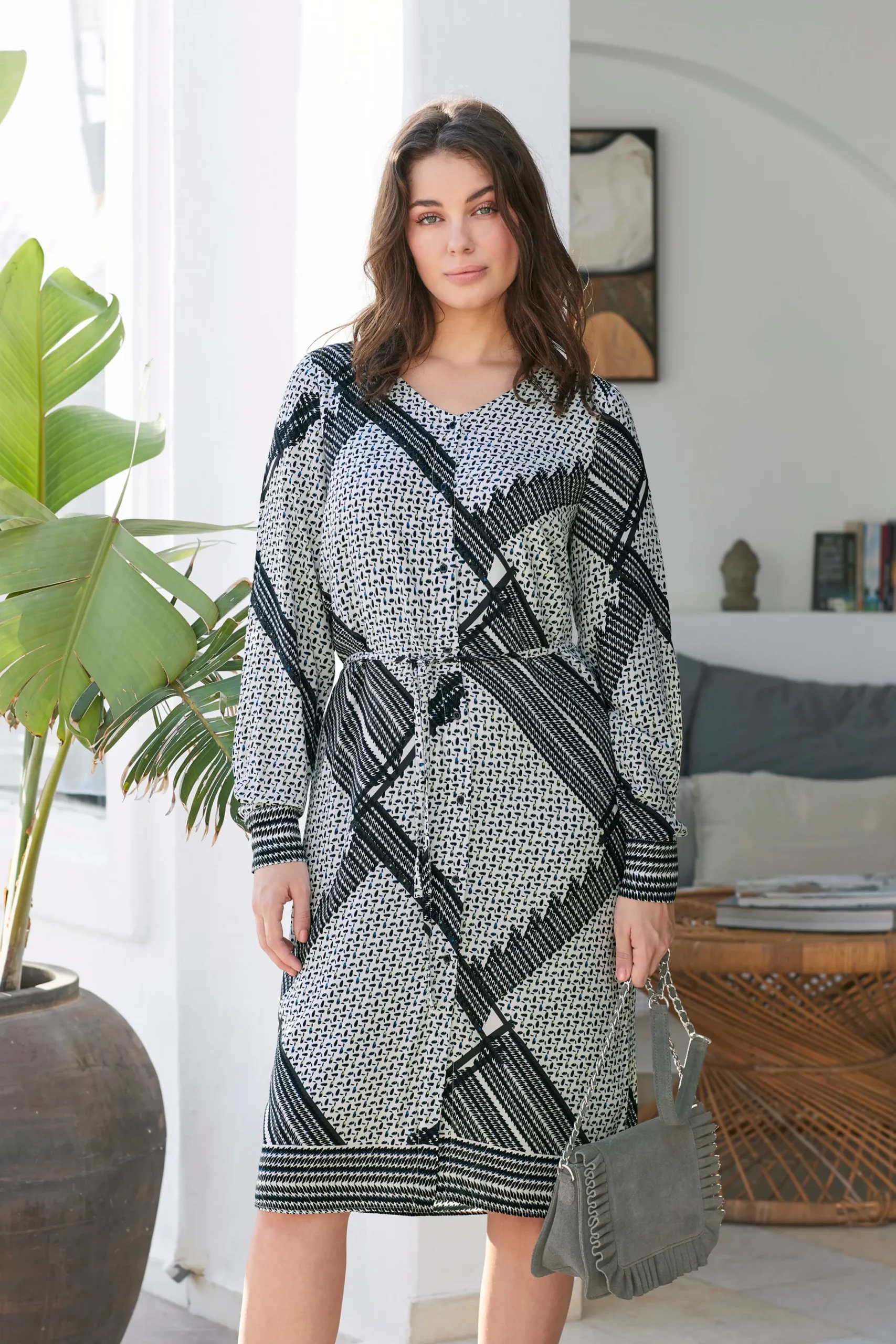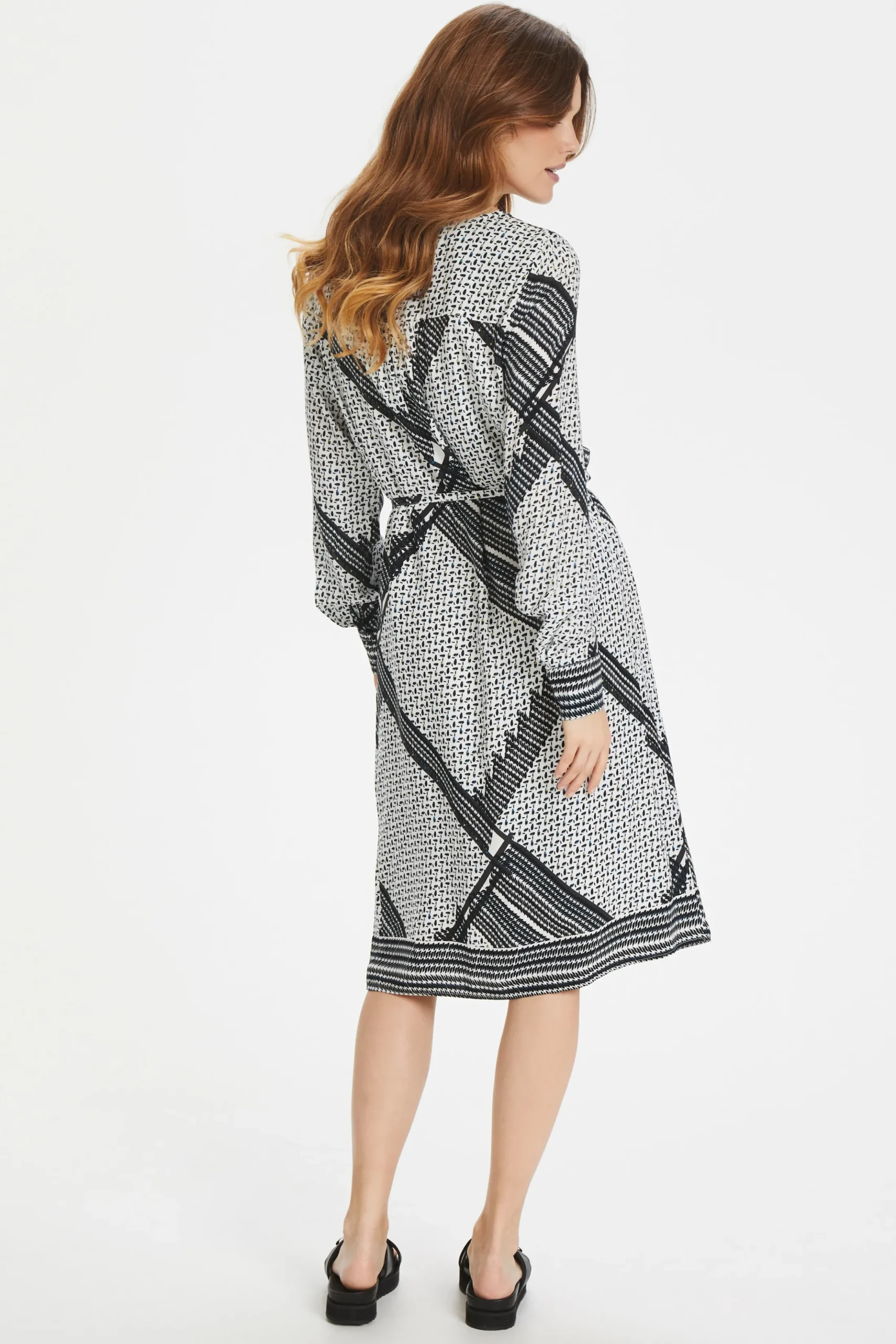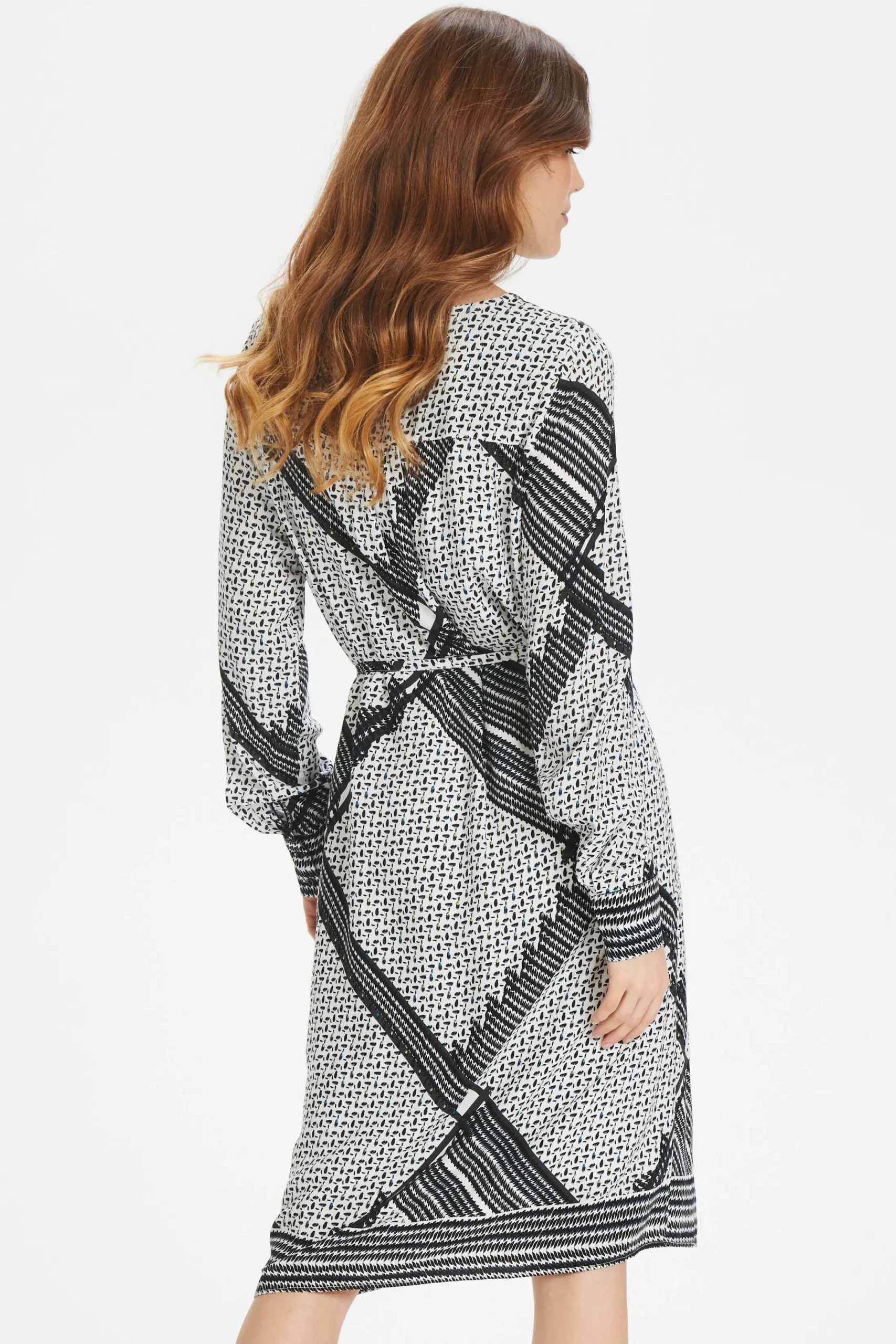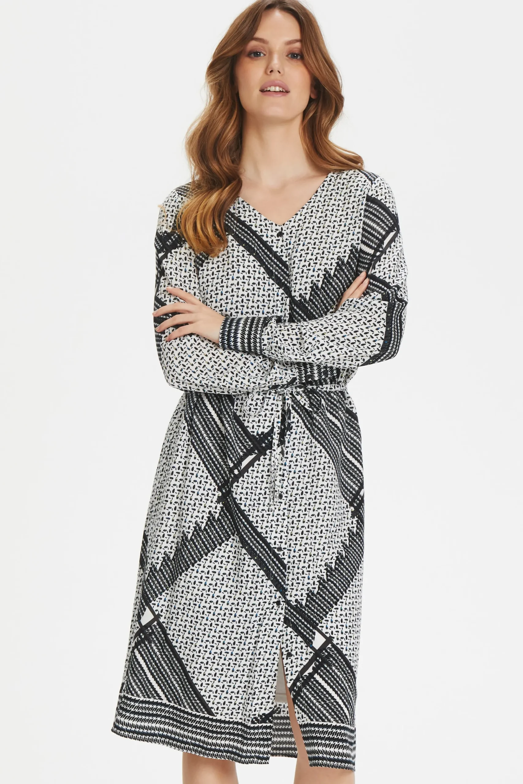 Kjole fra Fransa med V-hals. Lange ærmer med slids og knapper. Synlig knaplukning. Bindebånd i taljen. All-over print. Foer. Kjolen fra Fransa er i let vævet kvalitet. Normal pasform.