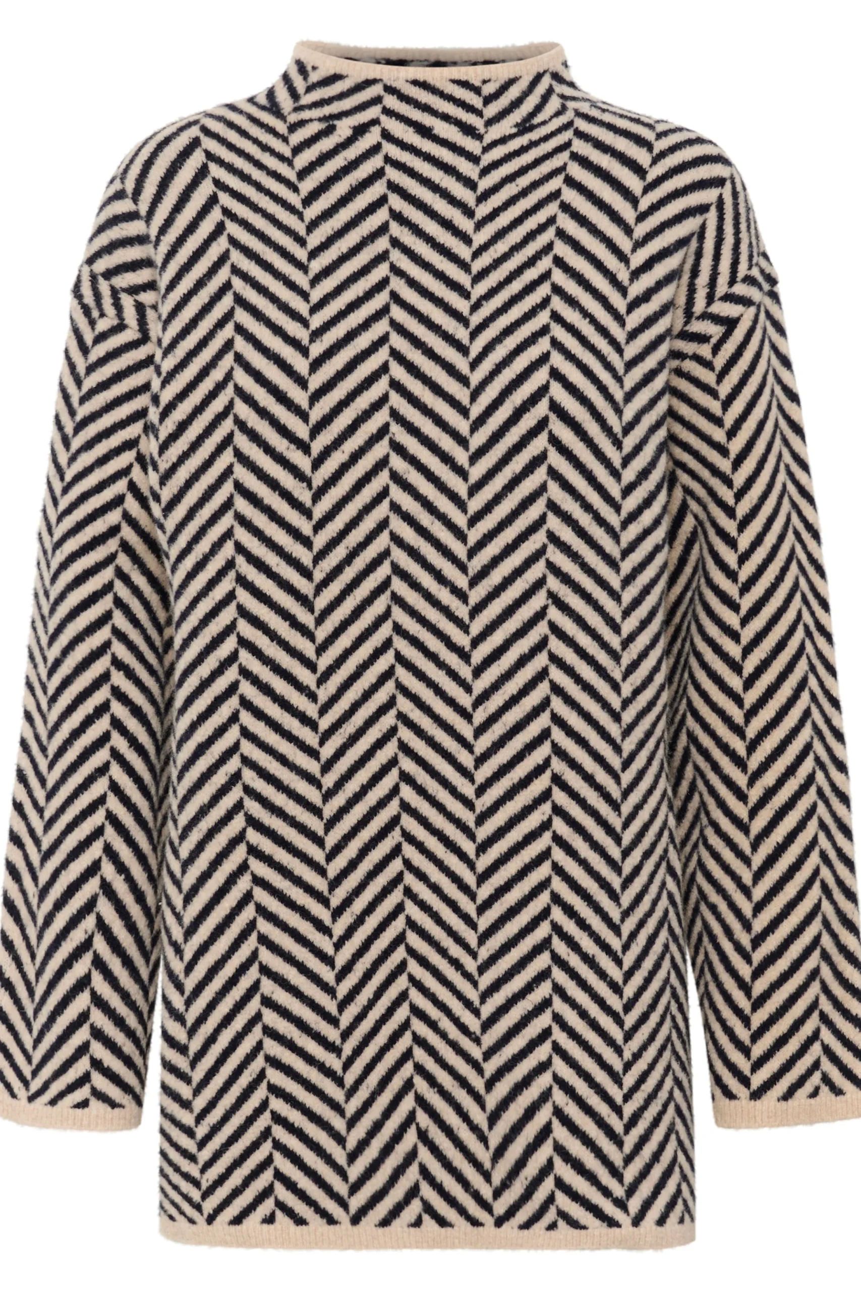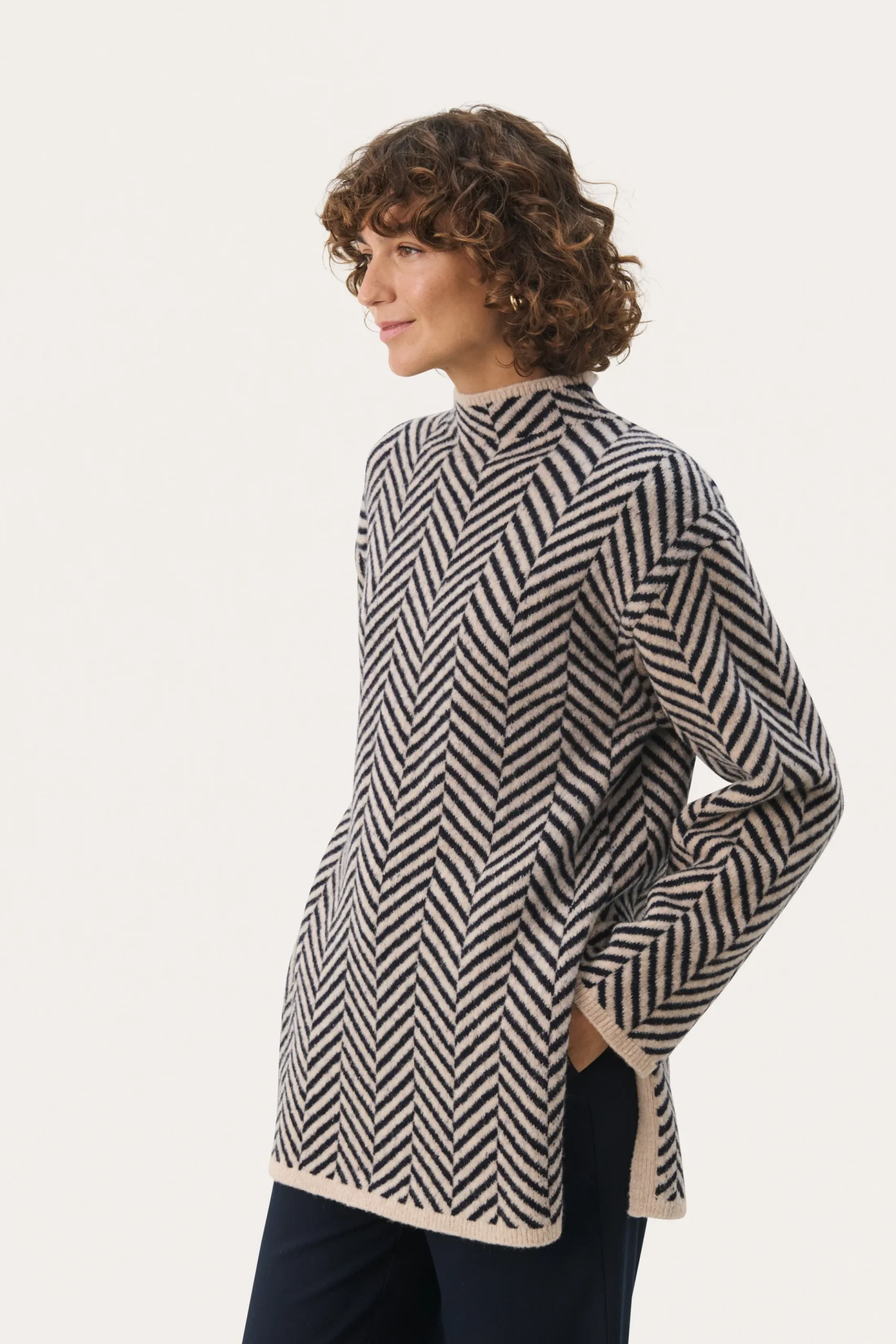 Modellen er 178 cm høj og er iført en størrelse 36.\\n\\nDenne strikkede sweater med et grafisk mønster er perfekt til at skabe et moderne og afslappet udtryk. Det lange snit og den høje hals sikrer komfort, mens det unikke mønster gør den til et stilfuldt valg. Ideel til både hverdagsbrug og hyggelige stunder.\\n\\n