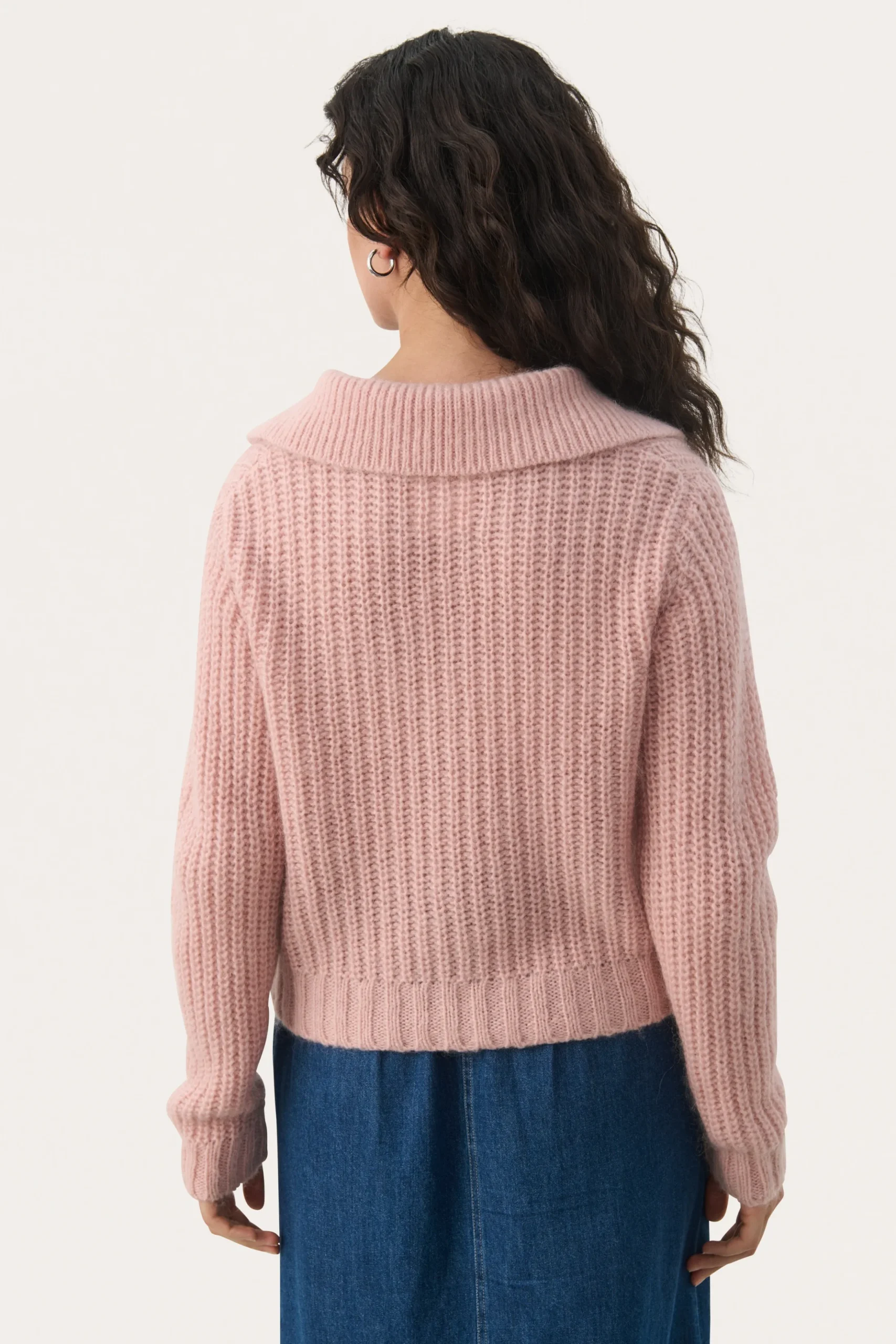 Modellen er 178 cm høj og er iført en størrelse M.\\n\\nHold varmen med denne bløde striktrøje. Den har en afslappet pasform, bred krave og lange ærmer, som gør den både hyggelig og stilfuld. Perfekt til kølige dage, hvor komfort er i fokus. Kombinér med jeans eller en nederdel for et casual look.