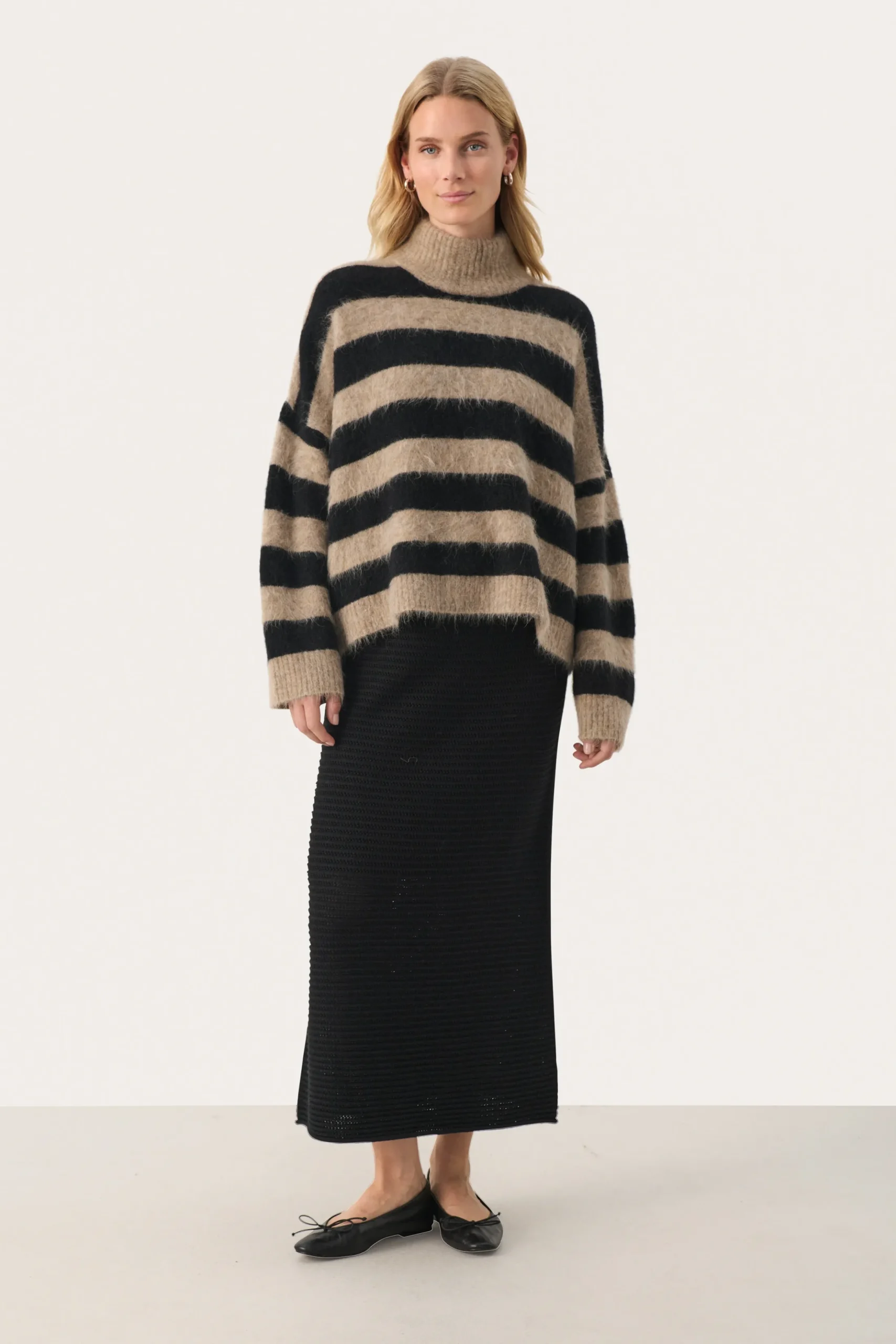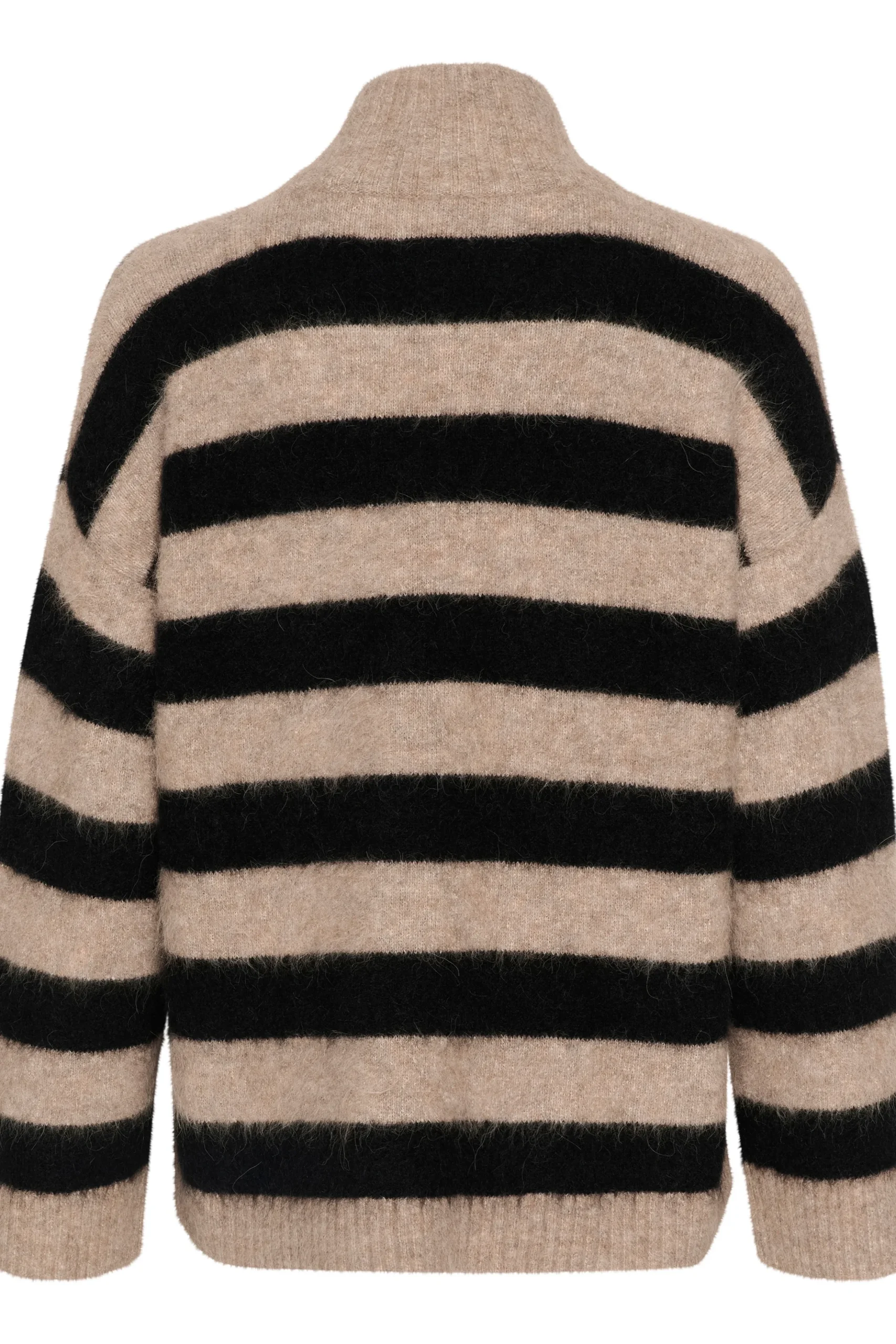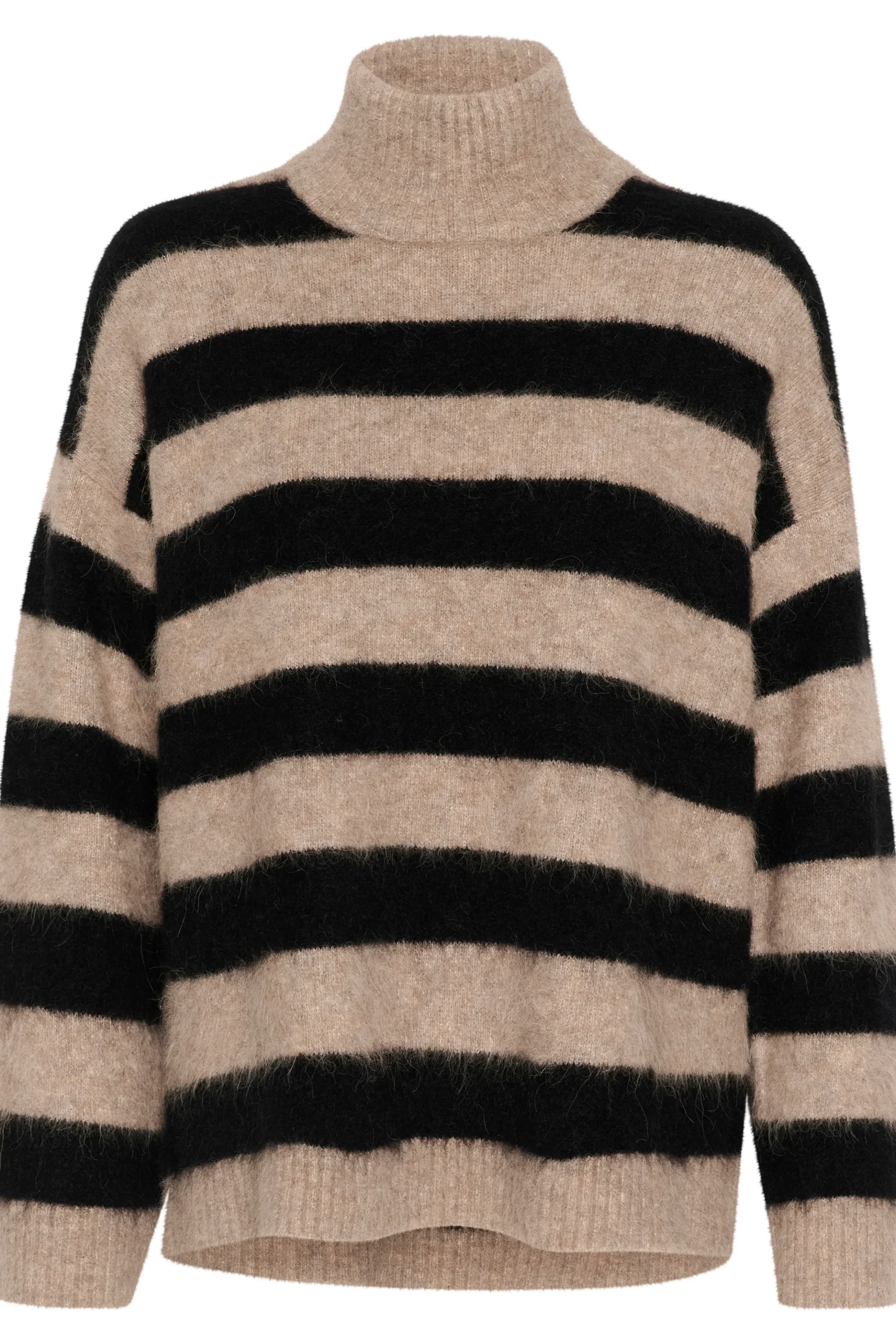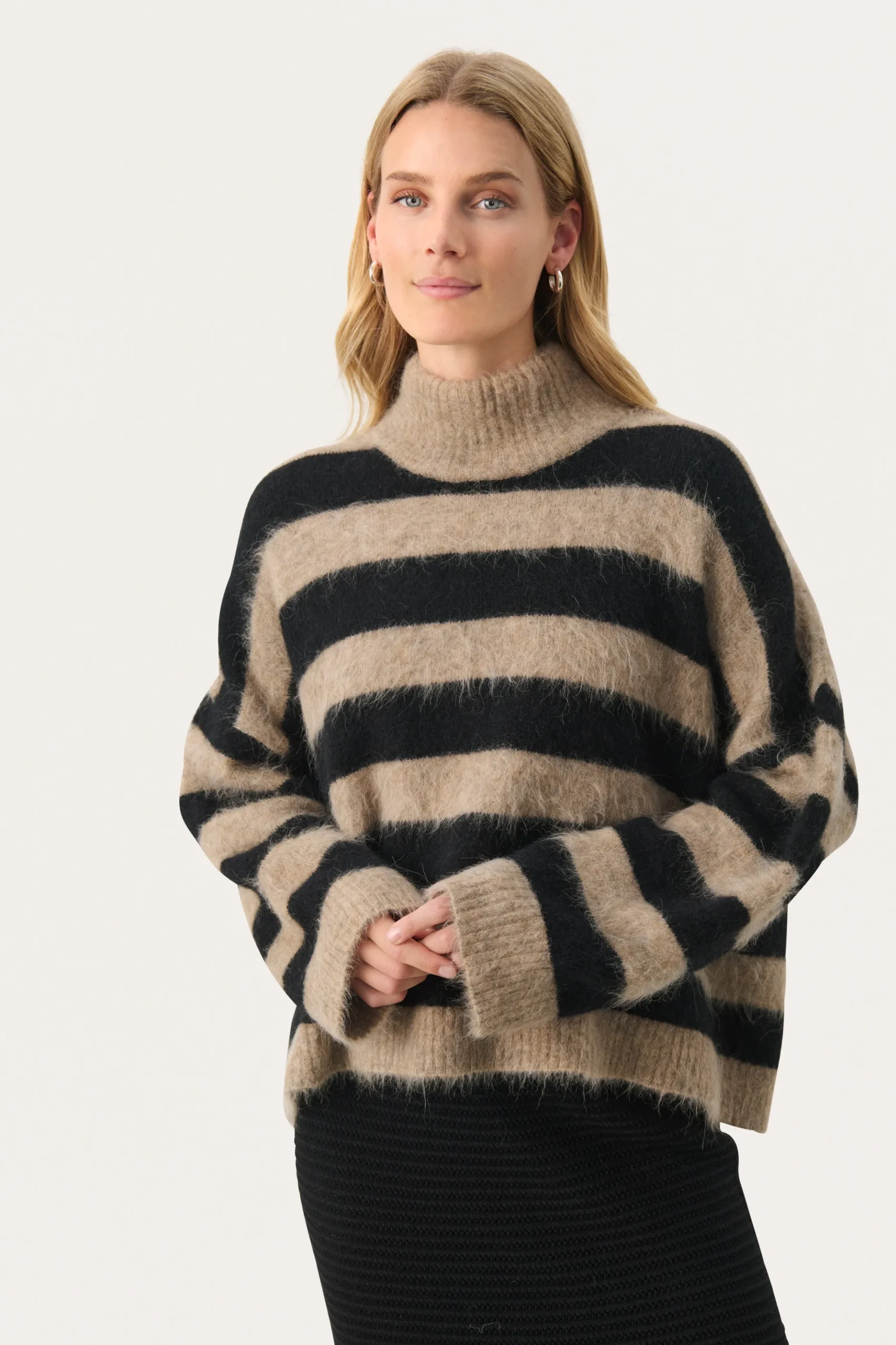 Denne stribede sweater med høj hals er perfekt til kølige dage. Den er lavet af en blød og varm uldblanding, som sikrer maksimal komfort. De brede striber og de løse ærmer giver et moderne og afslappet look, ideelt til både hverdag og hyggelige aftener.