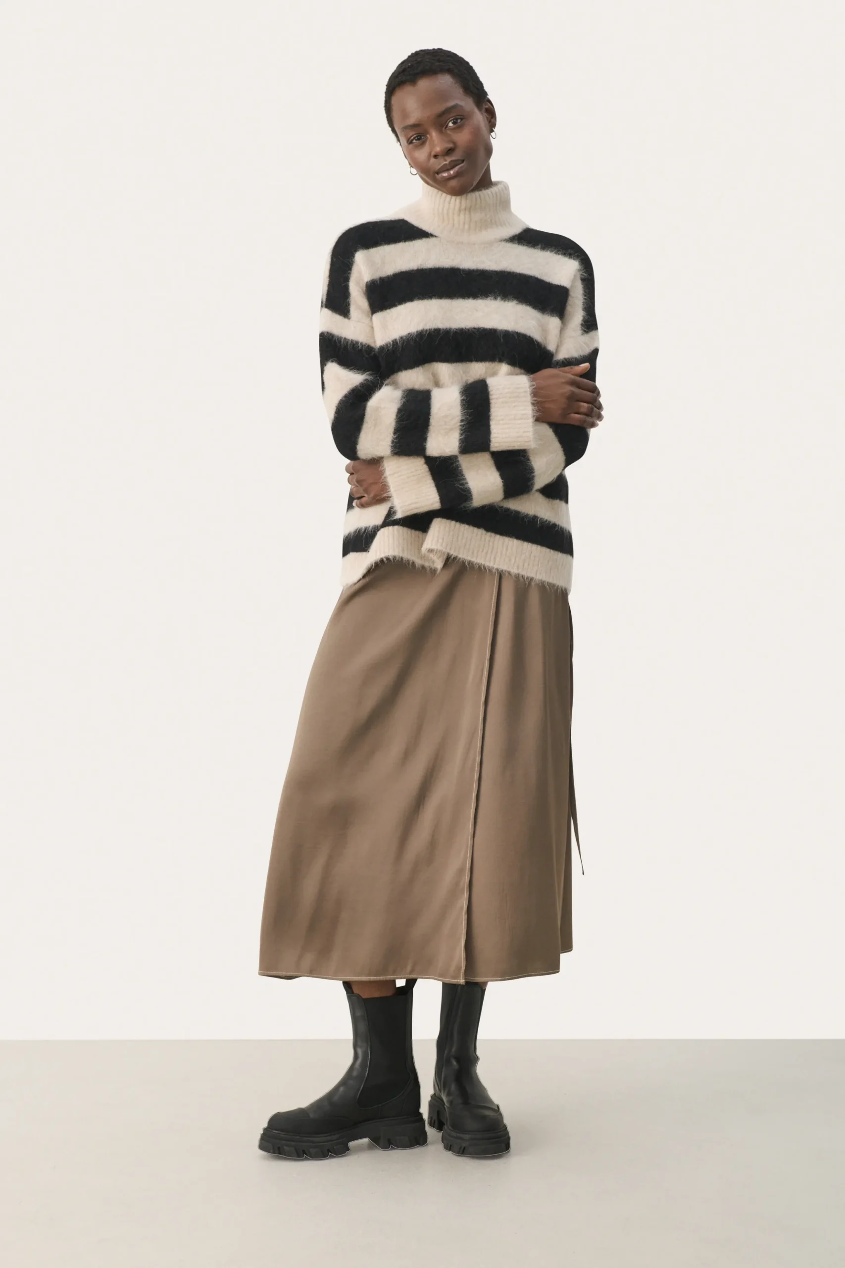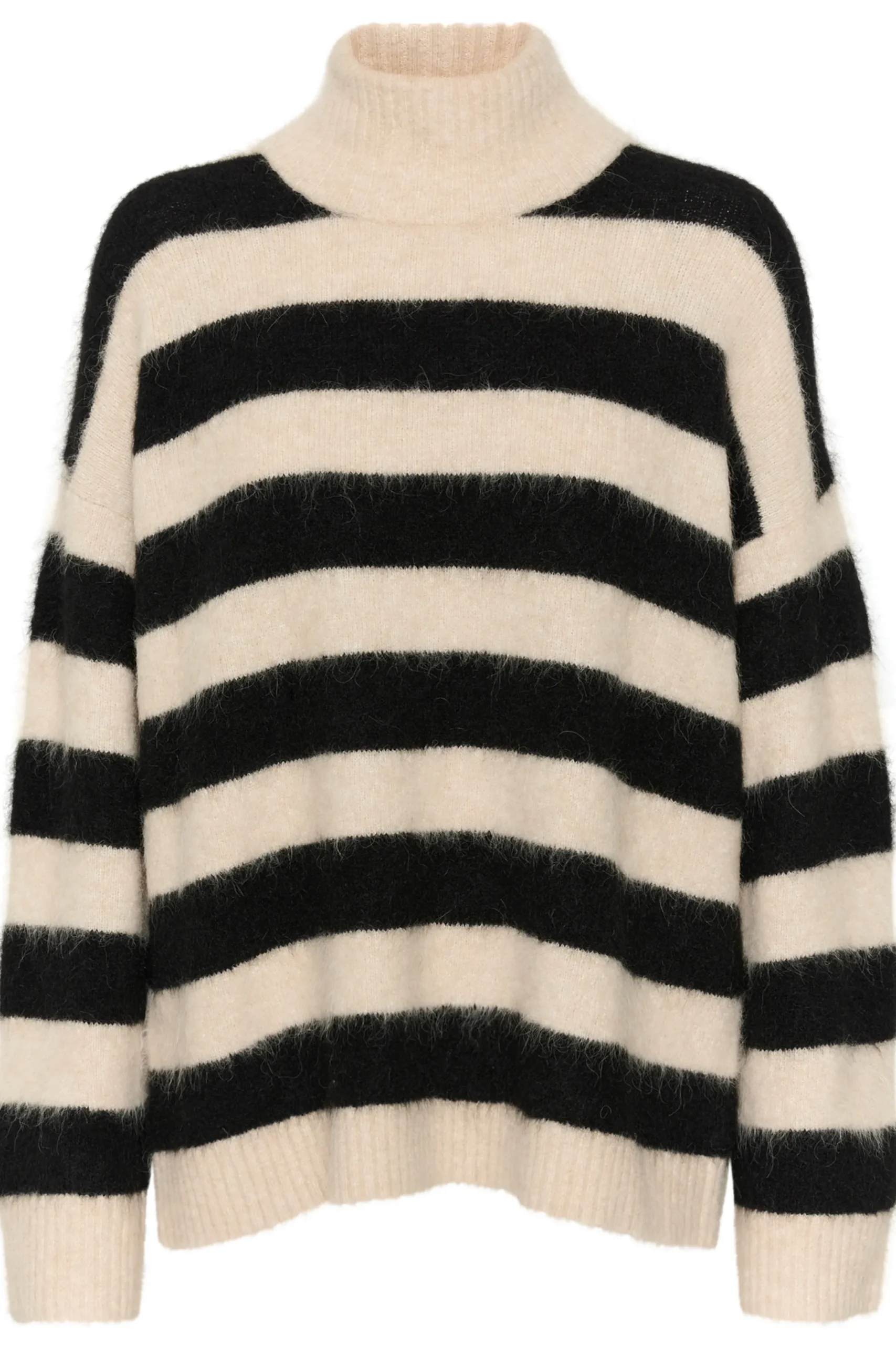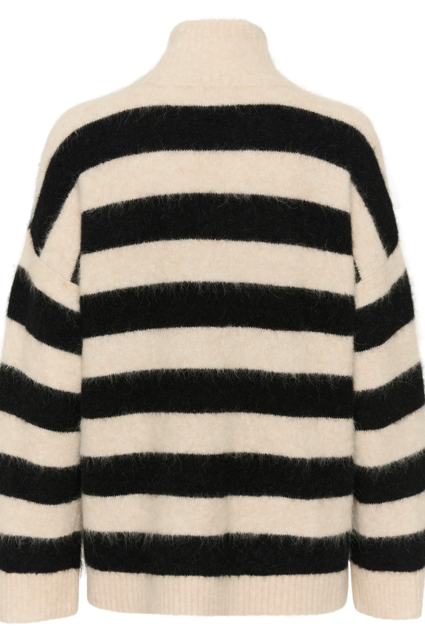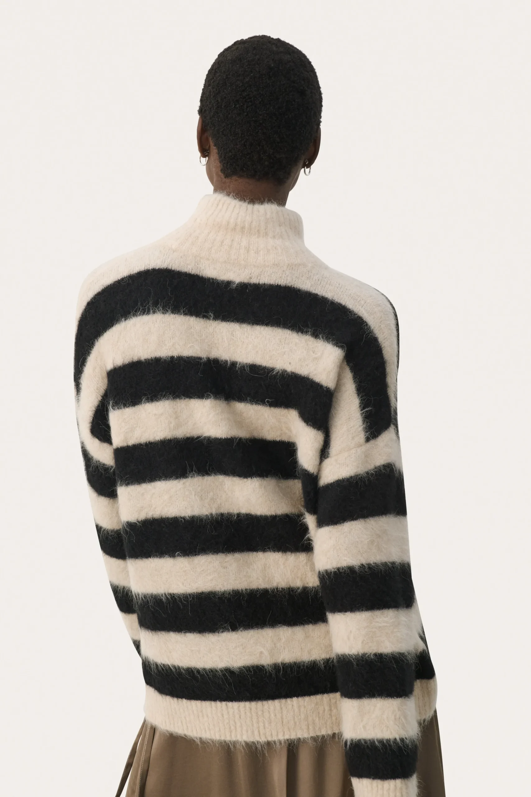Denne stilfulde striktrøje med høj hals og brede sorte striber er både moderne og komfortabel. Fremstillet af en blød alpakauldblanding, sikrer den varme på kølige dage. Ideel til både hverdag og afslappede sammenkomster.