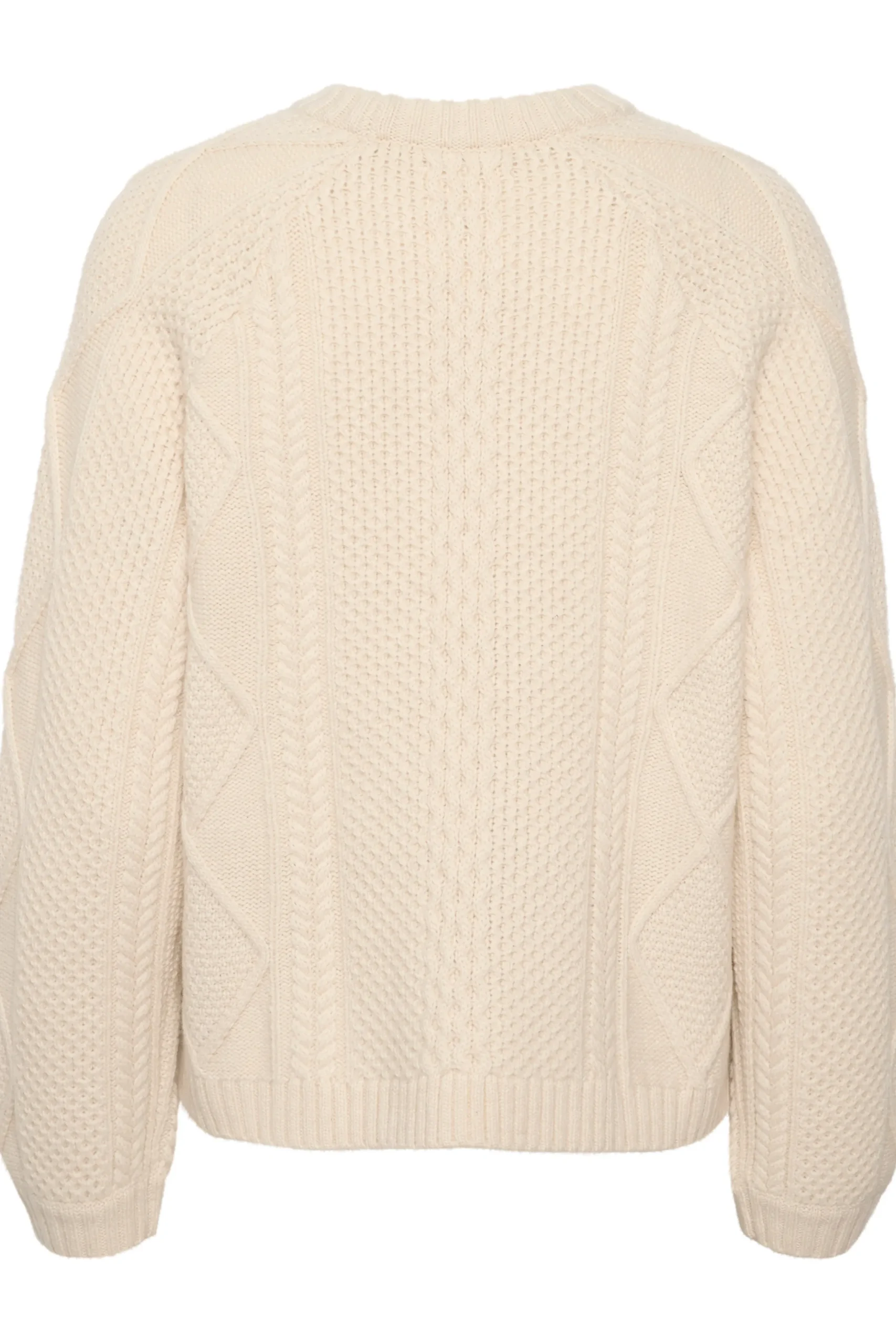 Denne striktrøje i en blød, cremet nuance er perfekt til at holde dig varm med stil. Med sit kabelstrikmønster og dekorative knapper på siden kombinerer den klassisk design med moderne detaljer. Lavet af blødt materiale for maksimal komfort.