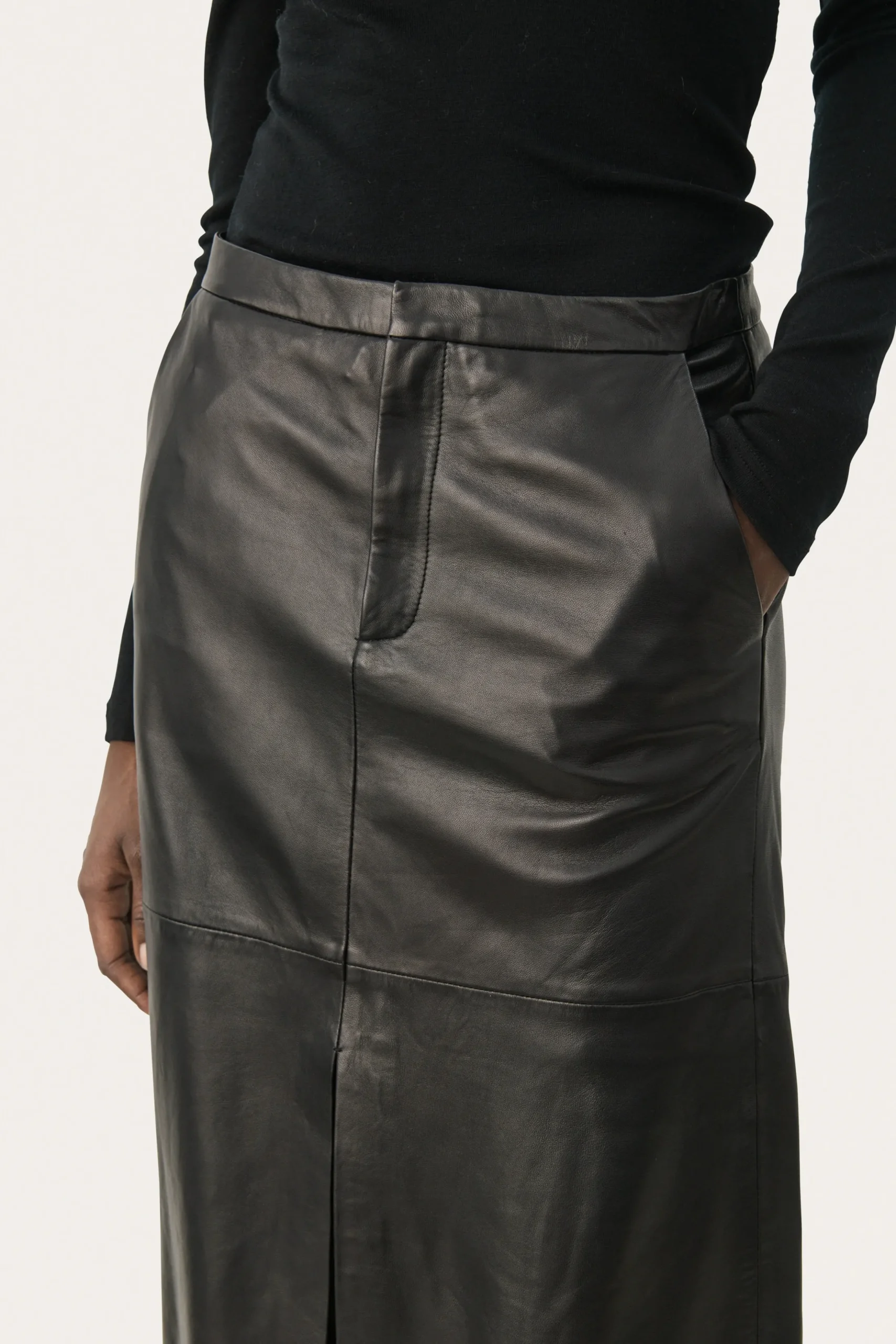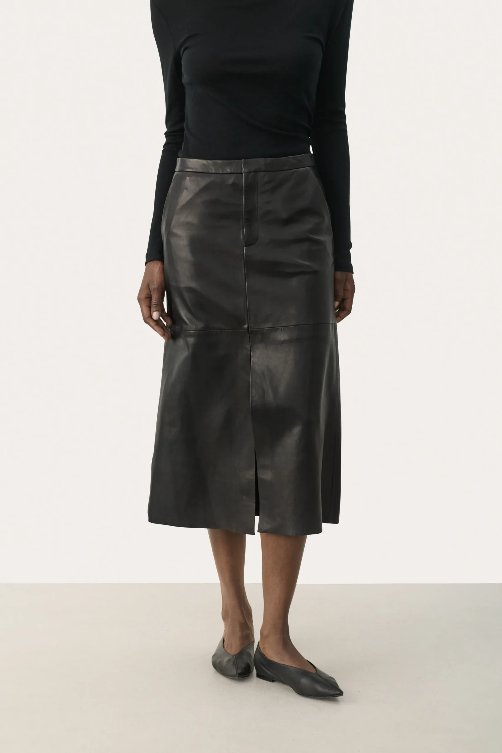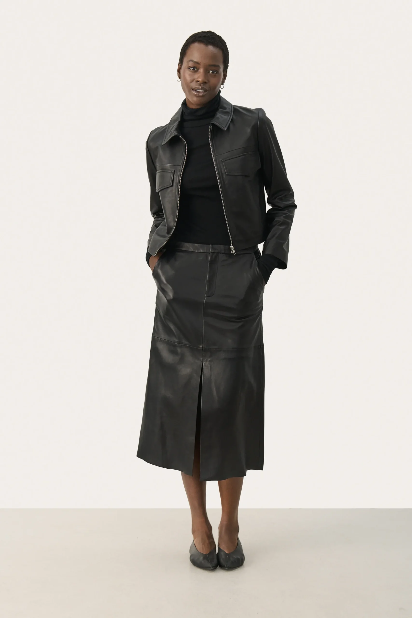 Modellen er 180 cm høj og er iført en størrelse 36.\\n\\nDenne lædernederdel er lavet af blødt, høj kvalitet læder, der sikrer både komfort og stil. Med en moderne midi-længde og en diskret slids foran, giver den et elegant og tidløst udtryk. Perfekt til både hverdag og festlige anledninger.