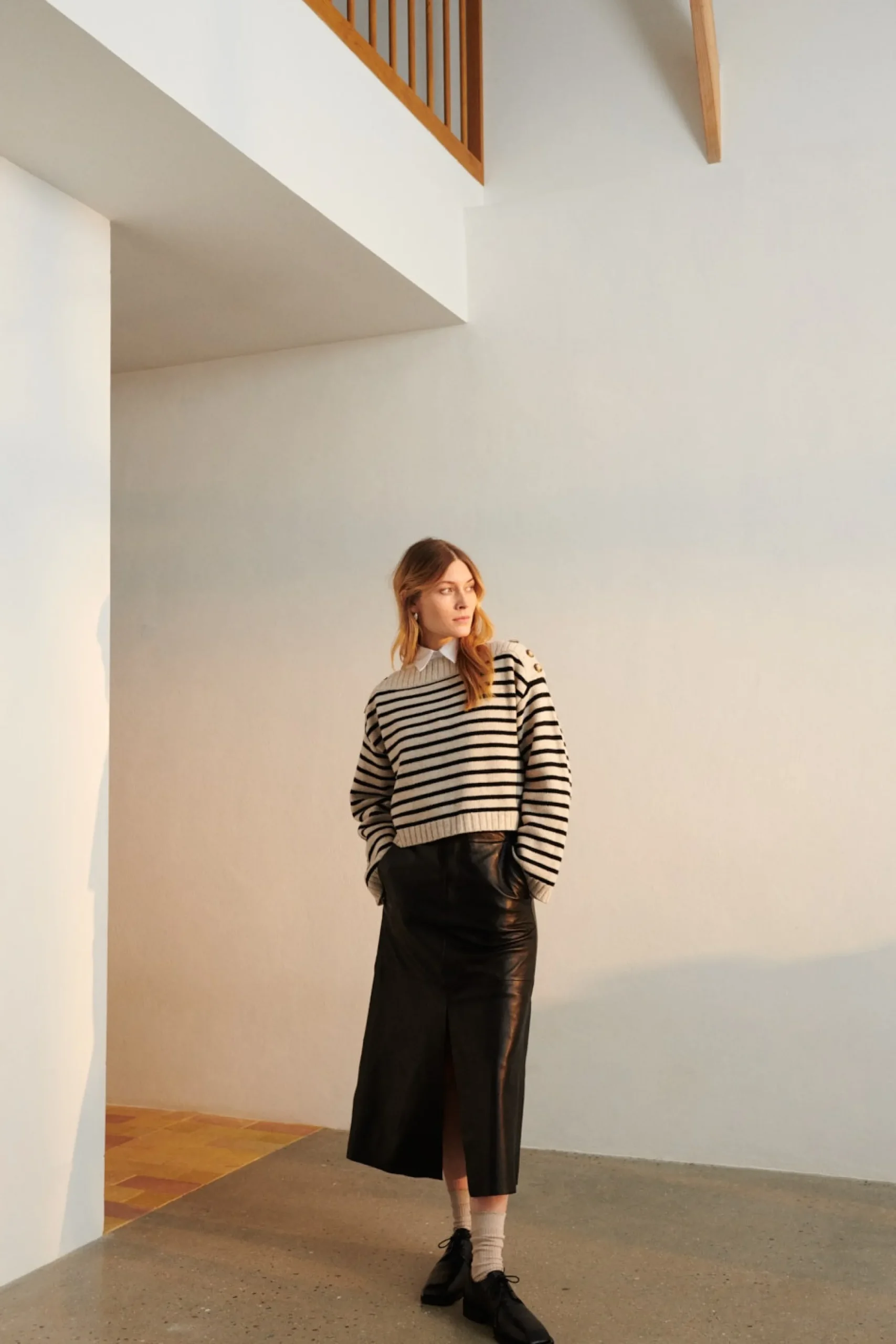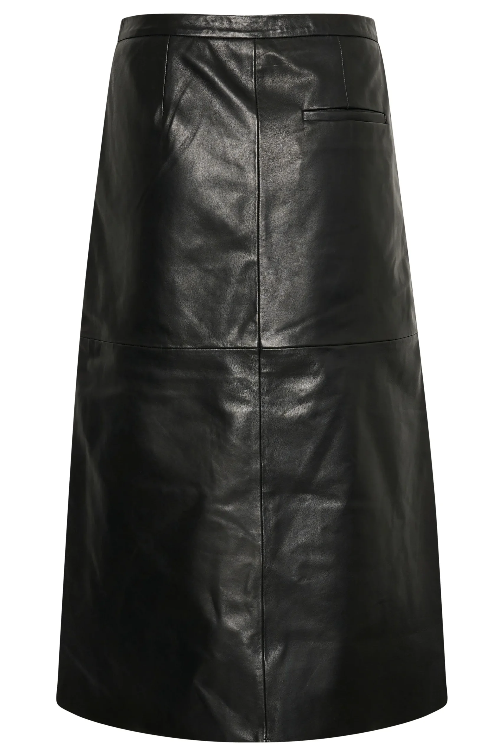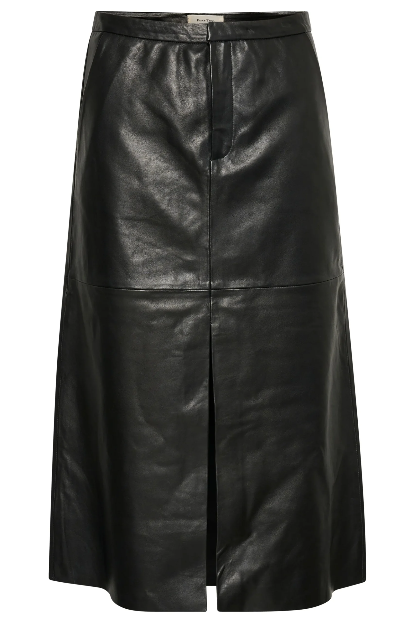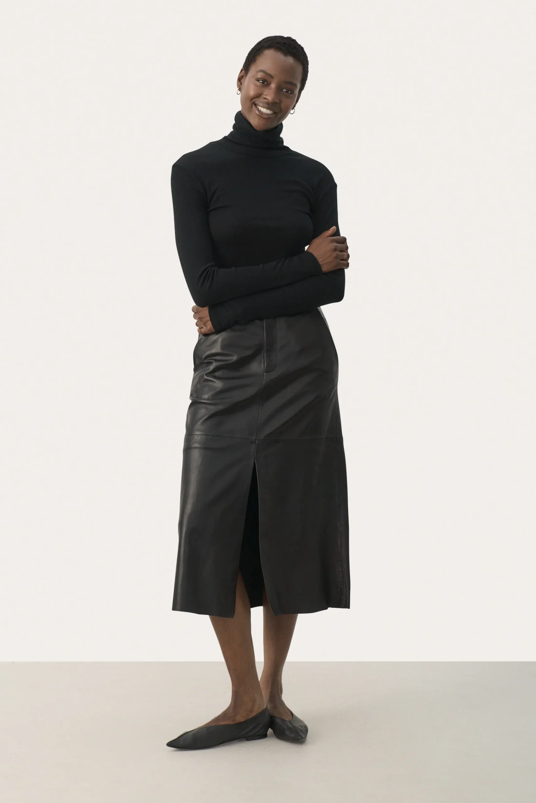 Modellen er 180 cm høj og er iført en størrelse 36.\\n\\nDenne lædernederdel er lavet af blødt, høj kvalitet læder, der sikrer både komfort og stil. Med en moderne midi-længde og en diskret slids foran, giver den et elegant og tidløst udtryk. Perfekt til både hverdag og festlige anledninger.