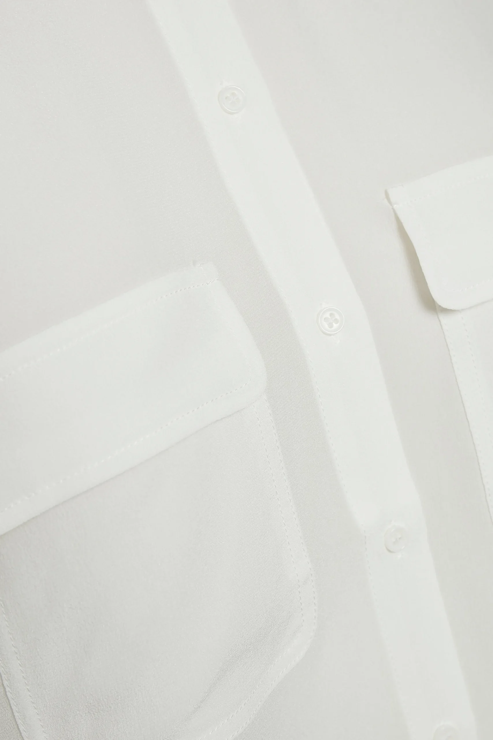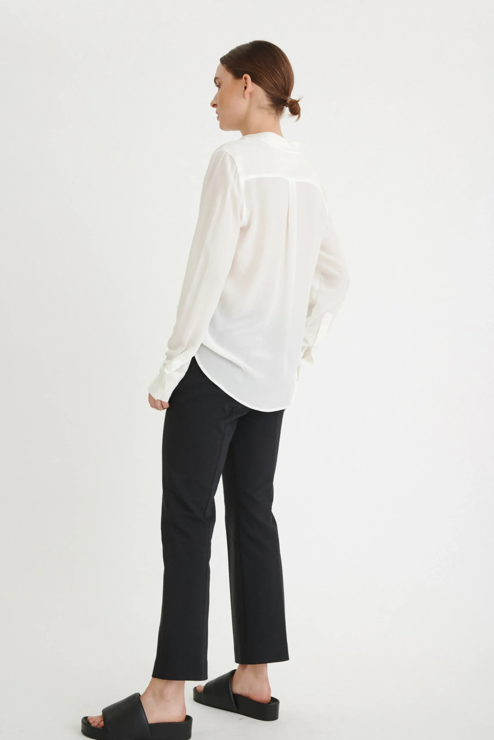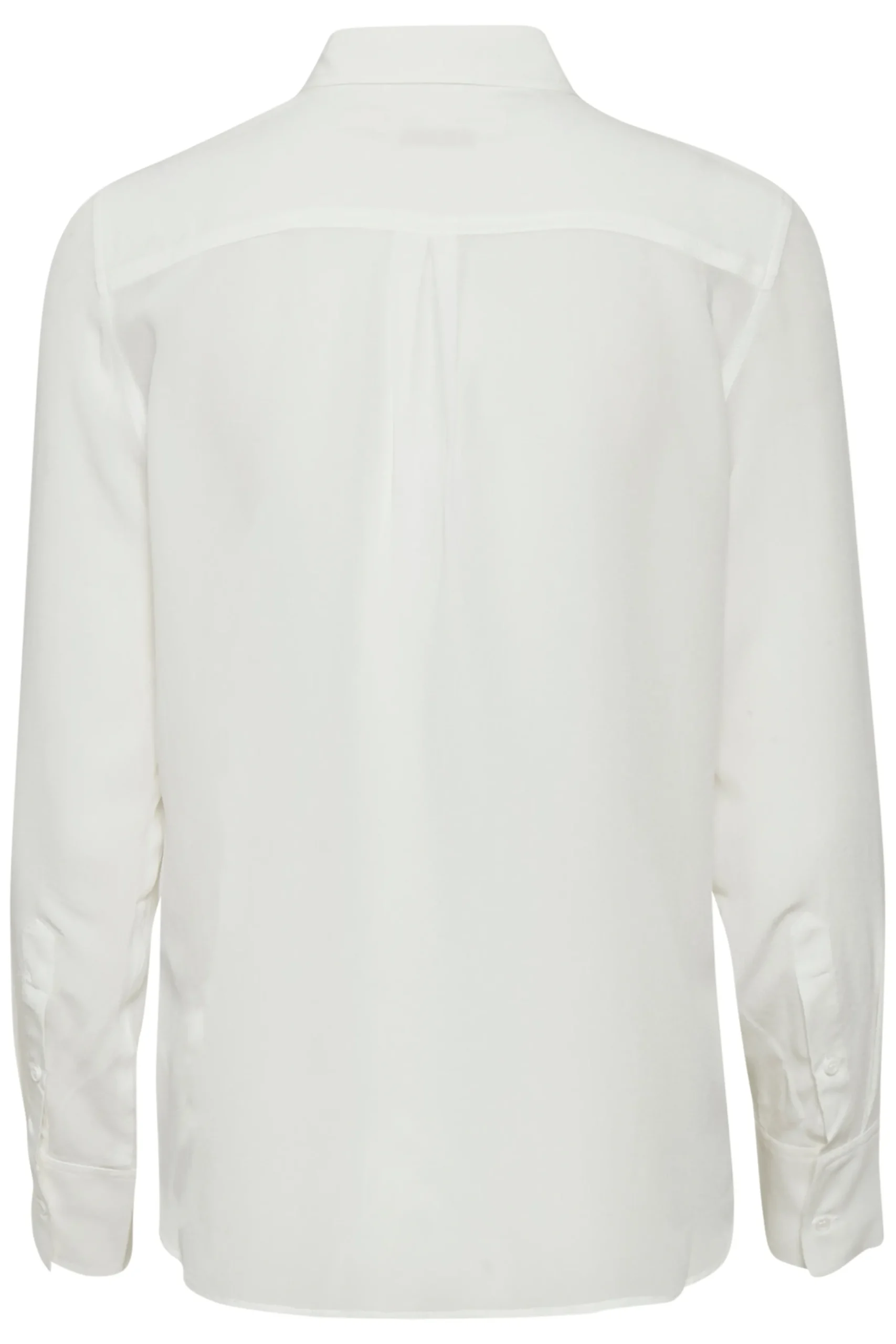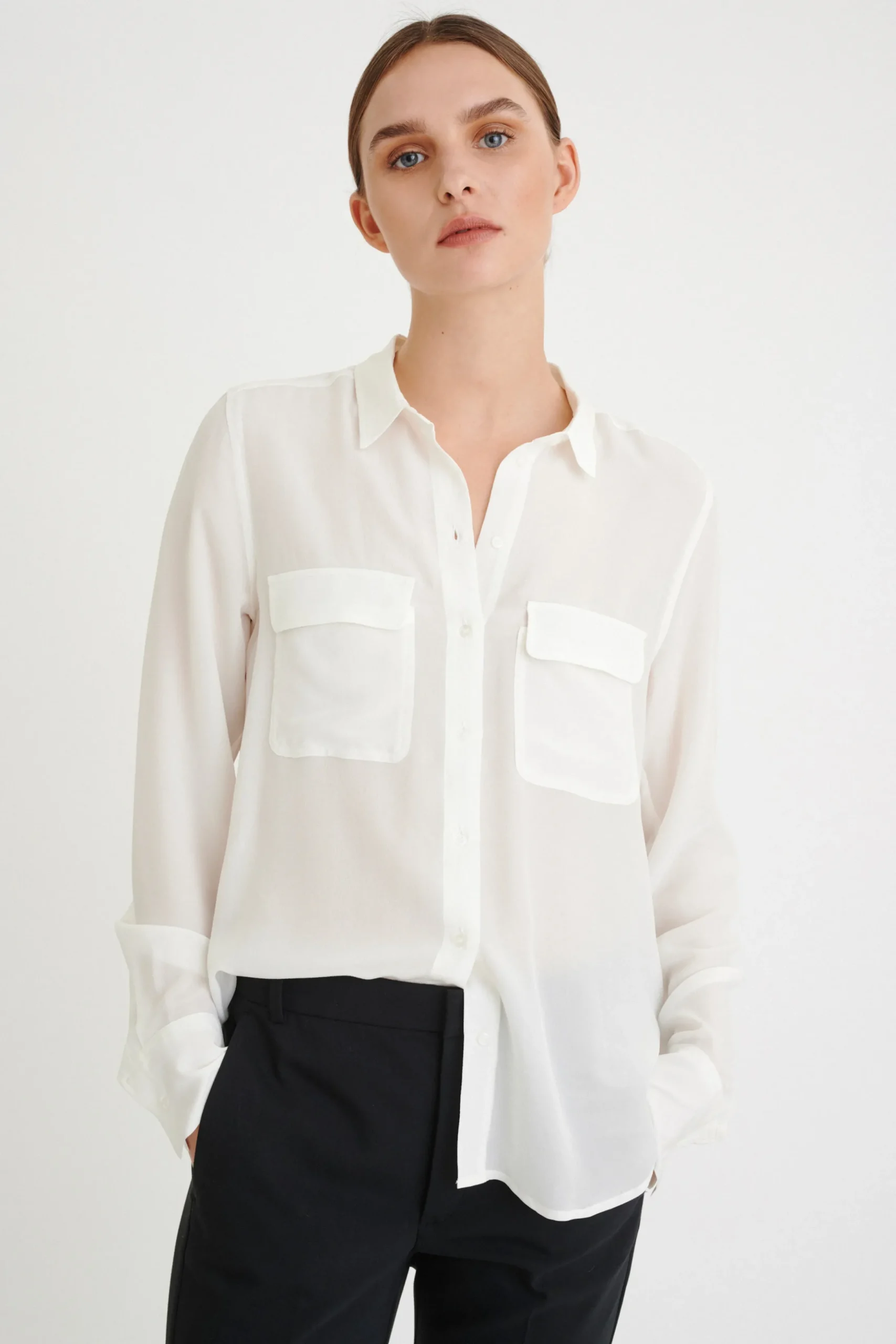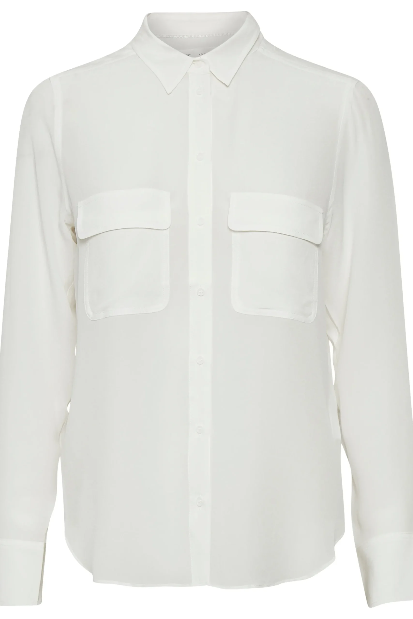 Skjorte med krave. Lange ærmer med slids, manchet og knapper. Brystlommer. Afrundet forneden. Længere bagtil end foran. Vævet kvalitet.