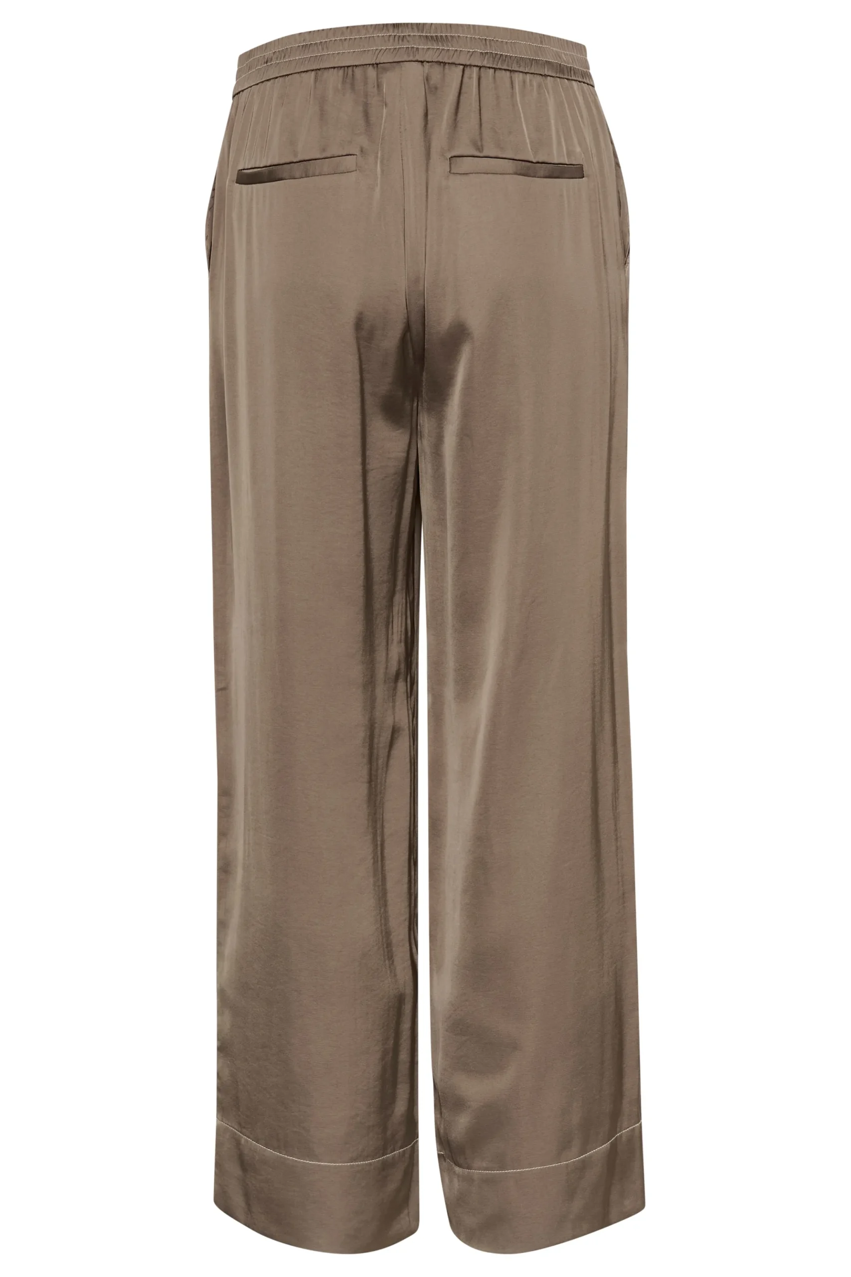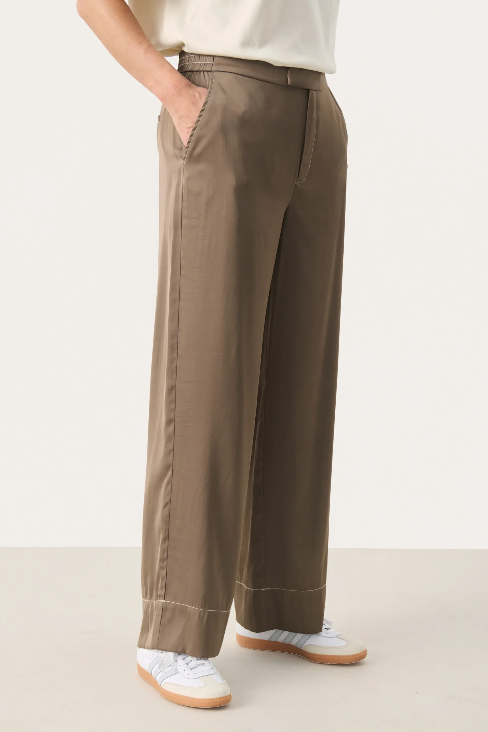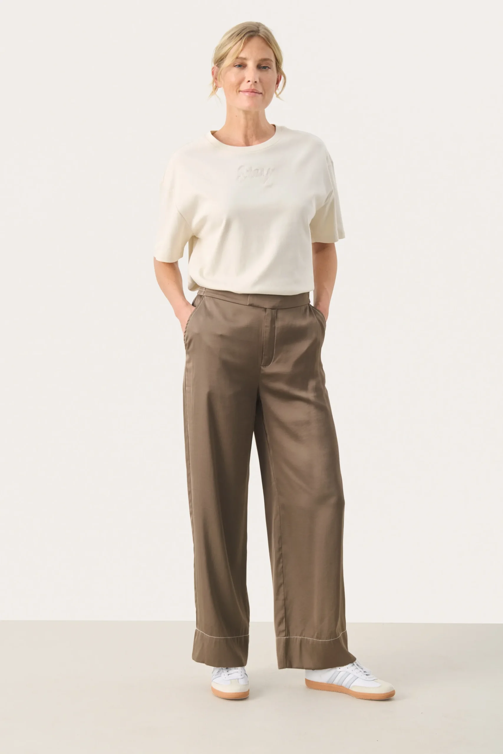 Modellen er 175 cm høj og er iført en størrelse 36.\\n\\n\\nDisse bukser i satin er designet med brede ben og elastisk talje for optimal komfort. Den afslappede pasform gør dem perfekte til både arbejde og afslapning. Style dem med en enkel top eller en skjorte for et stilfuldt look.