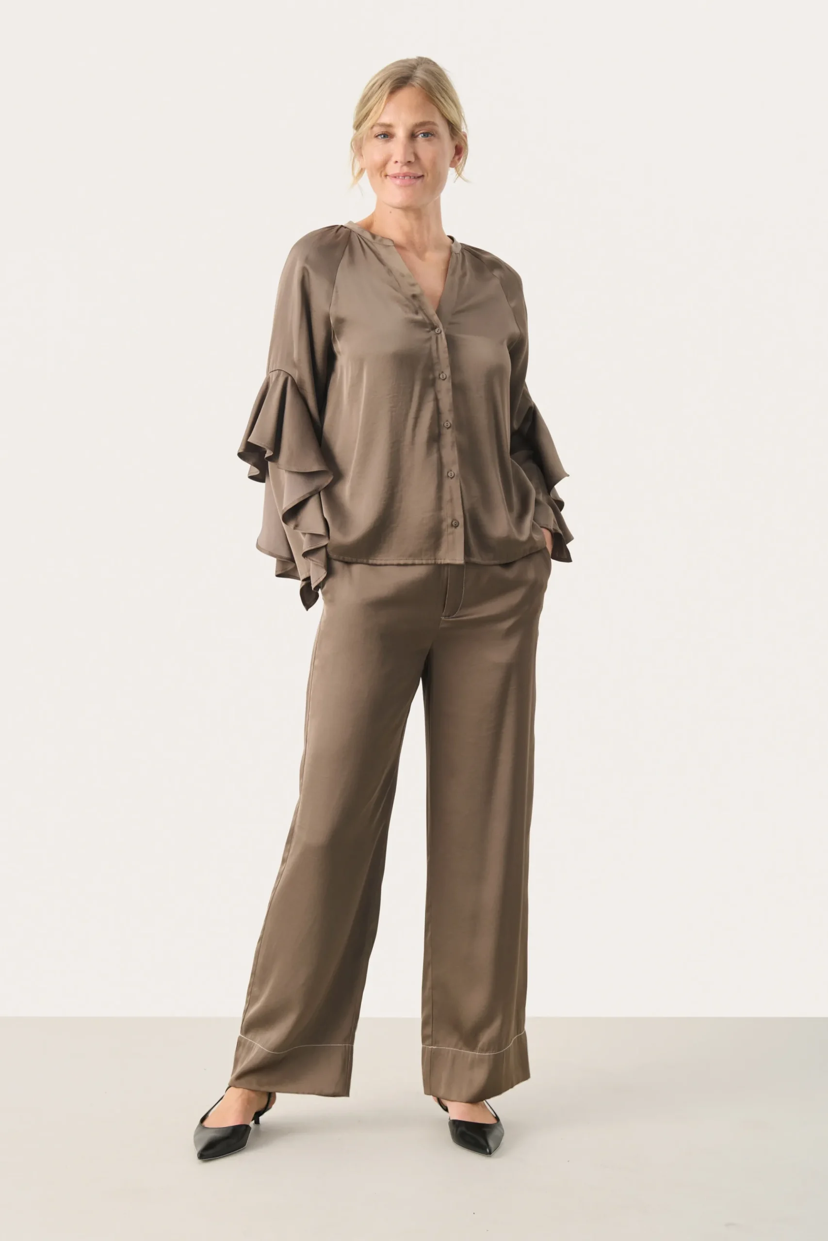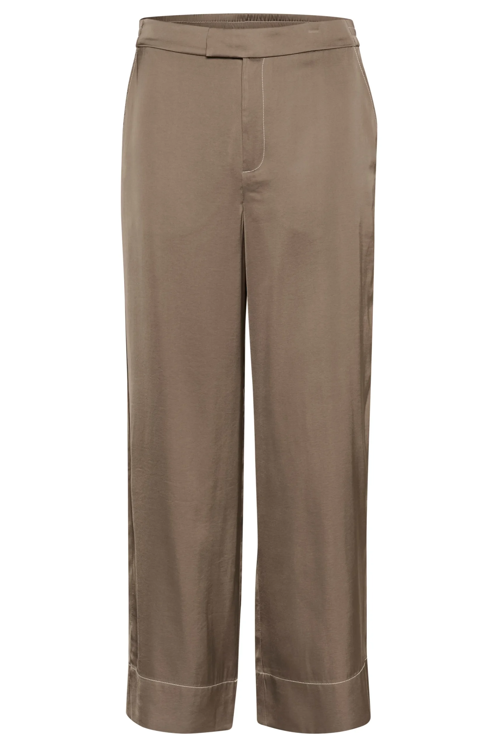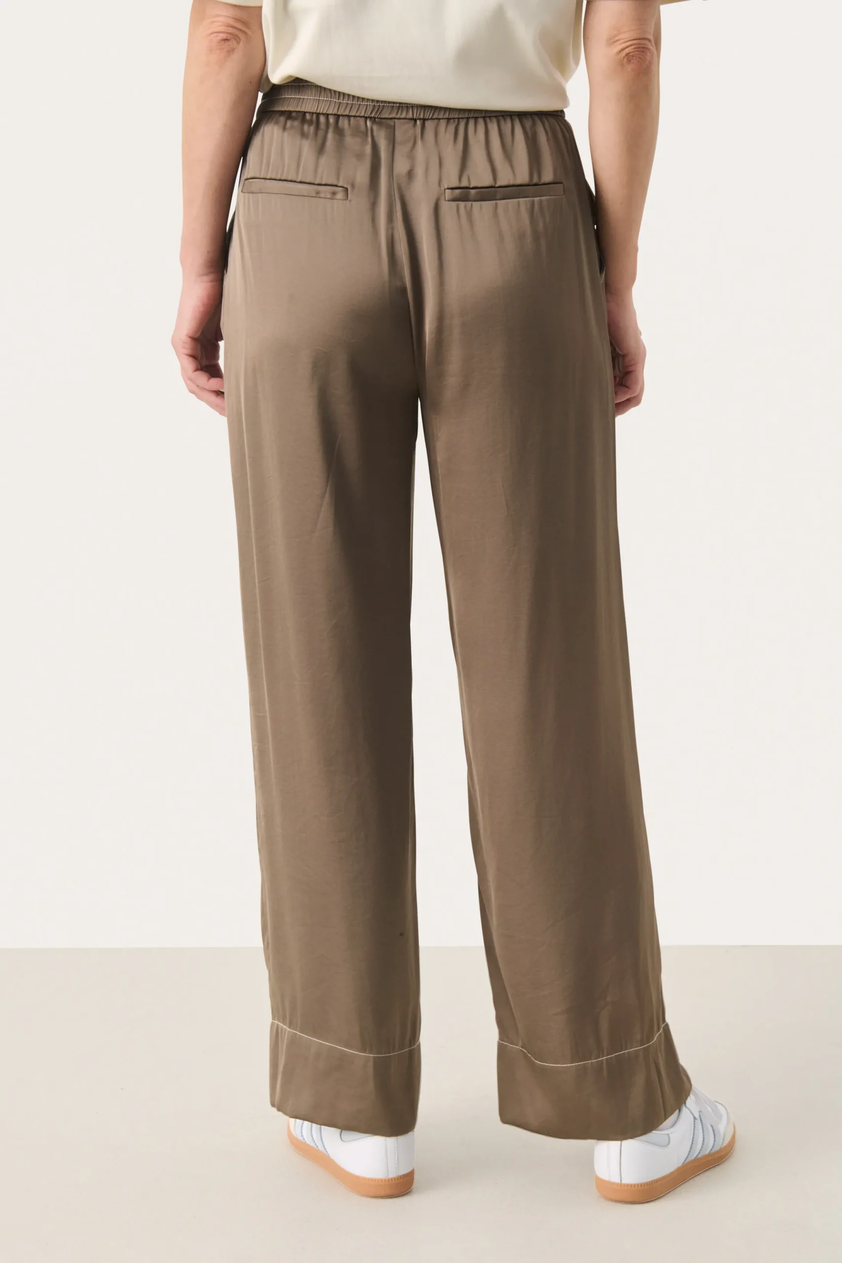 Modellen er 175 cm høj og er iført en størrelse 36.\\n\\n\\nDisse bukser i satin er designet med brede ben og elastisk talje for optimal komfort. Den afslappede pasform gør dem perfekte til både arbejde og afslapning. Style dem med en enkel top eller en skjorte for et stilfuldt look.
