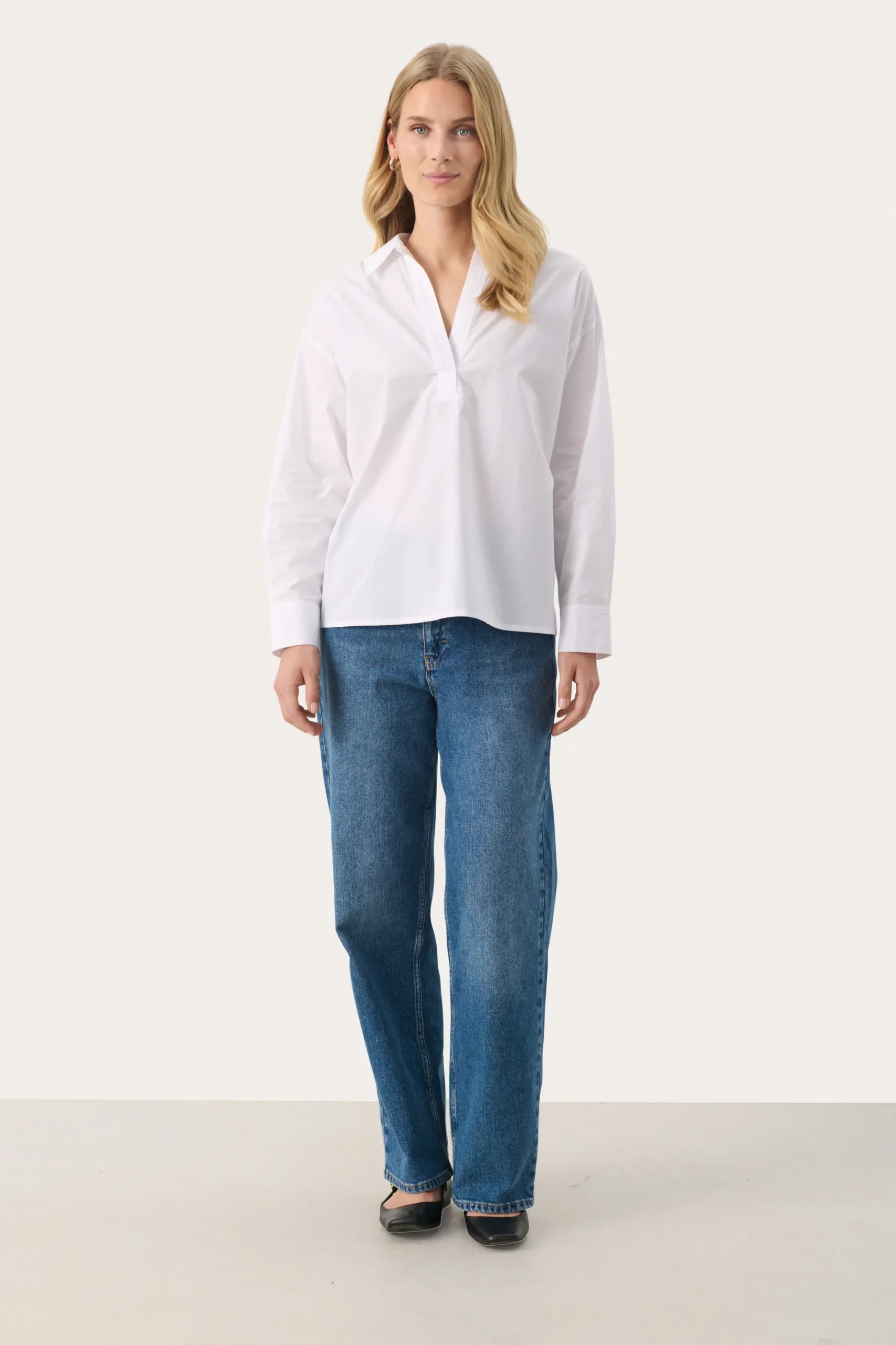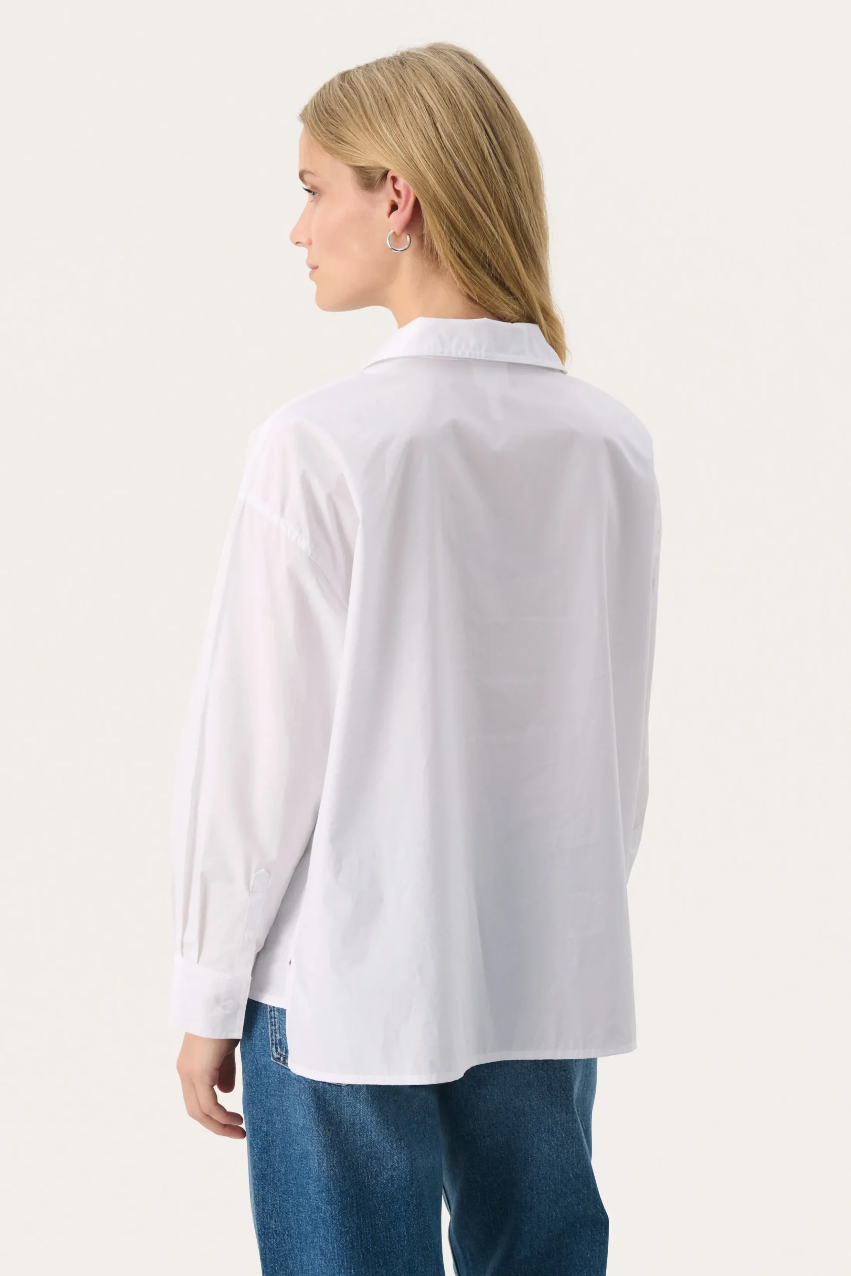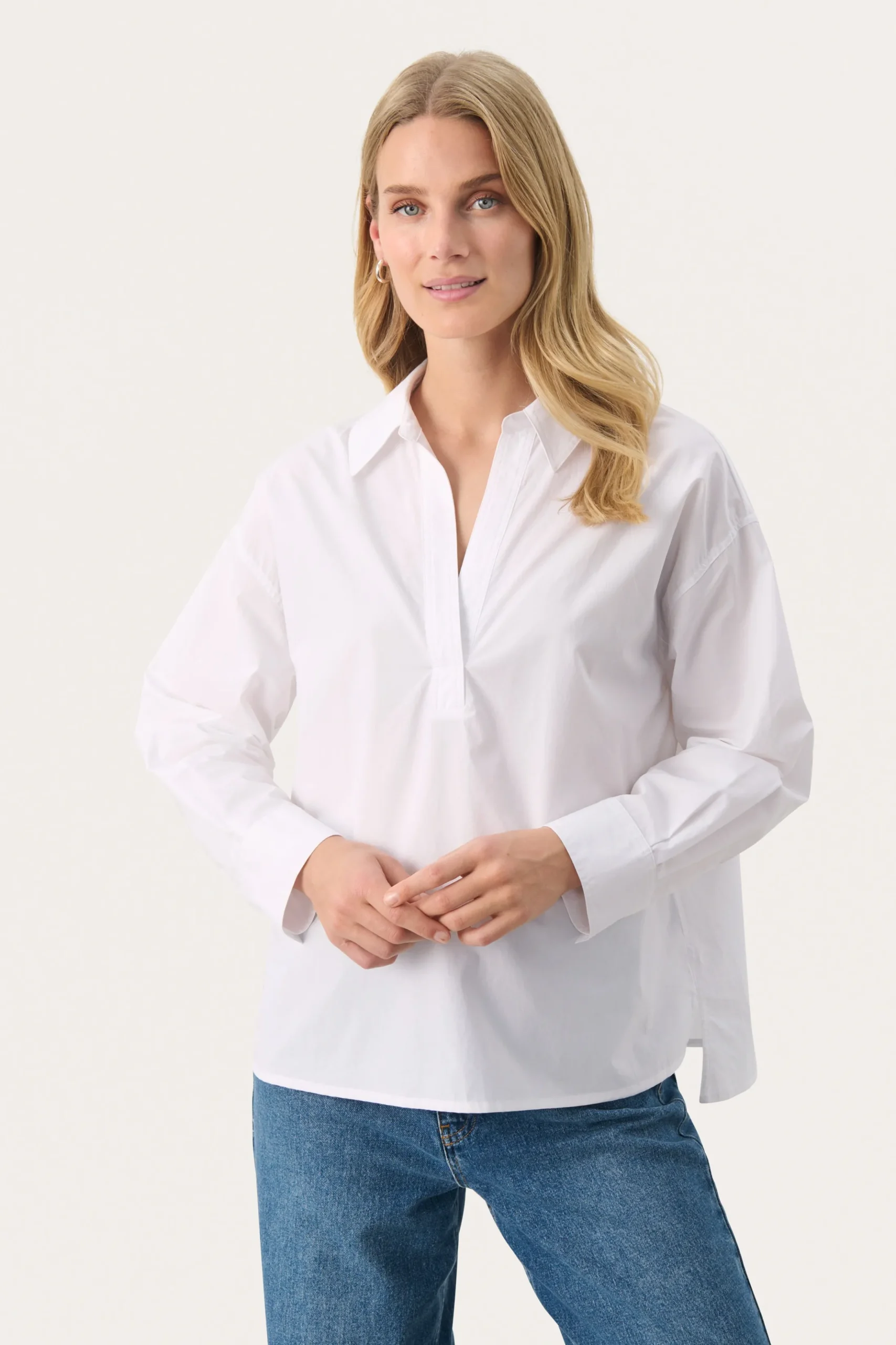 Modellen er 174 cm høj og er iført en størrelse 36.\\n\\nDenne hvide bomuldsbluse er en tidløs tilføjelse til din garderobe. Med sin afslappede pasform og klassiske krave tilbyder den både komfort og stil. Perfekt til lag-på-lag eller som den er, kombiner med jeans eller skræddersyede bukser for et chic og alsidigt look.