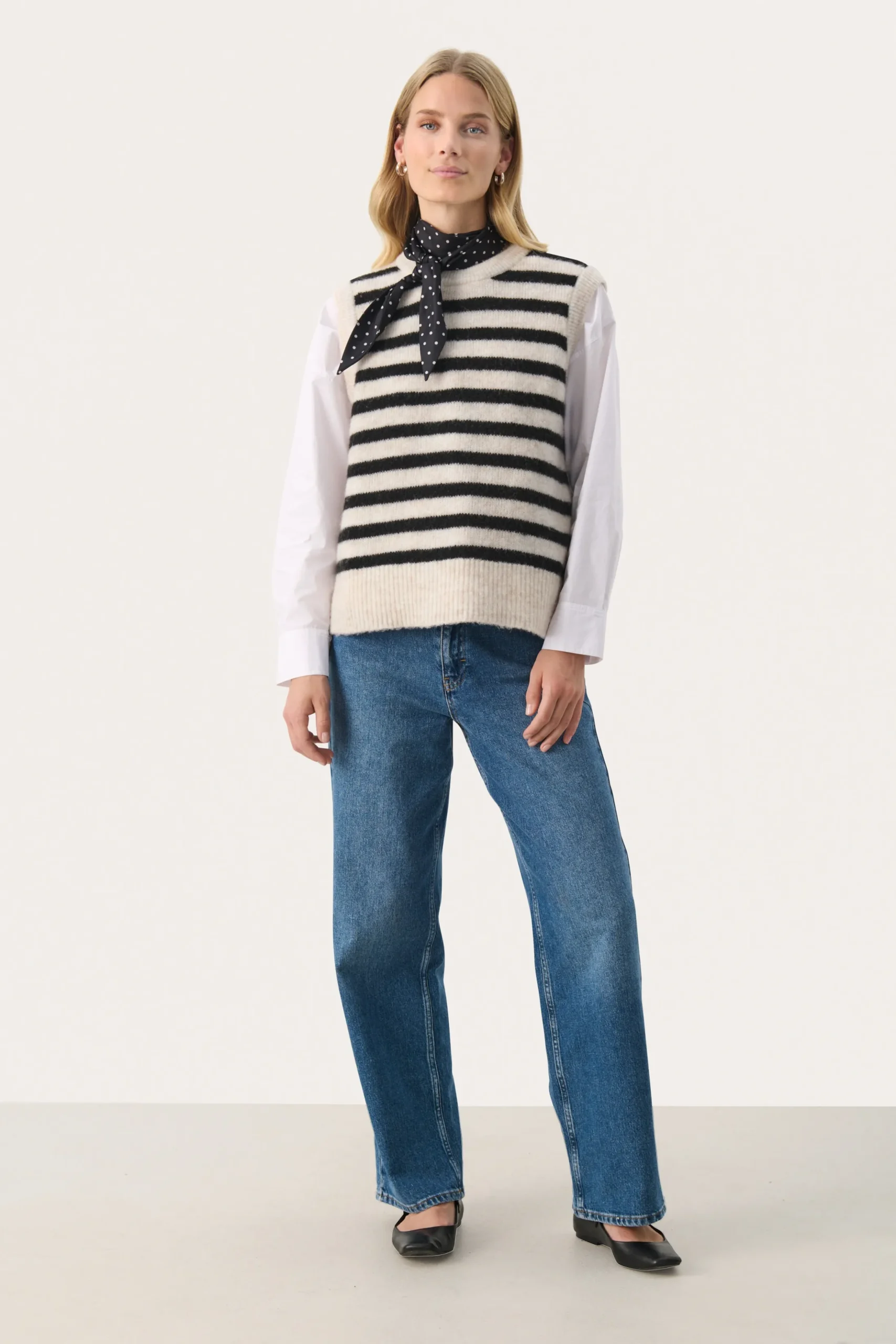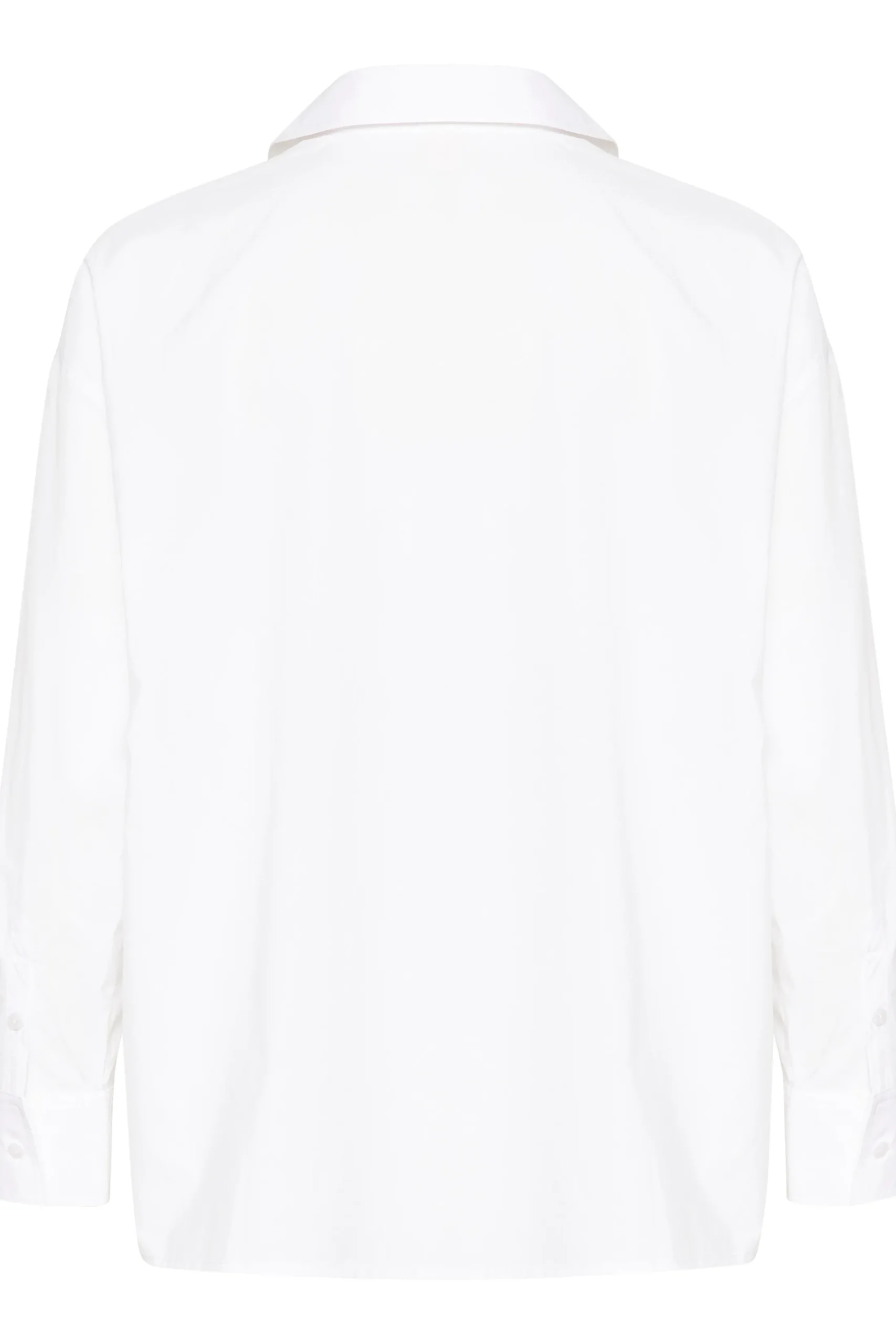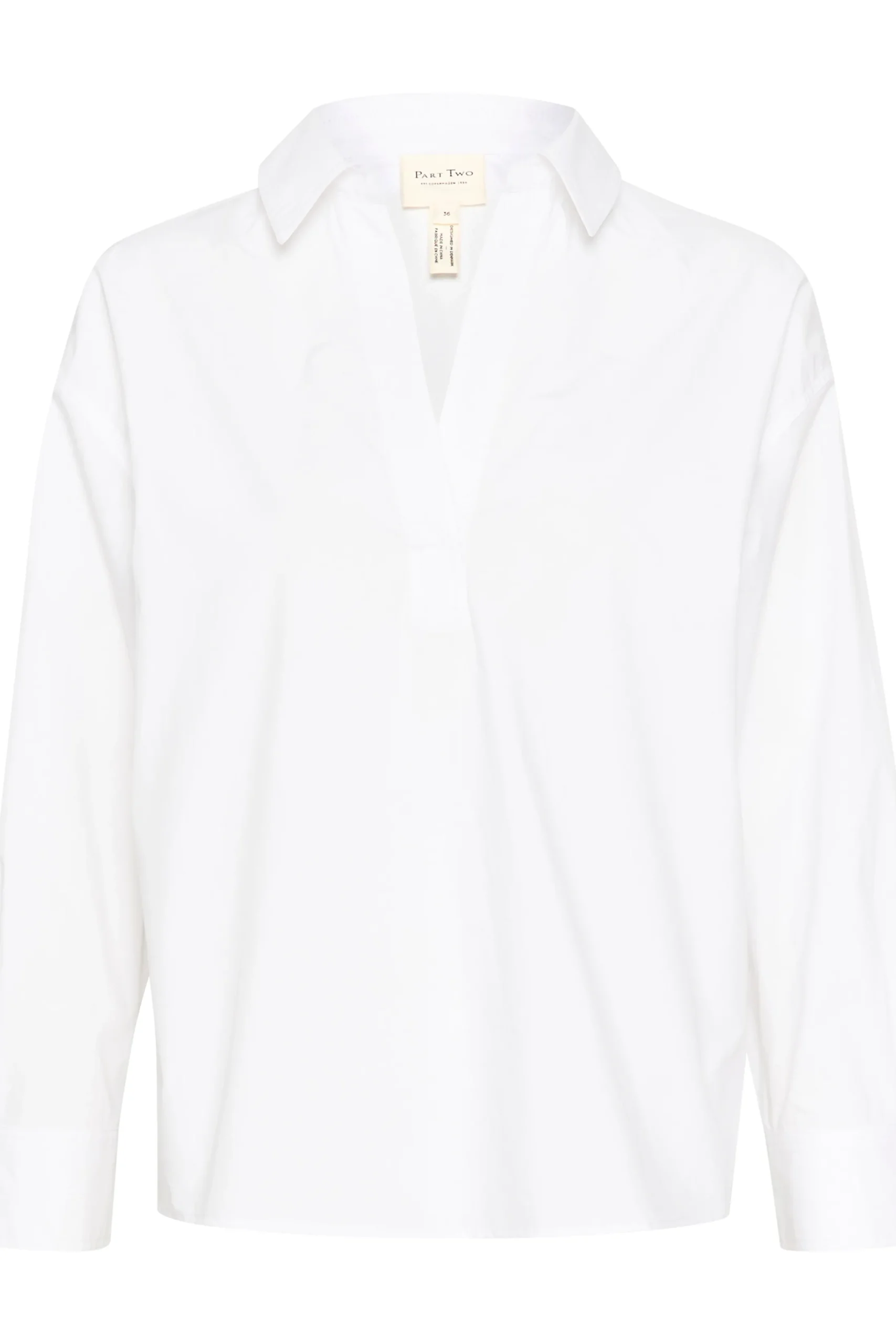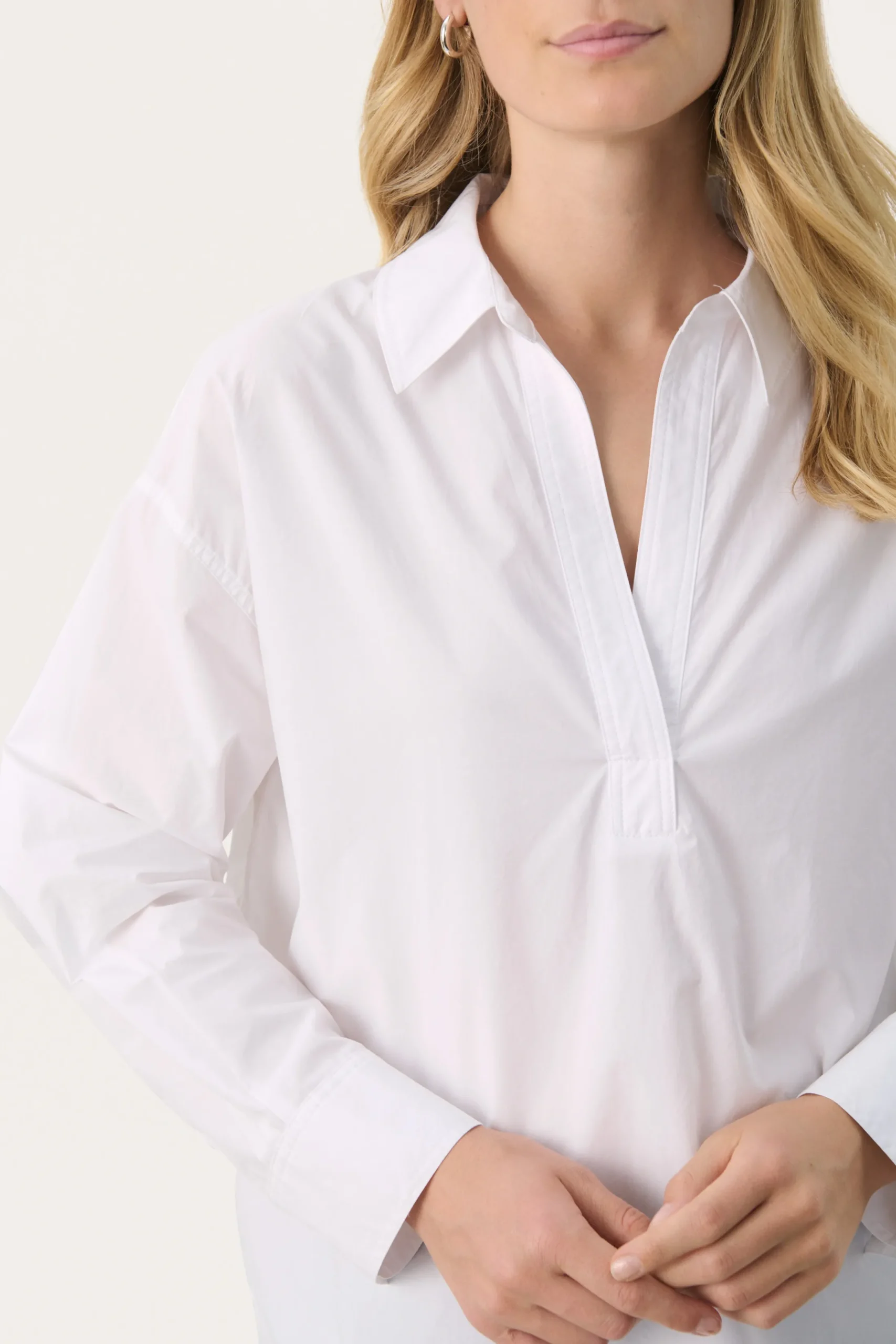 Modellen er 174 cm høj og er iført en størrelse 36.\\n\\nDenne hvide bomuldsbluse er en tidløs tilføjelse til din garderobe. Med sin afslappede pasform og klassiske krave tilbyder den både komfort og stil. Perfekt til lag-på-lag eller som den er, kombiner med jeans eller skræddersyede bukser for et chic og alsidigt look.