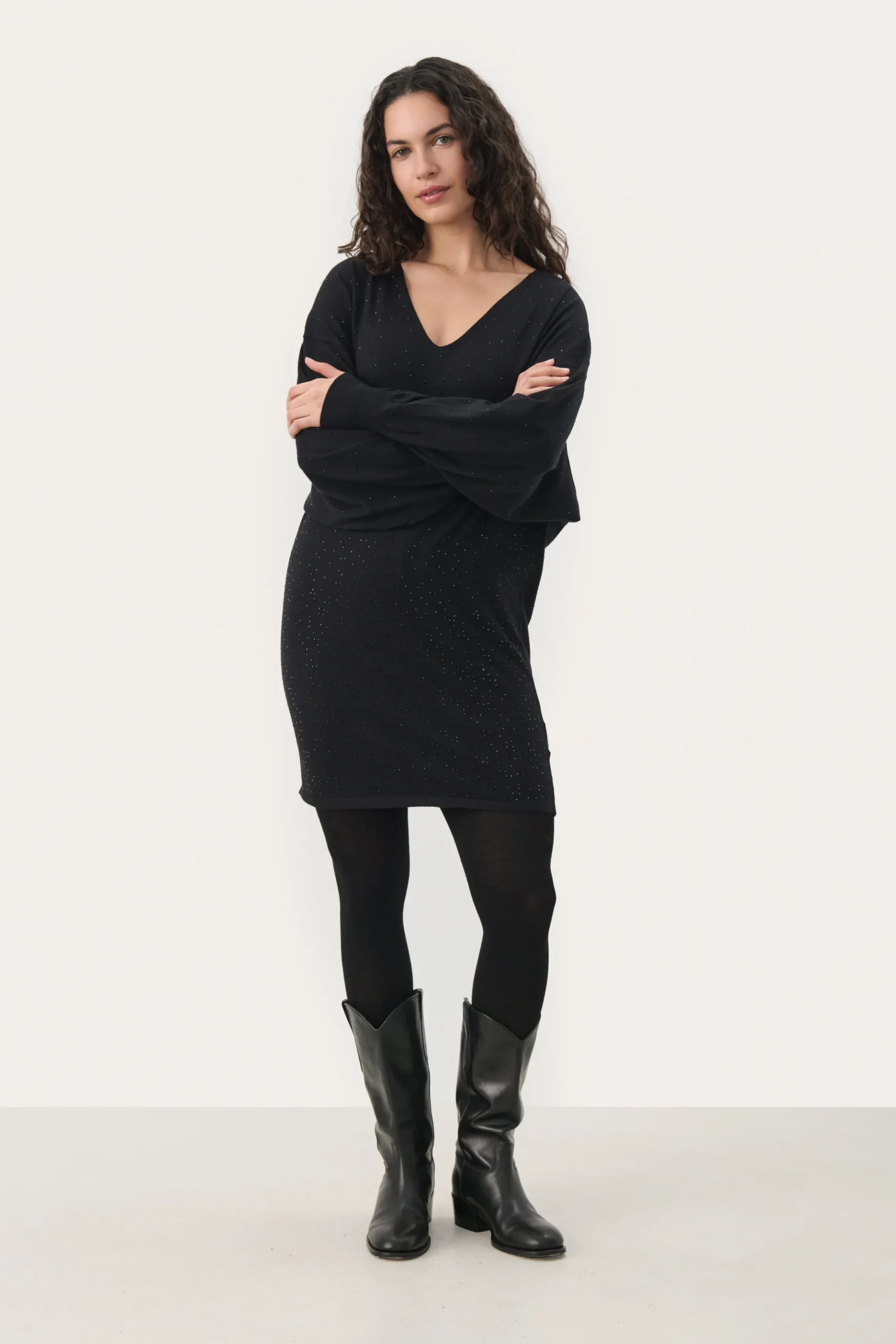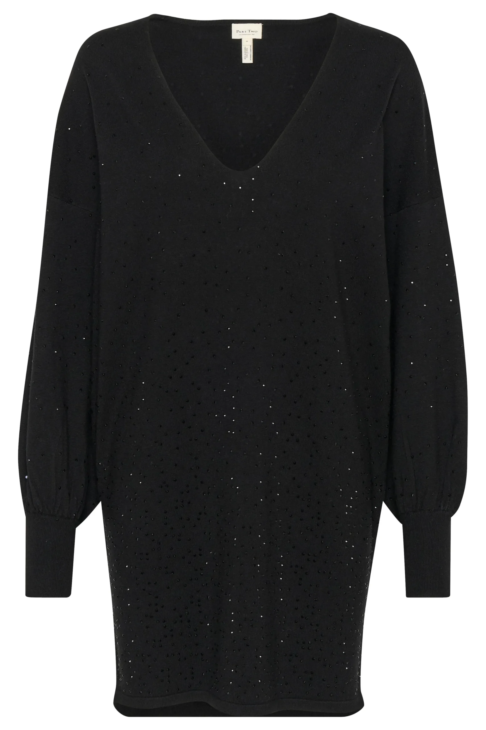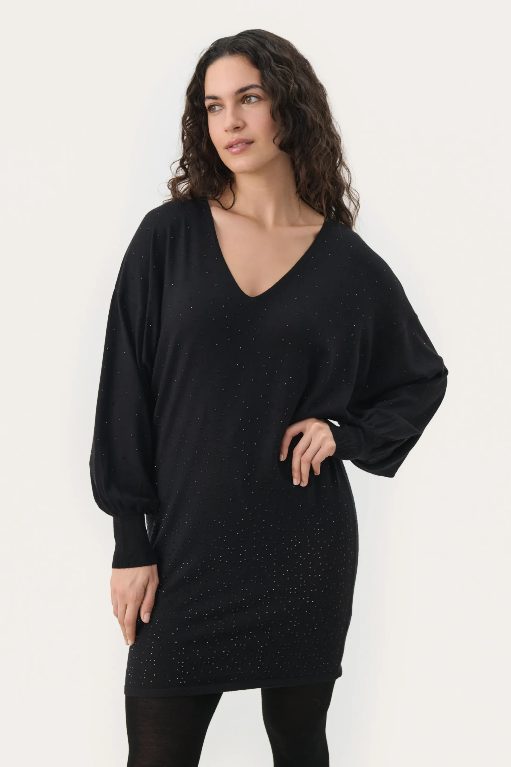 Denne sorte kjole med V-udskæring og diskrete glitrende detaljer er det perfekte valg til både hverdag og festlige lejligheder. Den løse pasform og de lange ærmer skaber et komfortabelt og stilfuldt look. Perfekt at kombinere med strømpebukser og støvler for et elegant, men afslappet outfit.