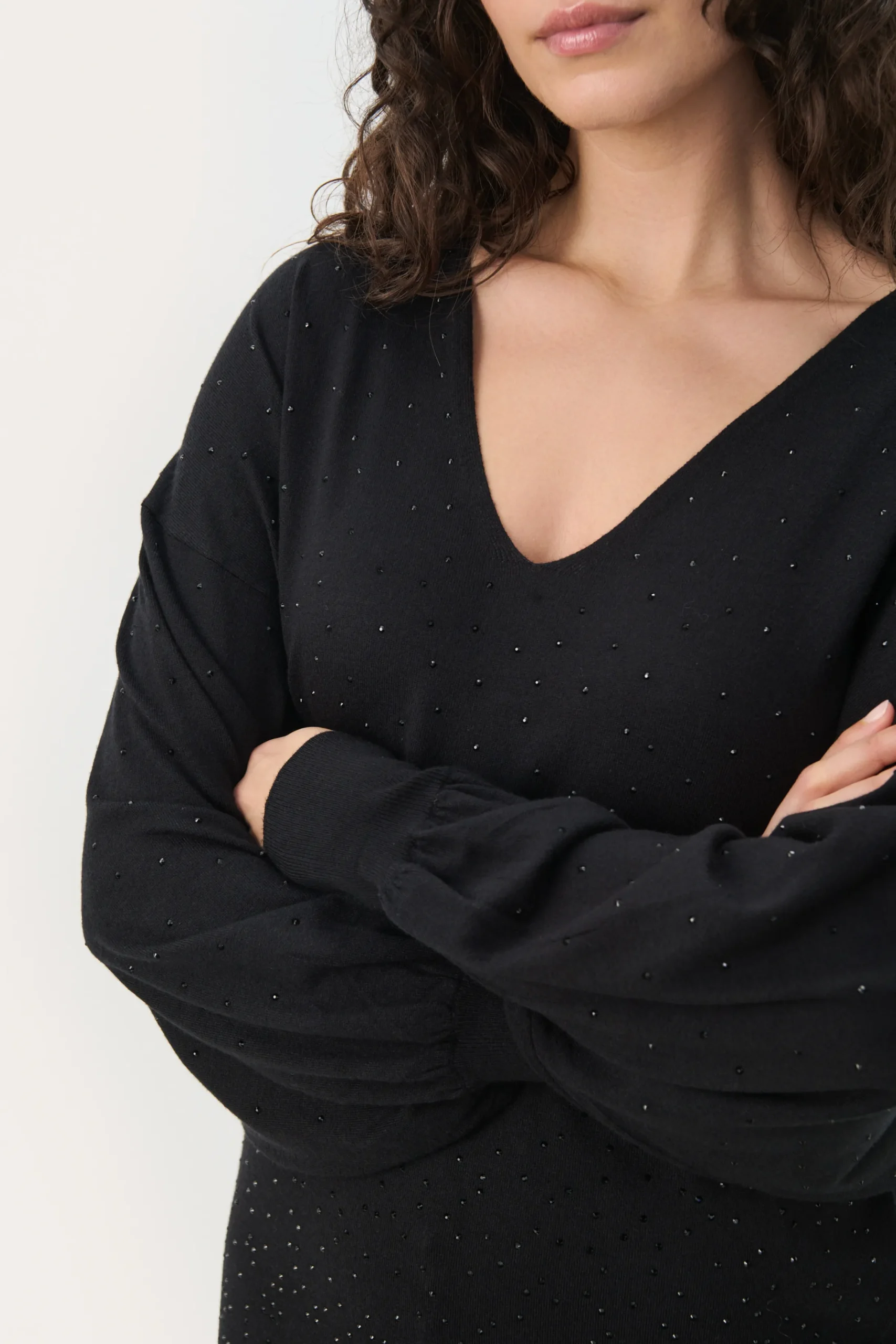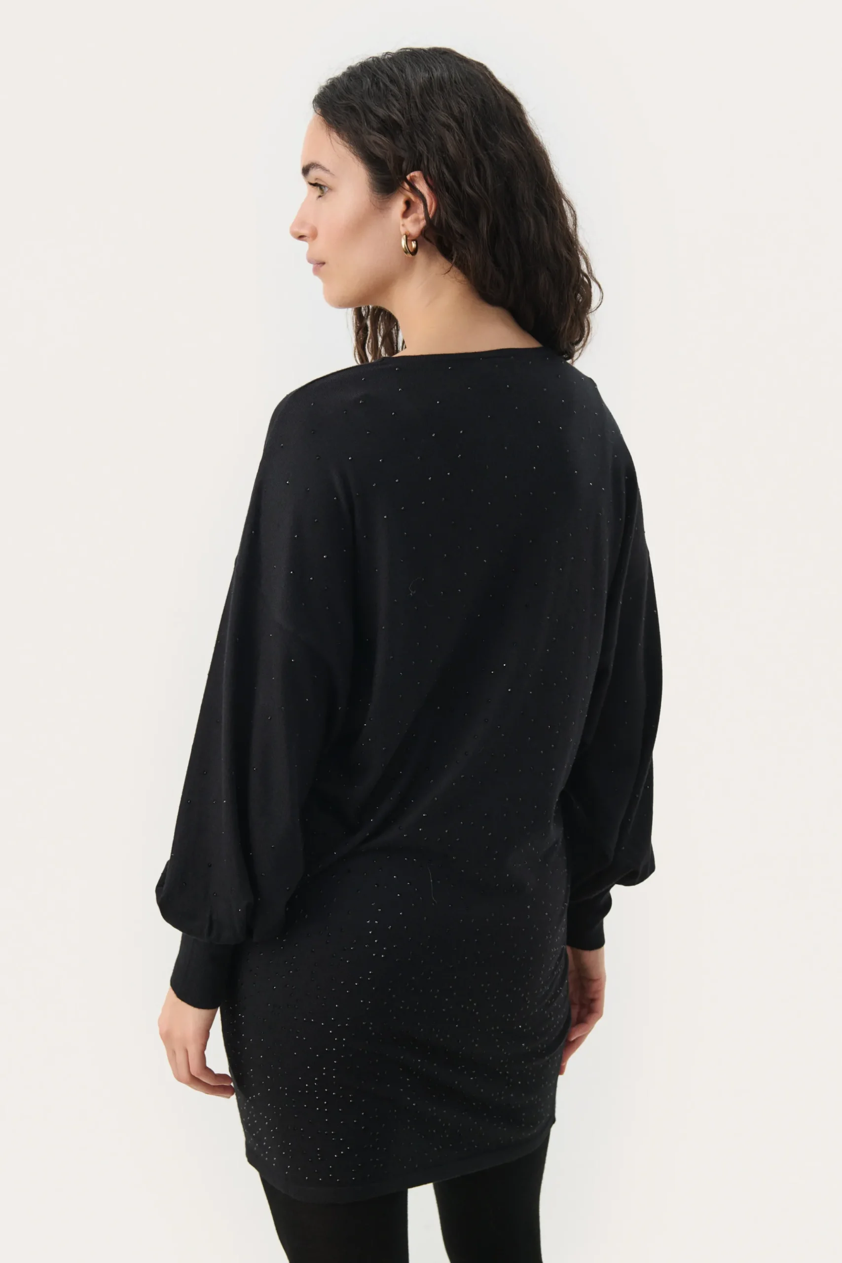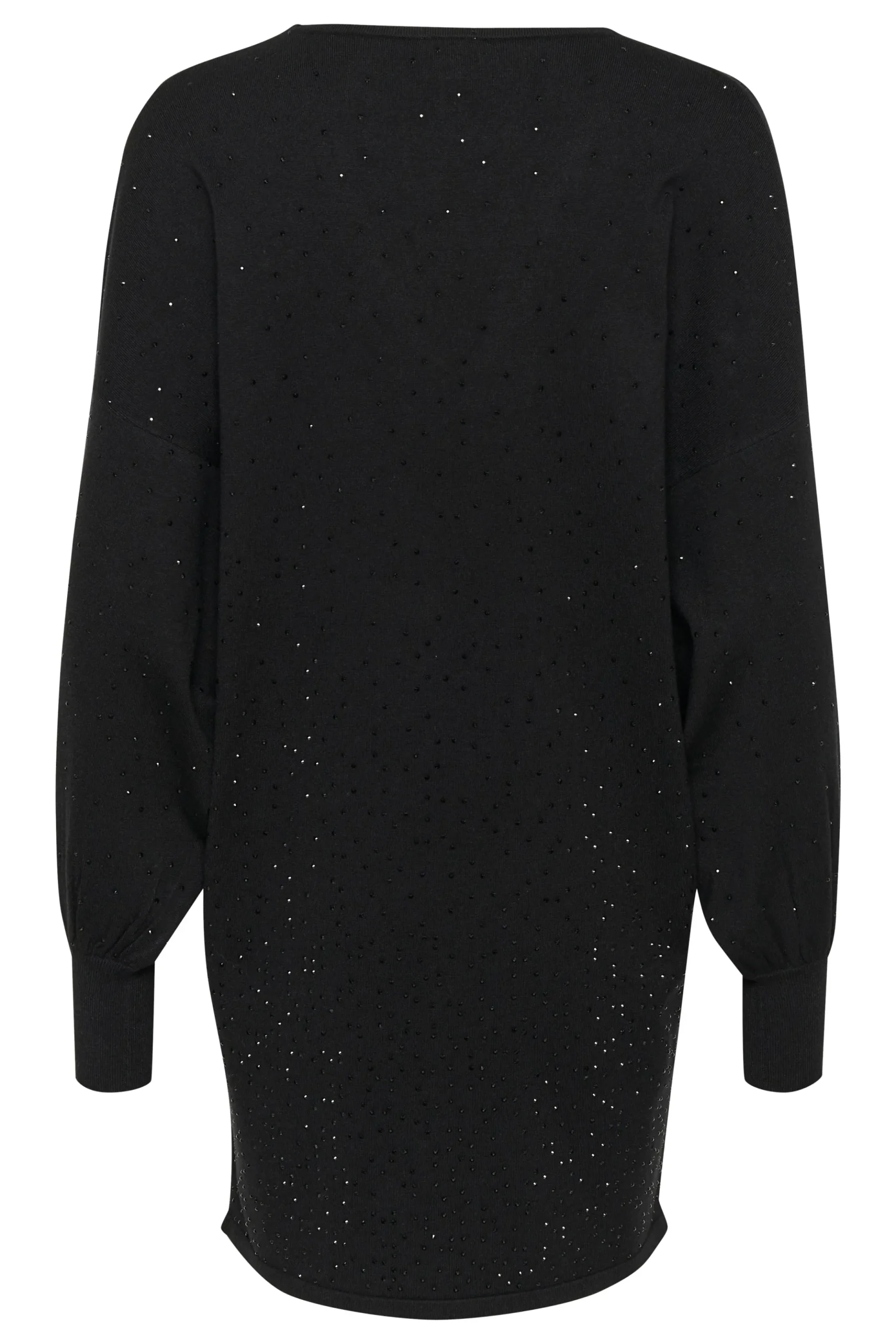 Denne sorte kjole med V-udskæring og diskrete glitrende detaljer er det perfekte valg til både hverdag og festlige lejligheder. Den løse pasform og de lange ærmer skaber et komfortabelt og stilfuldt look. Perfekt at kombinere med strømpebukser og støvler for et elegant, men afslappet outfit.