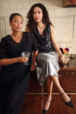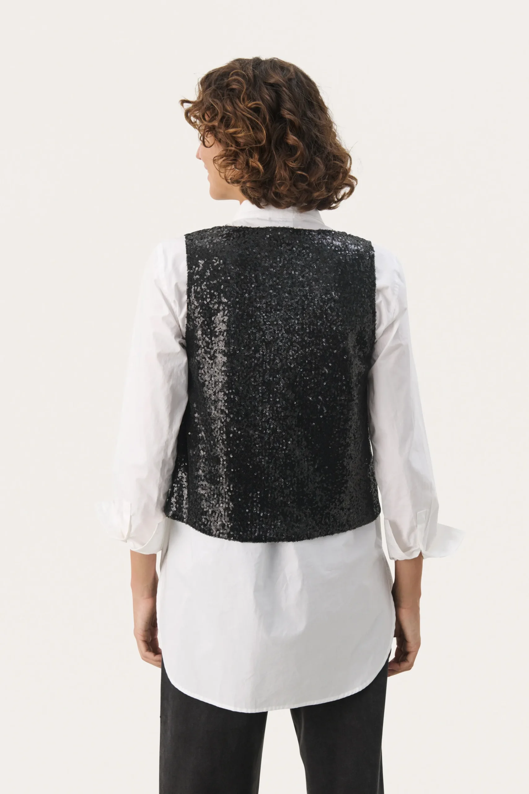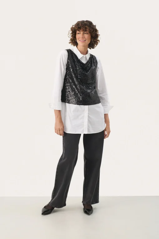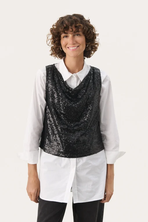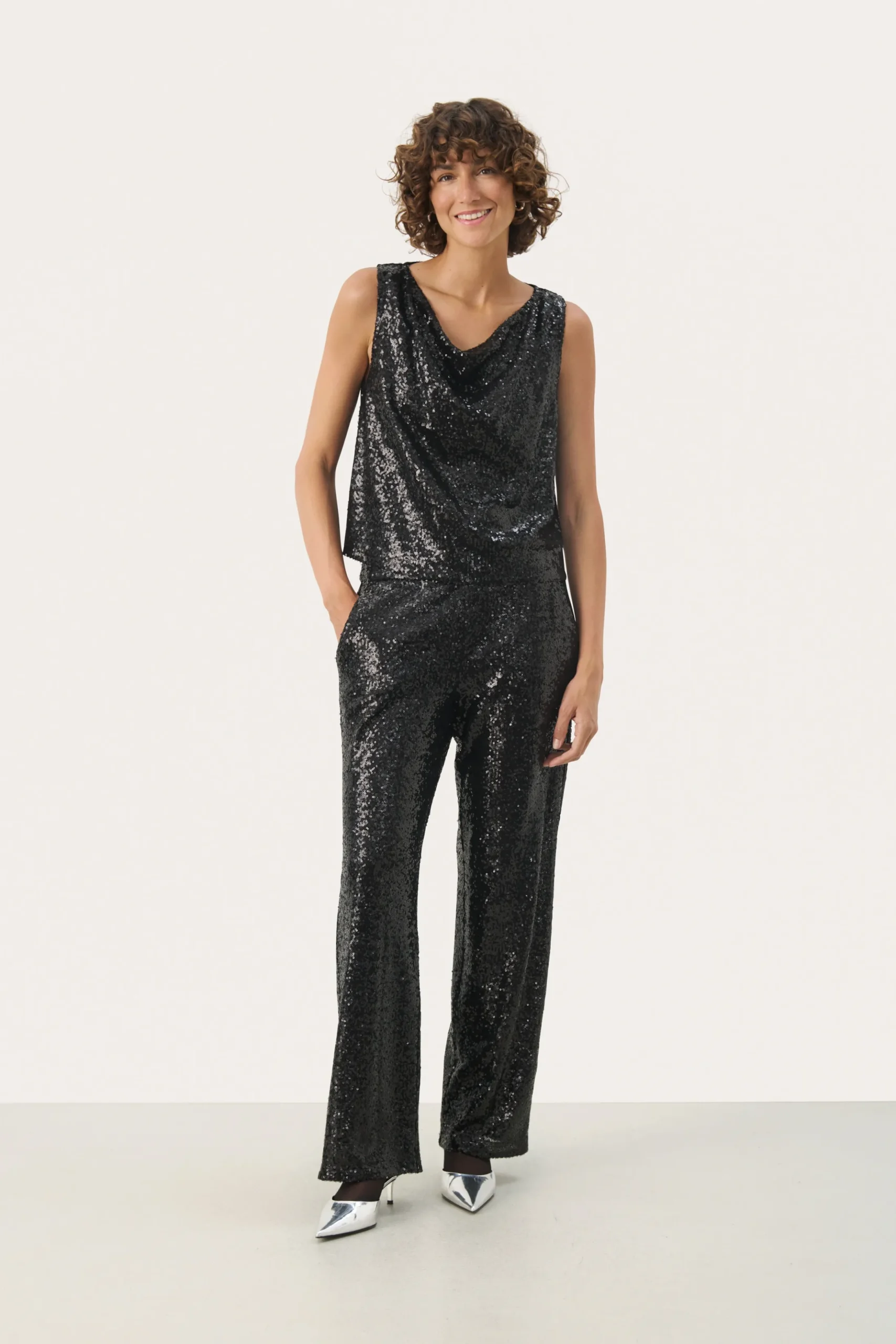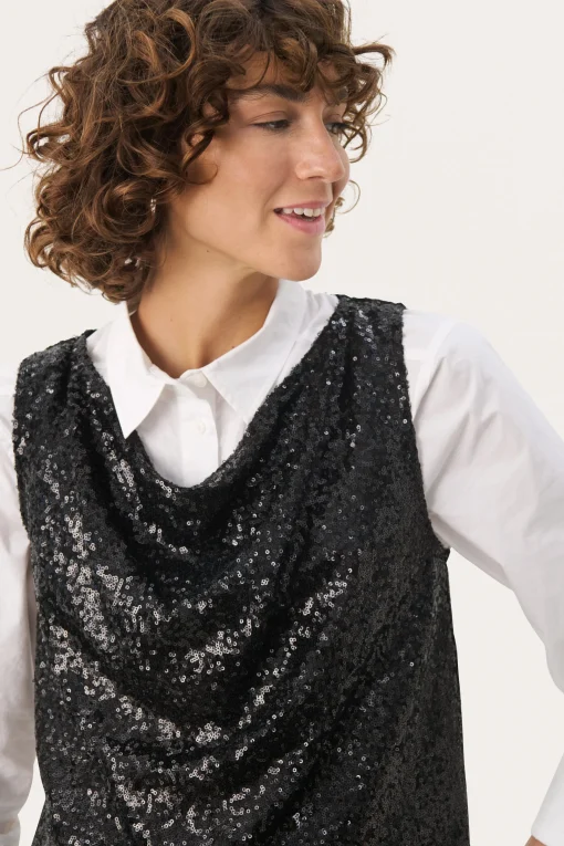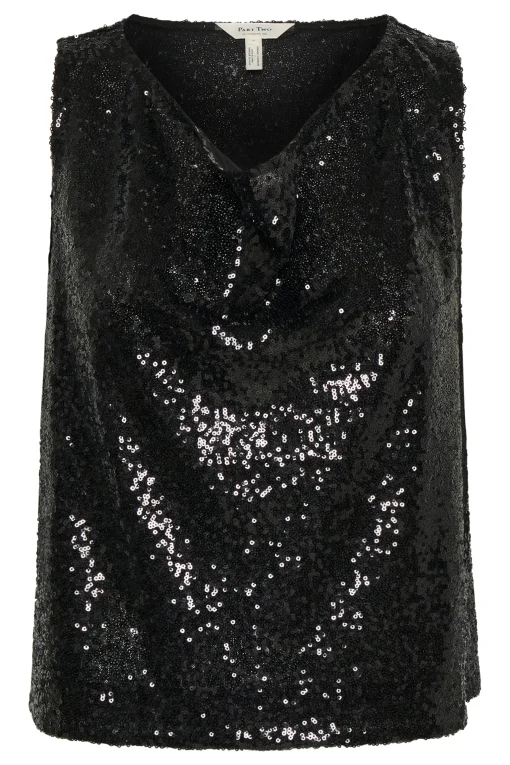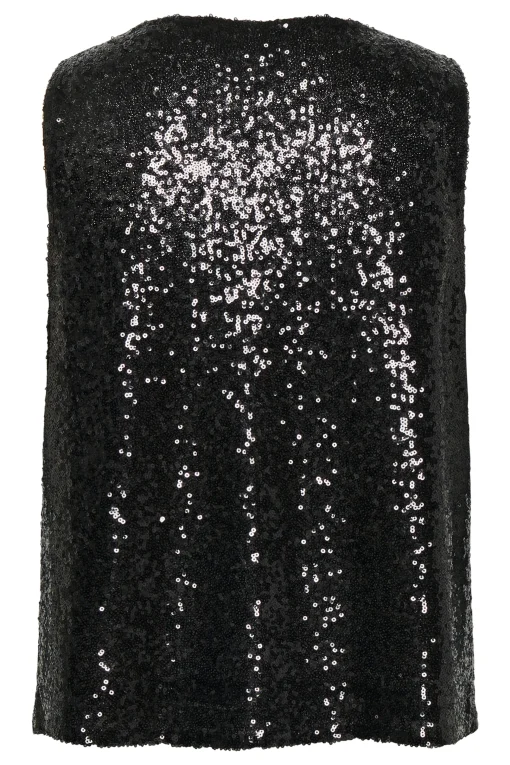 Modellen er 178 cm høj og er iført en størrelse M.\\n\\nDenne skinnende sorte top er det perfekte valg til en festlig aften. Toppen er dækket af glitrende pailletter, der fanger lyset og skaber et iøjnefaldende look. Den har en flatterende V-udskæring og et løstsiddende snit, der giver et moderne og stilfuldt udtryk. Kan styles alene eller med en trøje under.